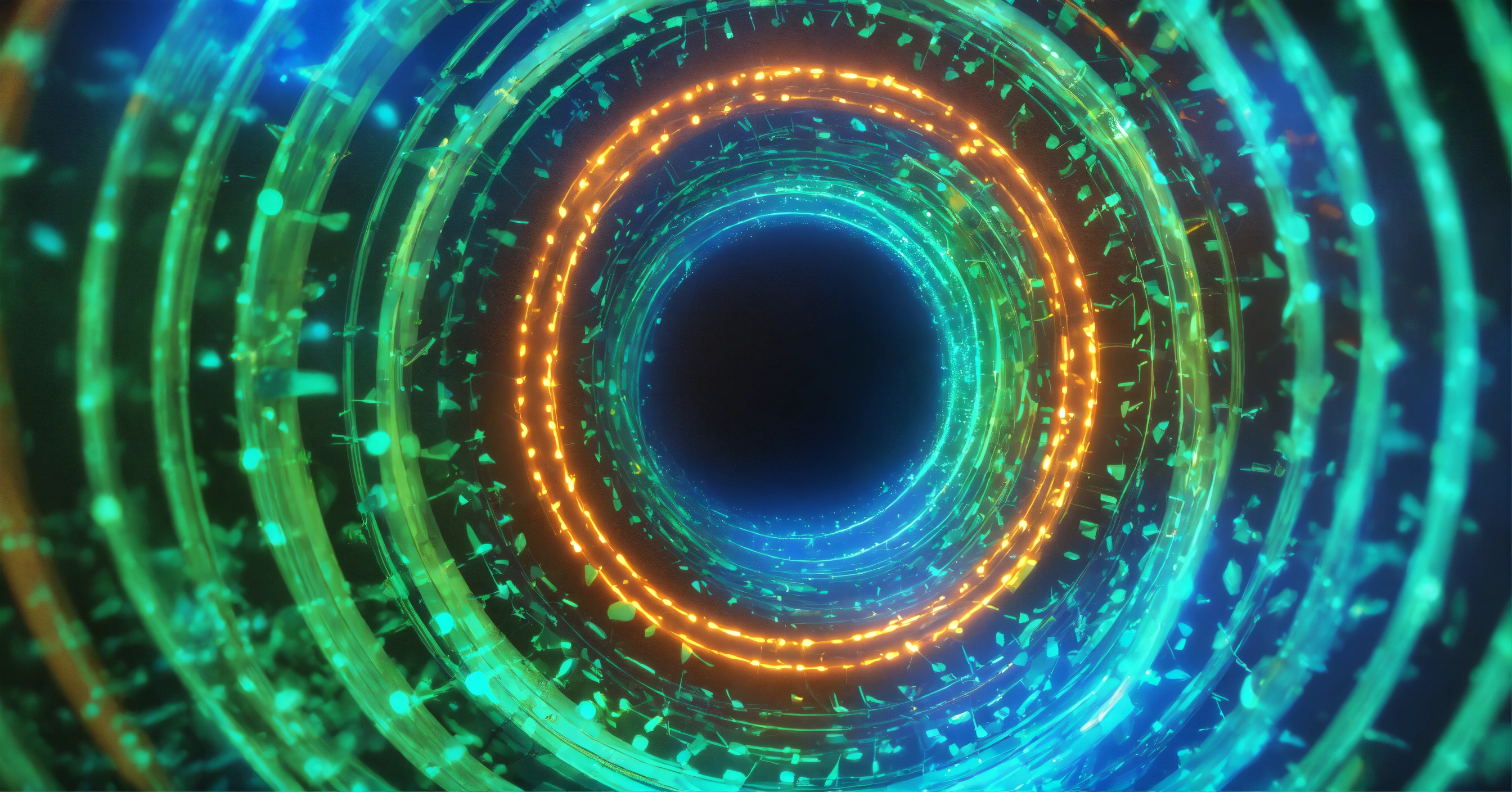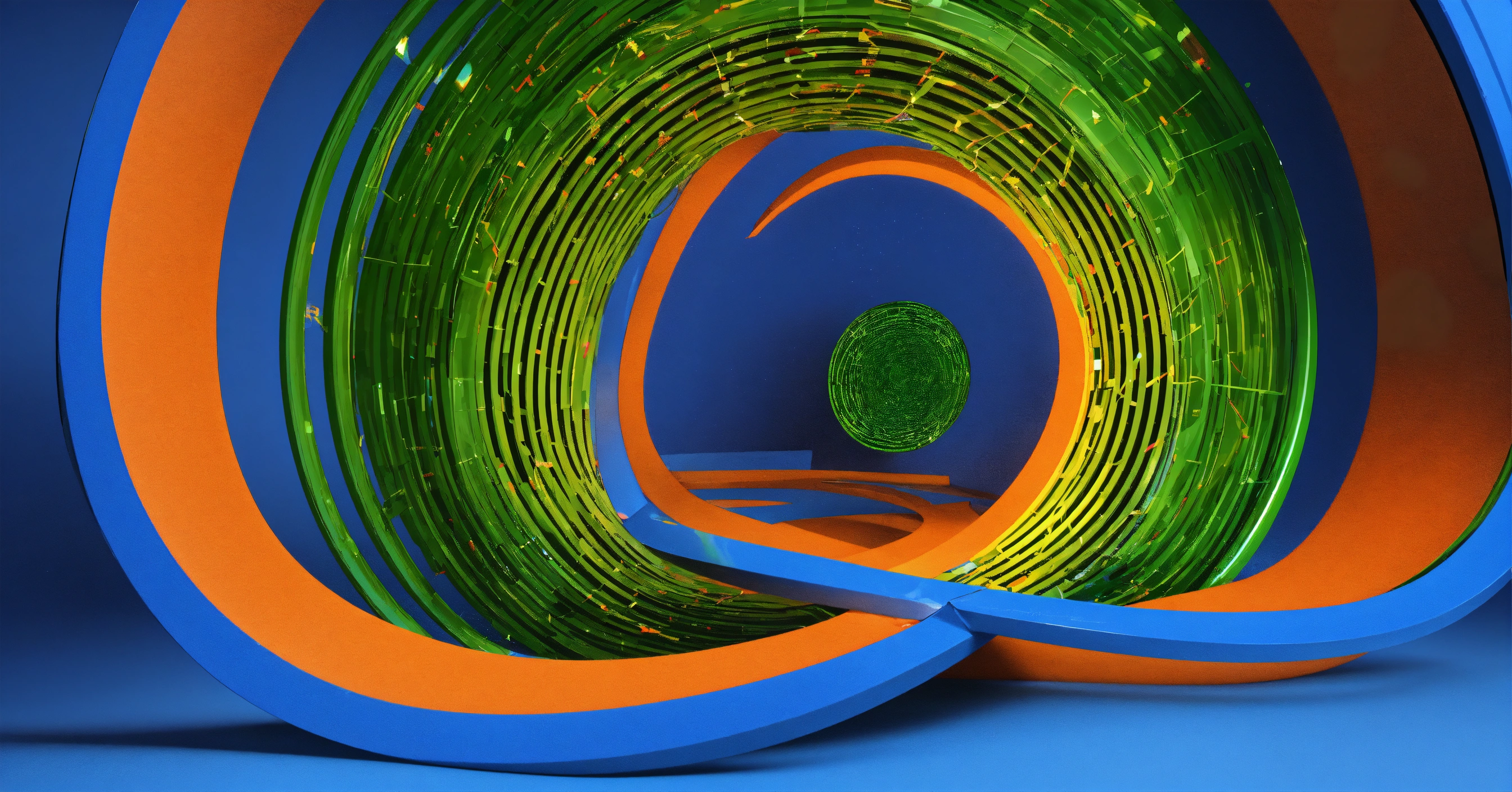 A 3d digital illustration representing infinity. using circles and curved arrows, done in blue, green, and orange.