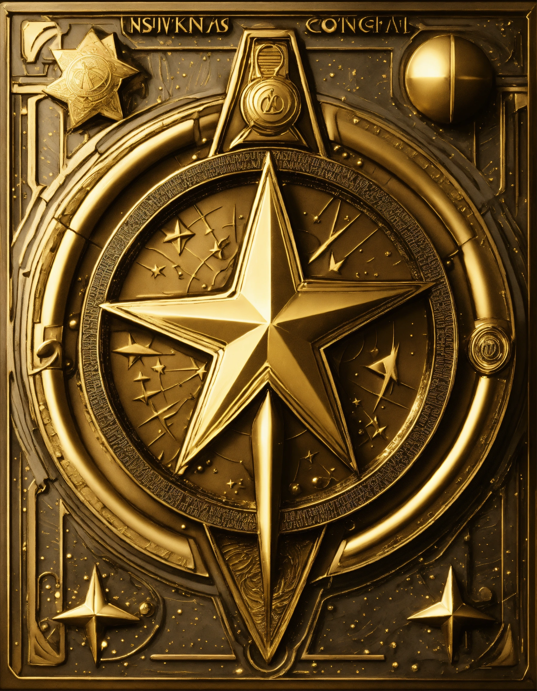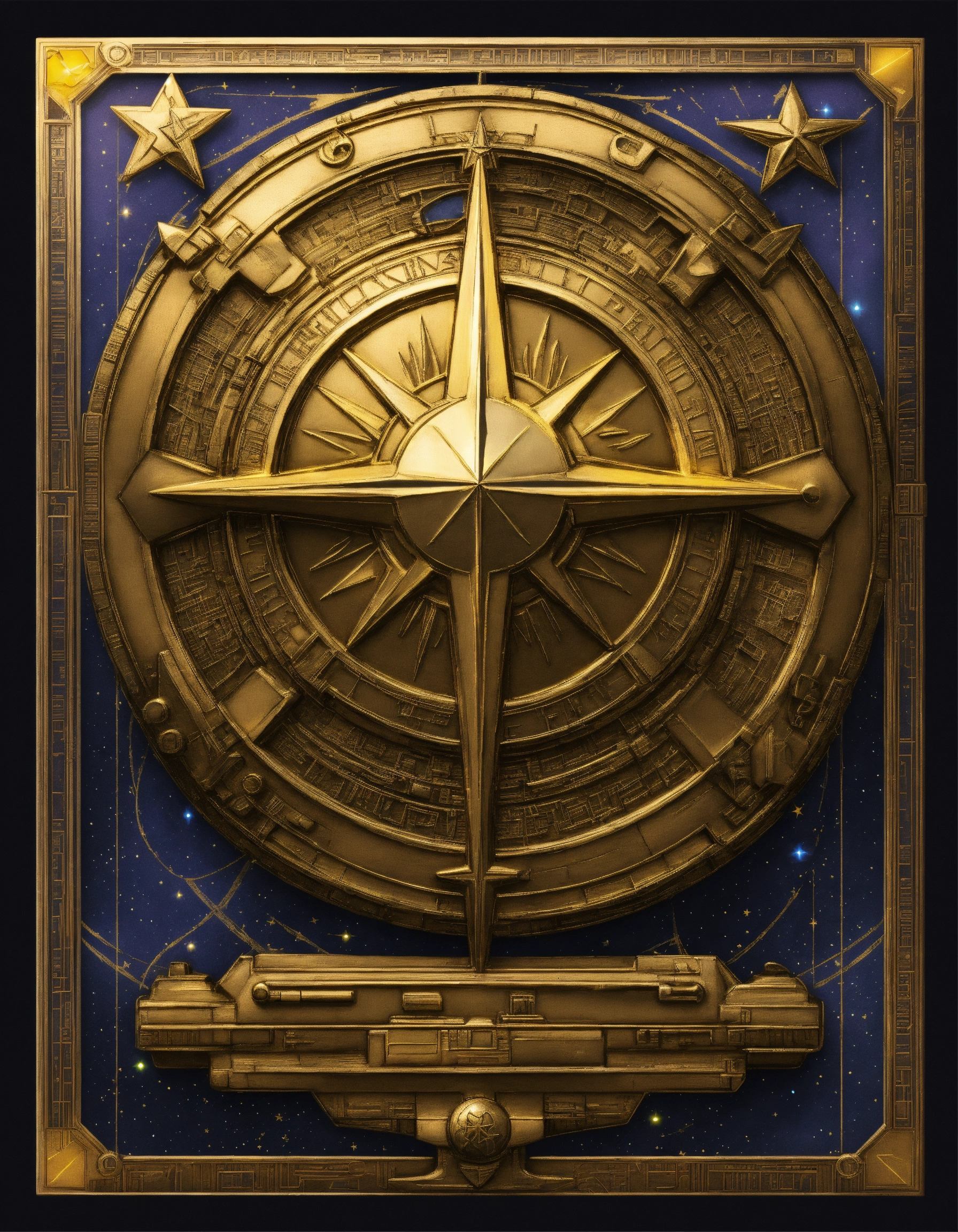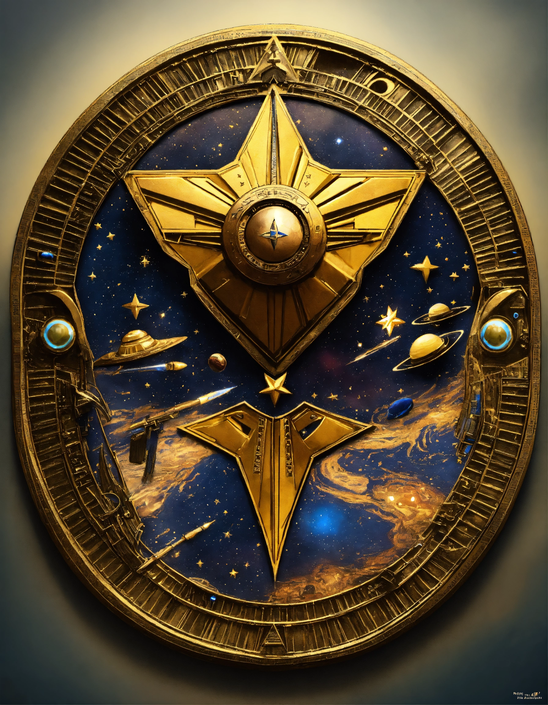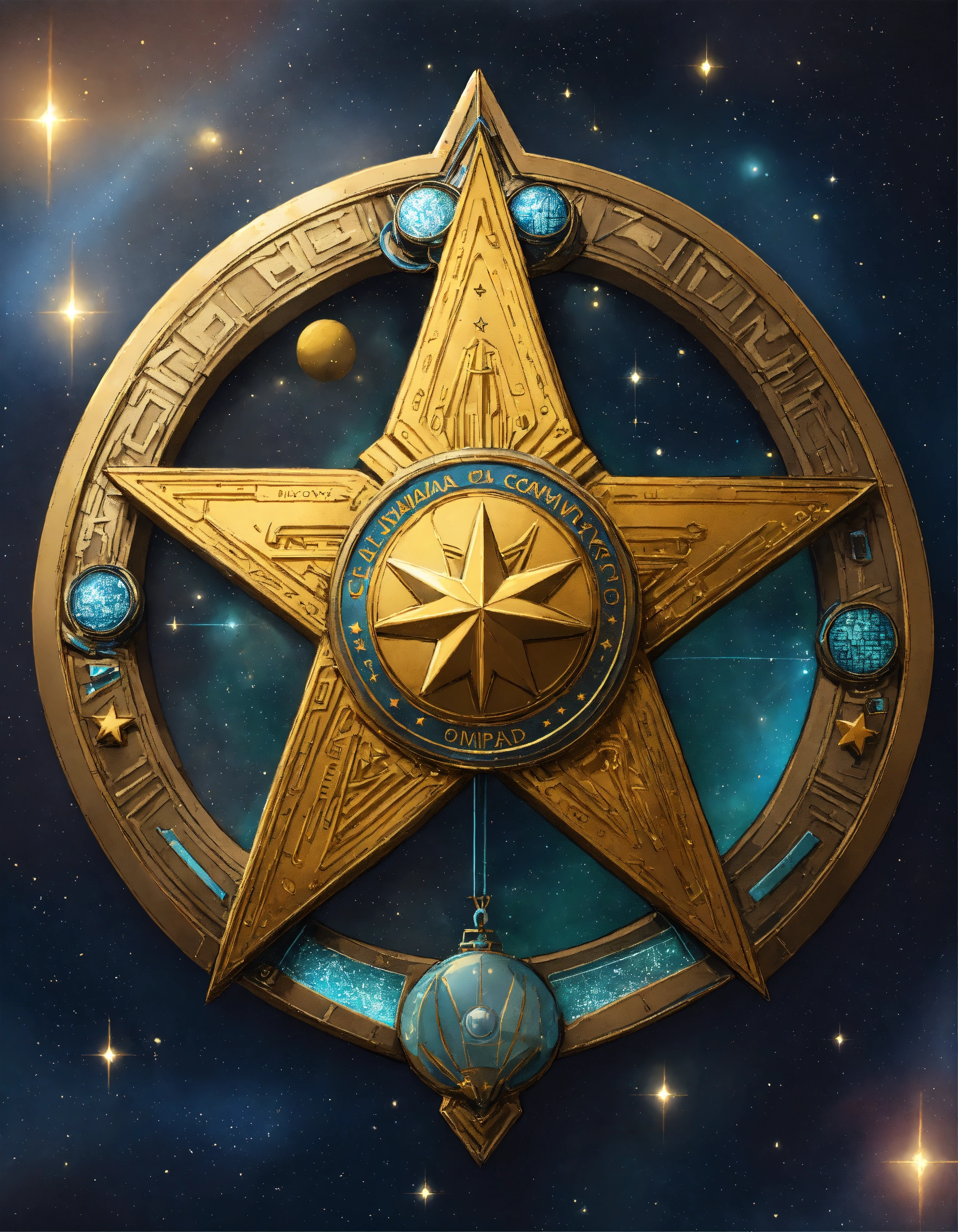 Illustration of an insignia of a star command, insignia ashtar command, starship commander's medal engraved with unknown alien letters