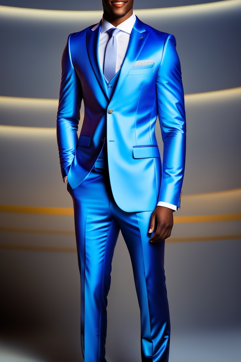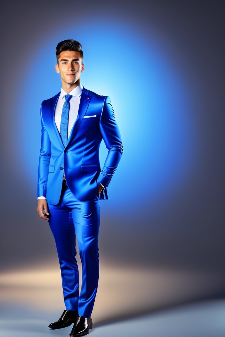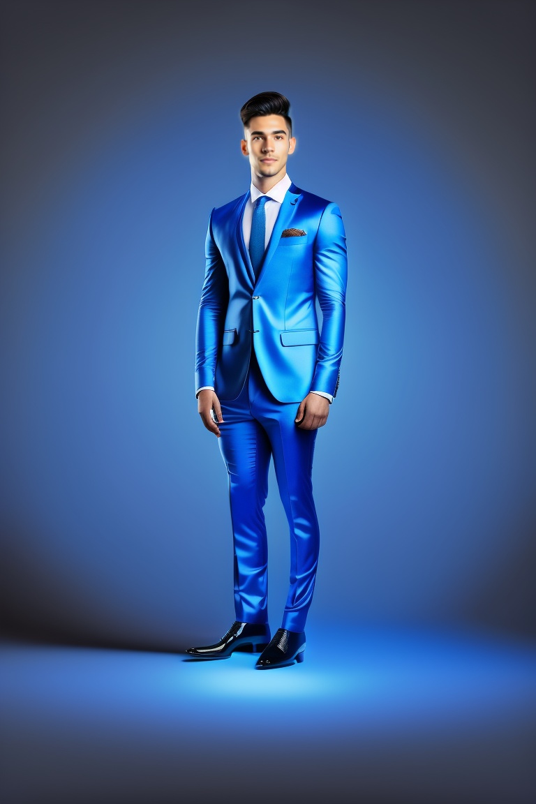Full body portrait of young man looking at the center of the screen, blue suit dress, color gradient background, slight smile, symmetrical and diffused natural solar lights, autumm lights, sharp and highly detailed focus, illuminated with high key lighting to create a smooth and ethereal feeling, a reduced depth of field, mdjrny-v4 style.