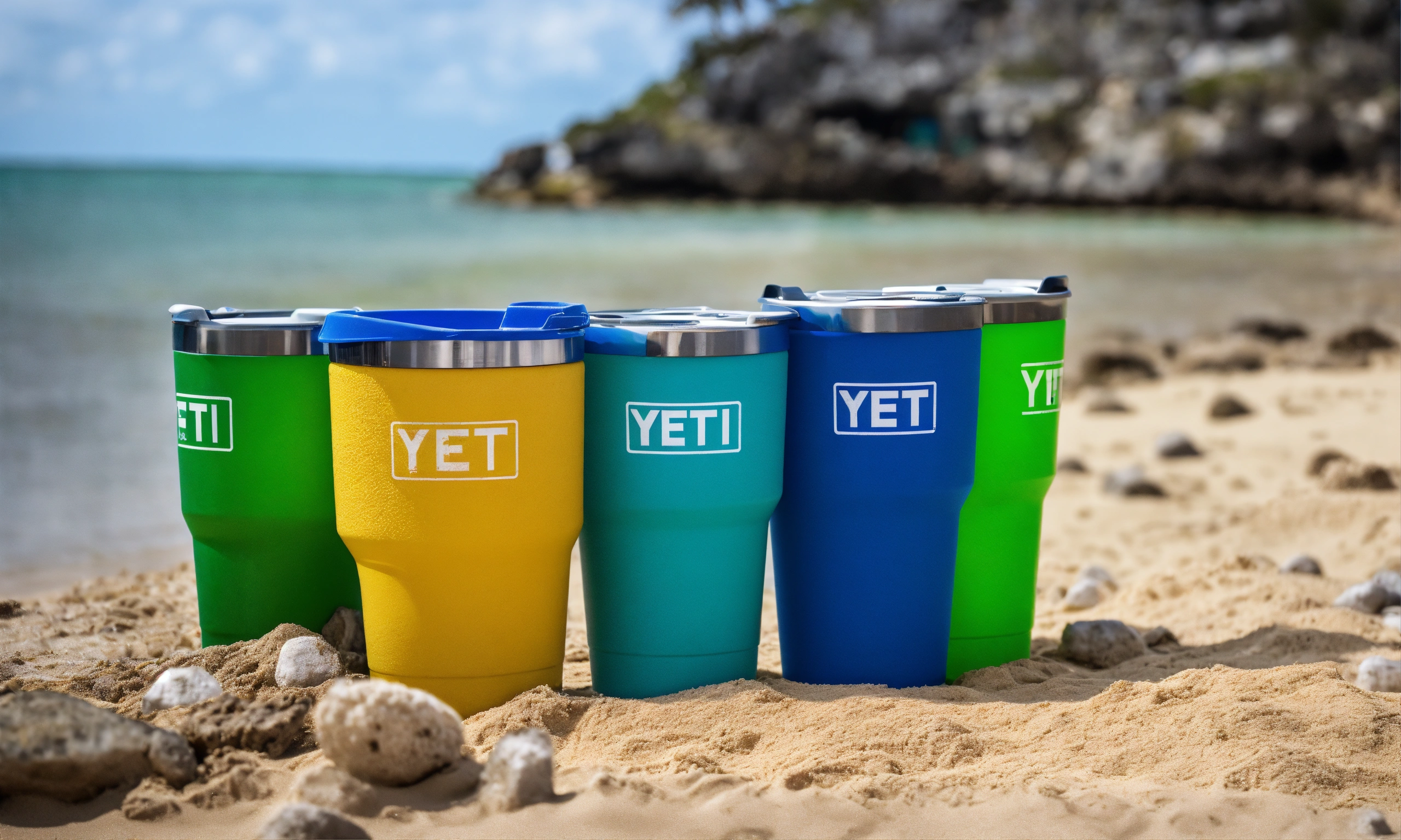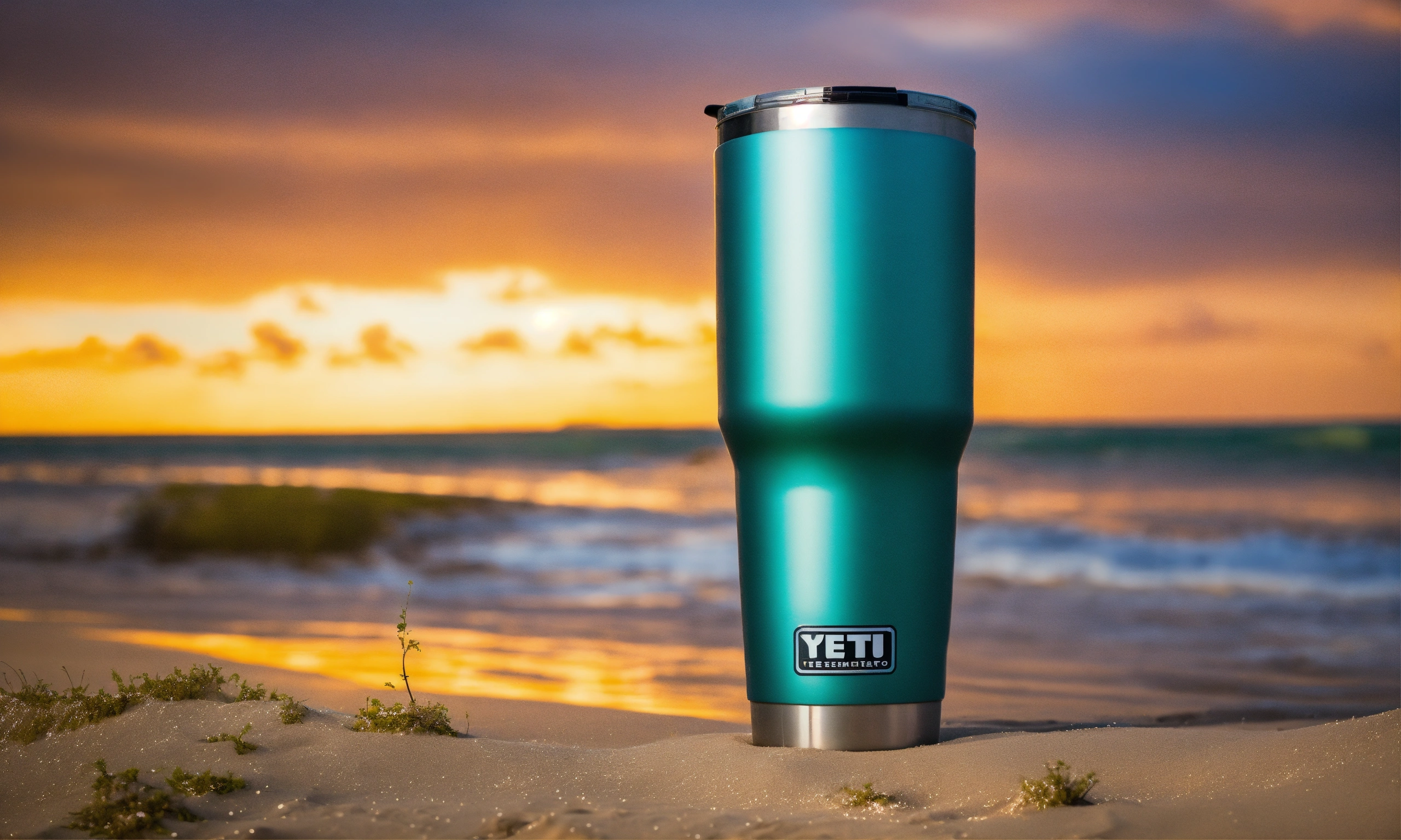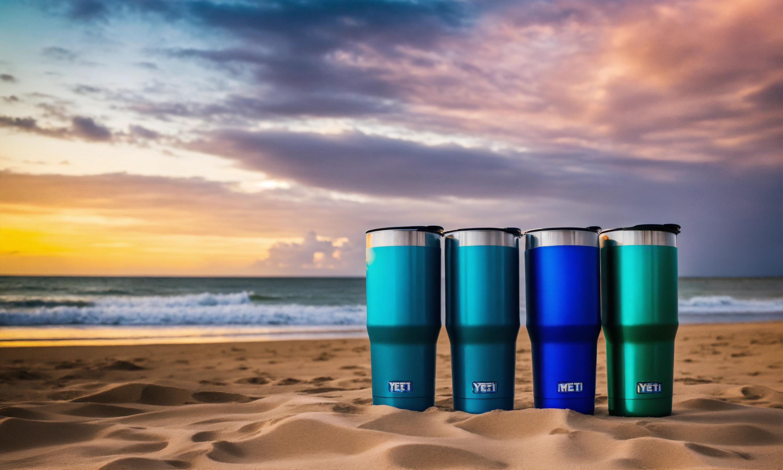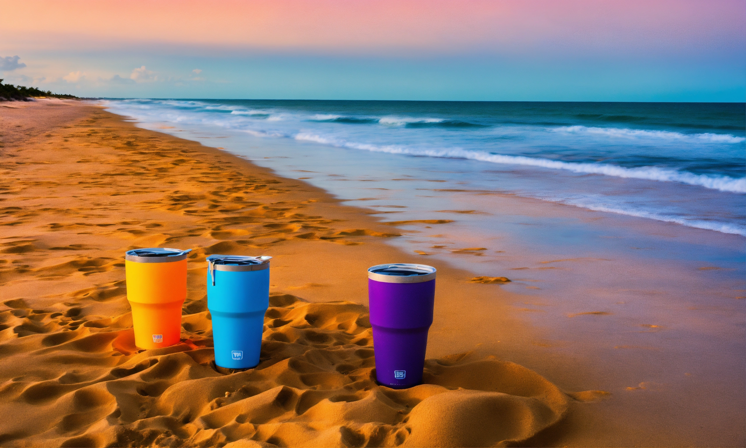 Imagen minimalista de vasos térmicos tipo yeti con acabado y color metalizado en fondos de playa en mérida, yucatán.
