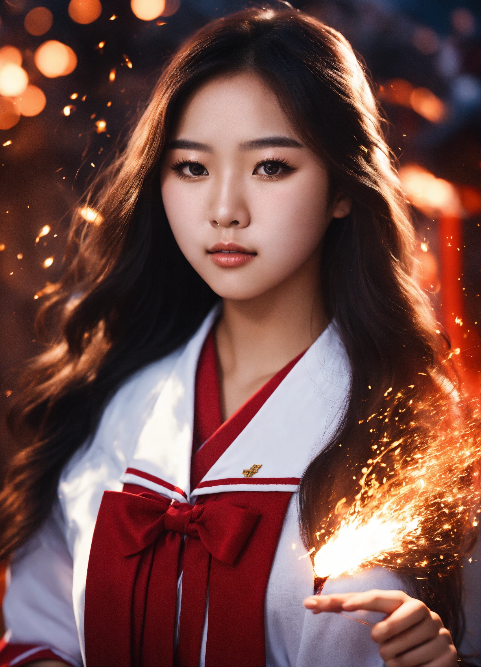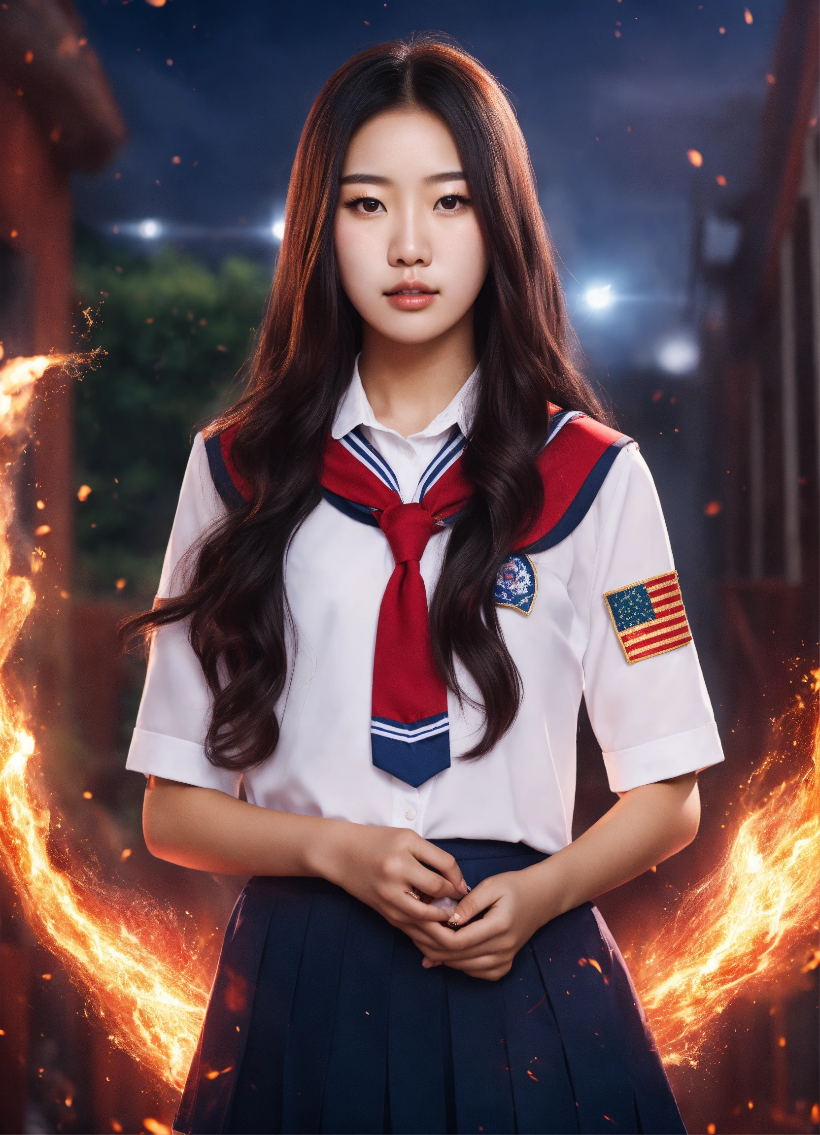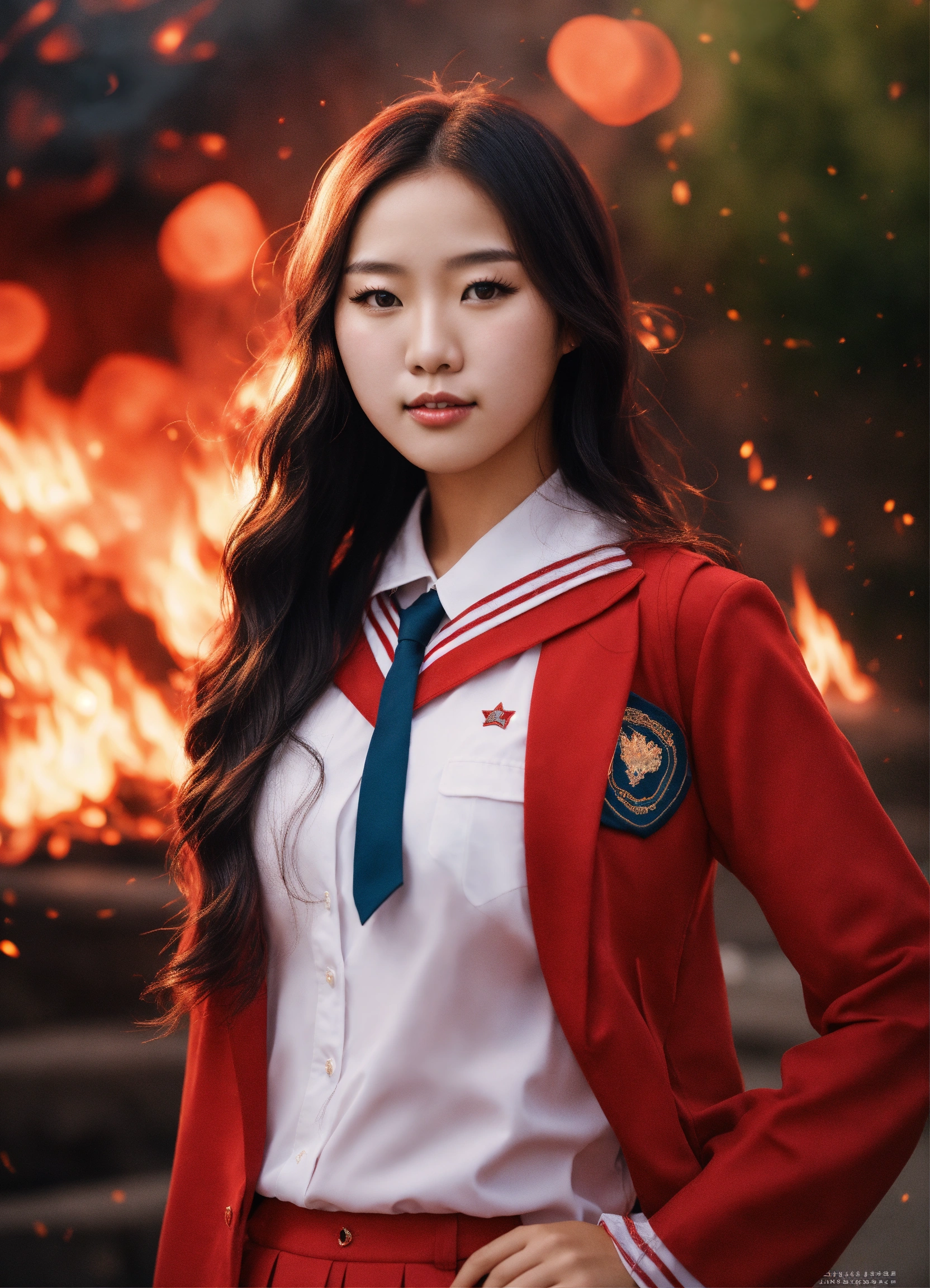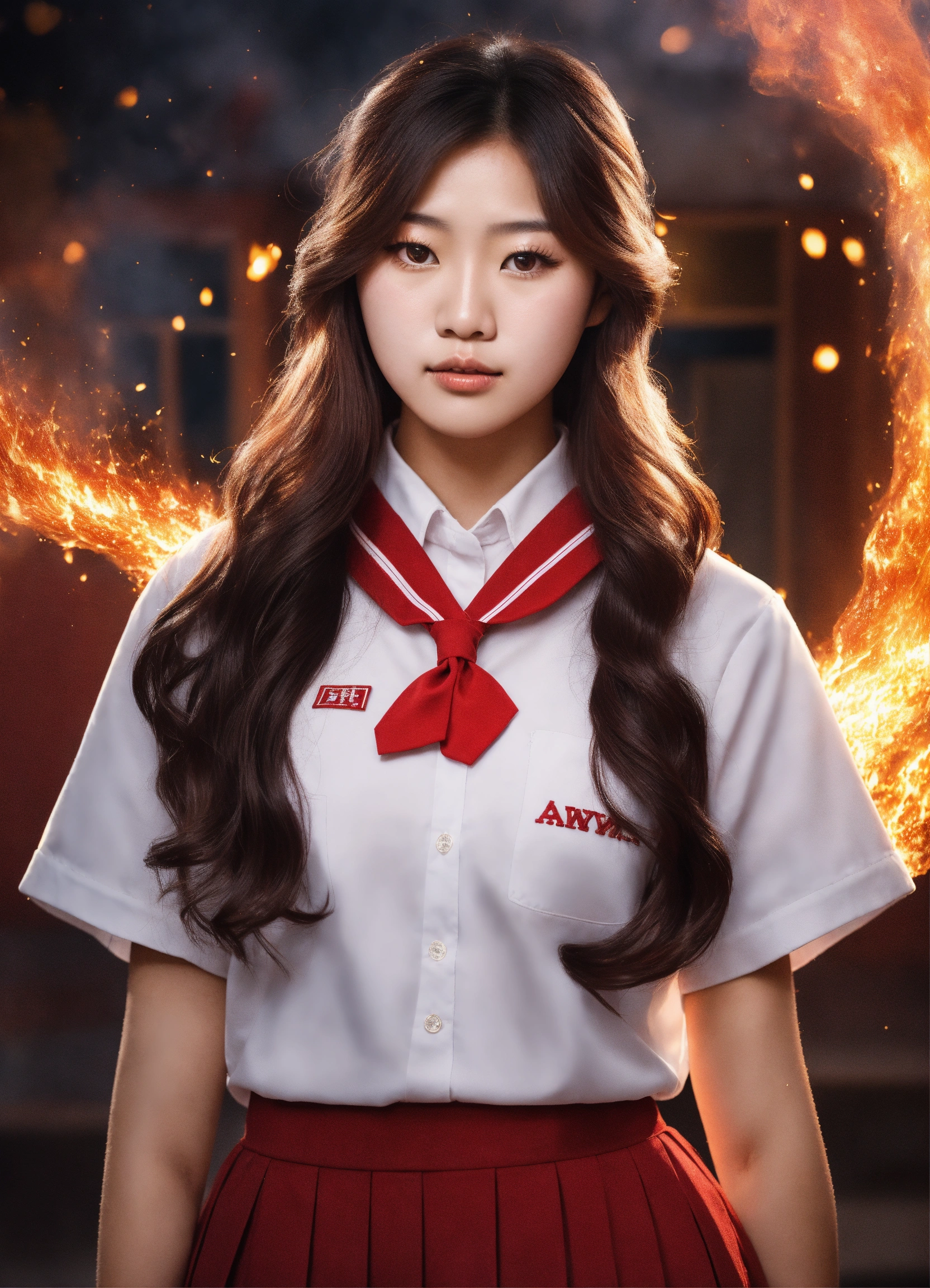 A beautiful half-korean, half-american girl with long wavy dark hair, sparkling white fire over her arms, wearing a red school uniform, realistic. photoshoot