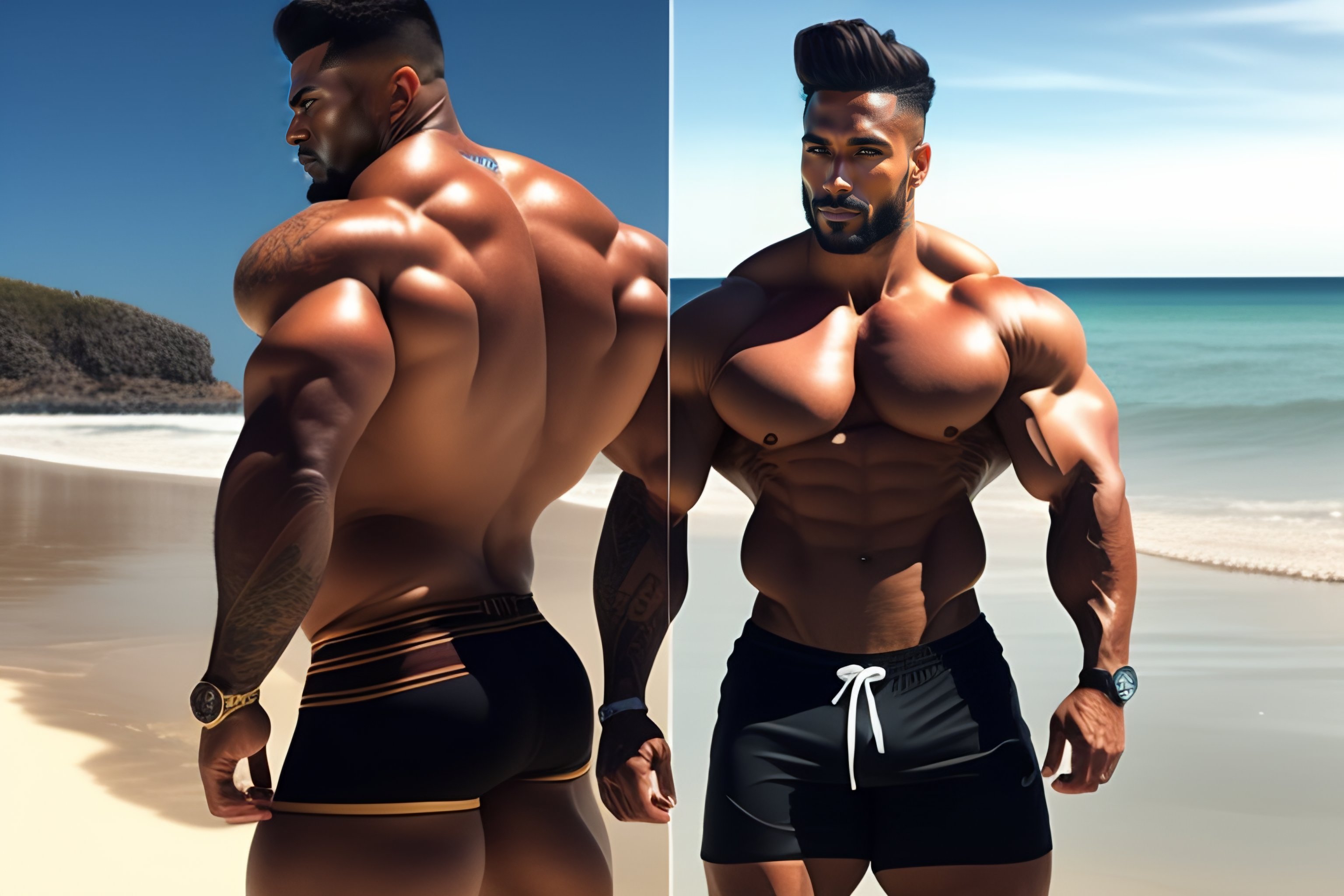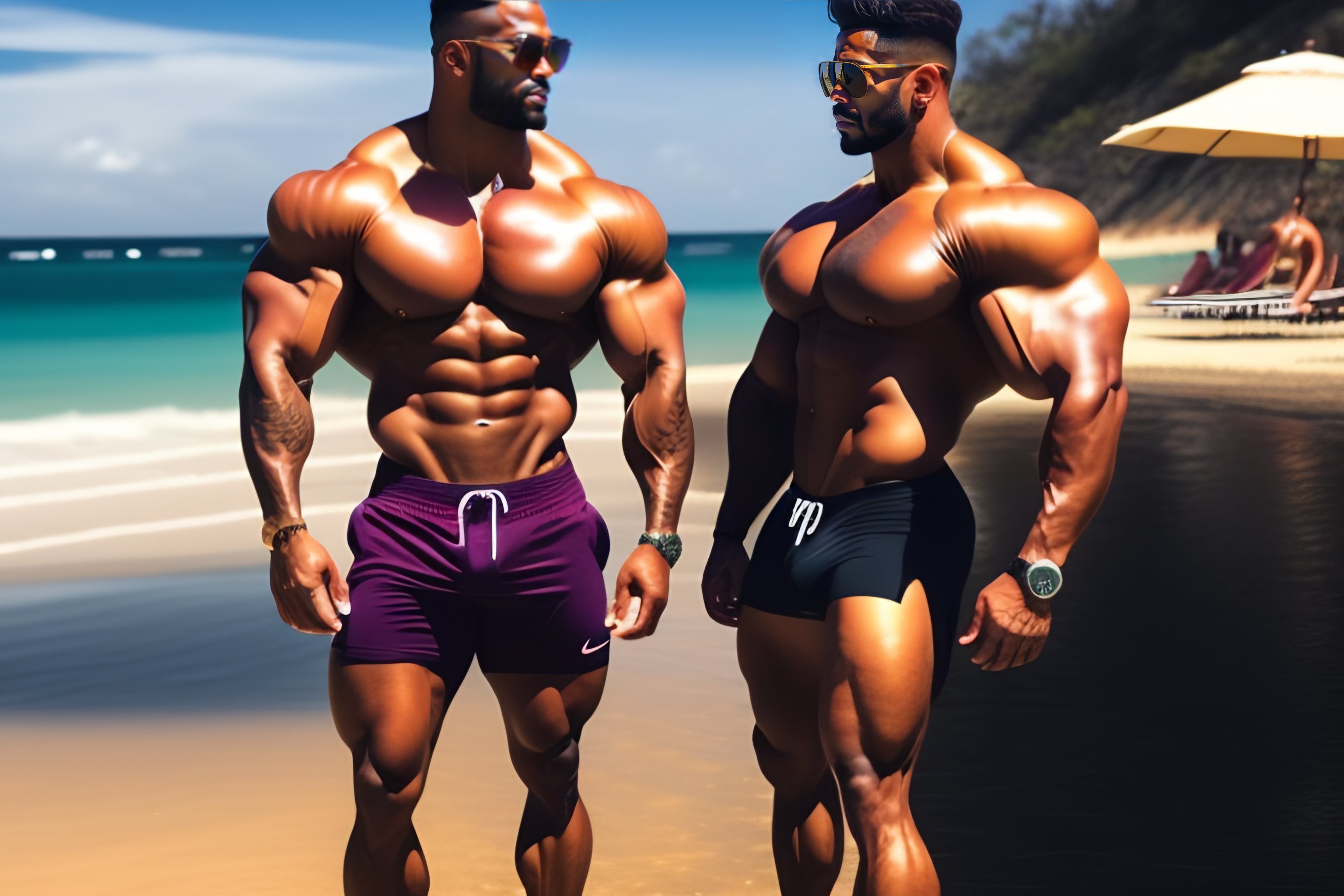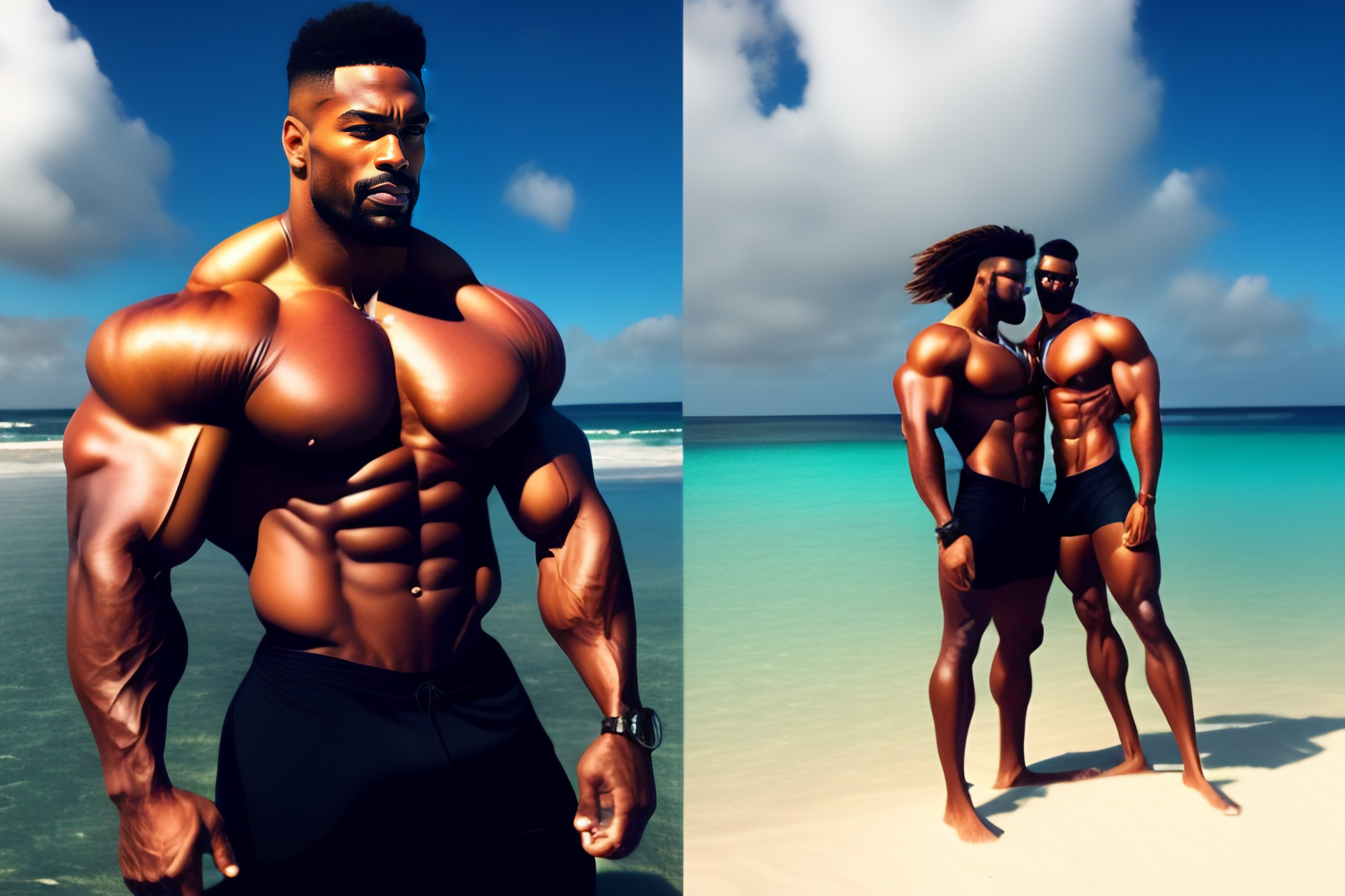 A very muscular man with big arms but very skinny legs on a beach with lots of very gorgeous women in bikini