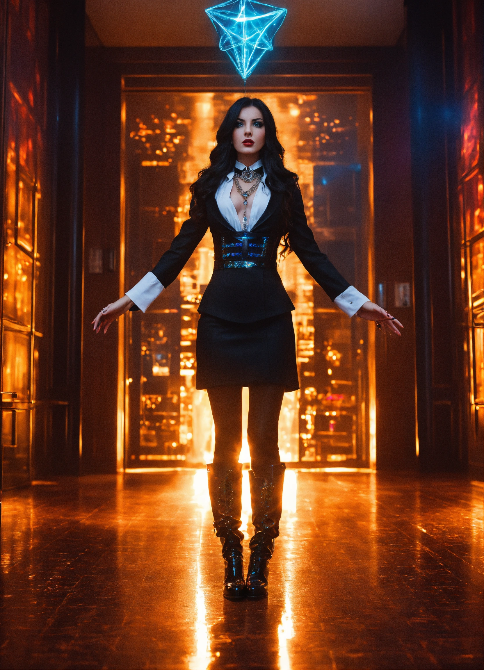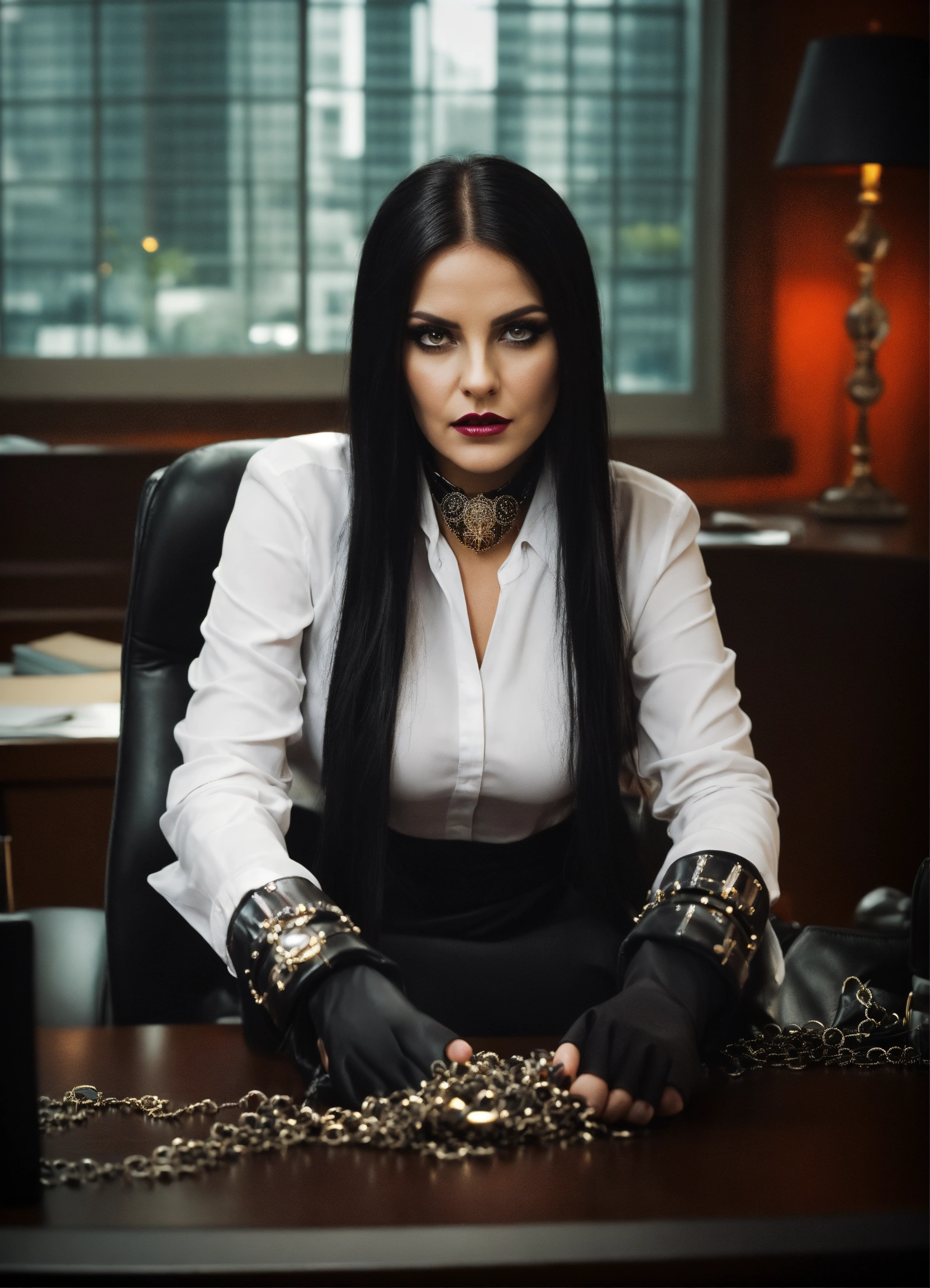 Beautiful extremely breathtaking hypnotic evil, "potent genius intellect" dominating woman, wearing holographic "white cotton arm warmers with occult black magic leather" and entrancing high heeled boots, evil diabolical satanic demonic occult powerful wicked witch corporate hypnotherapist casting a powerful hypnotizing spell with her eyes, working in the corporate office, becoming mindless with her powerful mind numbing words and pendant, you feel her power she exerts on your thoughts and mind, the most powerful person in the corporate office, all obey her deeply hypnotizing suggestions helpless under her extremely powerful spell, corporate office takeover is inevitable if looking into her mind controlling eyes and full shimmering lips, she swings her hypnotic pendant as you fall under her evil spell