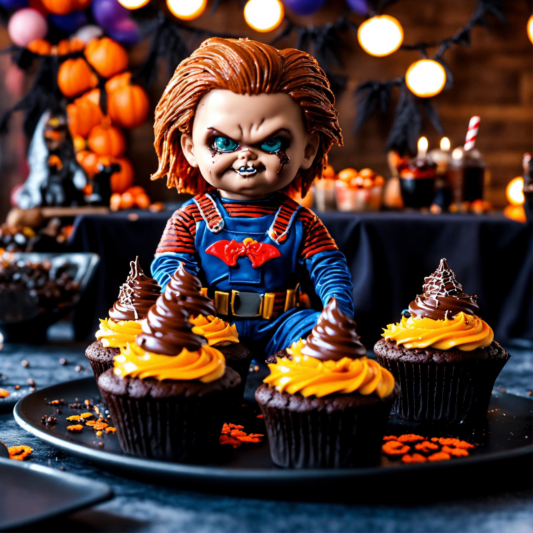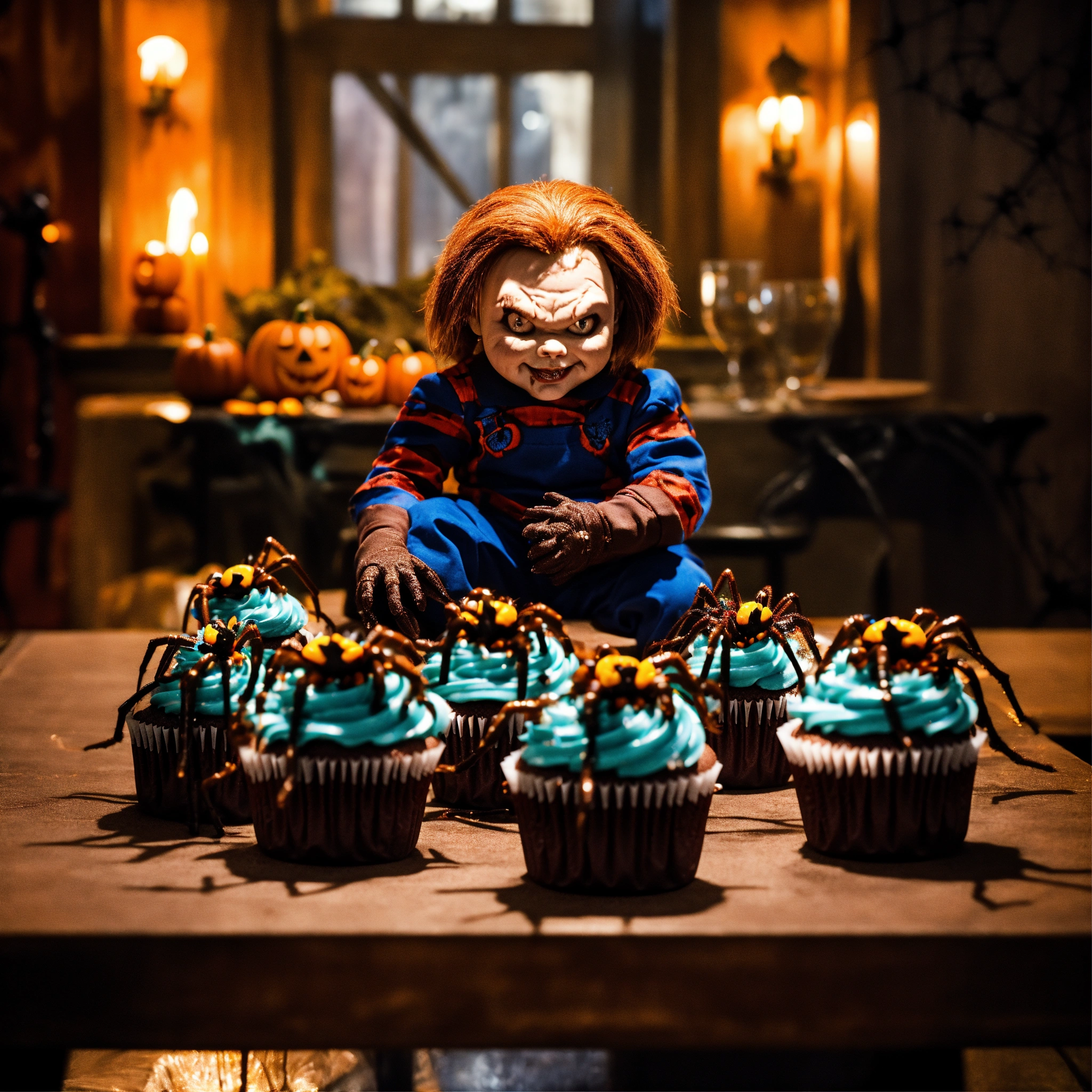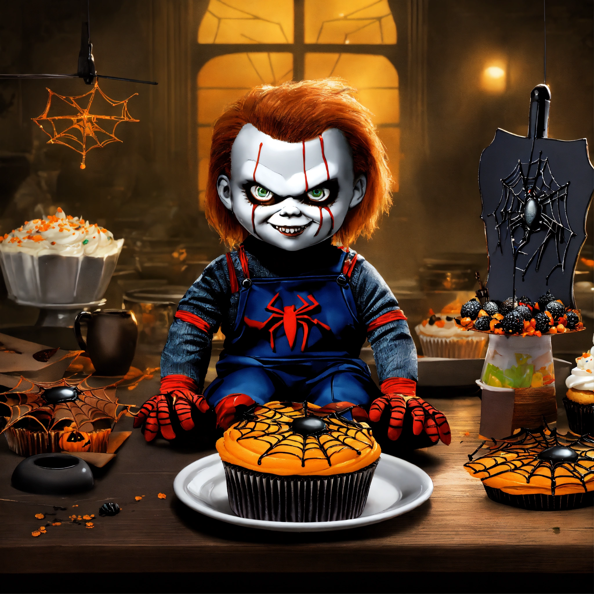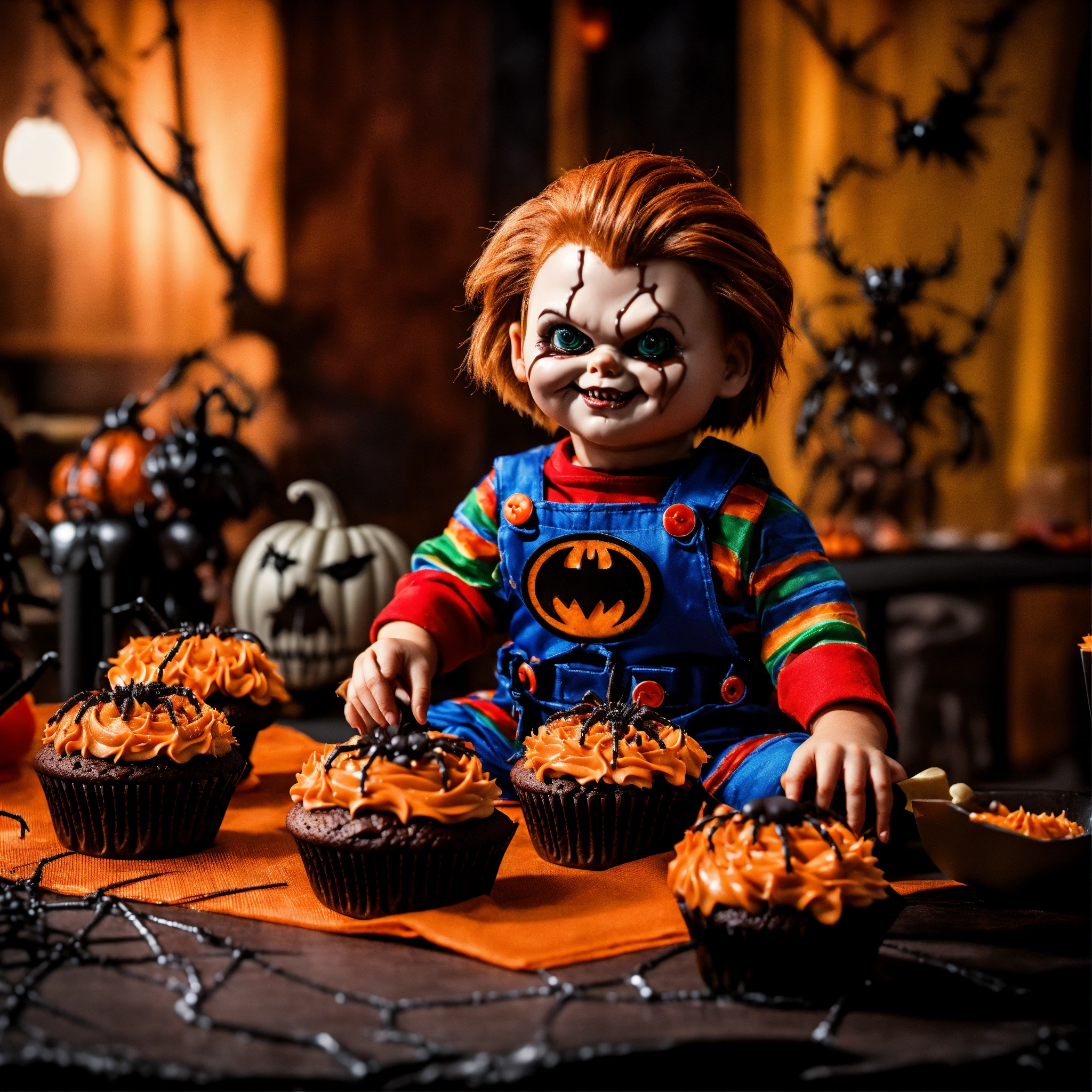 Chucky sitting at a table in gotham city on a halloween party. on the table chocolate cupcakes in the shape of spiders, decorated with spider webs of icing