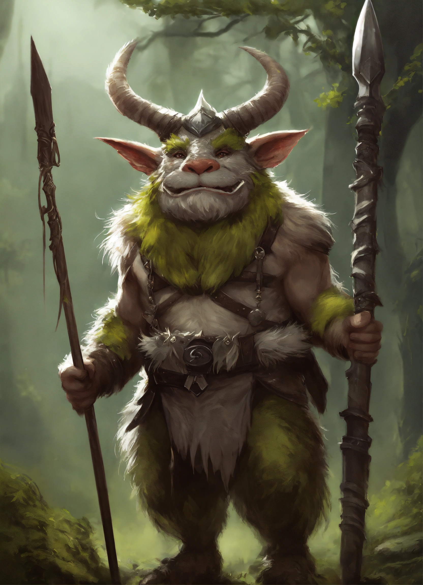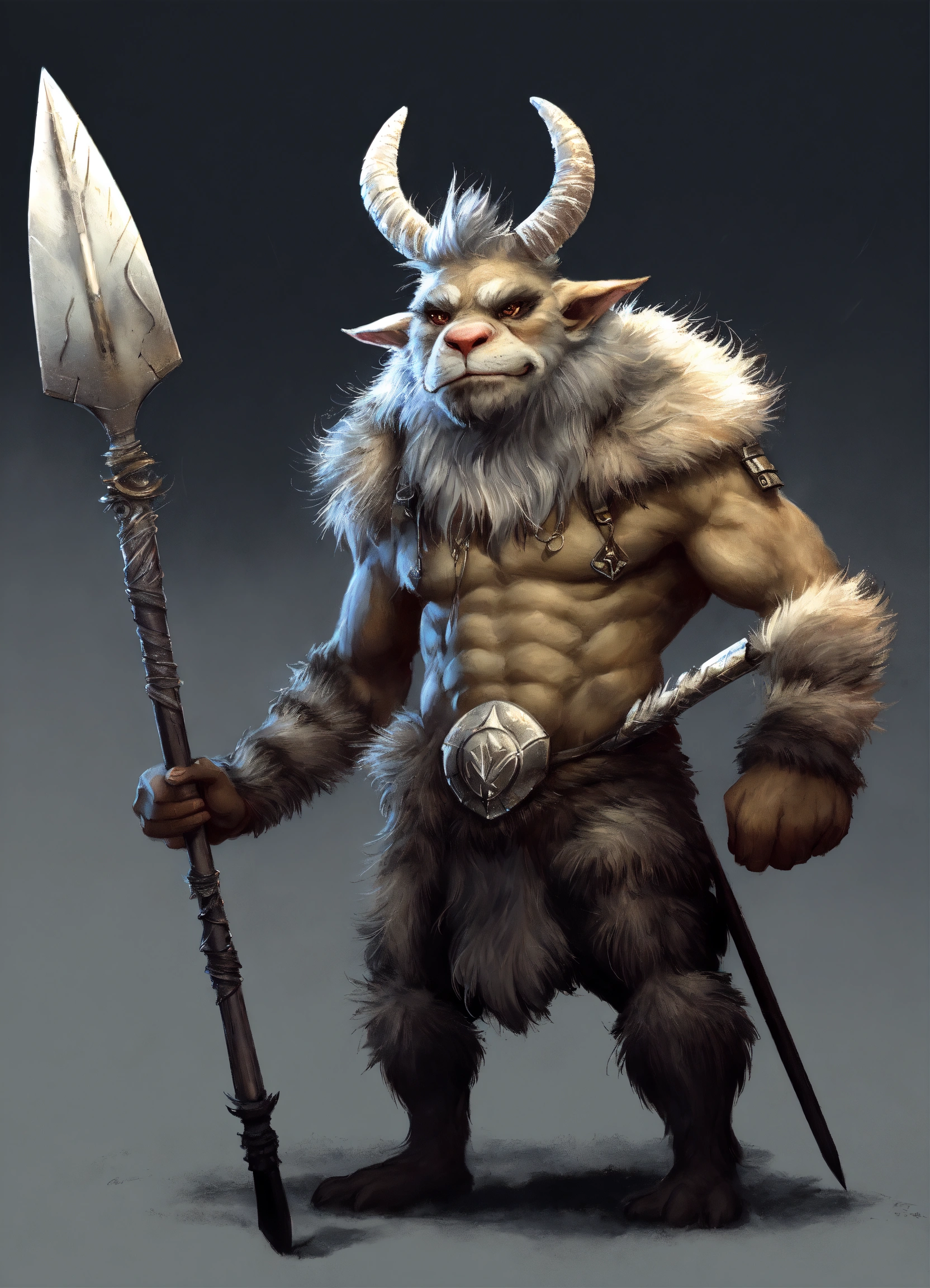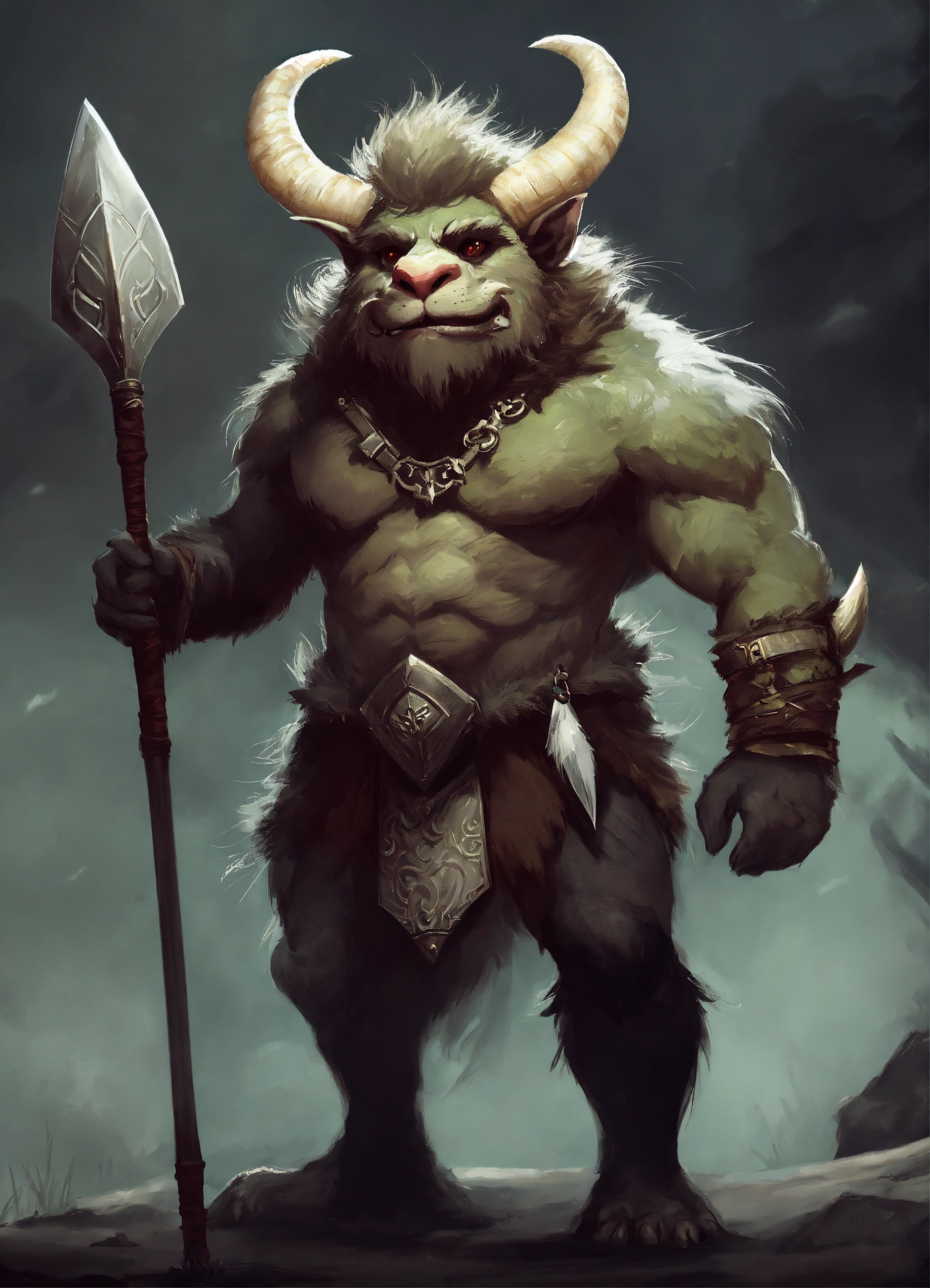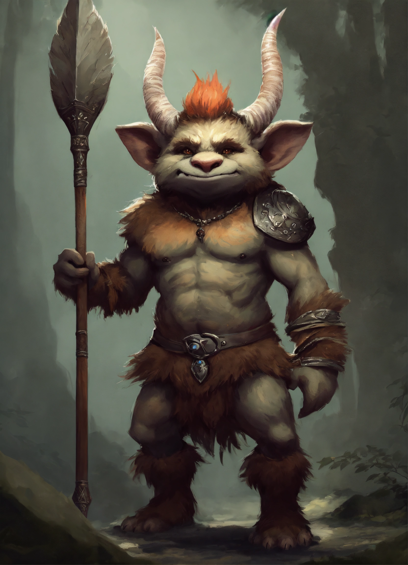 Digital painting, illustration, creature concept art, a kind troll, furry, small horns, graphic grey scale, whimsical, warrior, spear, style of scott flanders