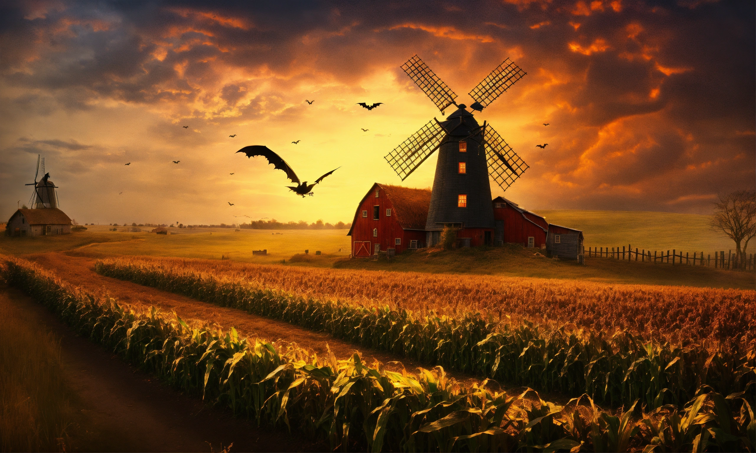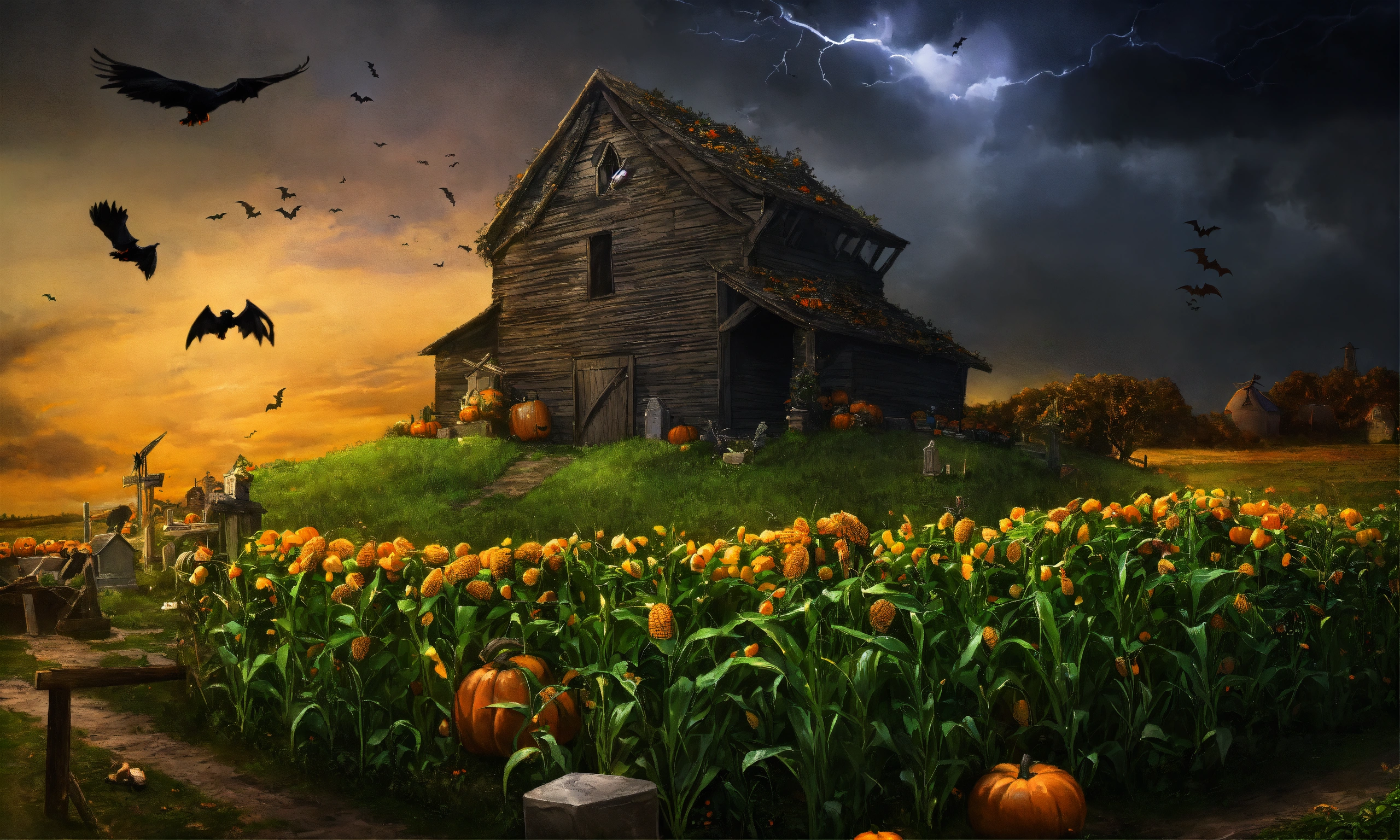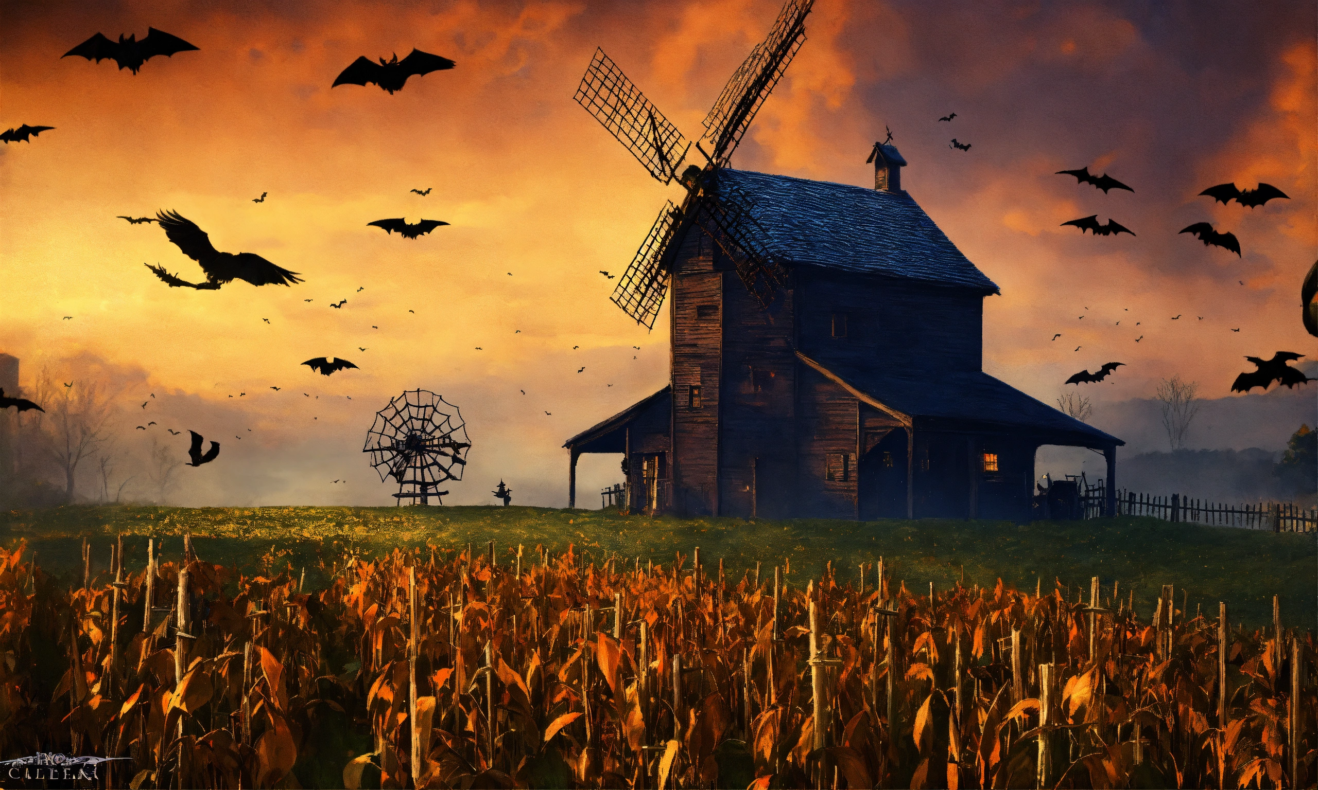Witches, poison, halloween, corn field, haunted house, crows, barn, windmill, cave, bats, tornado, snake, tarantuls, cementery, grave, rats, cats, owls
