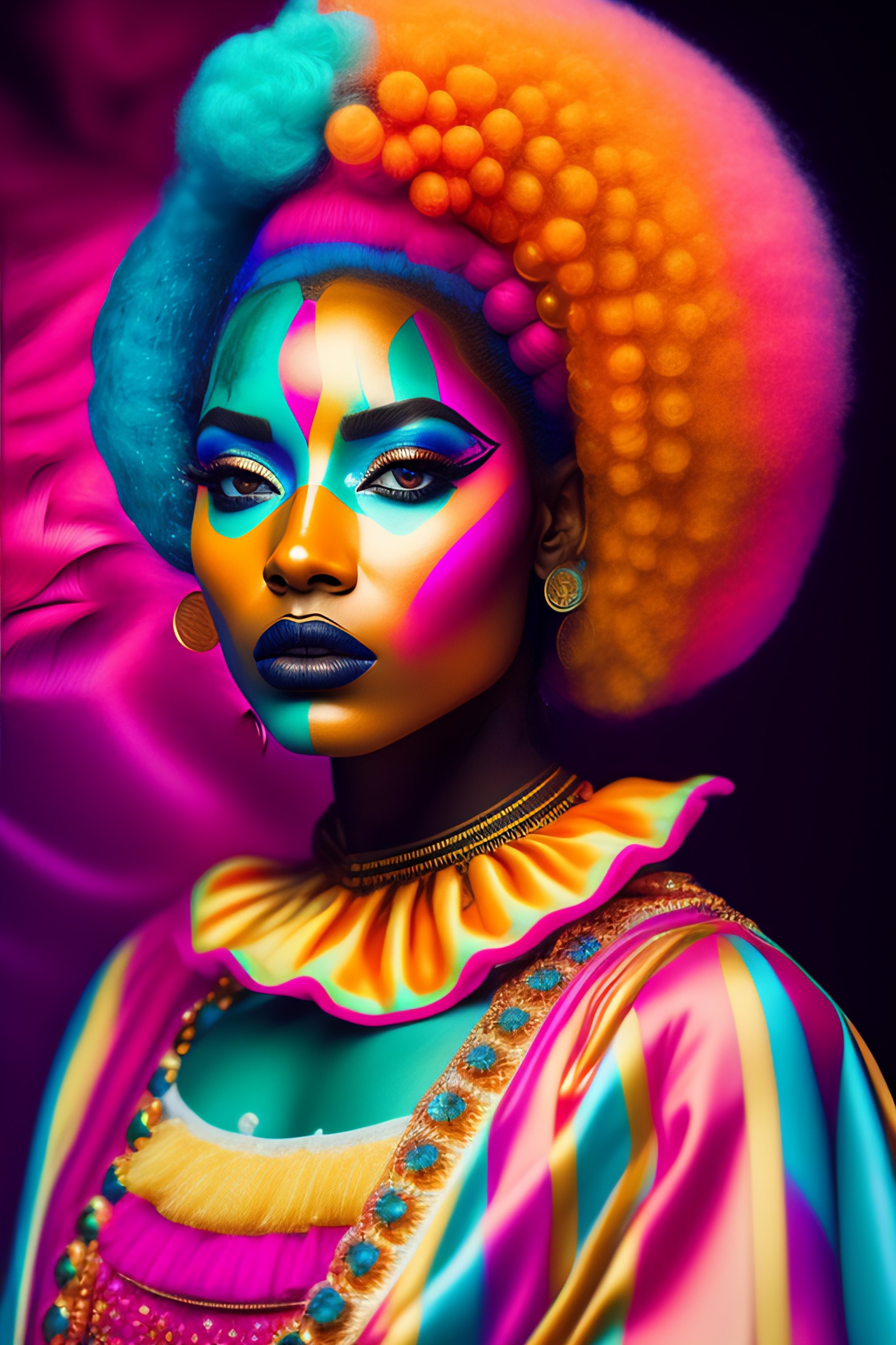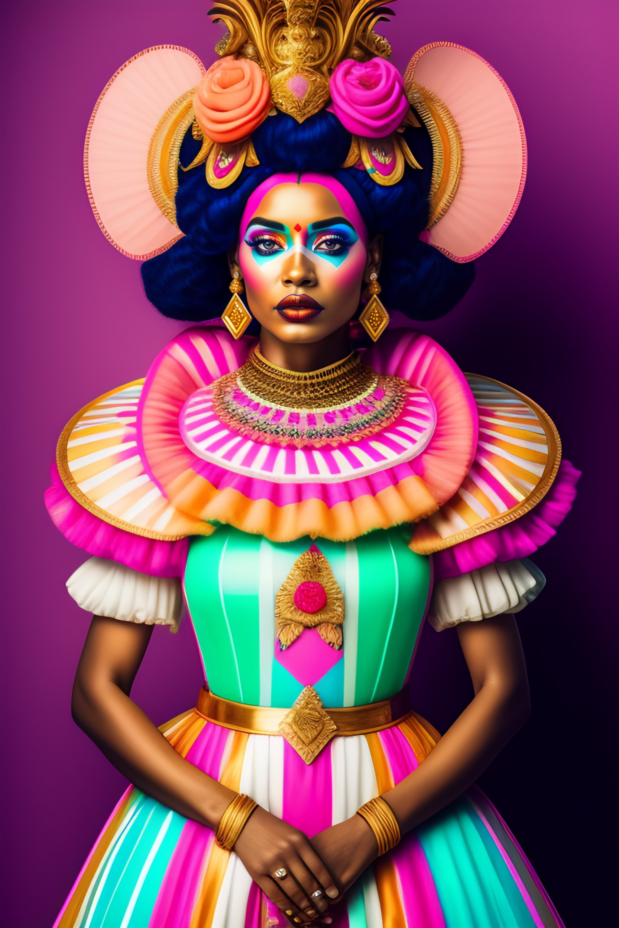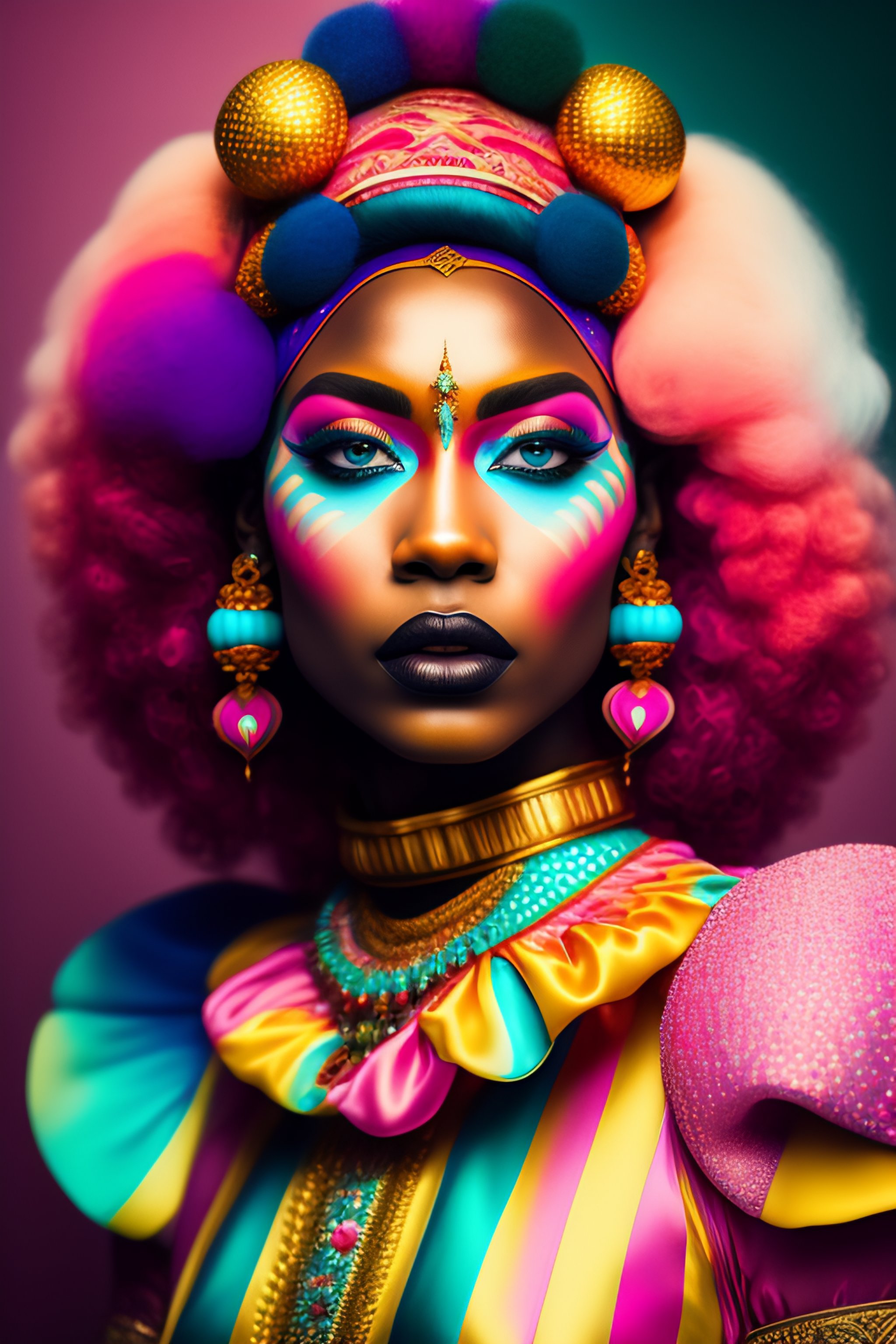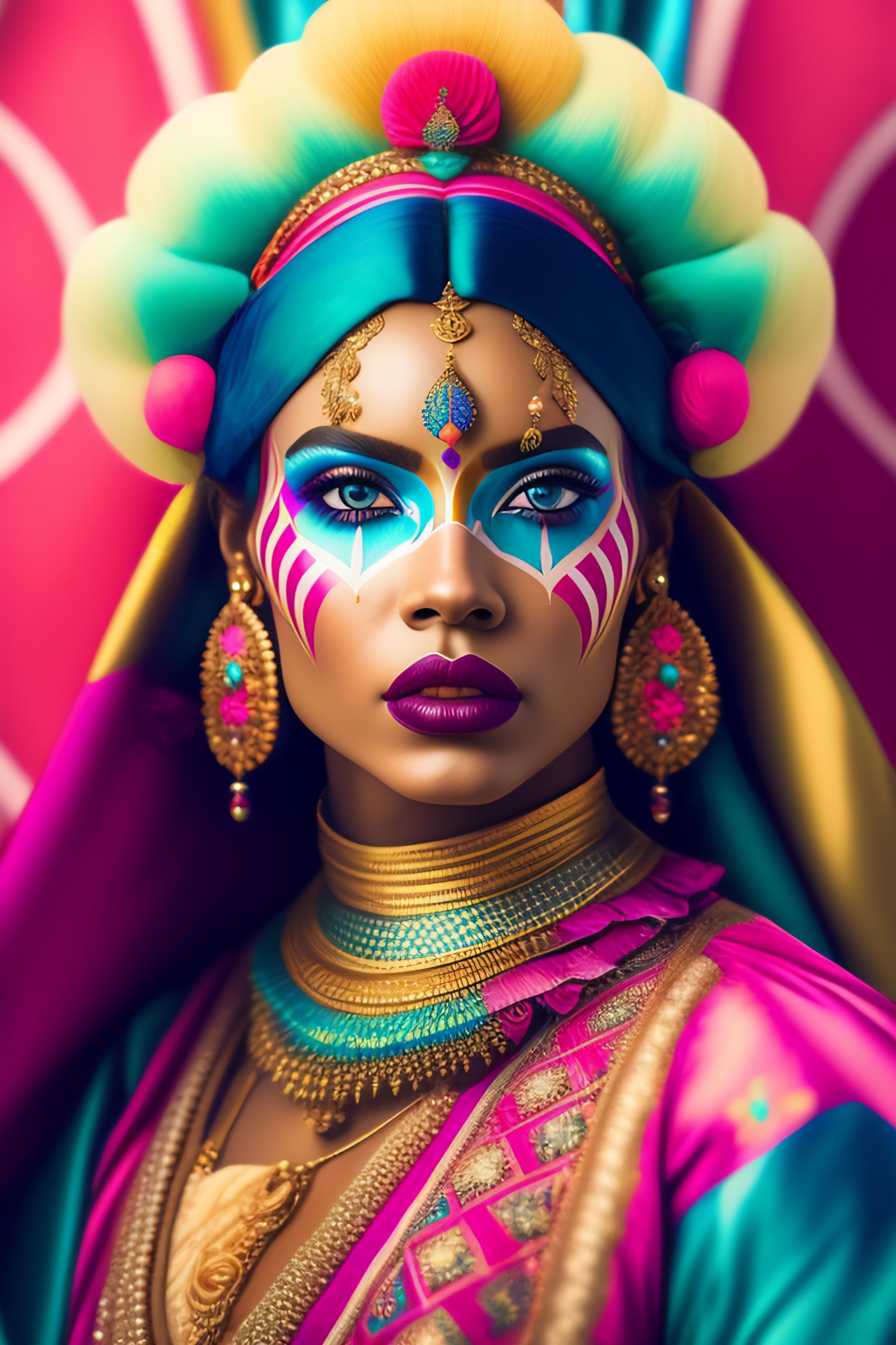 Epic portrait of venetian harlequin female clown in pastel stripes of coral, pink, mint green, powder blue with gold intricate embellishments and geometric patterns and designs, (high definition)++, photography, cinematic, detailed character portrait, ++detailed and intricate environment