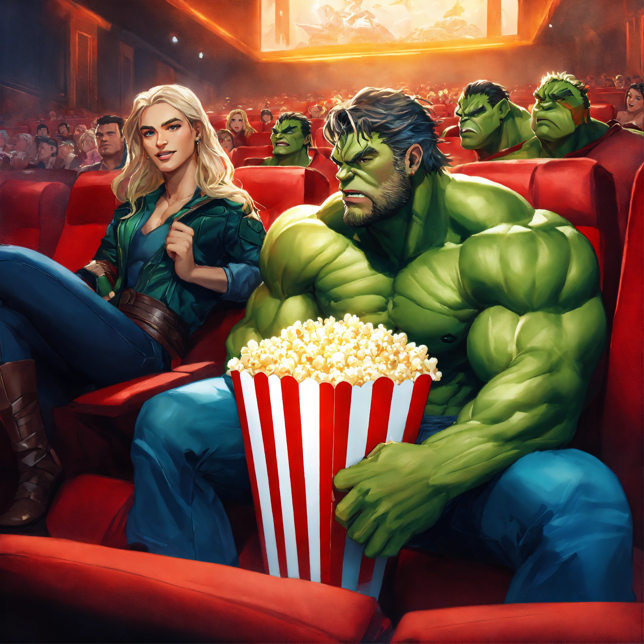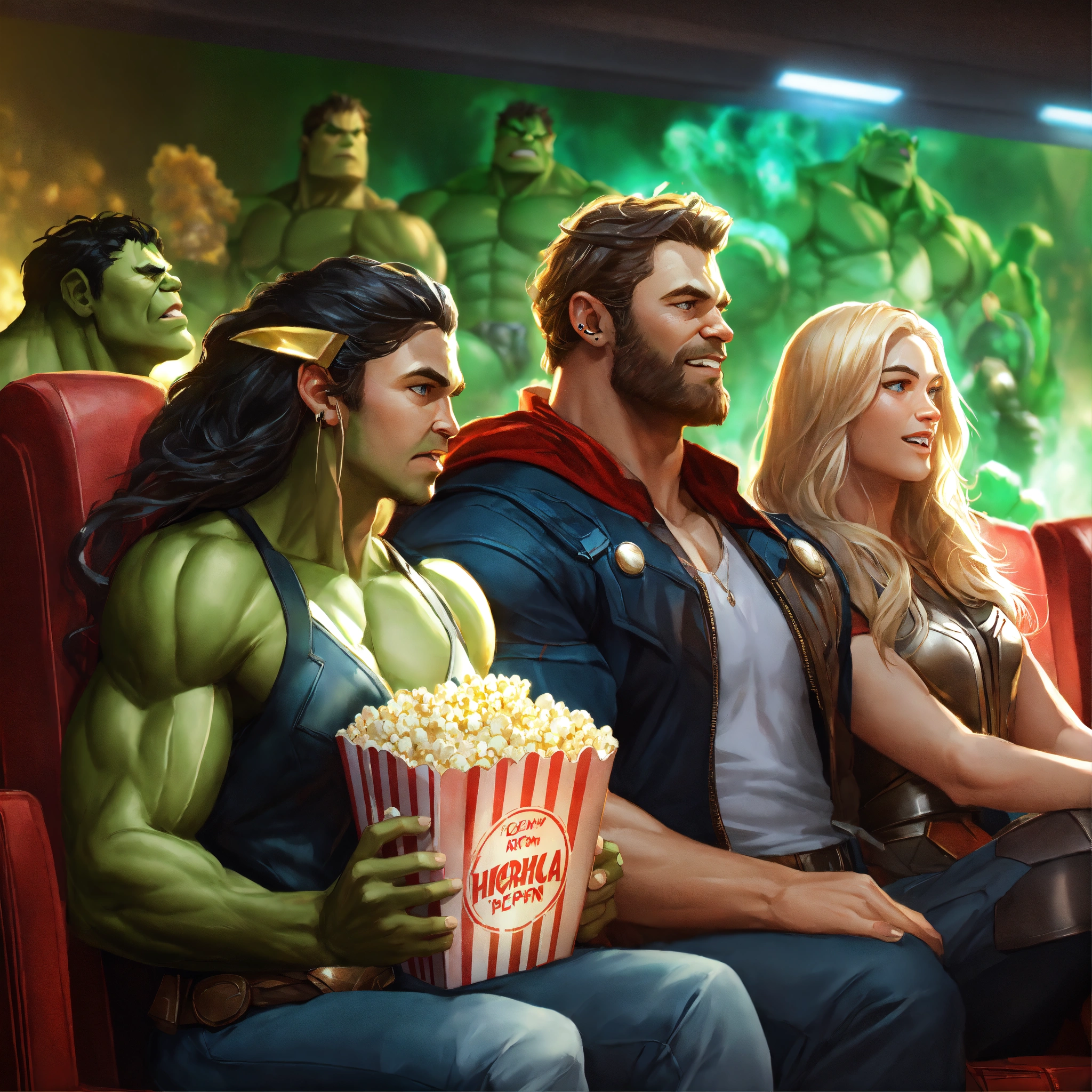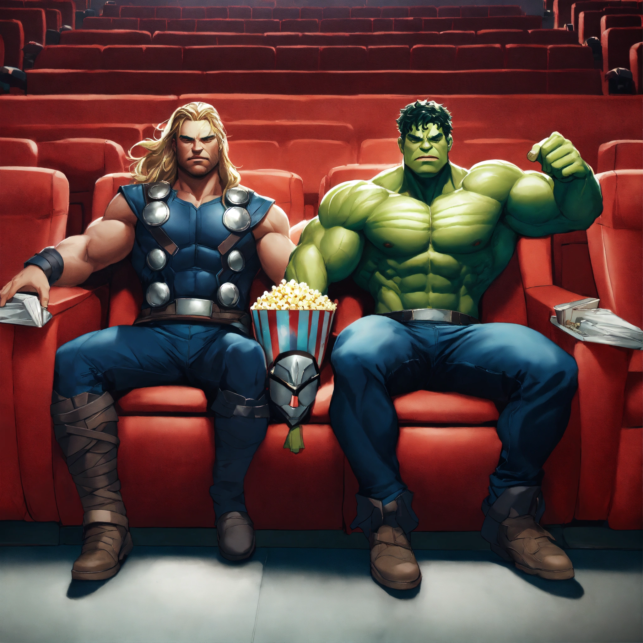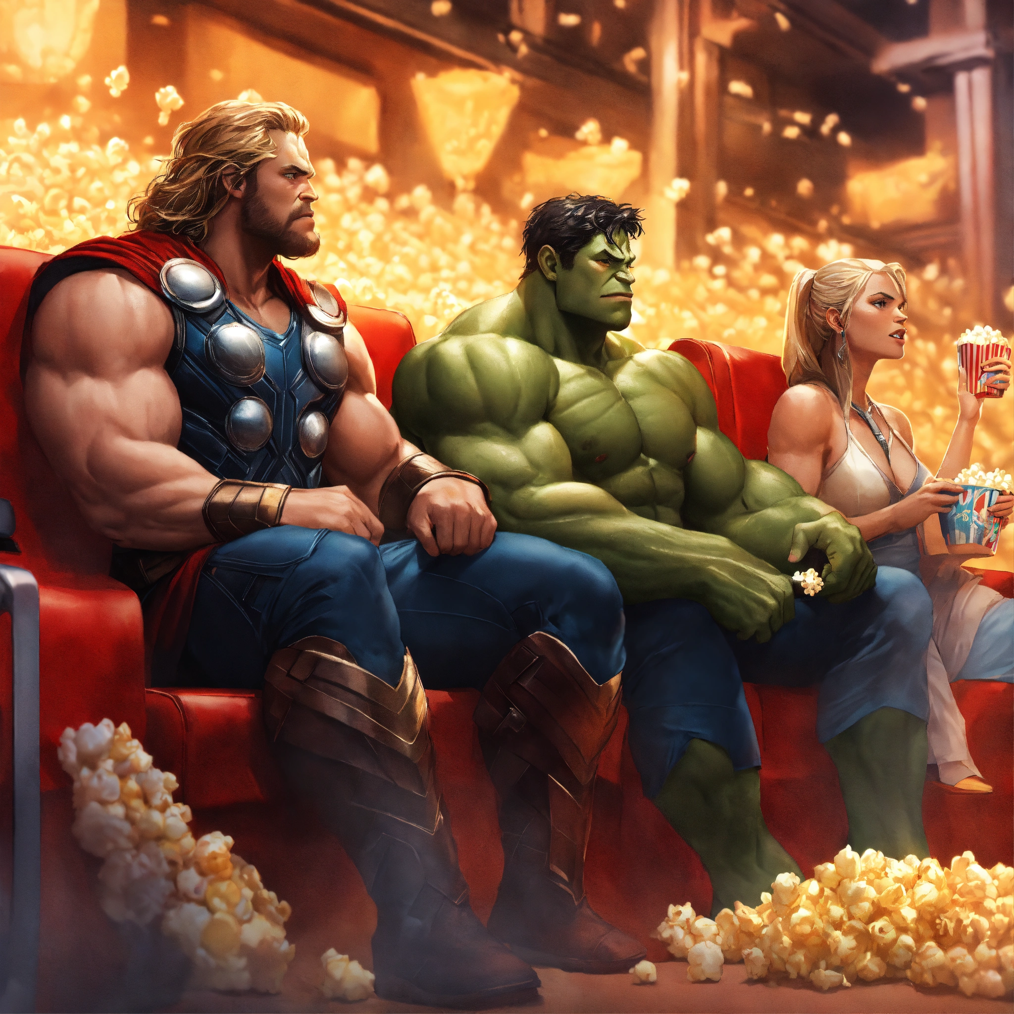 Artgerm, thor and hulk, sitting in a cinema, watching and earing a lot popcorn, having fun, detailed, 8k