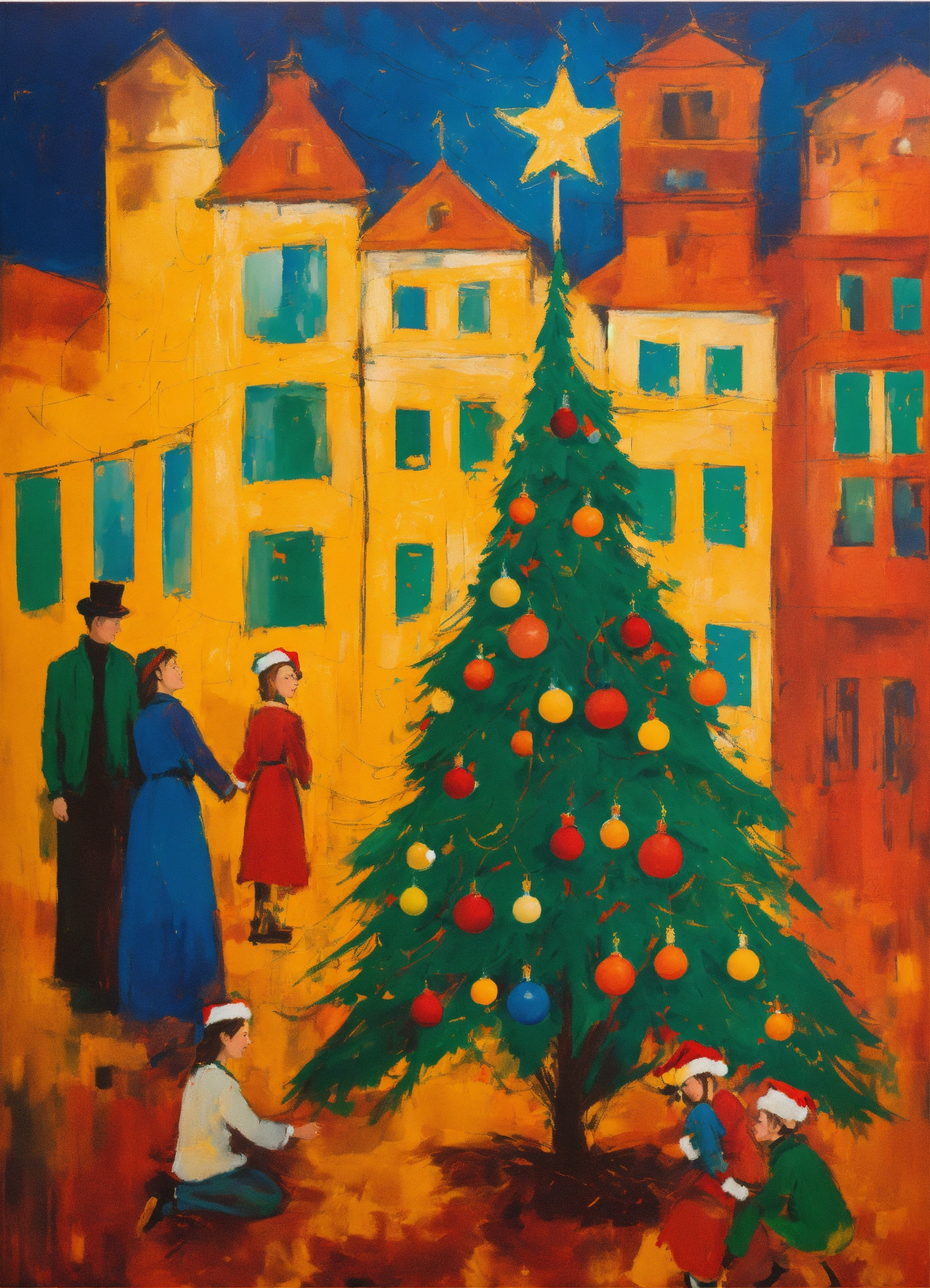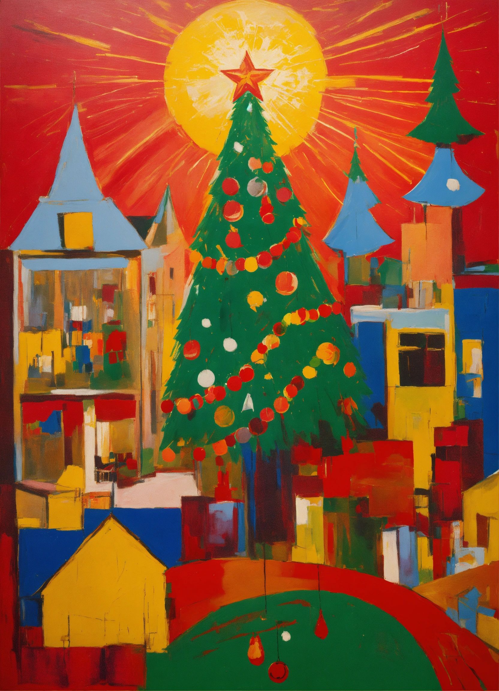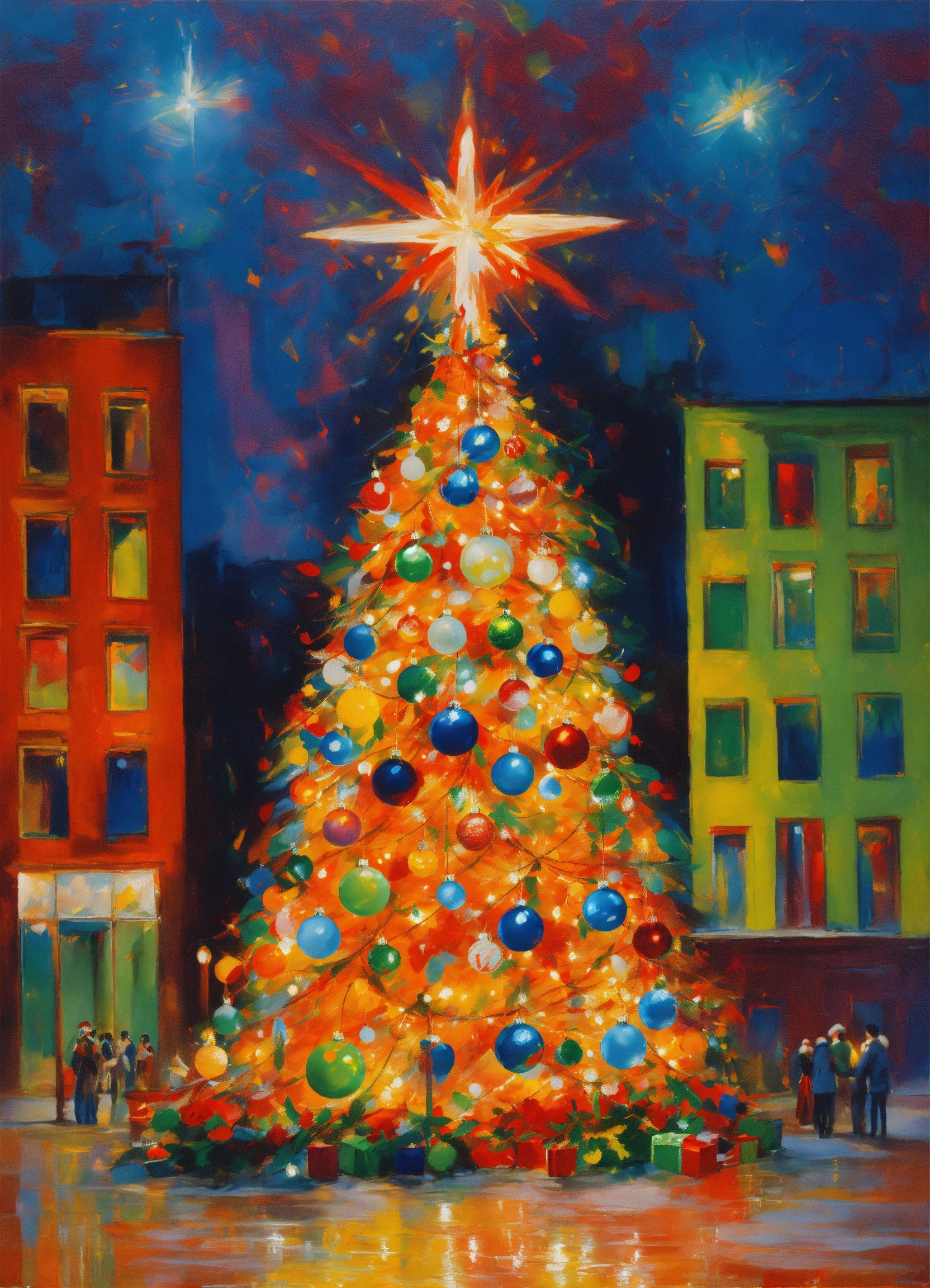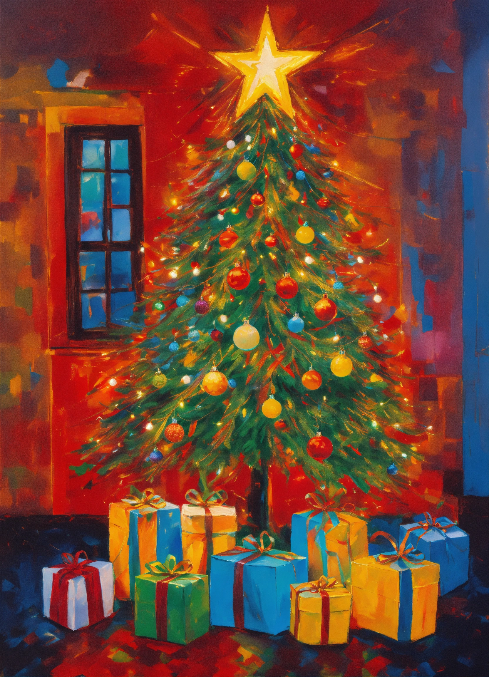 Neo-expressionist christmas a festive embrace.' in this emotionally charged style, vividly depict christmas symbols such as the christmas tree, ornaments, and festive lights using bold, expressive strokes and vibrant colors. illuminate the scene with the dazzling lights and the joyous decorations, casting an intense and passionate light. the artwork should capture the profound emotional essence of christmas, celebrating the spirit of togetherness and festivity through neo-expressionism