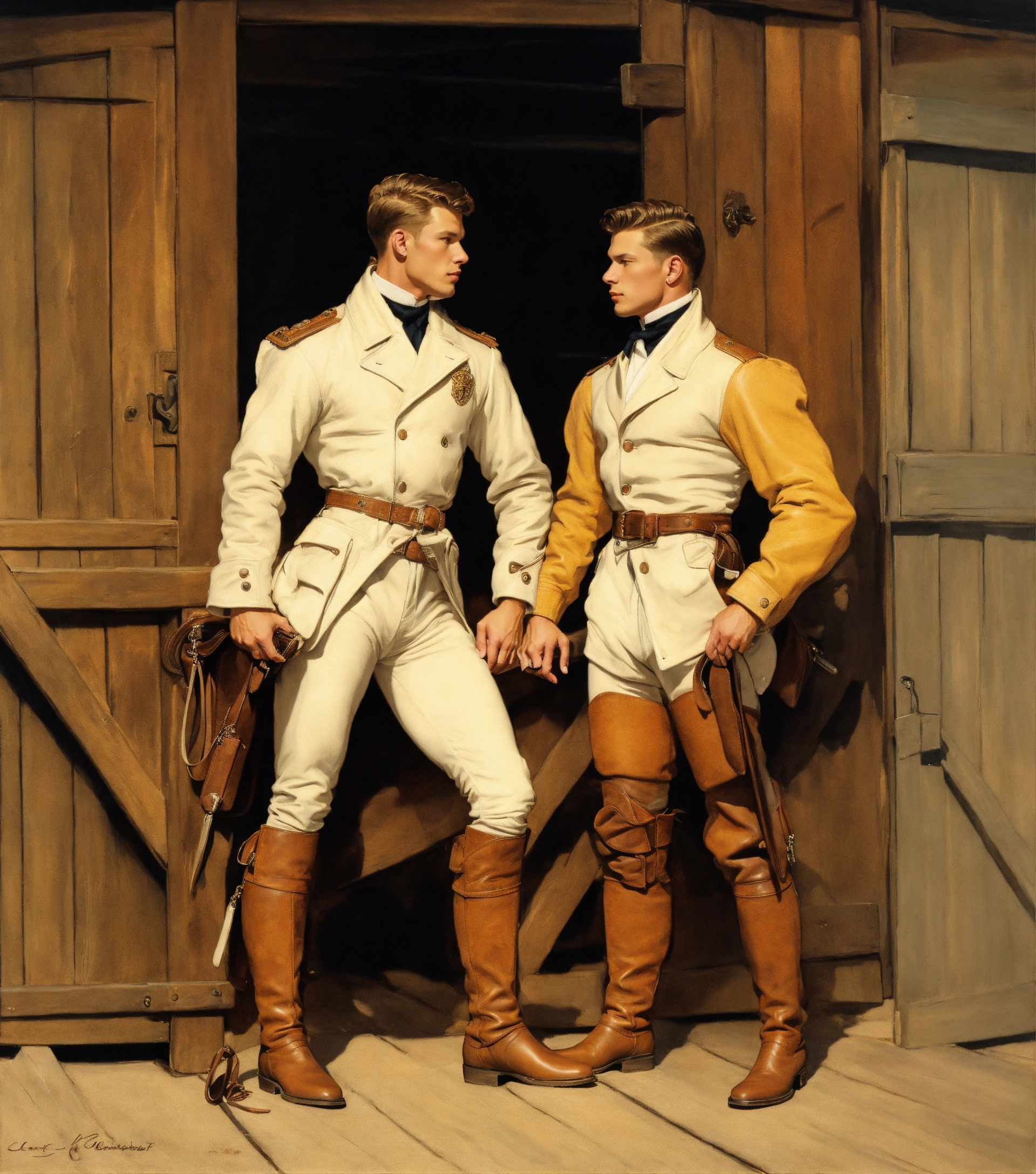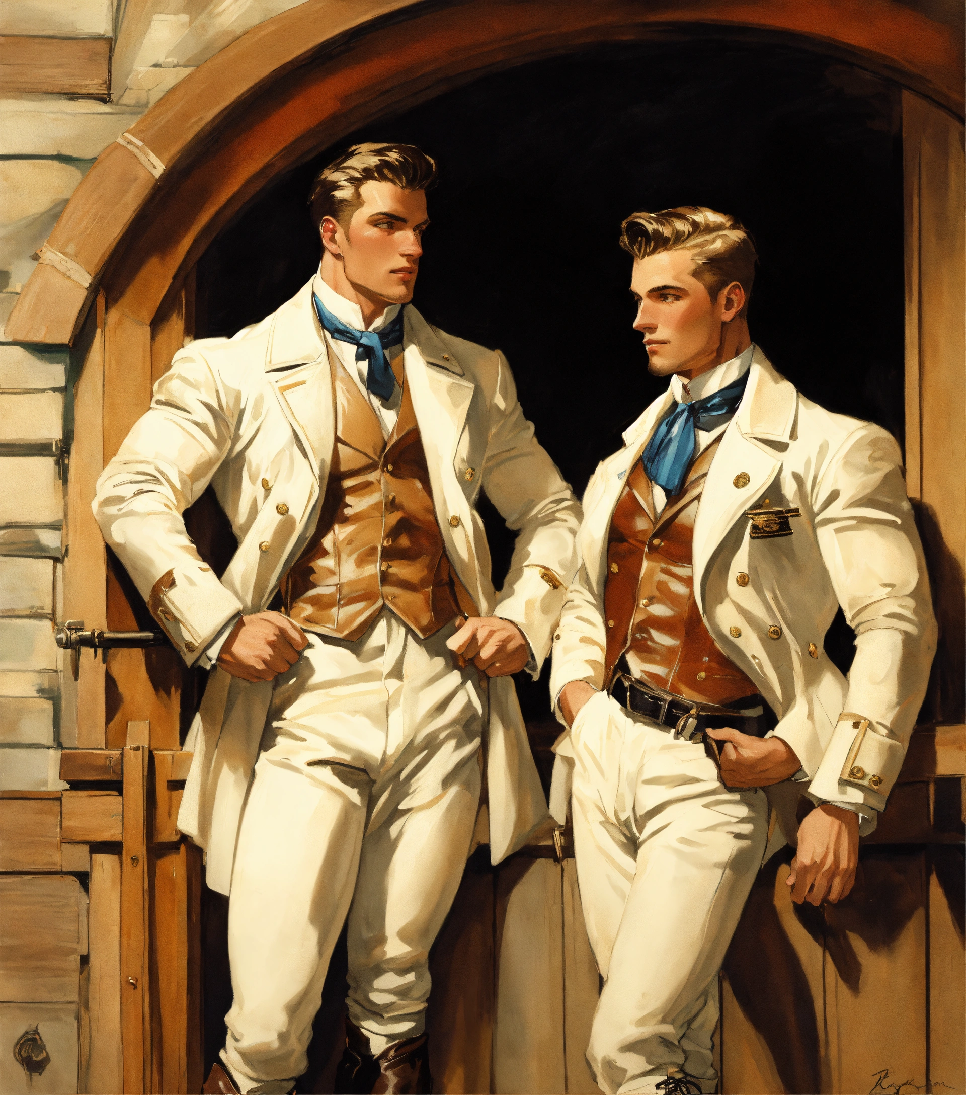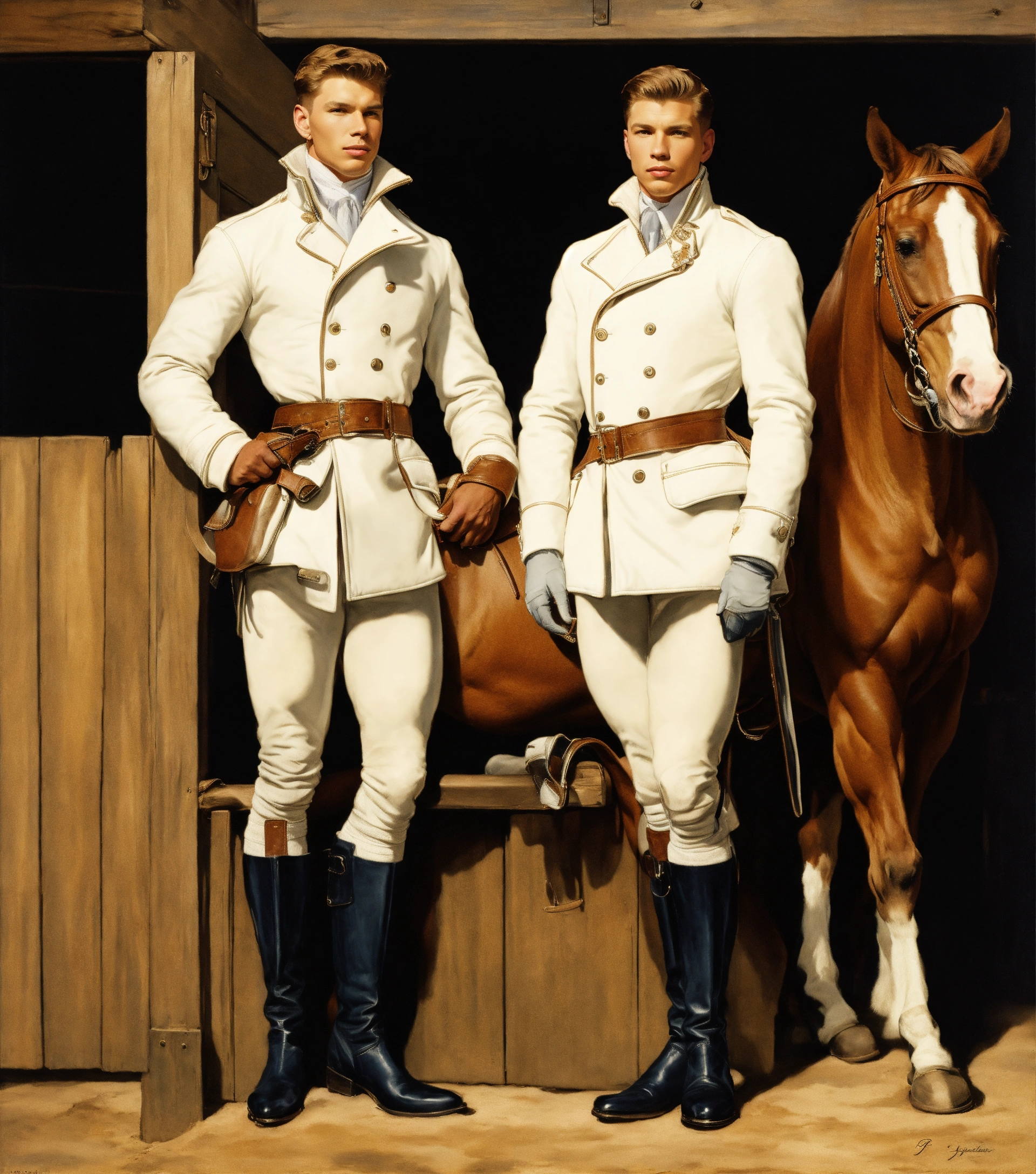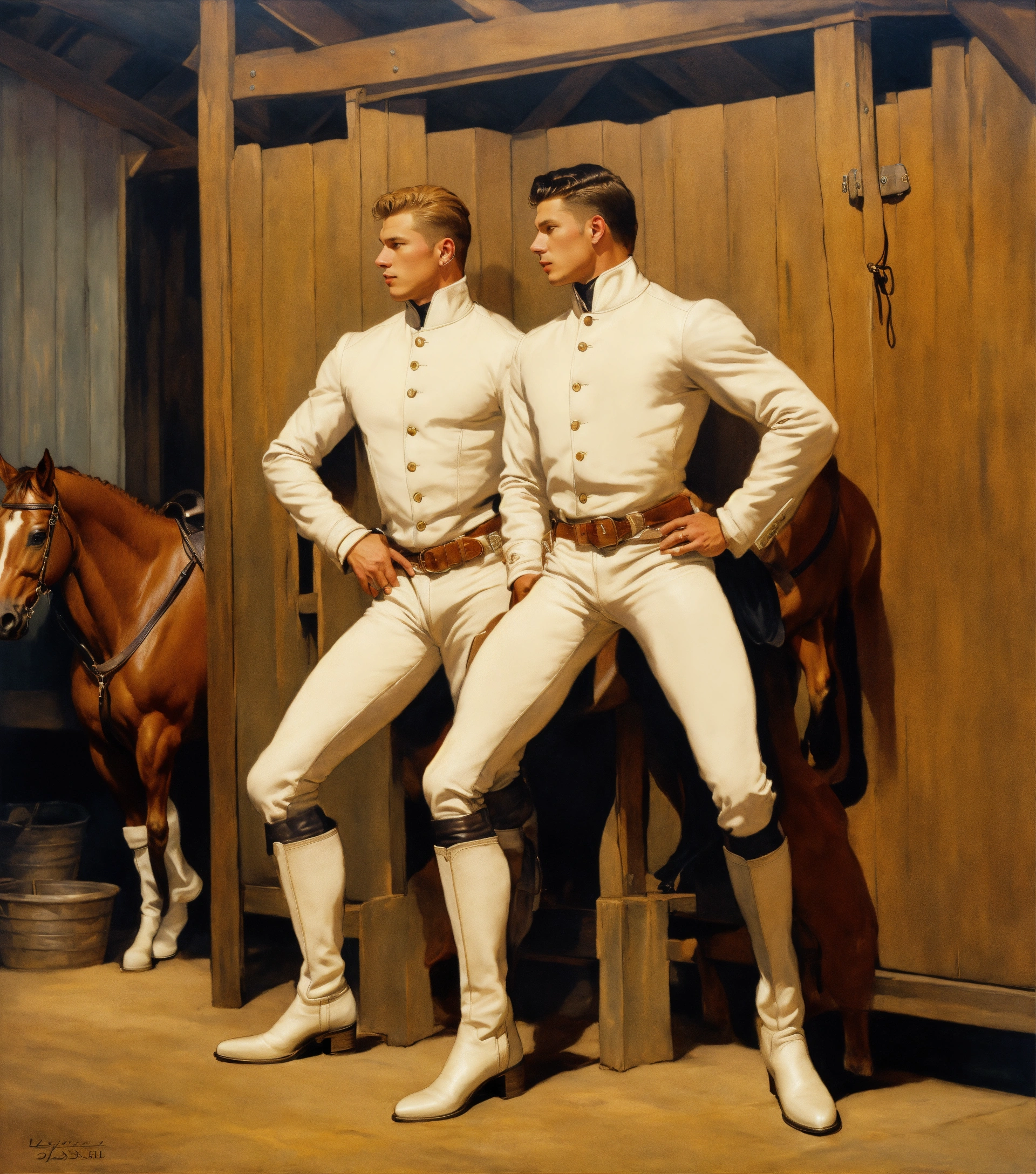 Two muscled sportsmen in white jacket, white saddlebags, leather boots, in a stable, leyendecker style