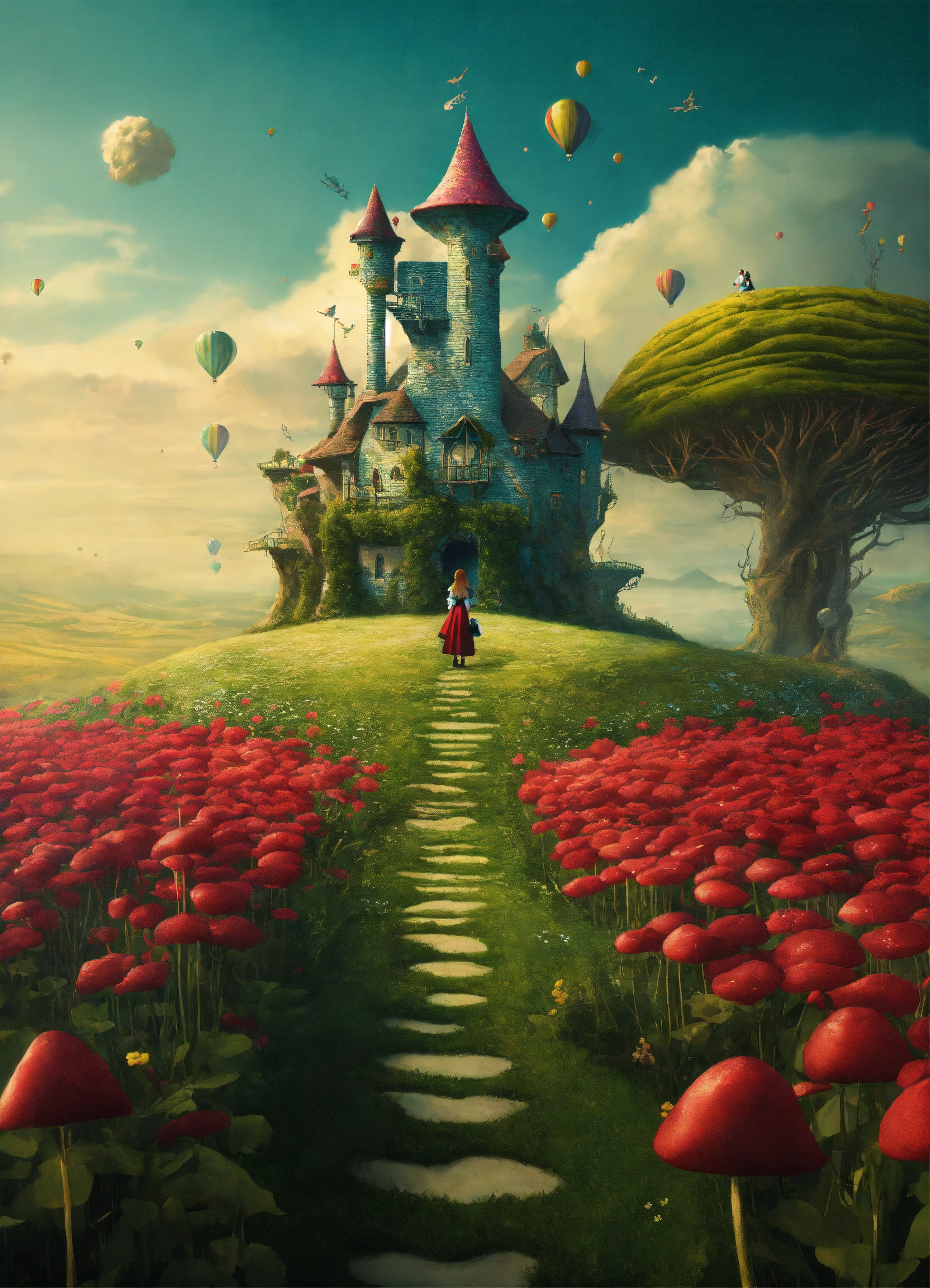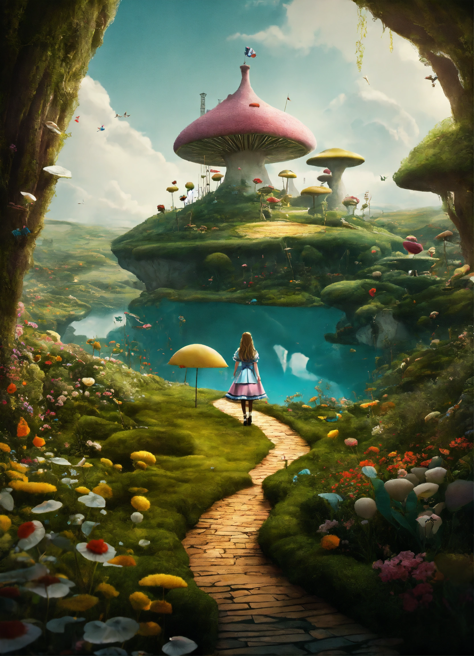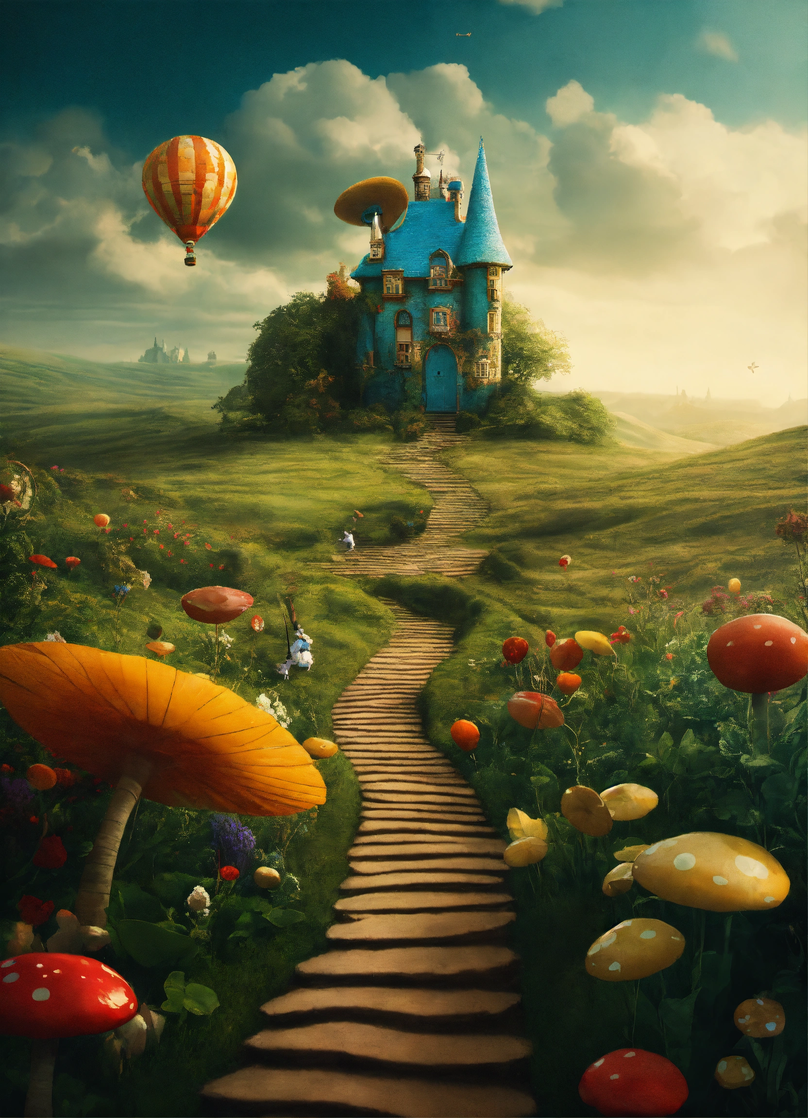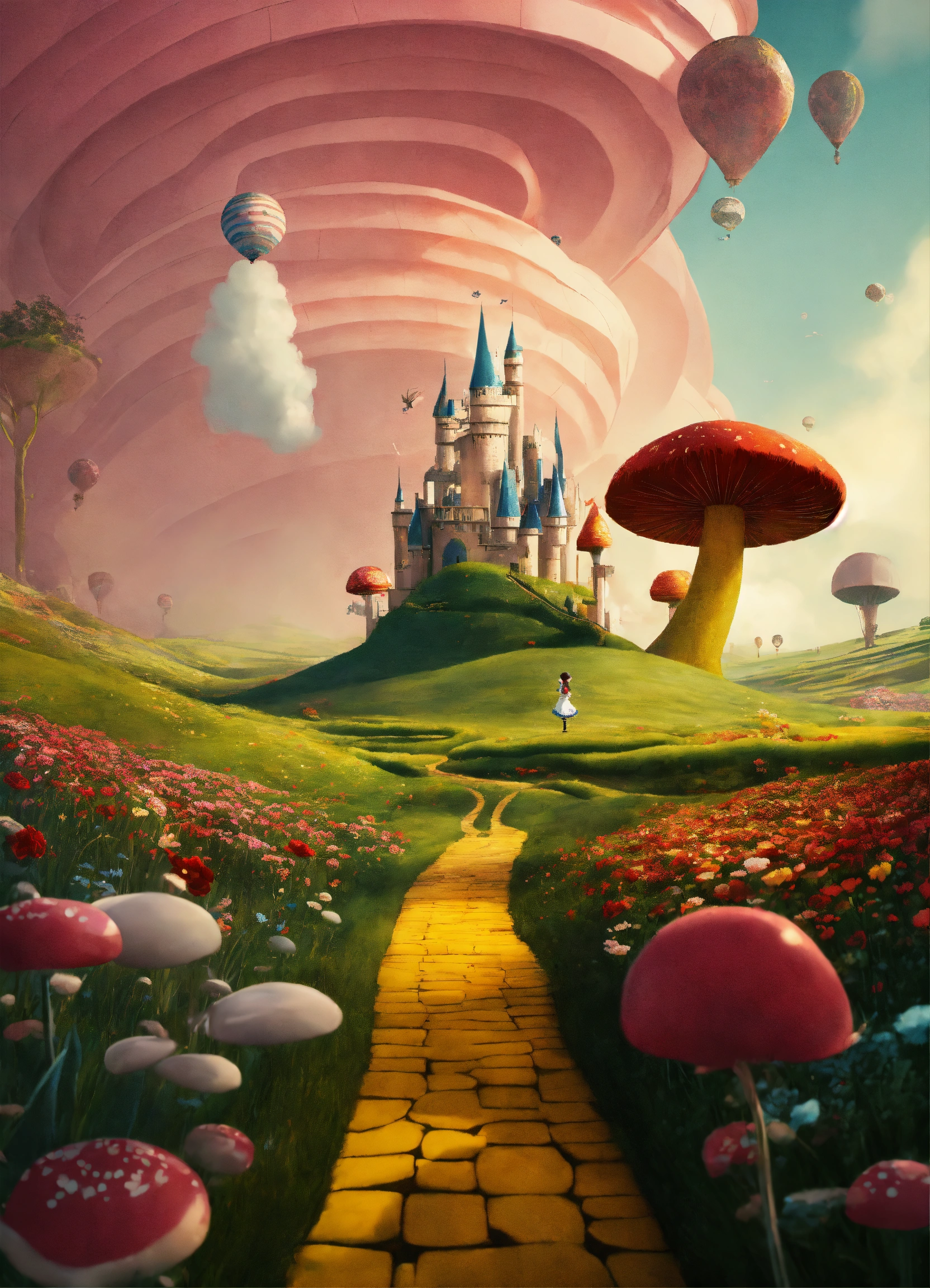 Alice in wonderland landscape meets wizard of oz hd, minimalist and sleek conceptual environment, surrealism