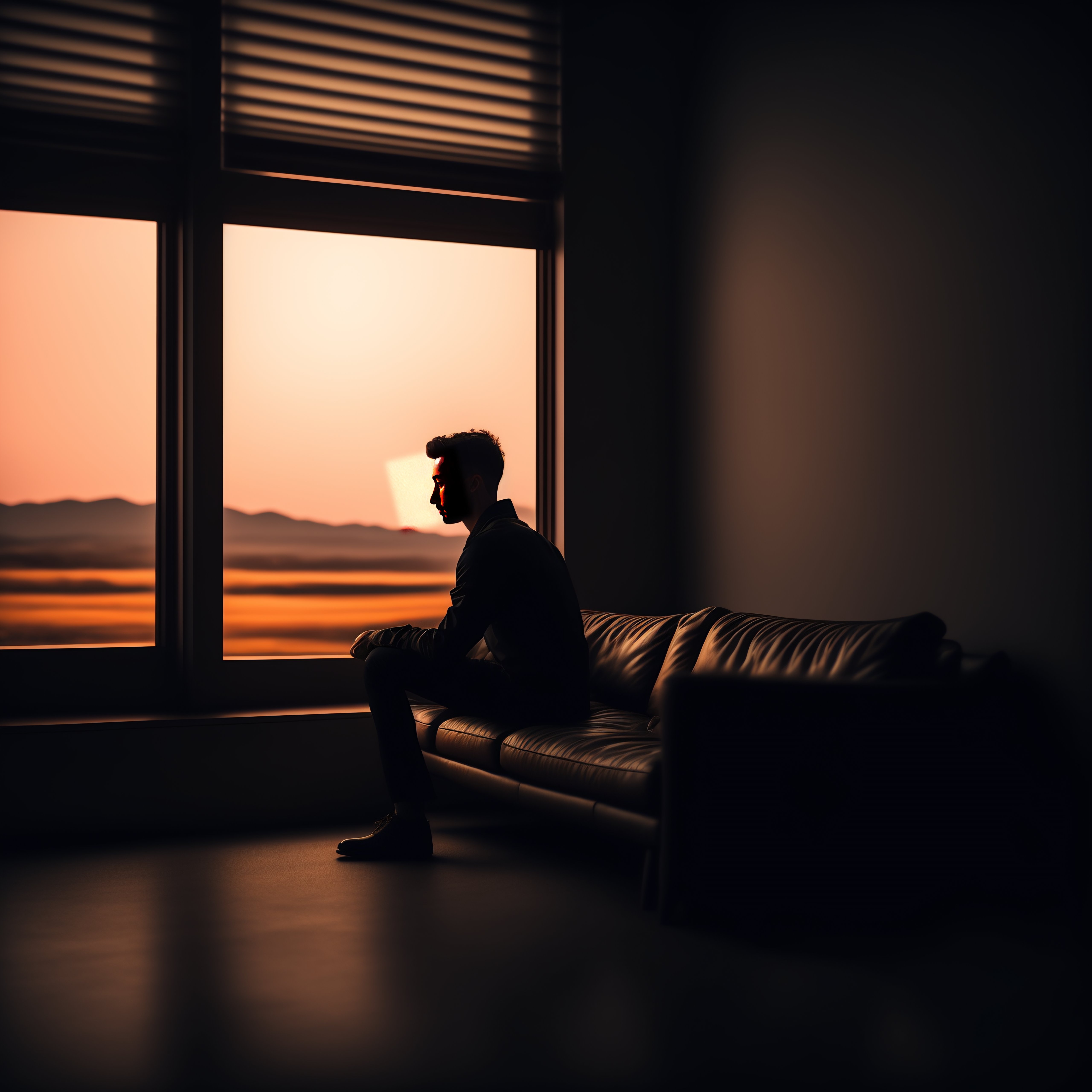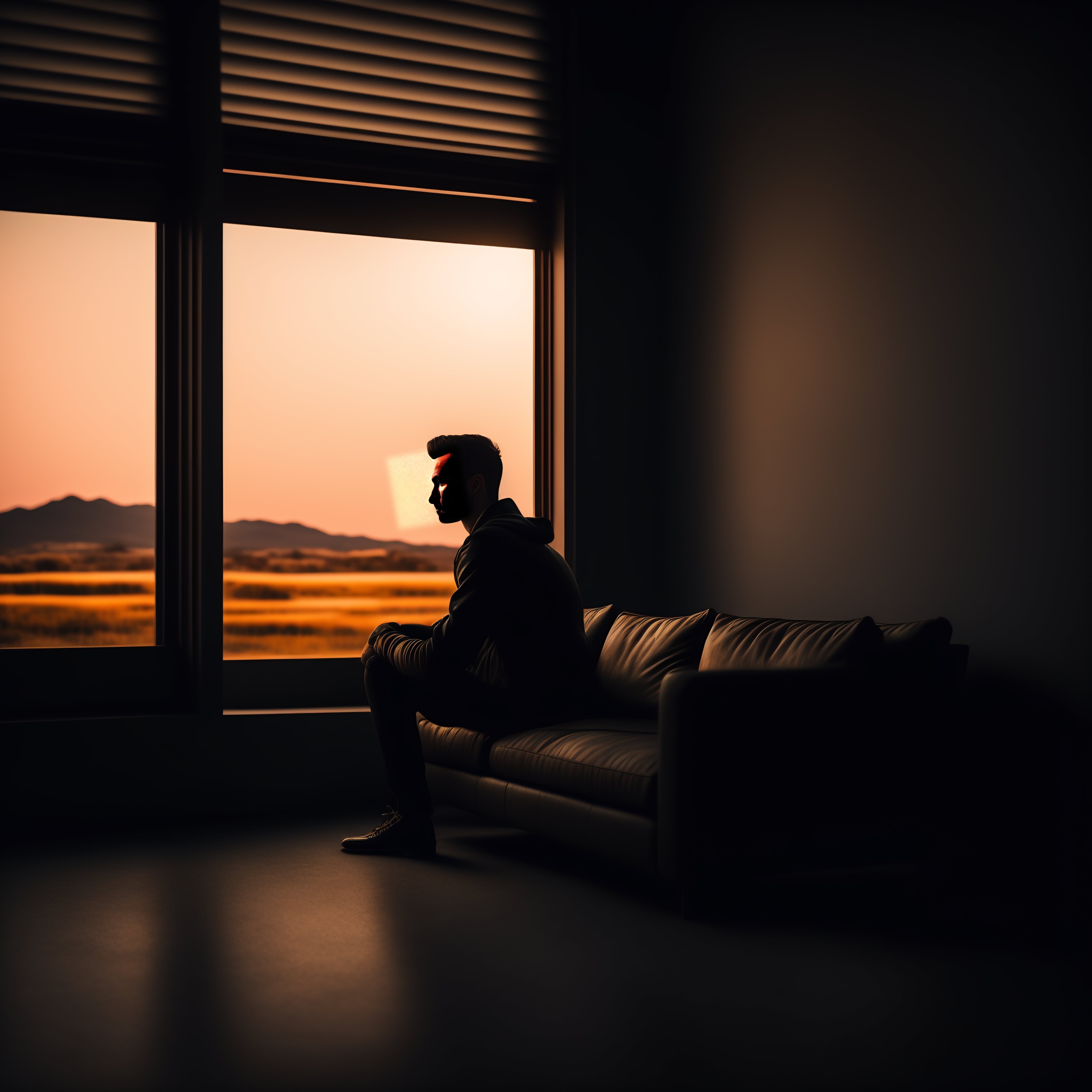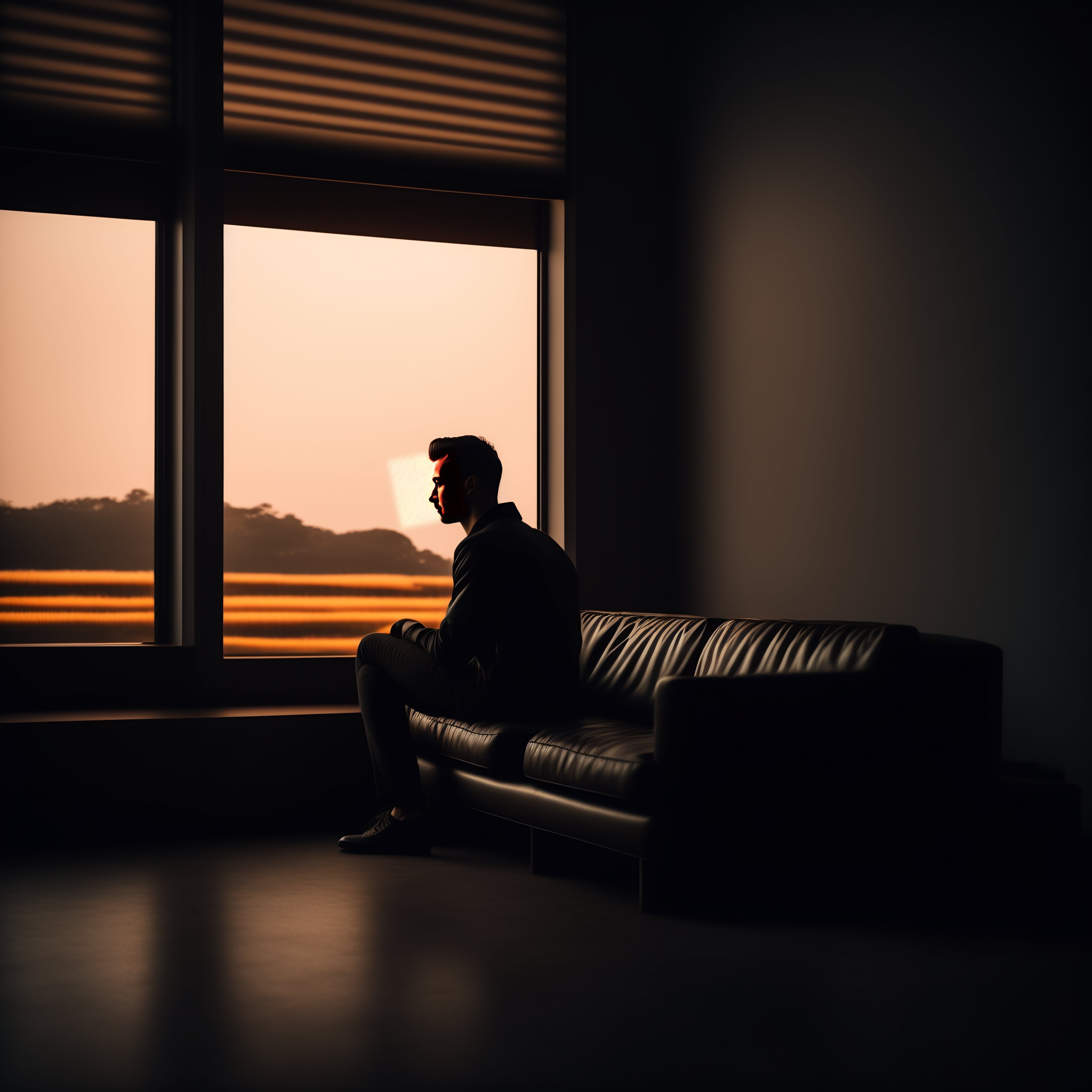 A man sitting on a couch in a dark room with pitch-black background