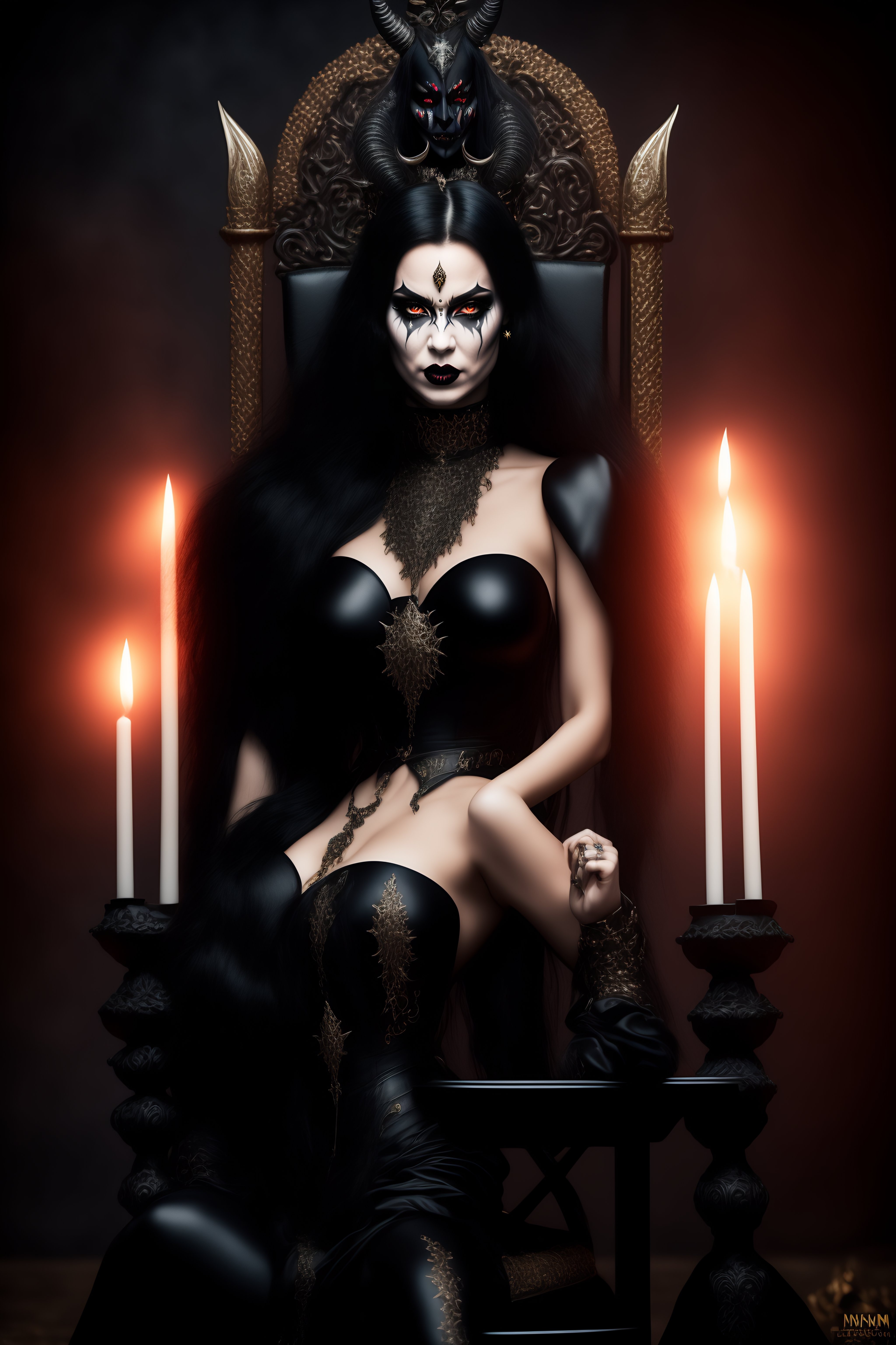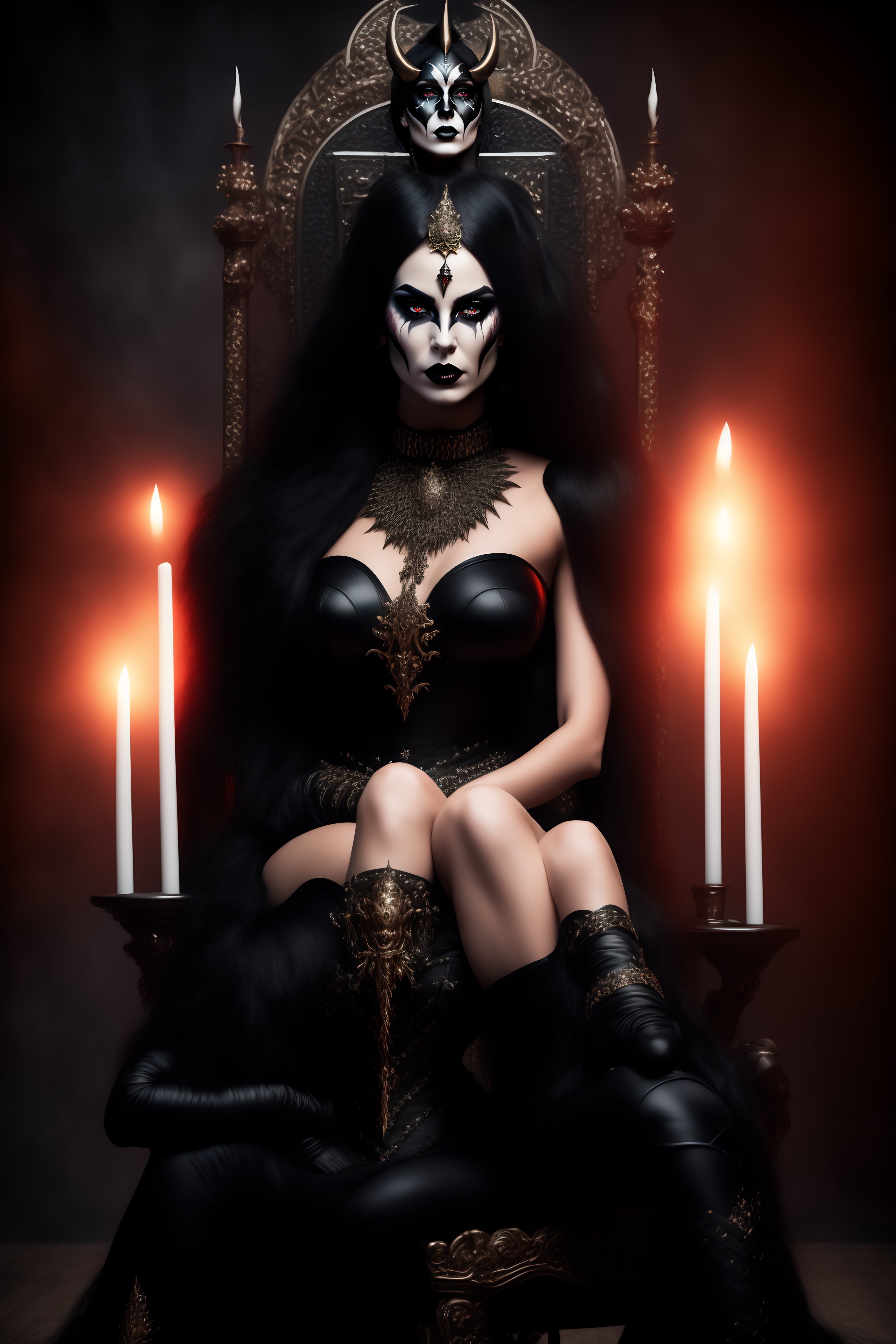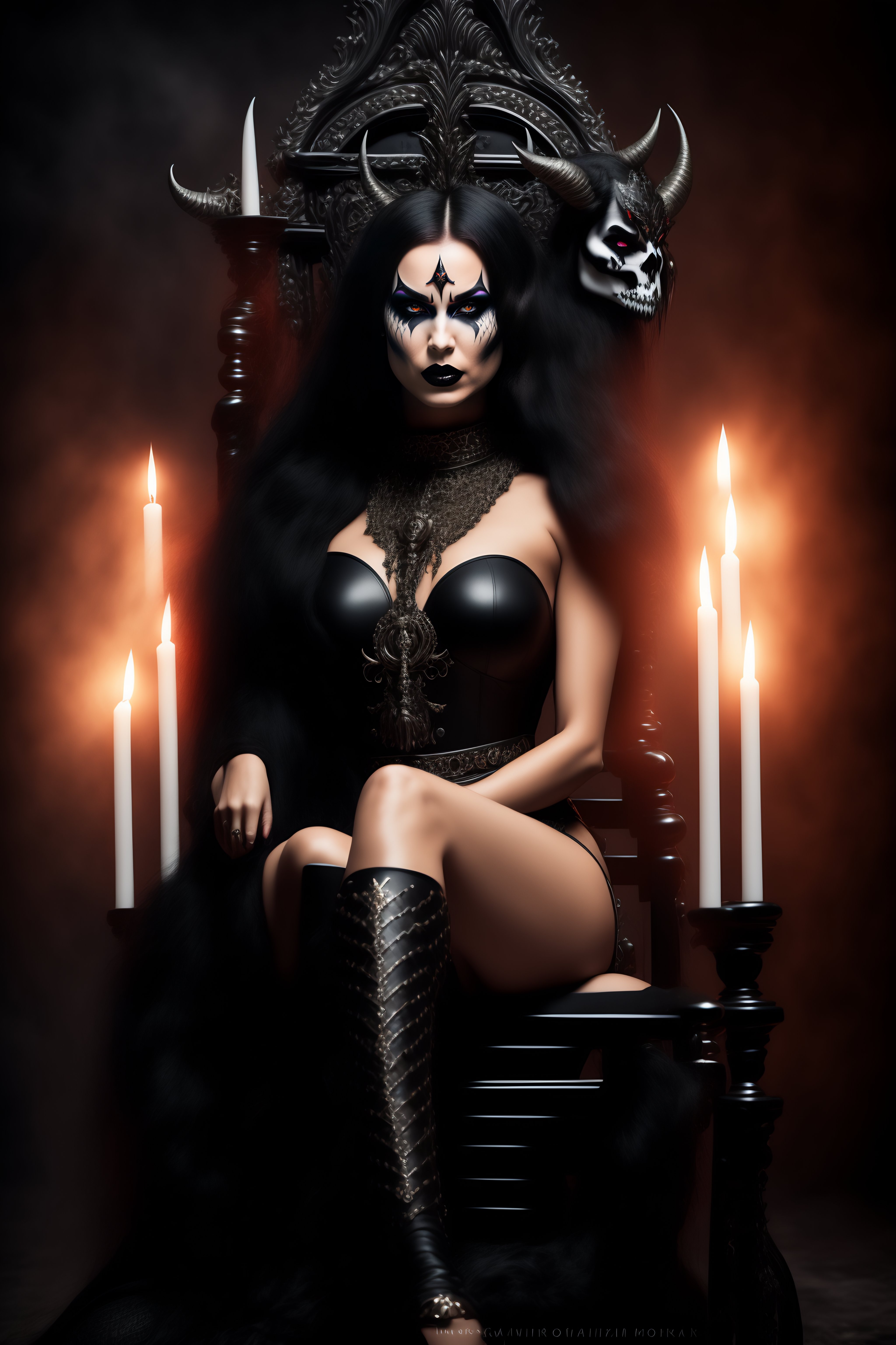 Black metal girl, devil makeup, beautiful gorgeous, realistic detailed, proportional body, nikon 70-200mm f/2.8g, sitting on the throne, surrounded by demons