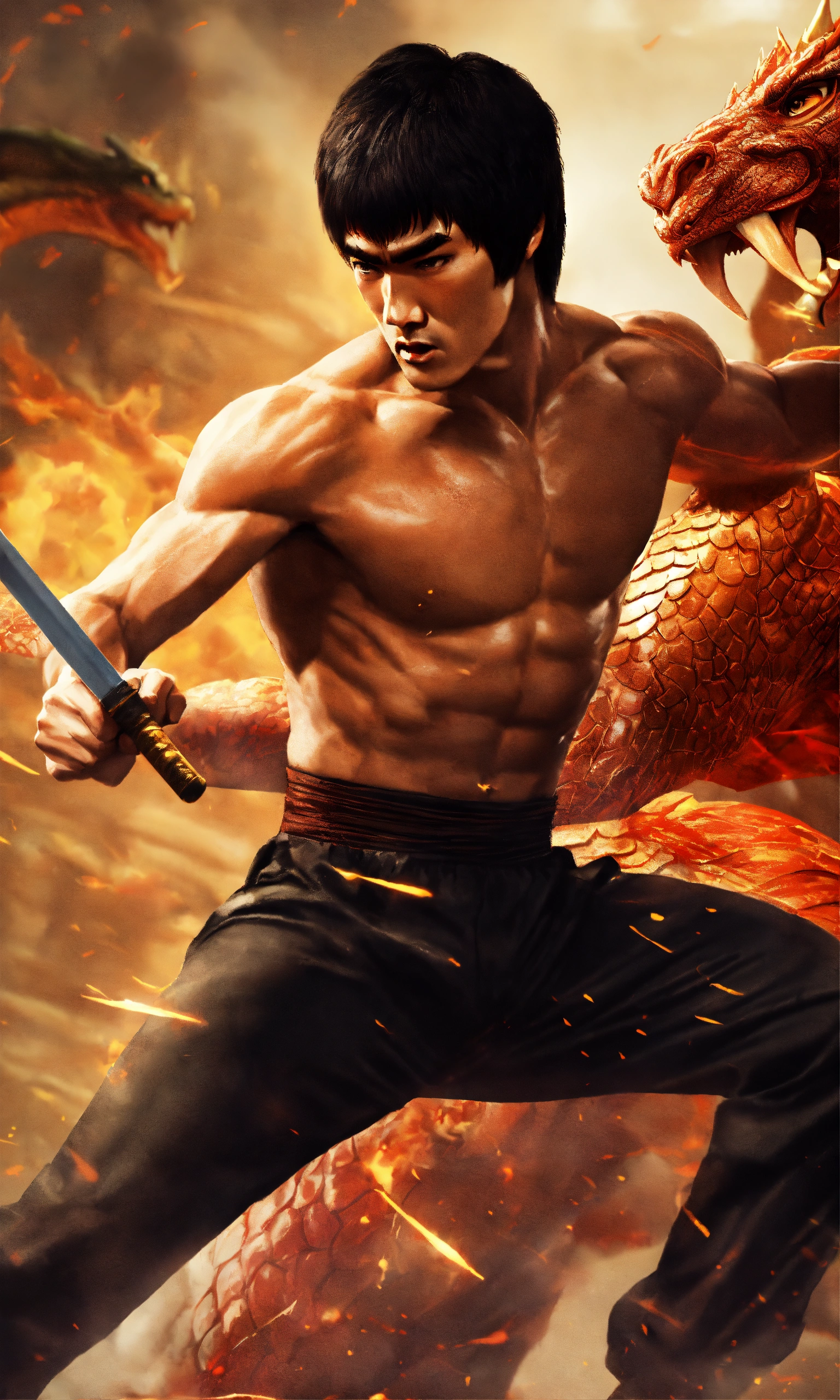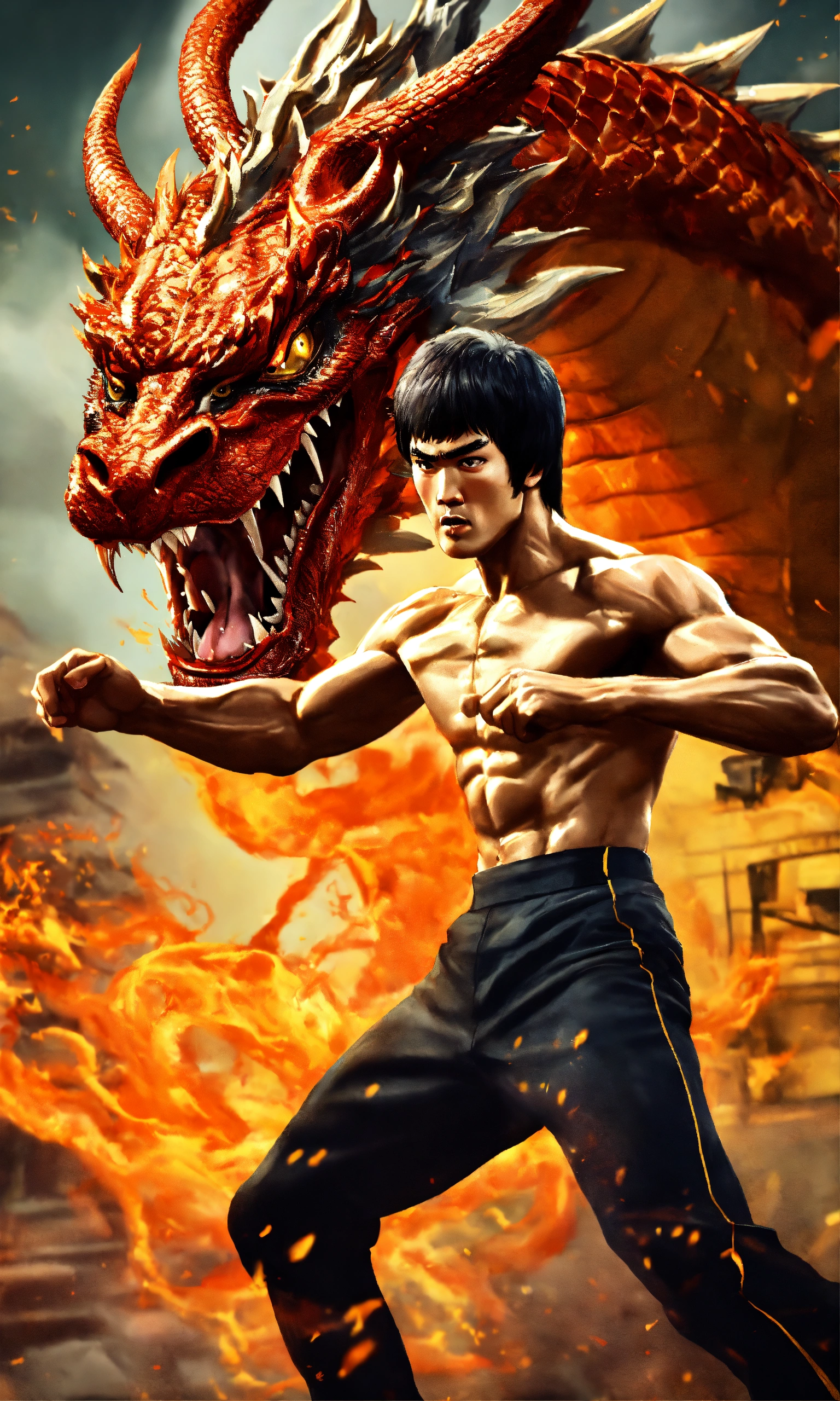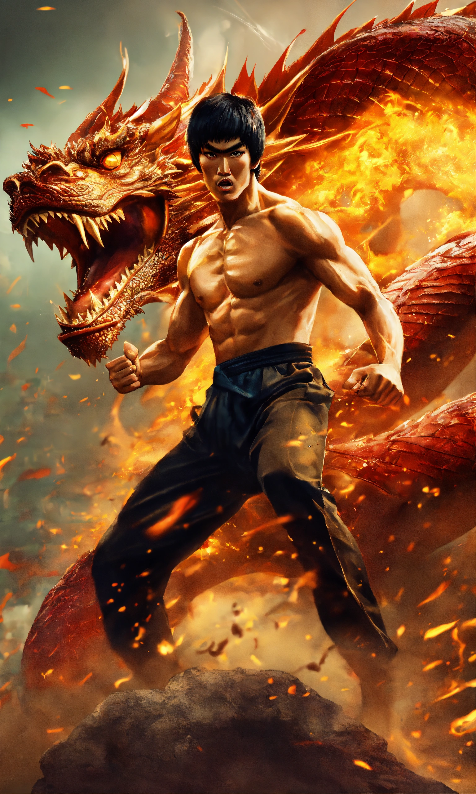 Create bruce lee fighting a dragon in an adrenaline-pumping battle