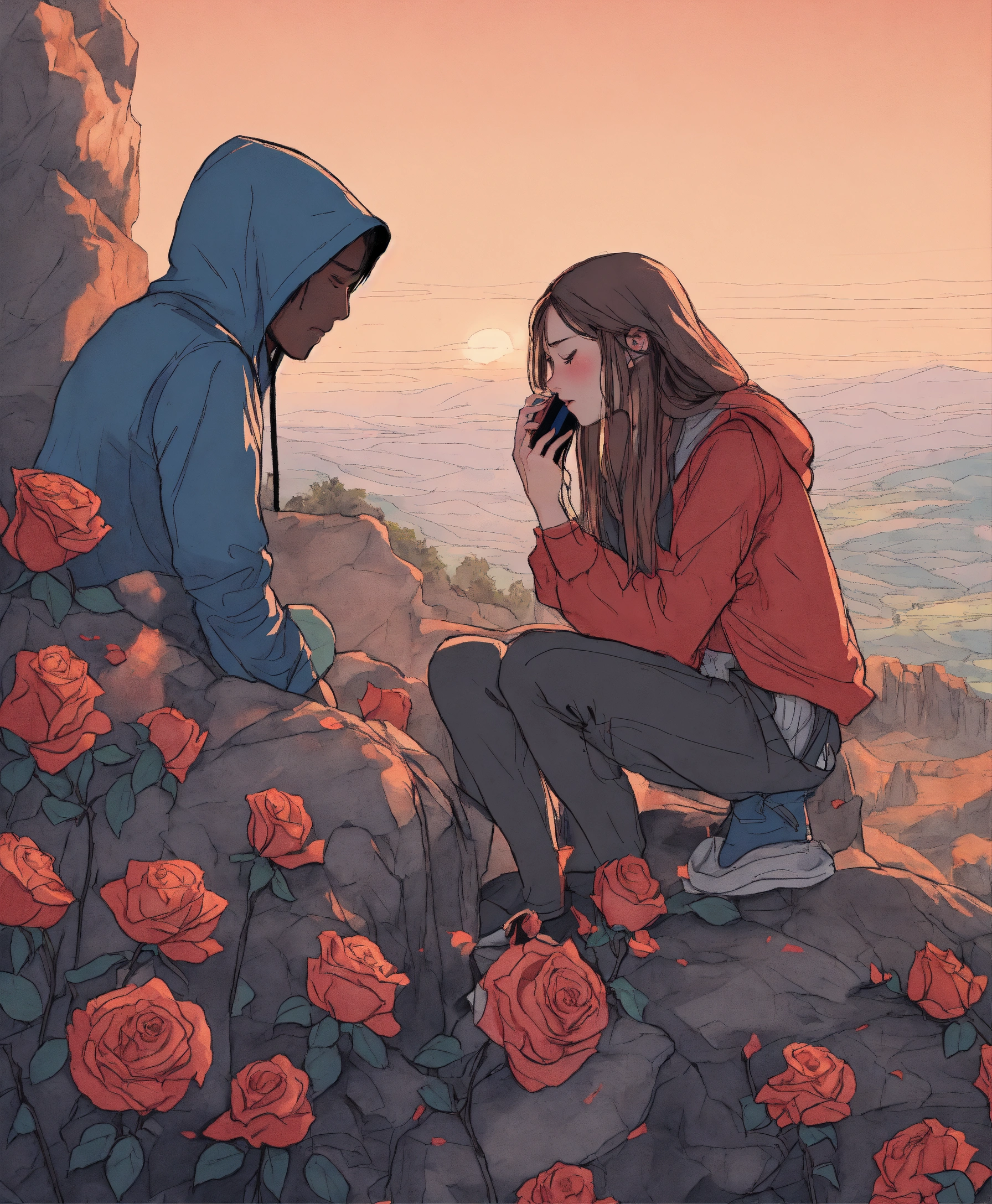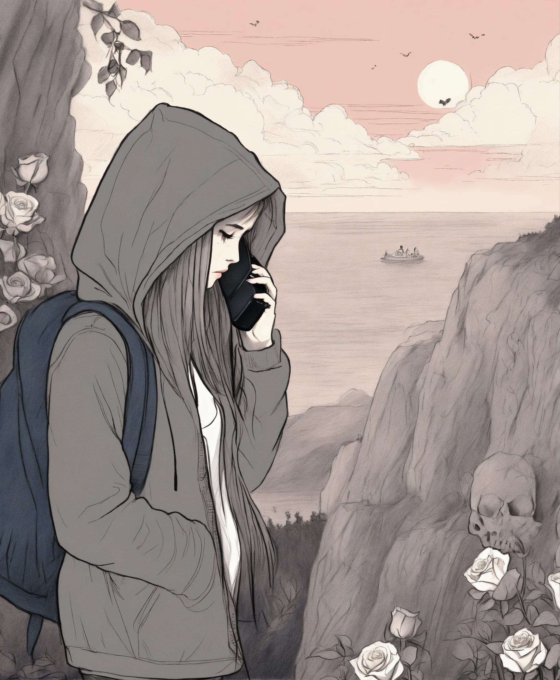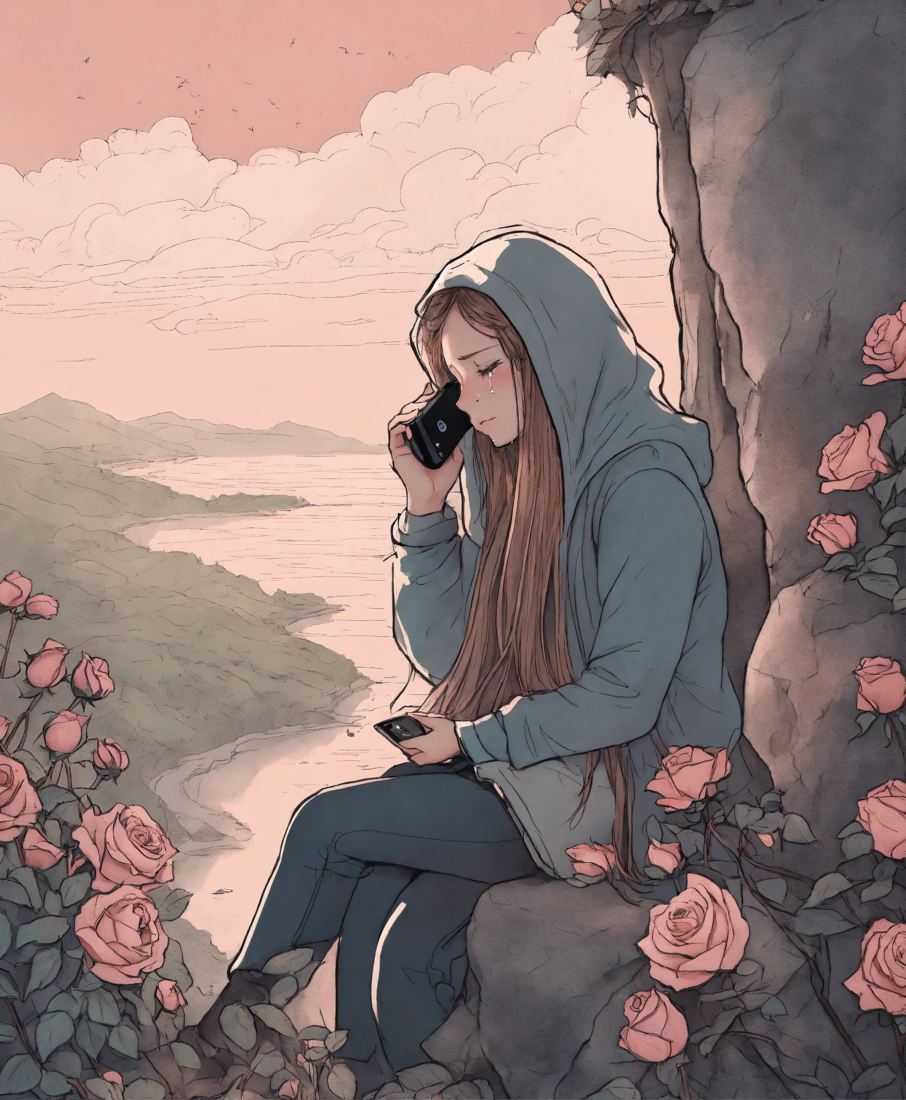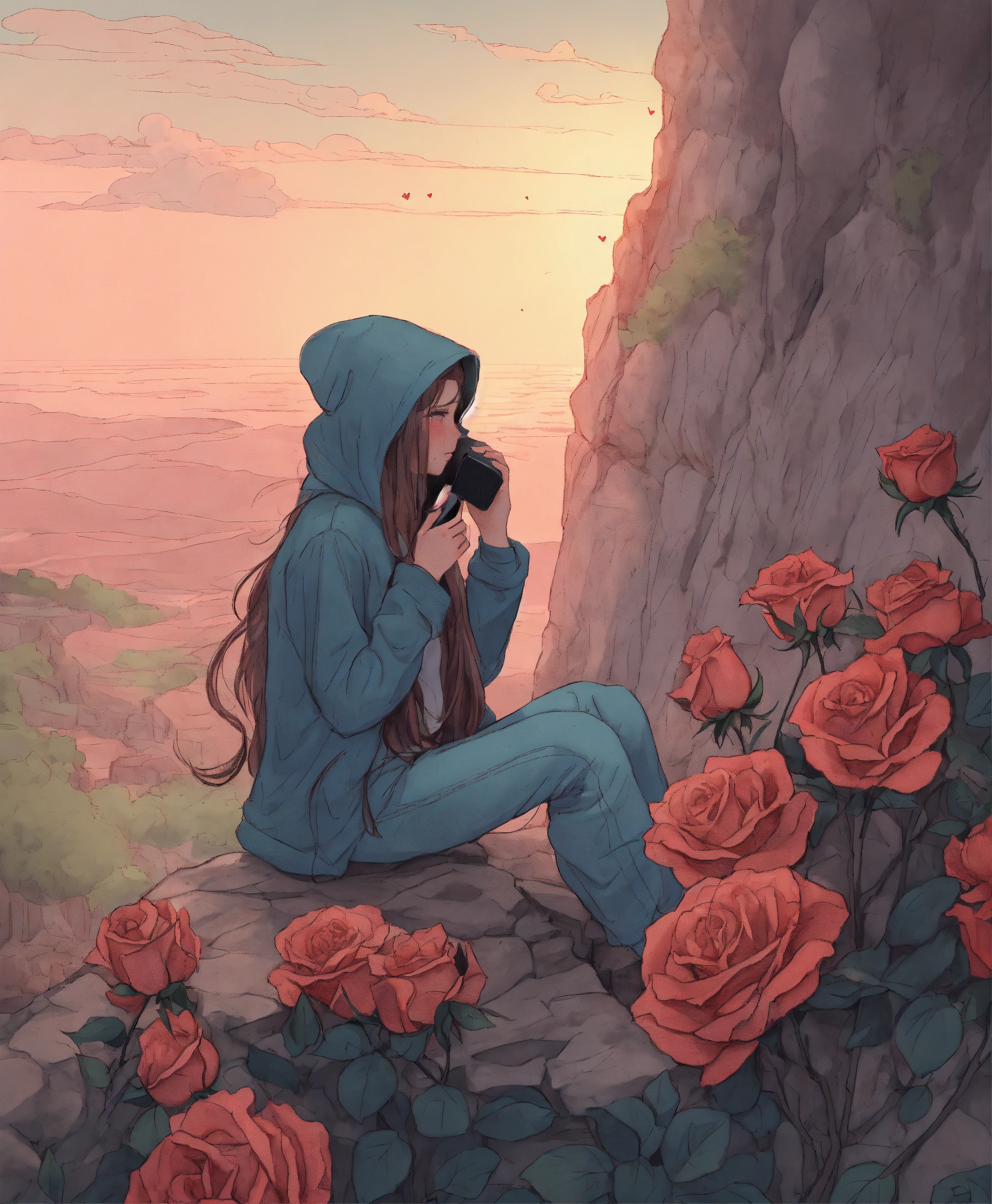 a broken heart personified calling on the phone from a cliff, while crying, many roses in pencil drawing style
