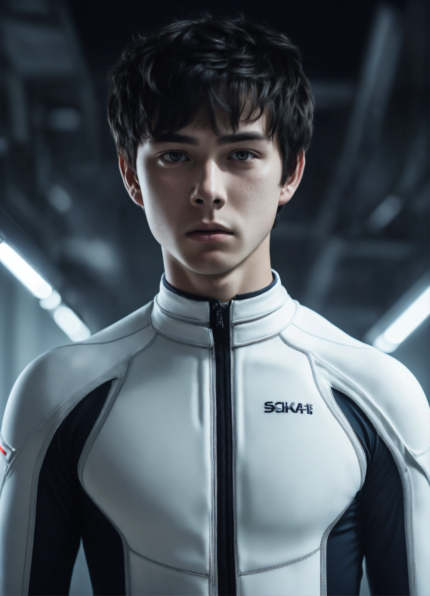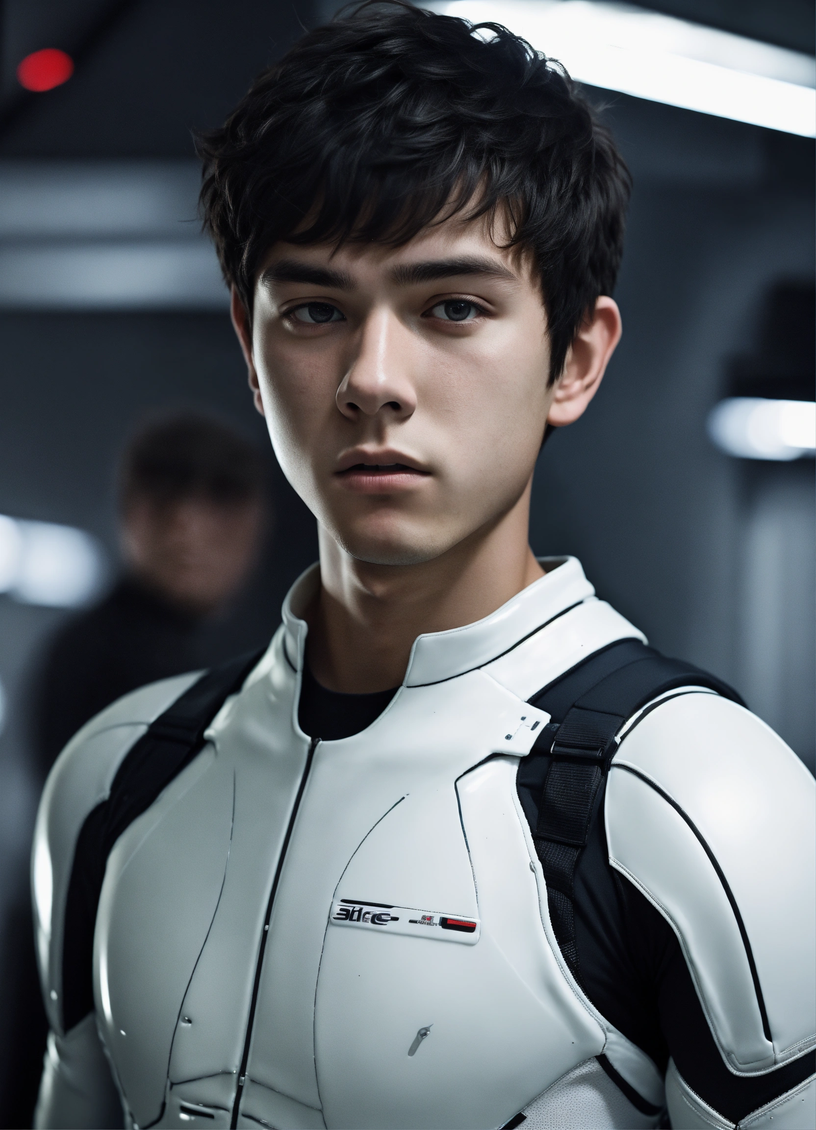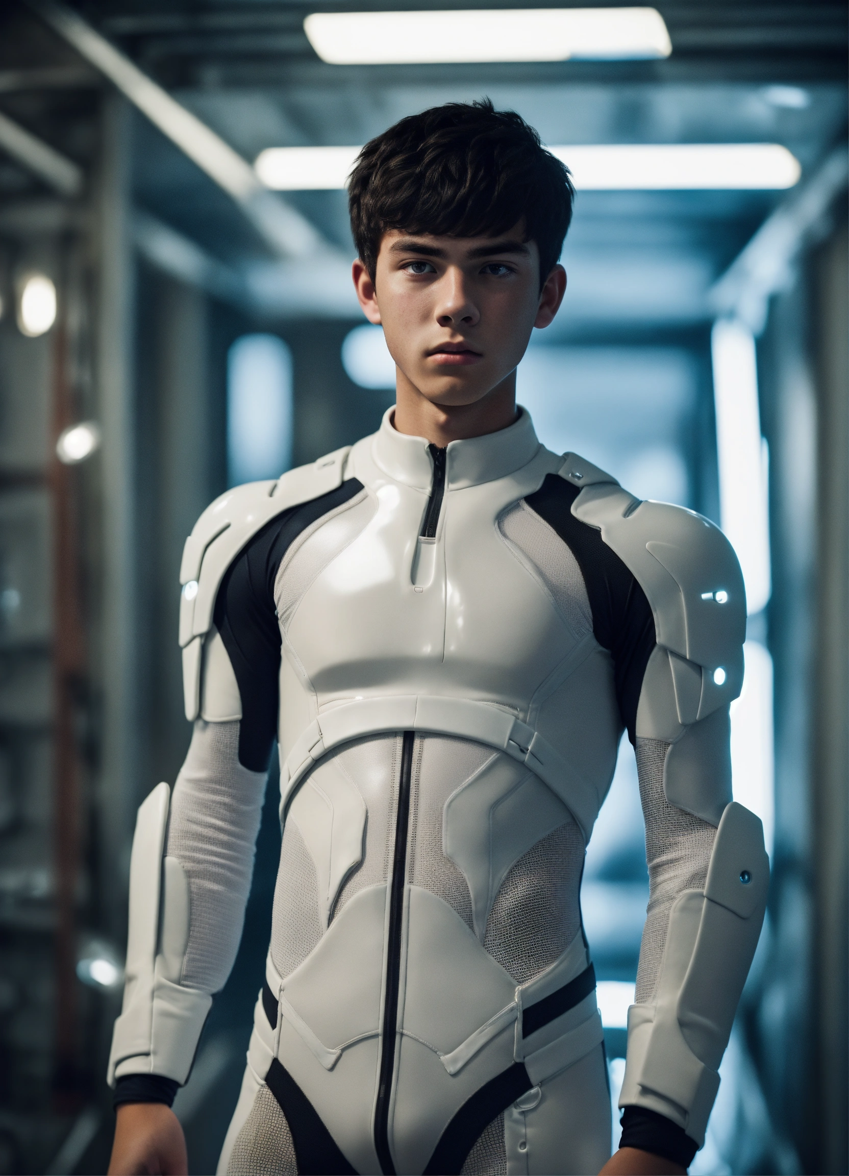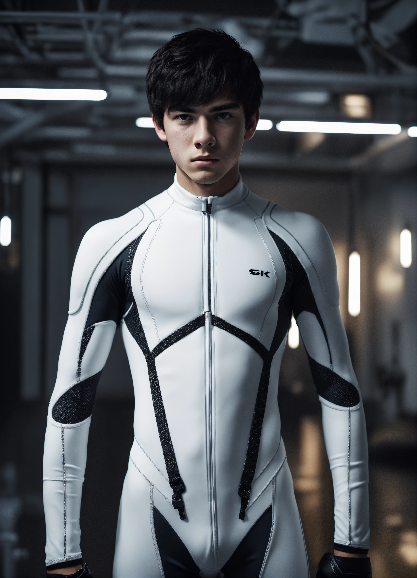 A realistic photograph of a 16-year-old boy, with a serious expression, black messy short hair, dark black eyes, strong body, wearing a white sci-fi tight suit, with a little room with white walls, white illumination, hyperdetailed, hyperrealistic, 8 k