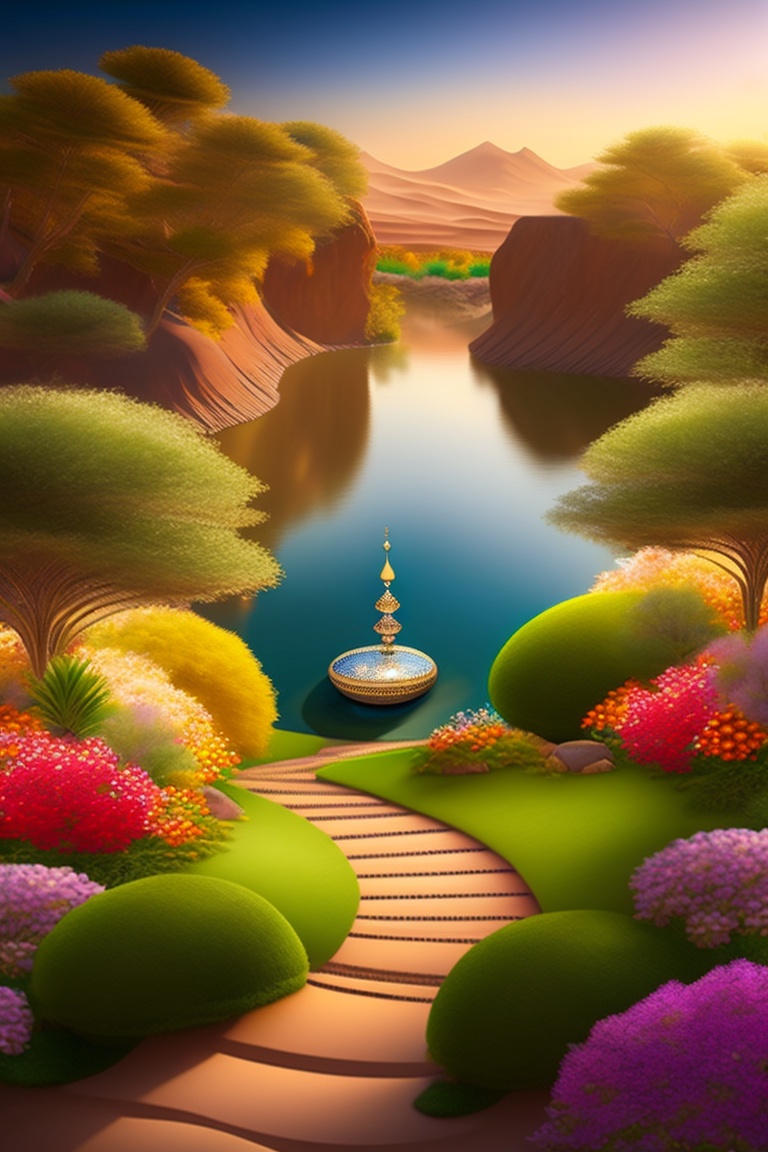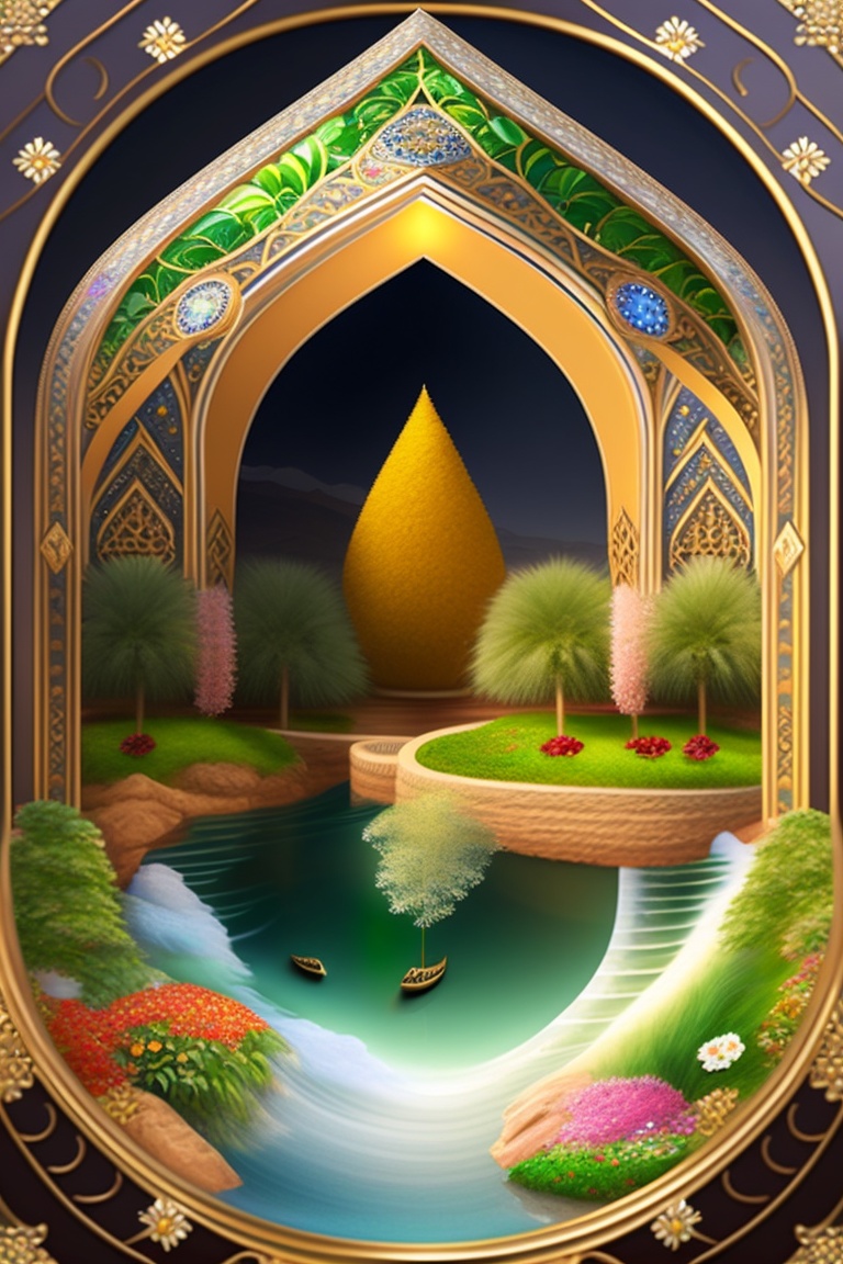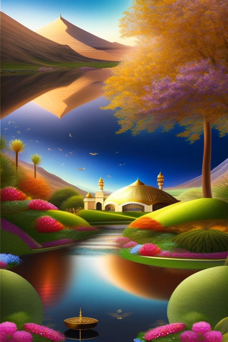The quran describes jannah as having beautiful gardens with rivers flowing underneath them. the gardens are filled with fruits and flowers, and the trees provide shade and shelter. the ai image can depict lush greenery with a variety of flowers and trees, along with rivers and streams. the dwellings in jannah as being made of gold, silver, and precious stones. the people in jannah as being young and beautiful, with no flaws or imperfections. the ai image can depict people with perfect features, radiant skin, and glowing eyes.
