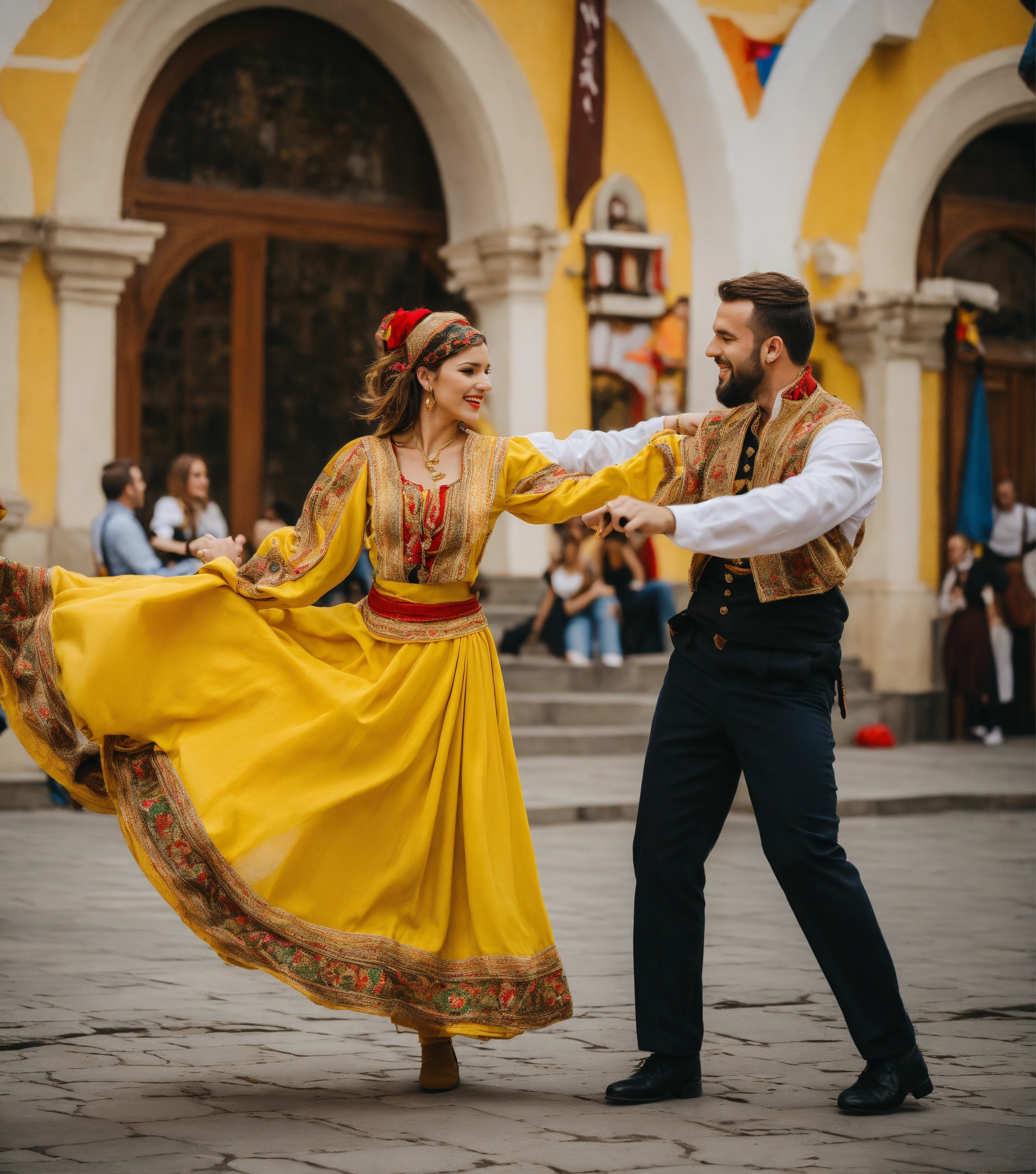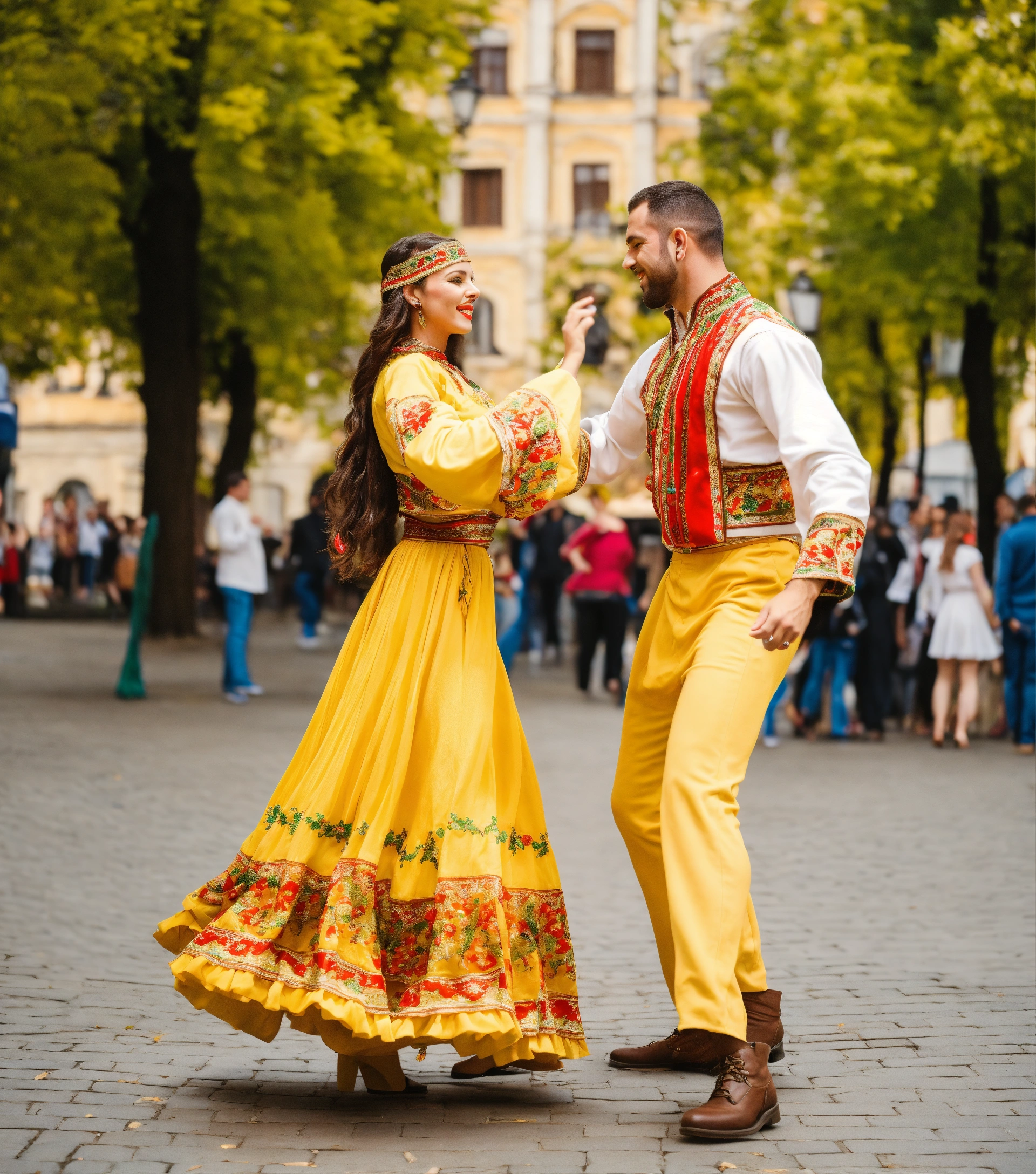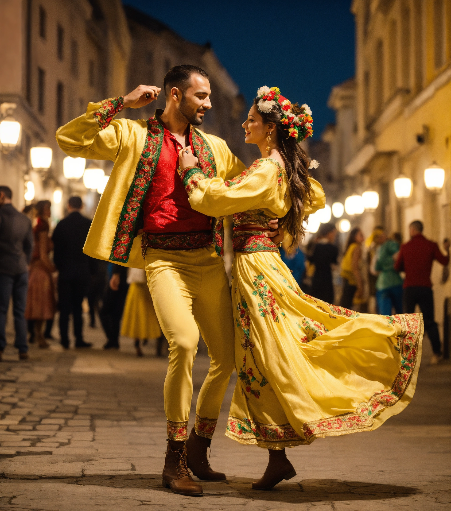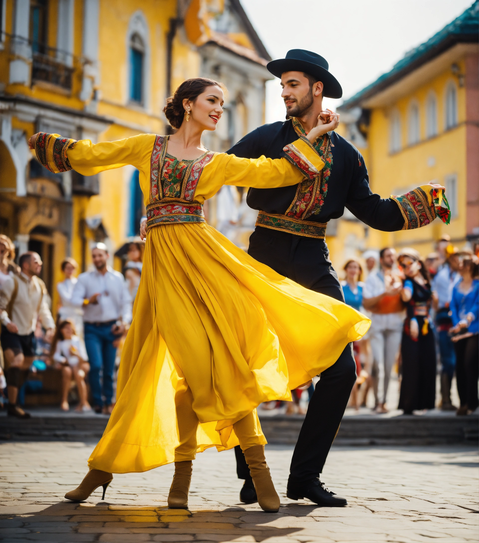Man and woman dancing, nice looking fashionable people wearing bulgarian attire in the city wearing light yellow attires
