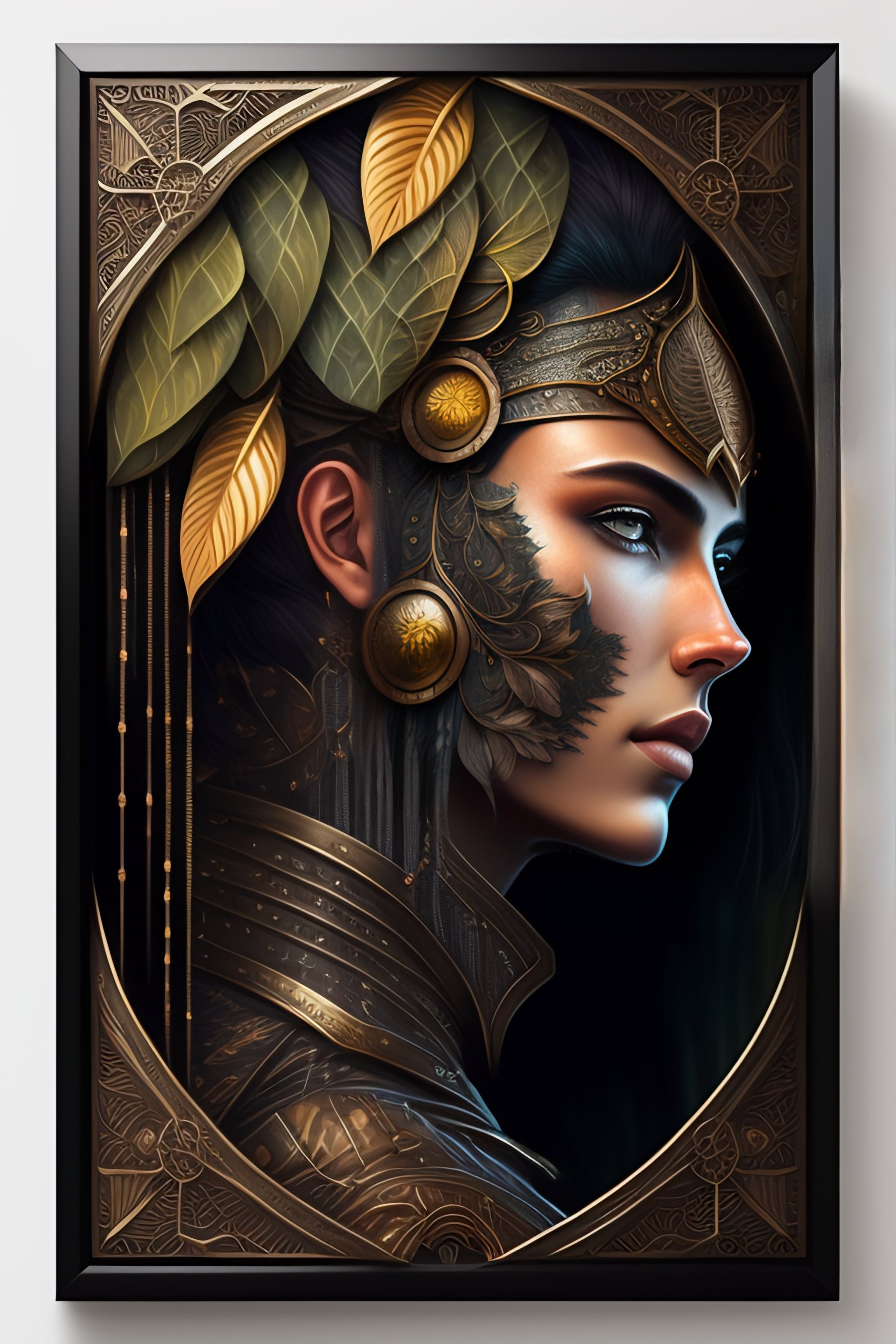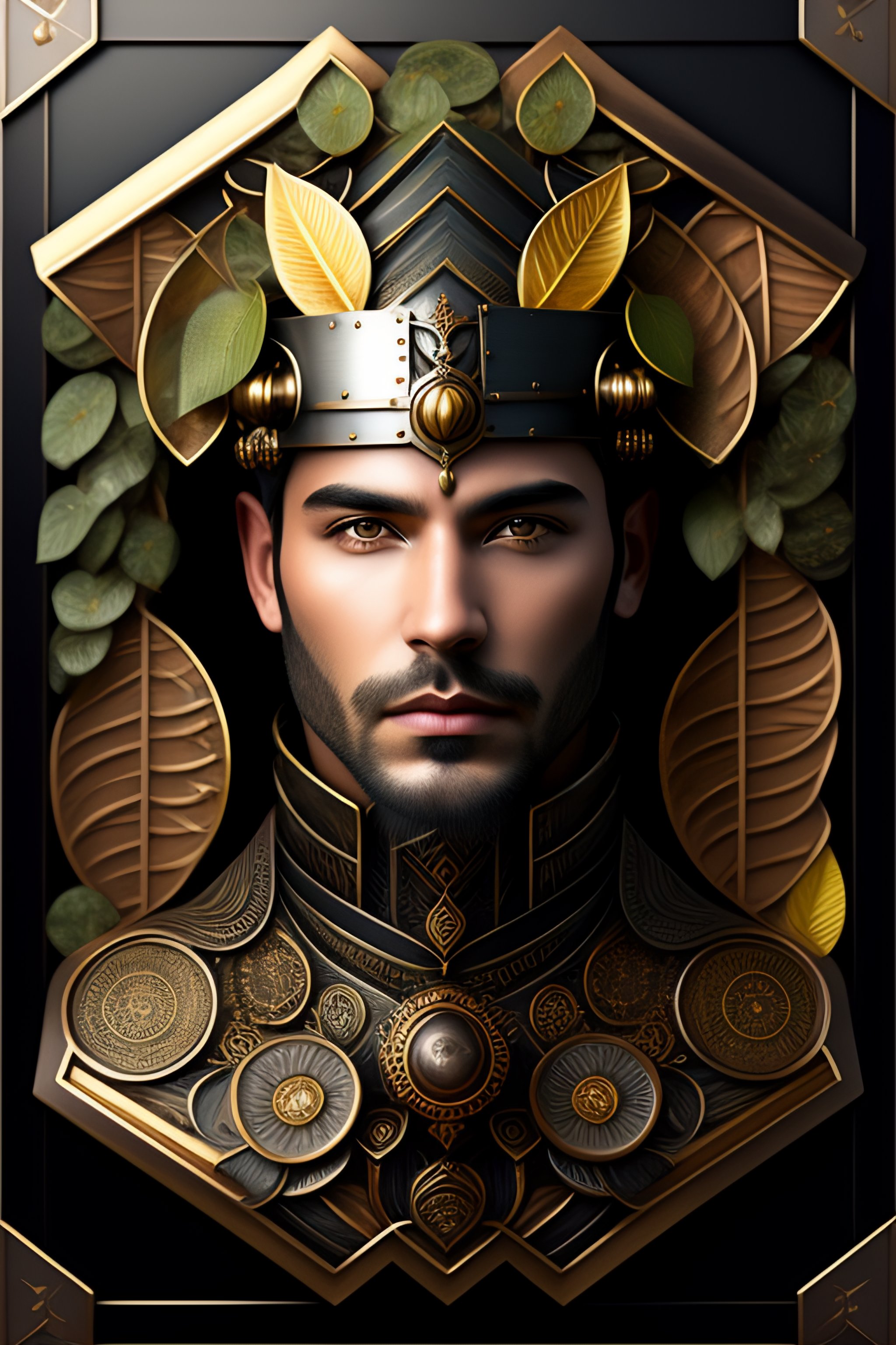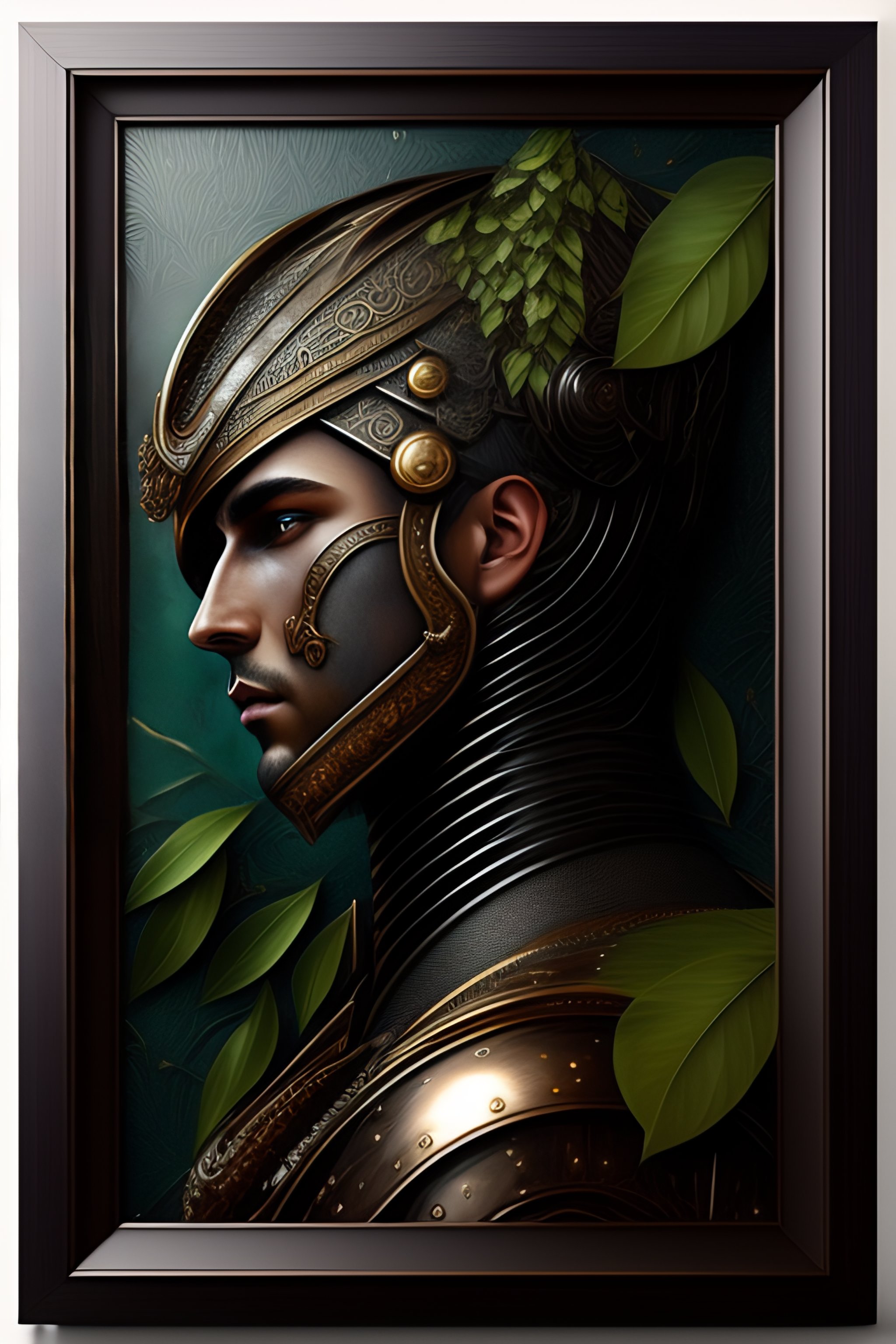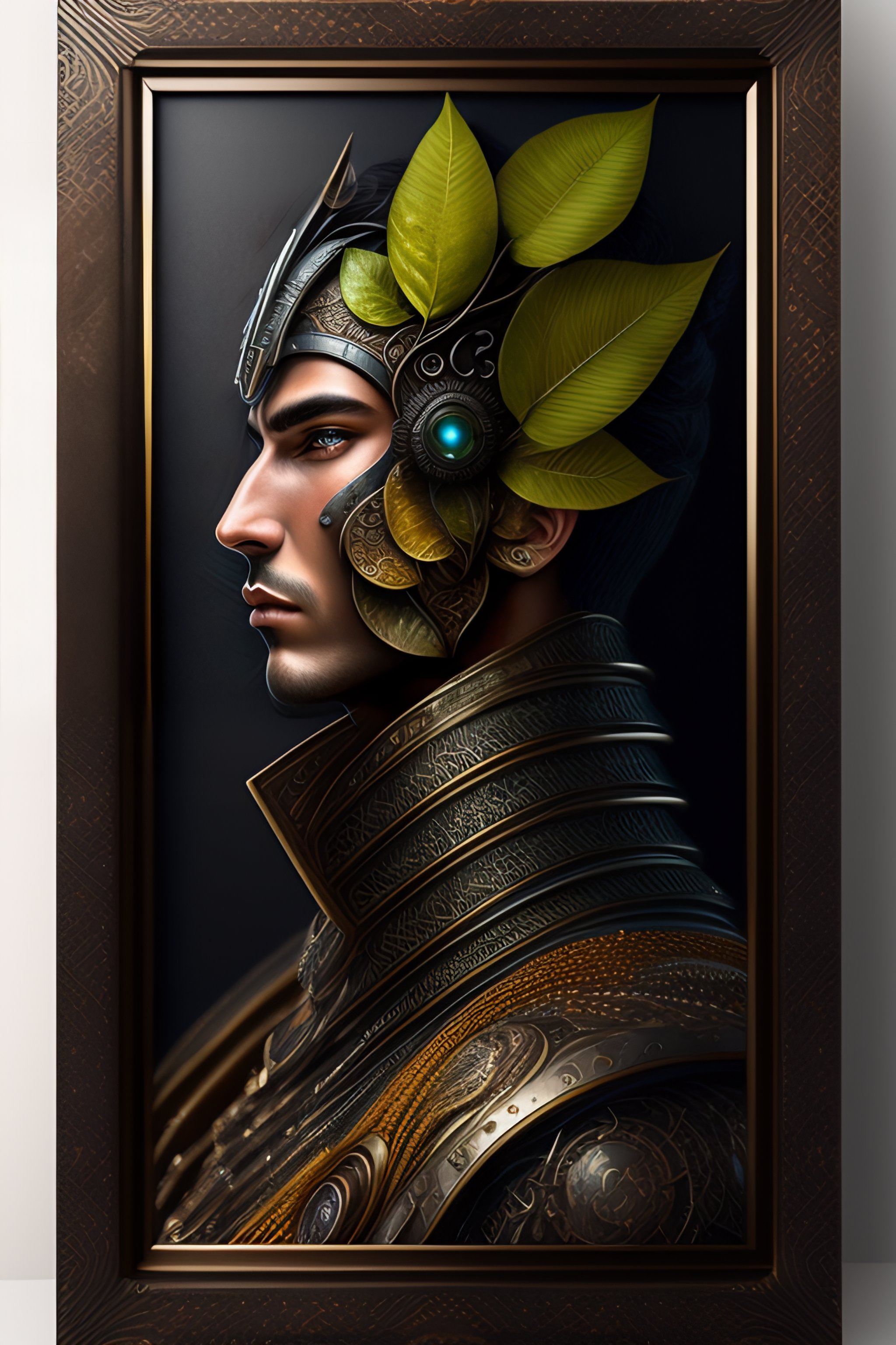 Whimsical detailed fantasy a man of metal portrait a robot cyberpunk show full face full portrait portrait size 800 x 800 pixels in a wooden frame the picture shows the entire wooden frame olive leaves muted colors, intricate extremely detailed hyperdetailed diego gisbert llorens fantasy