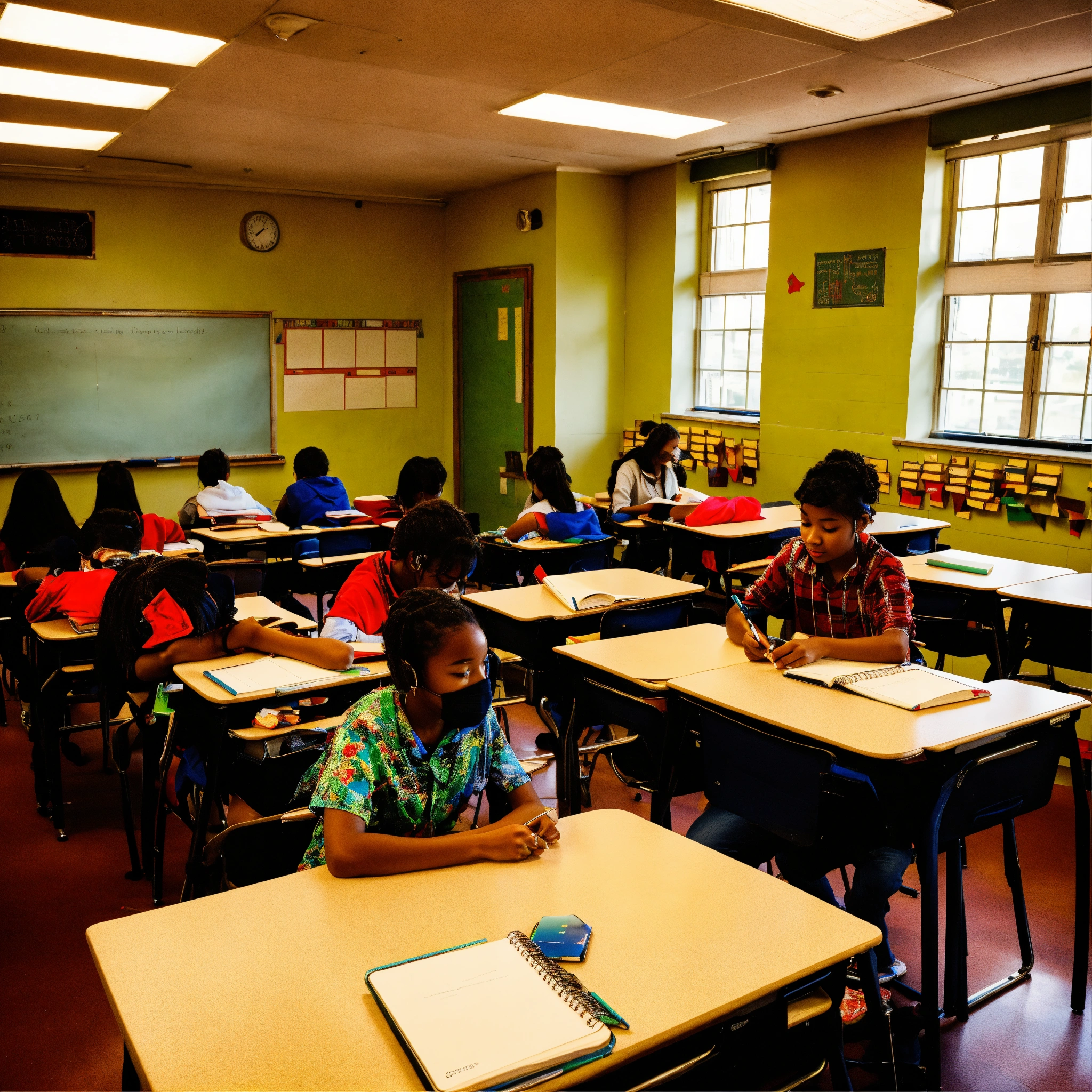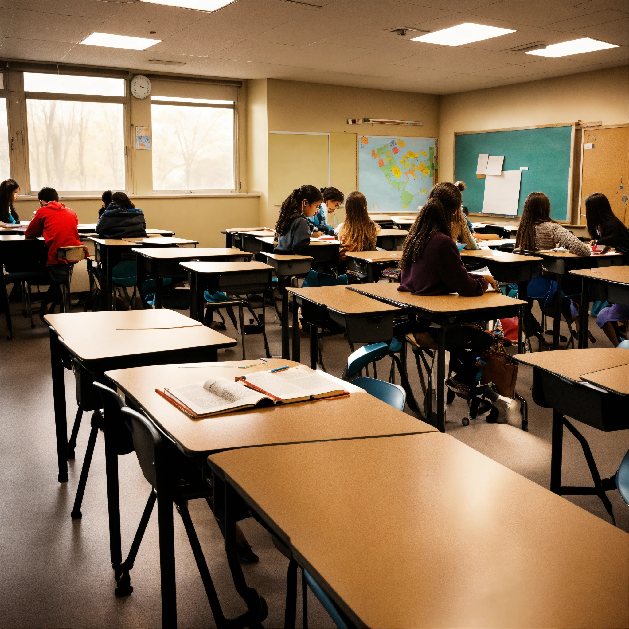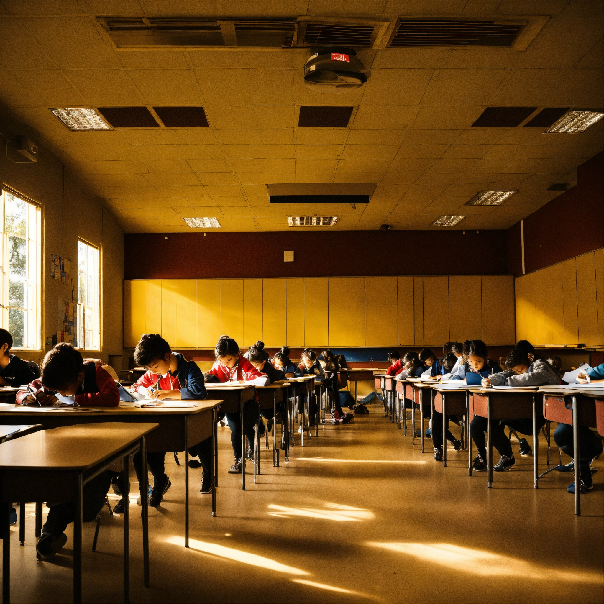 A photo of a classroom with students studying at desks, the students are engaged in their studies and the classroom is quiet and focused