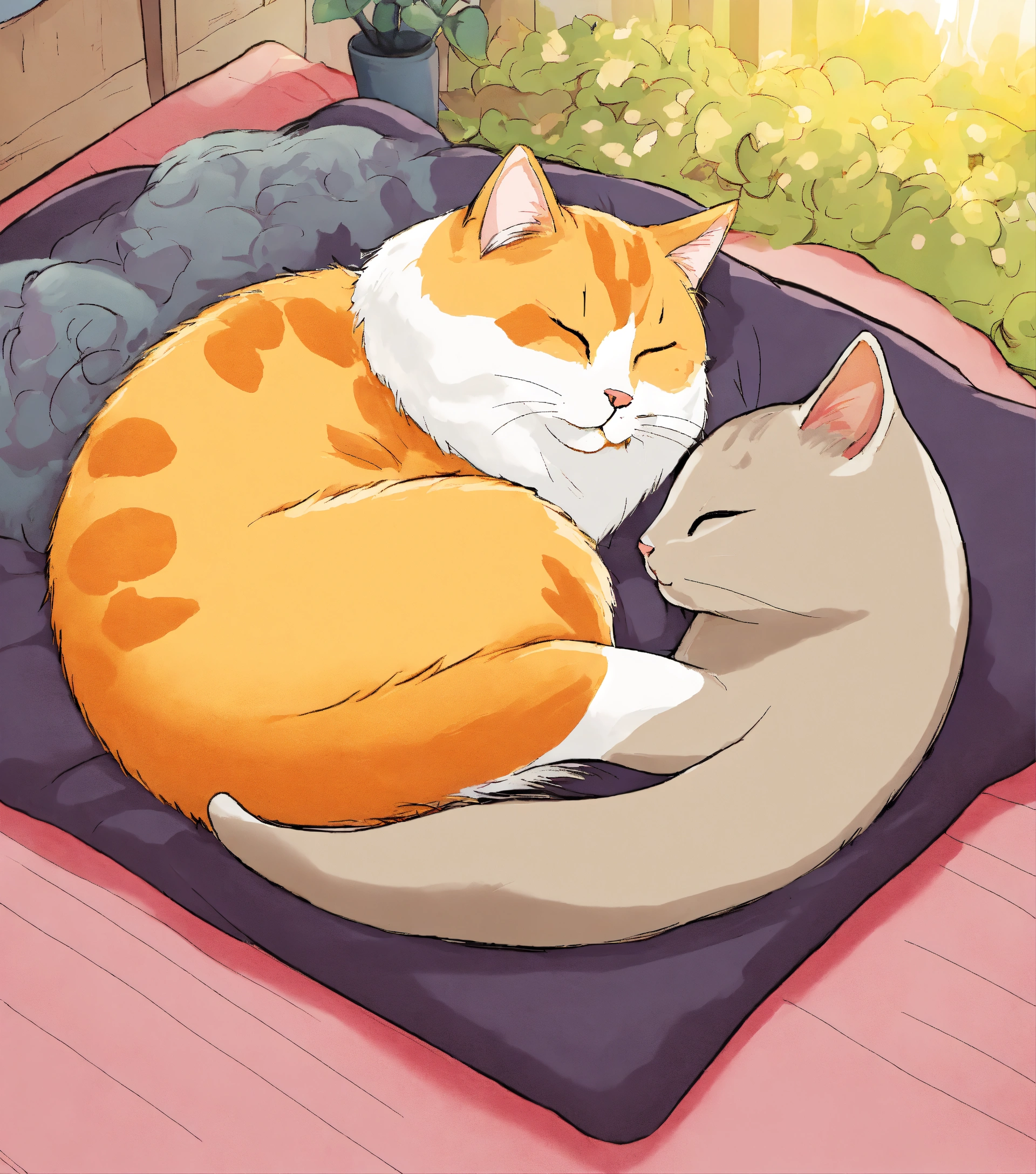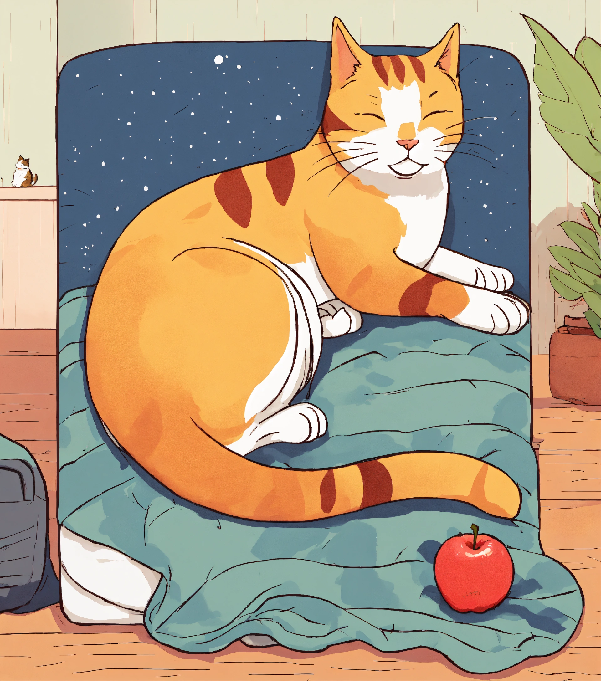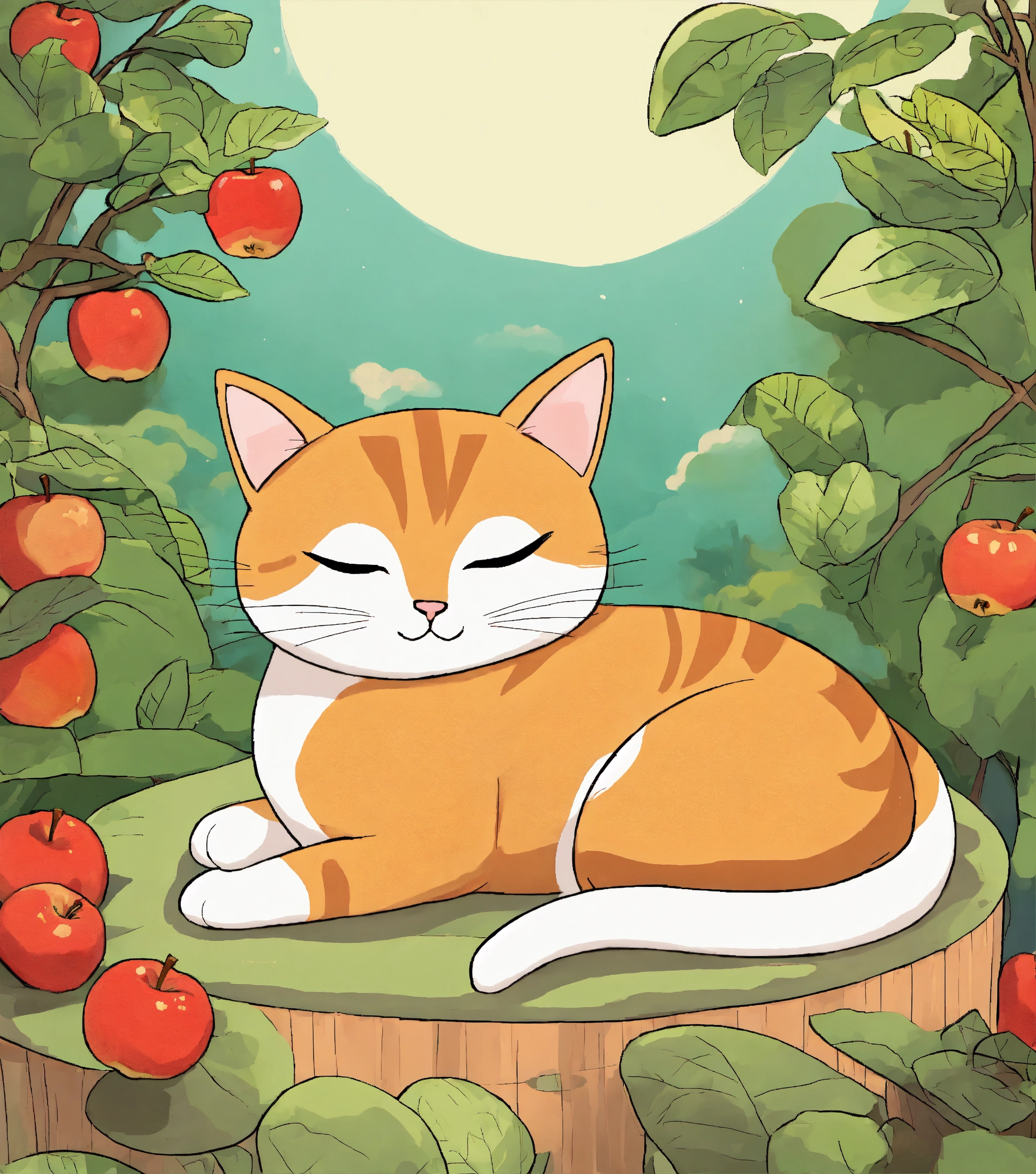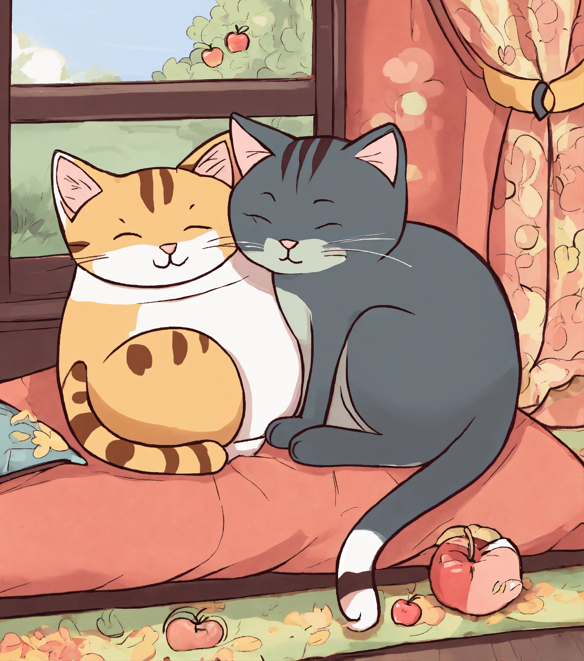 Cartoon of apple and tama cat sleep together