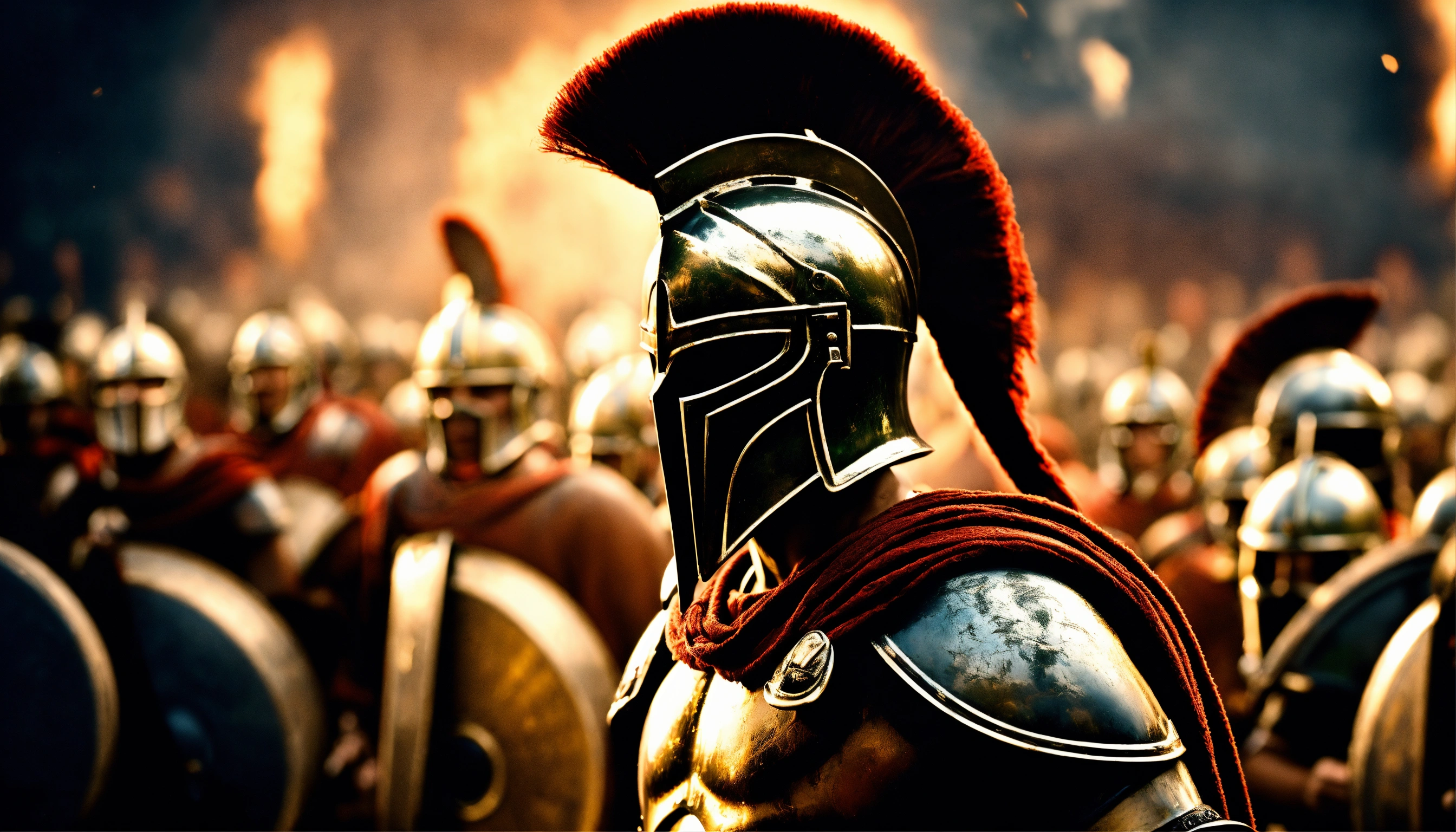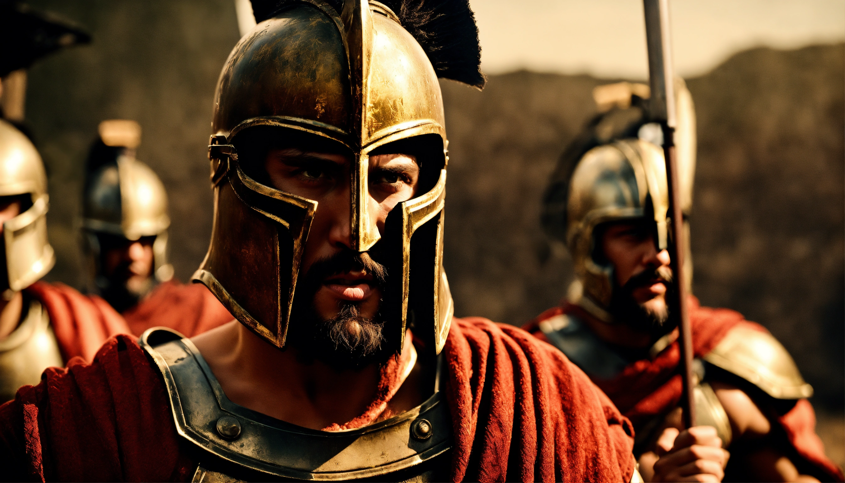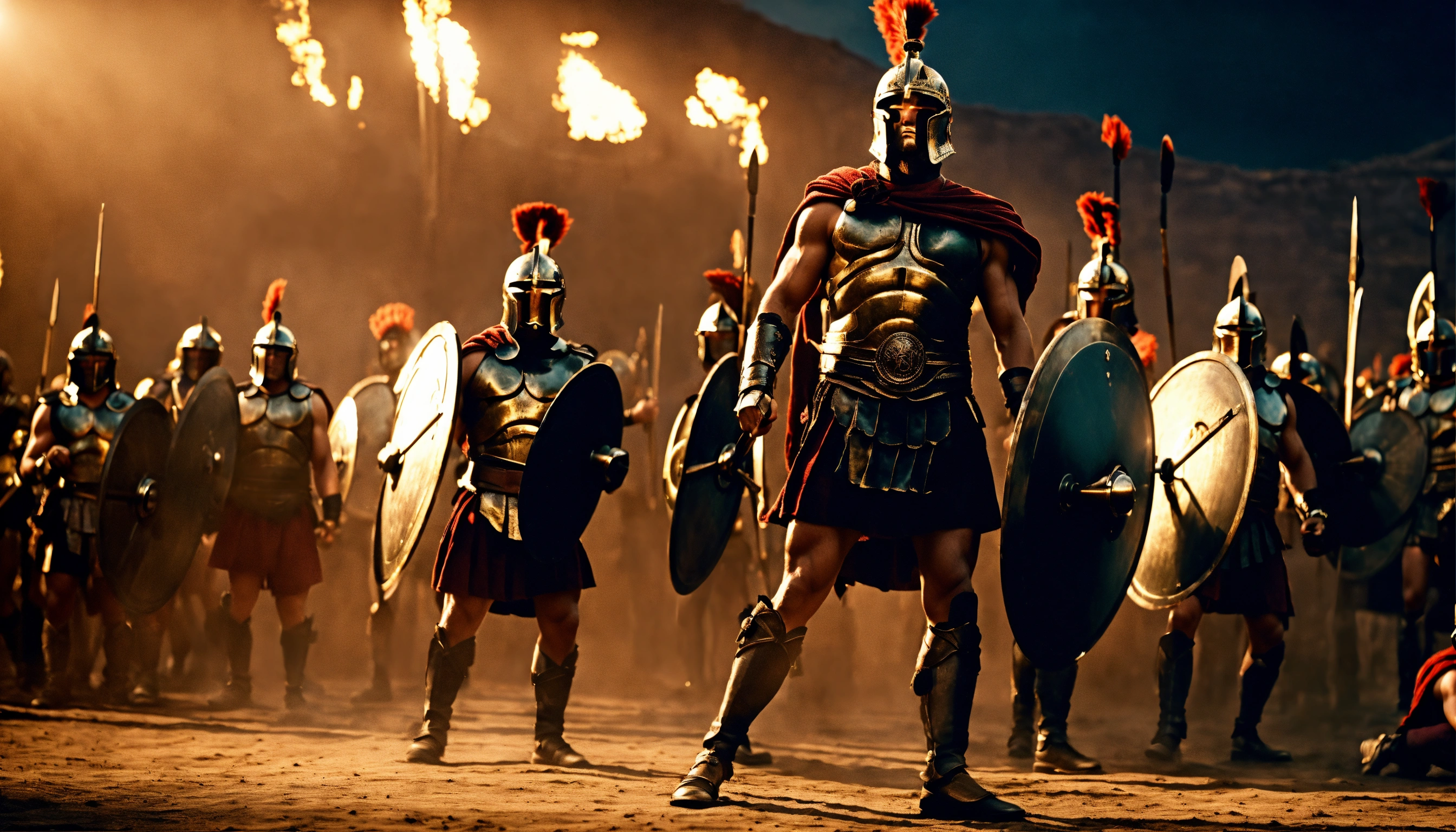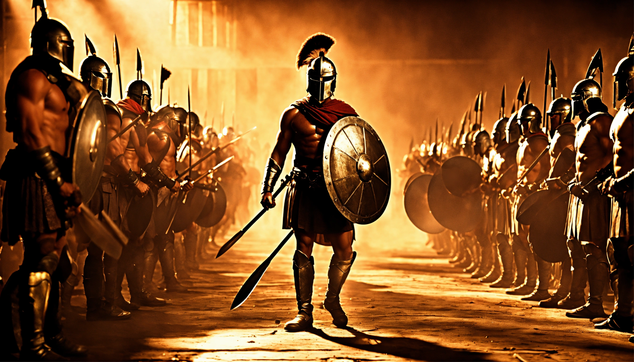 Produce me an image of spartans readies to fight, movie image, filtered through spotlight. ensure high resolution, 8k image, realistic.
