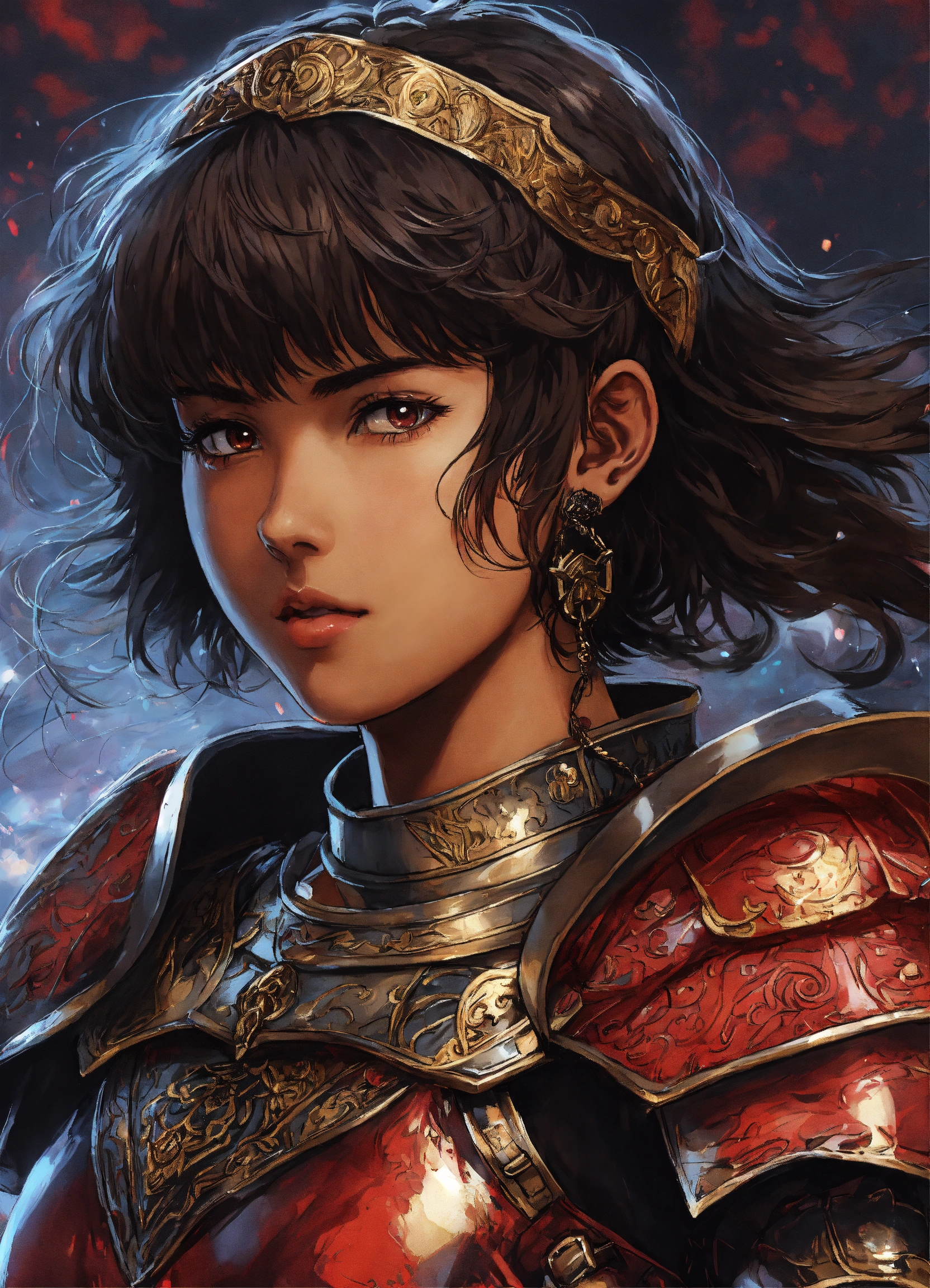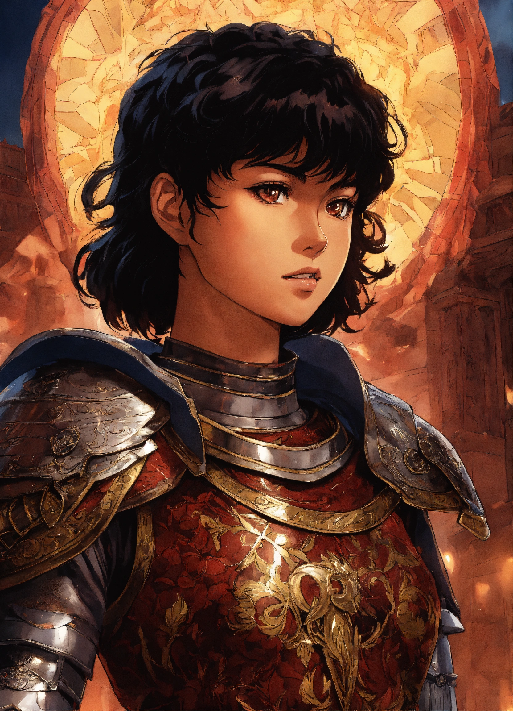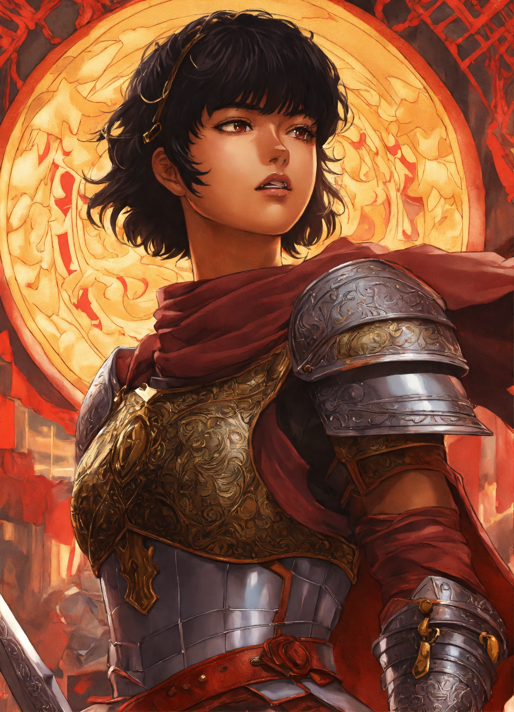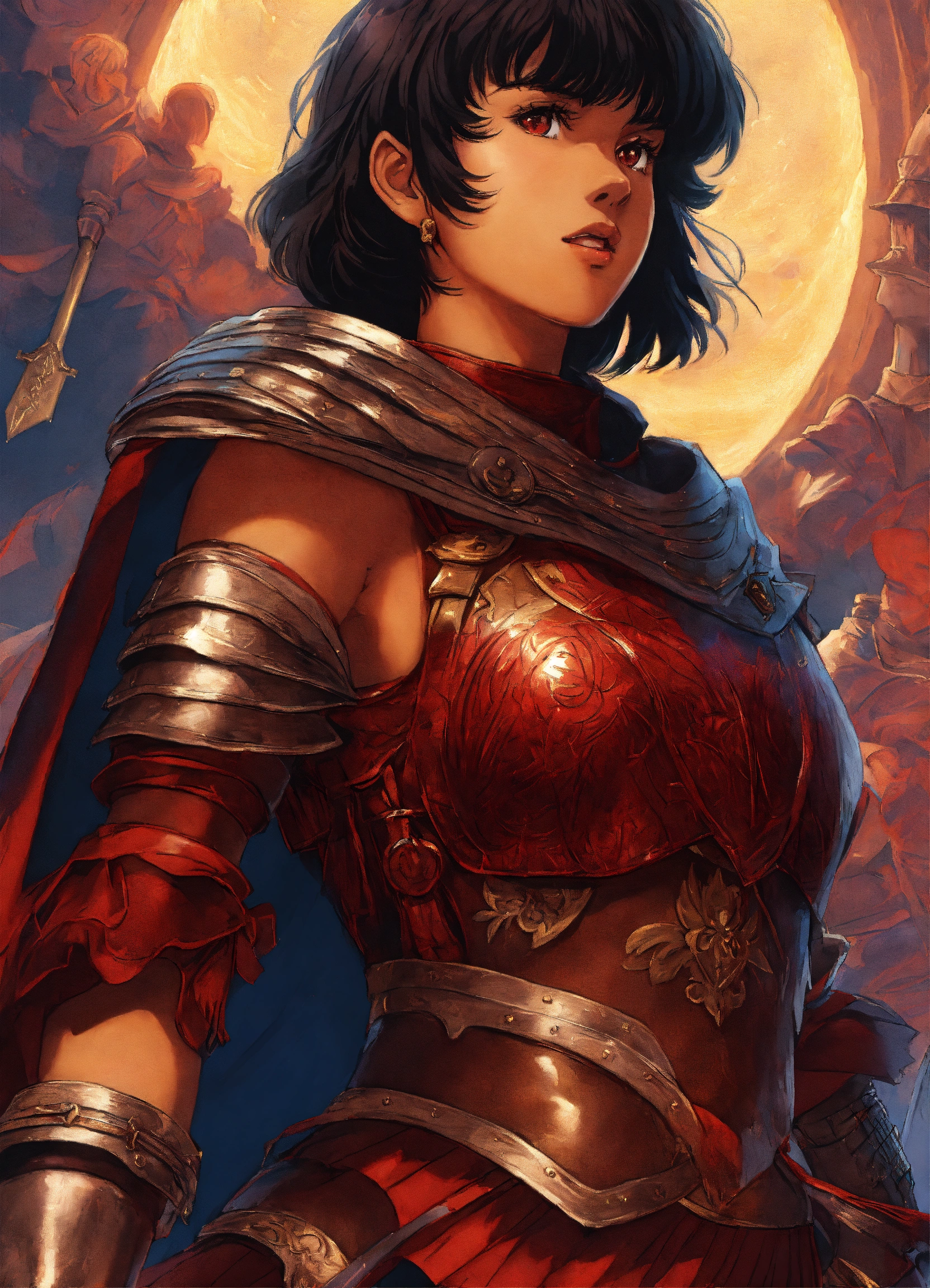 Anime art of casca from berserk, brown skin, short hair, dancing in her armor with guts, 8k, stunning intricate details, by kentaro miura