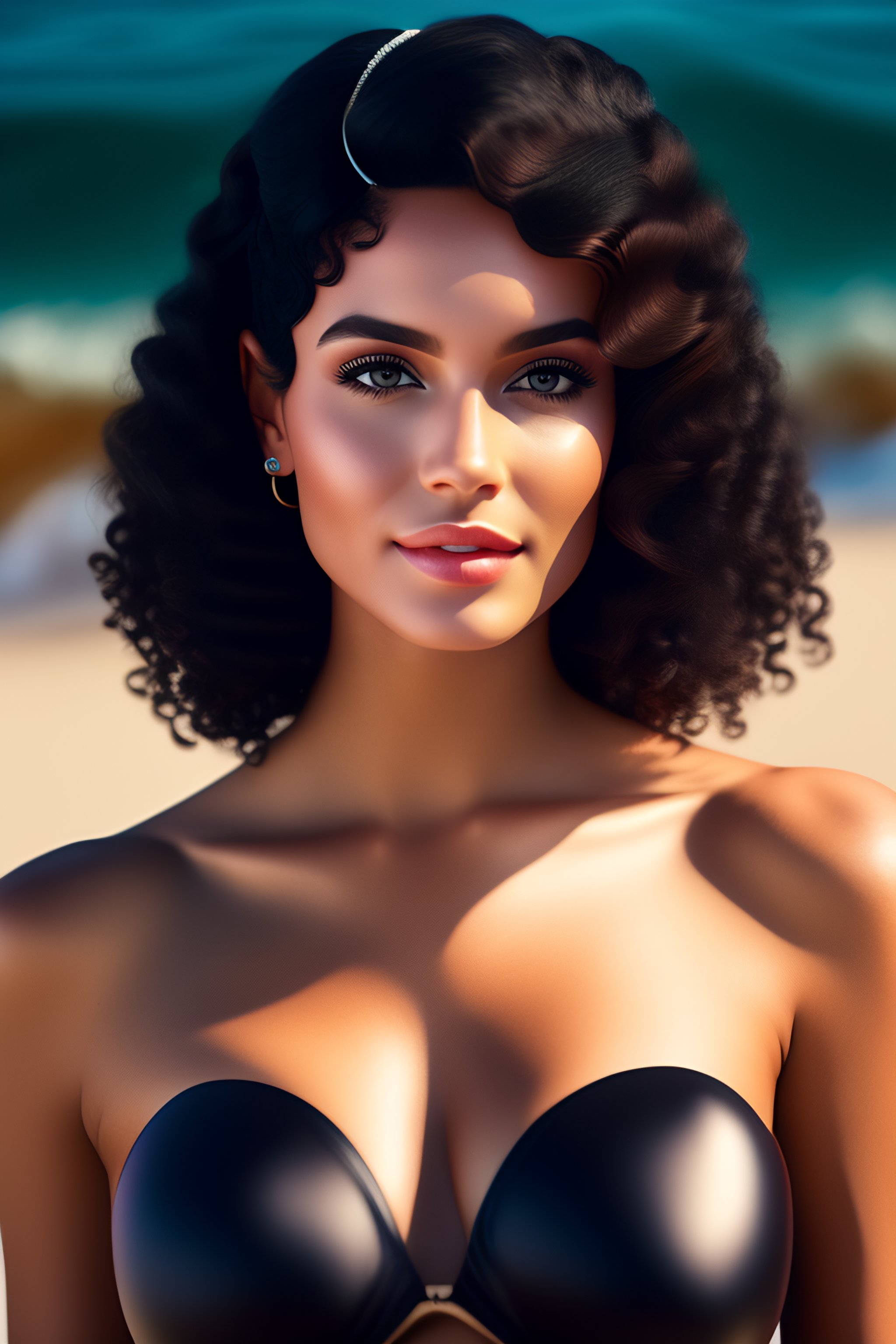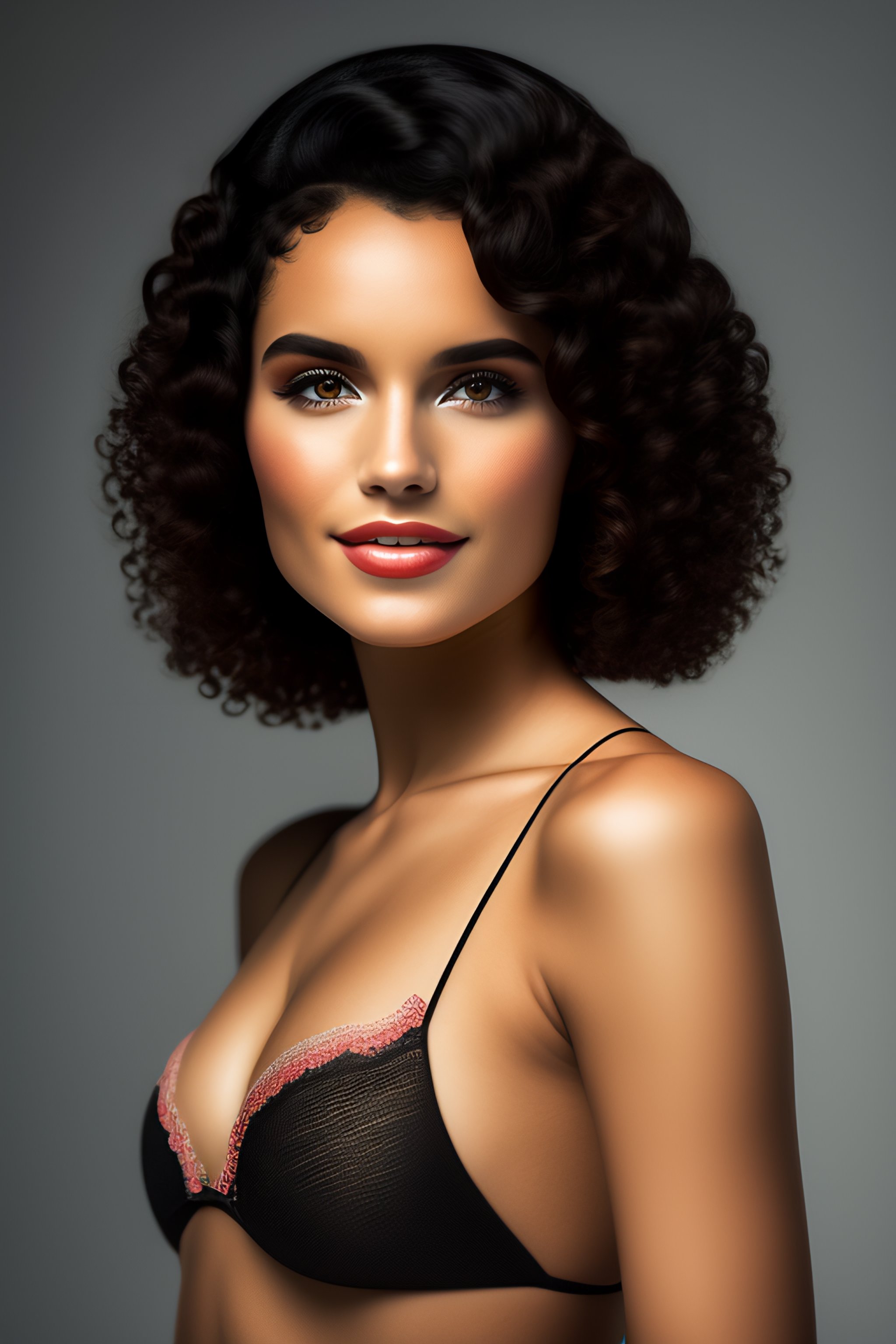 Beautiful cottagecore photo candid of a girl with short black curly hair, round face, cute face, pendulous top, wearing a 34gg size bikini. intricate, elegant. highly detailed, digital upscaled photo, smooth, sharp, focus, illustration.