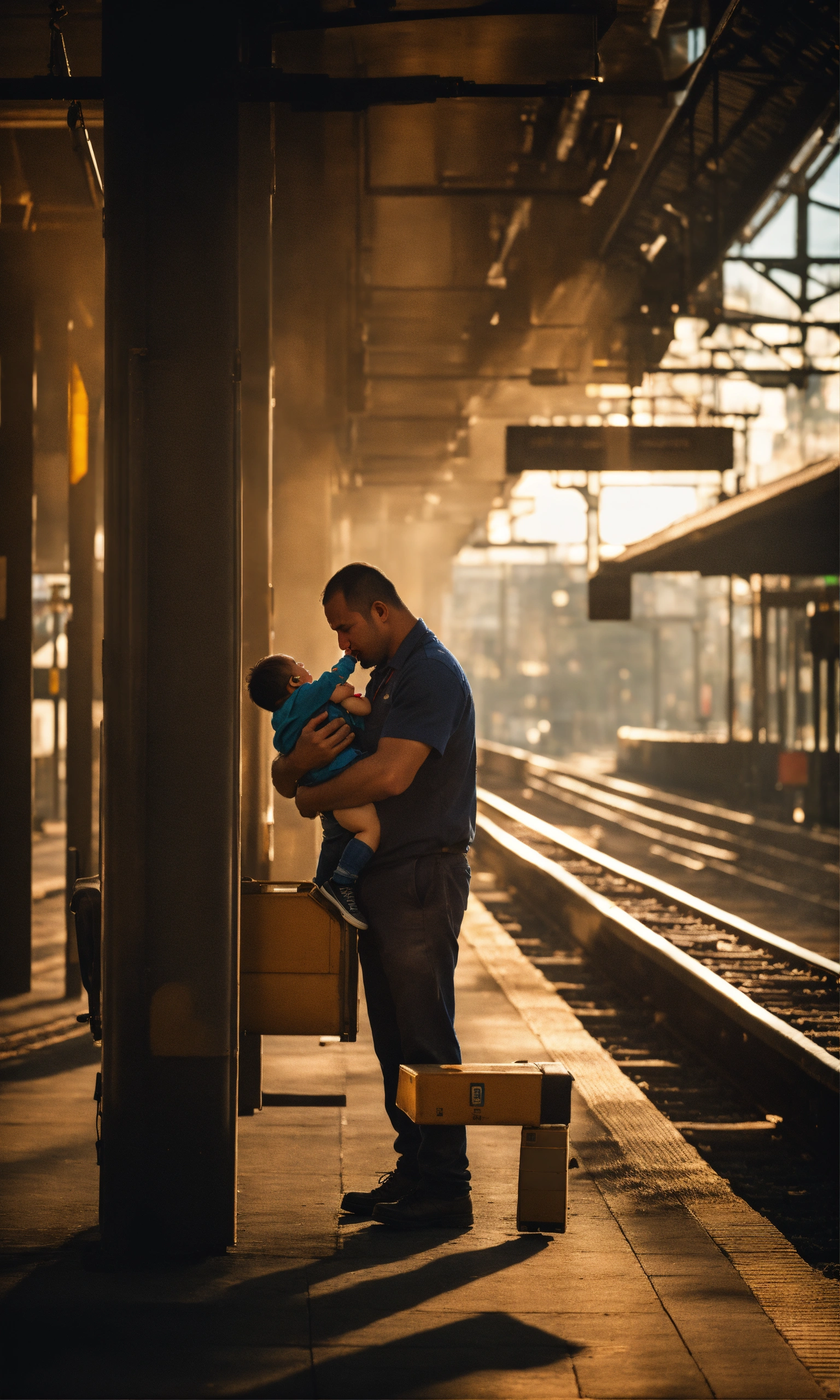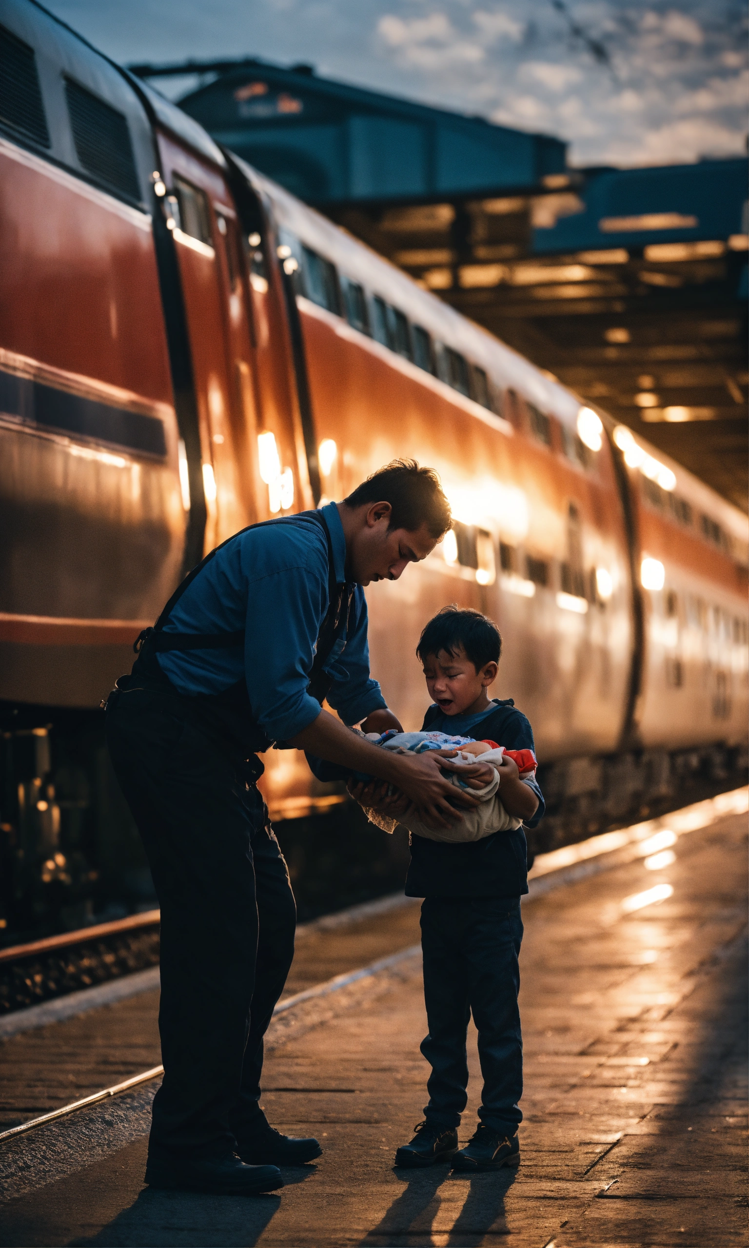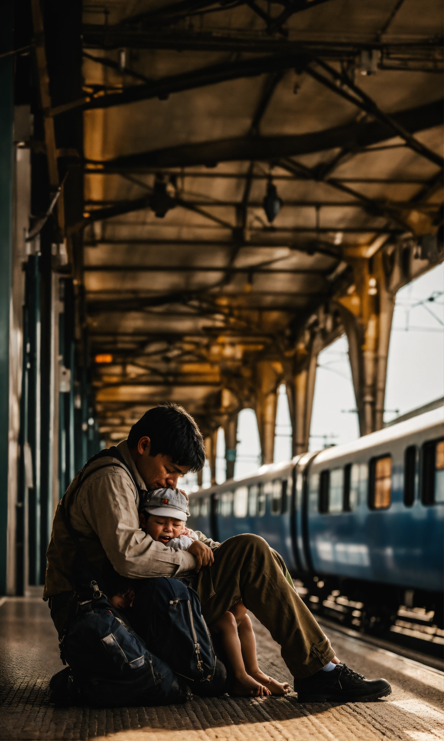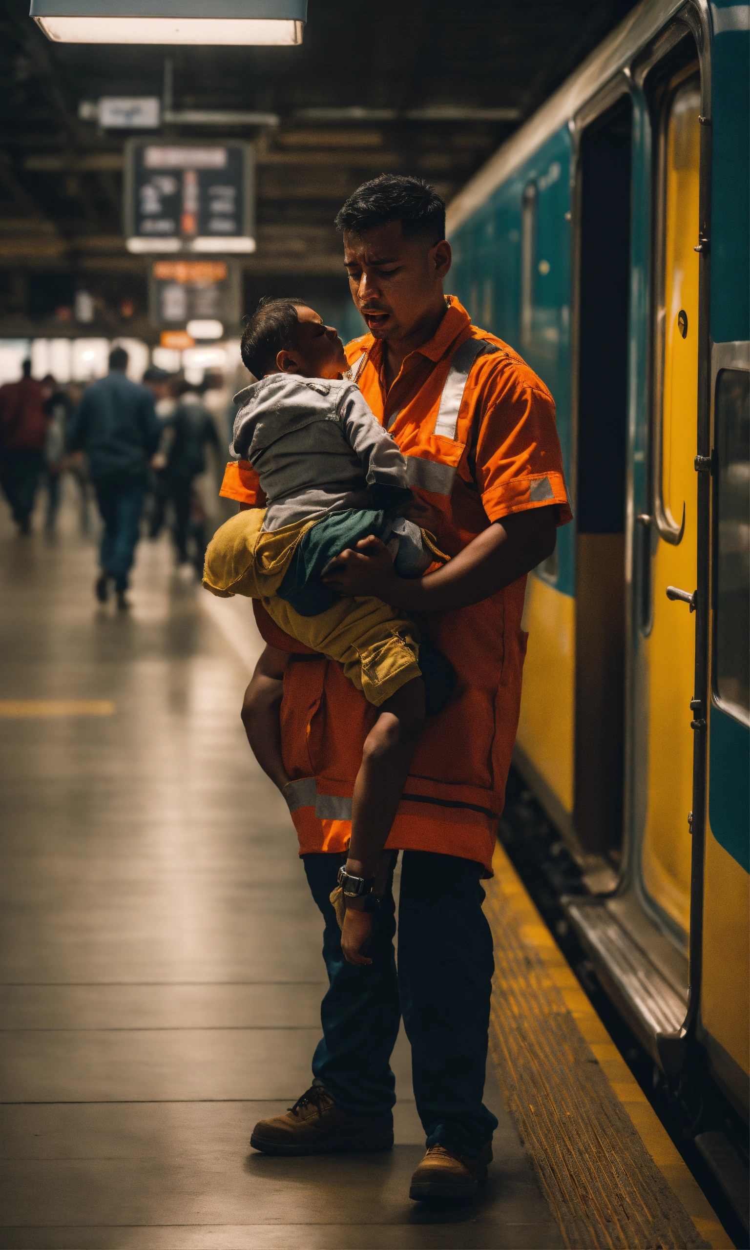 A worker in a train station holding the body of his son and crying, surreal photo, fujifilm xt3, outdoor, good lighting, raw photo, 8k uhd, film grain, unreal engine 5, ray trace