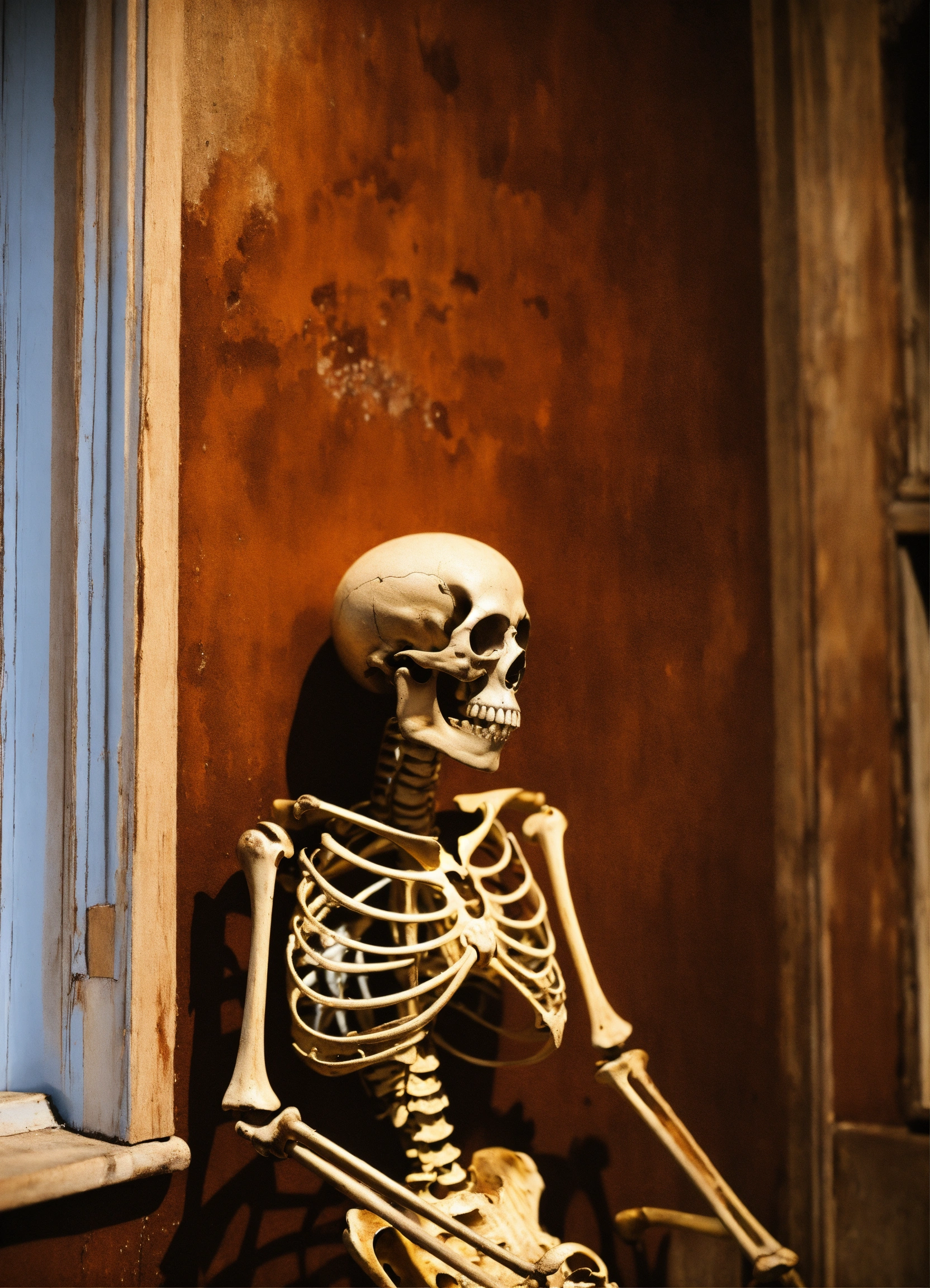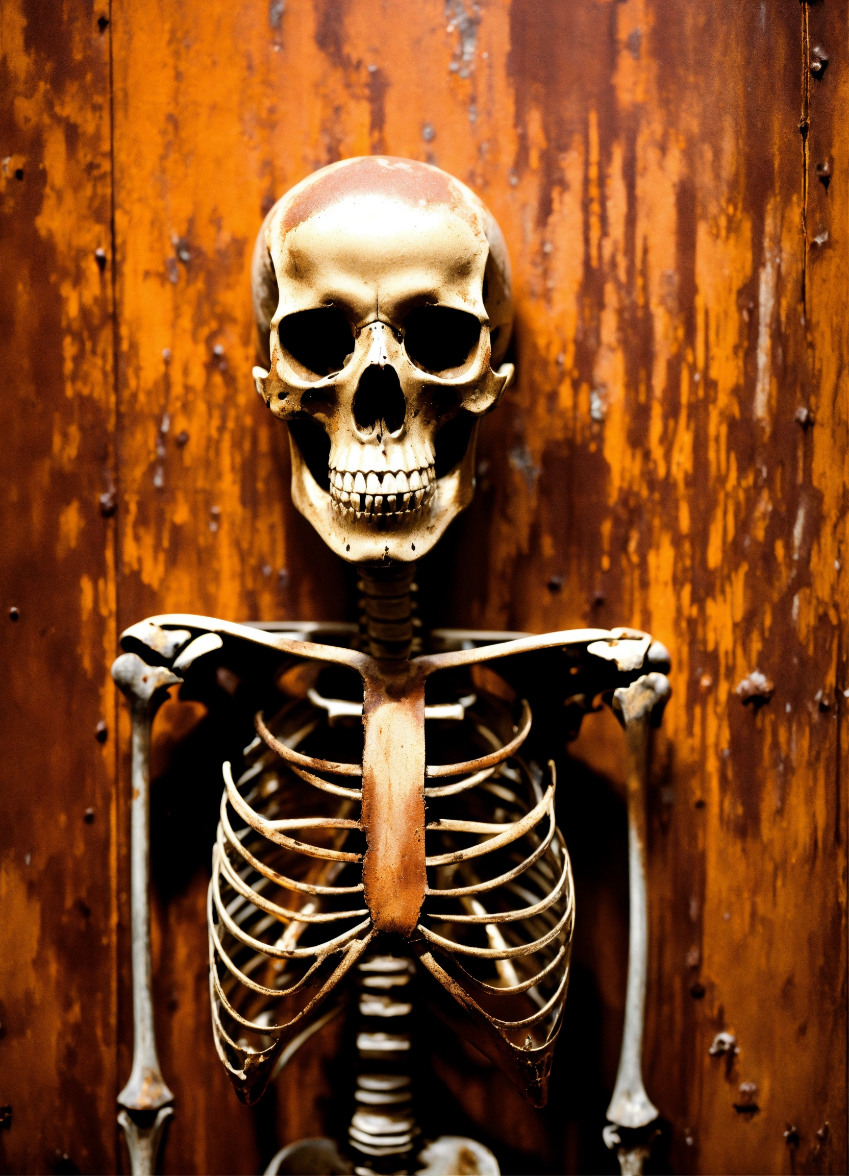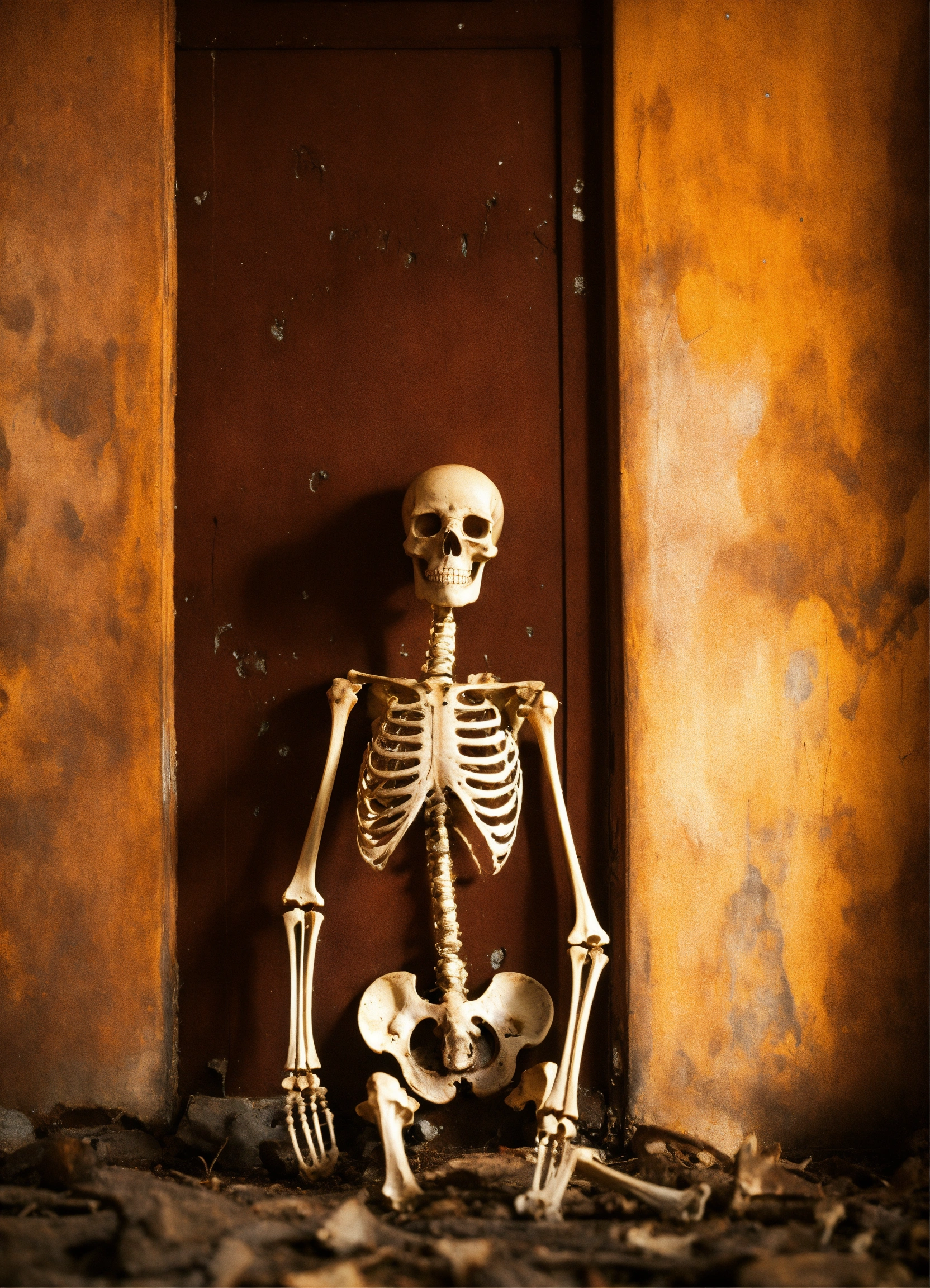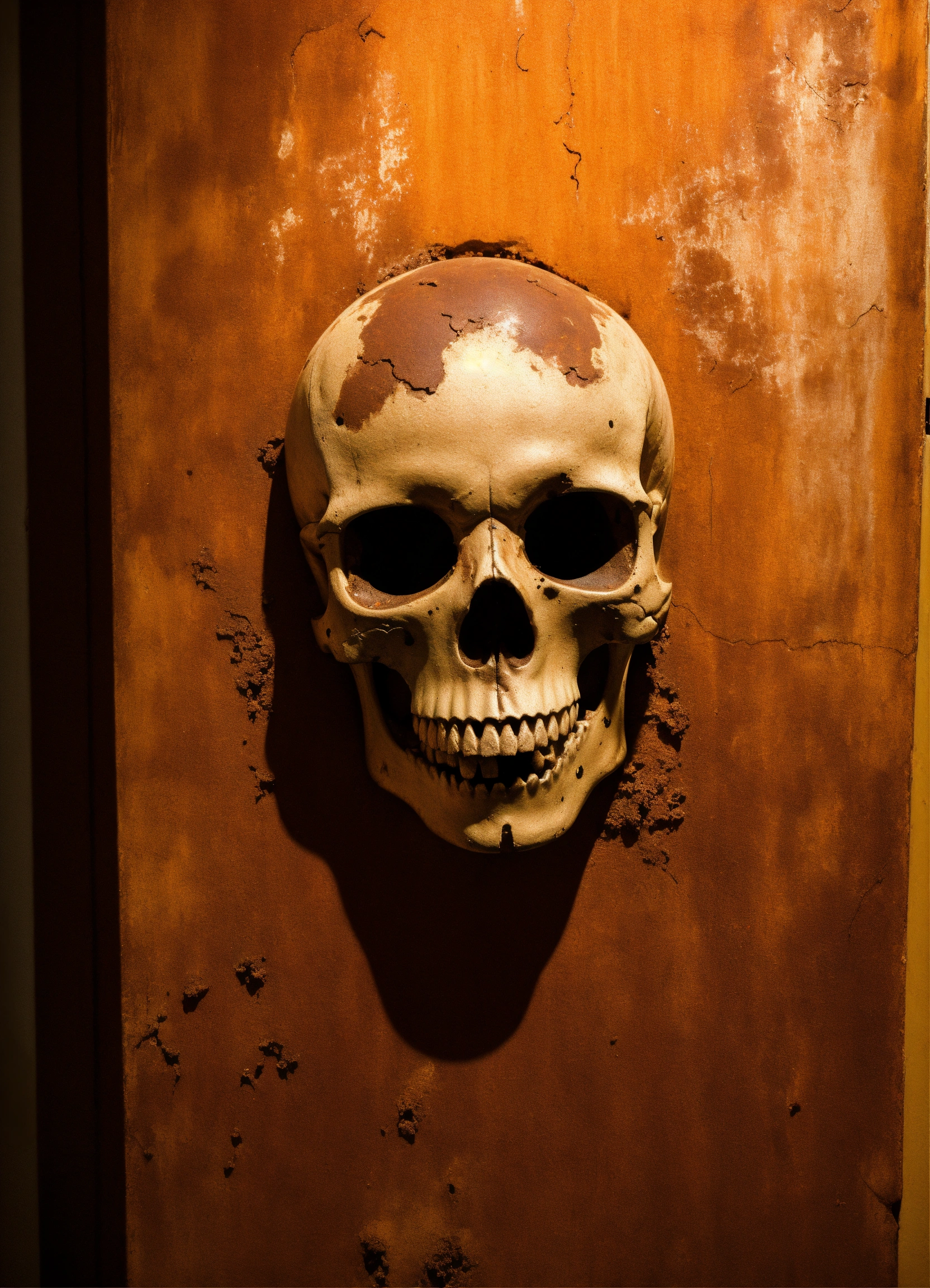 Skeletons small head on rusty brown stain wall of bedroom in night