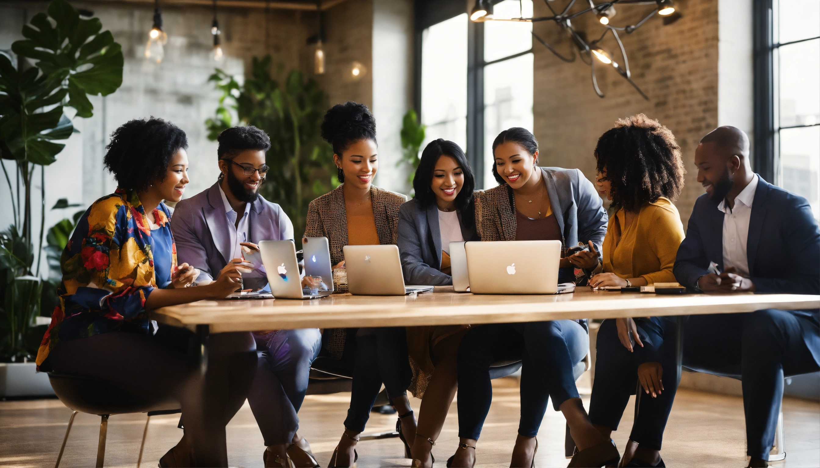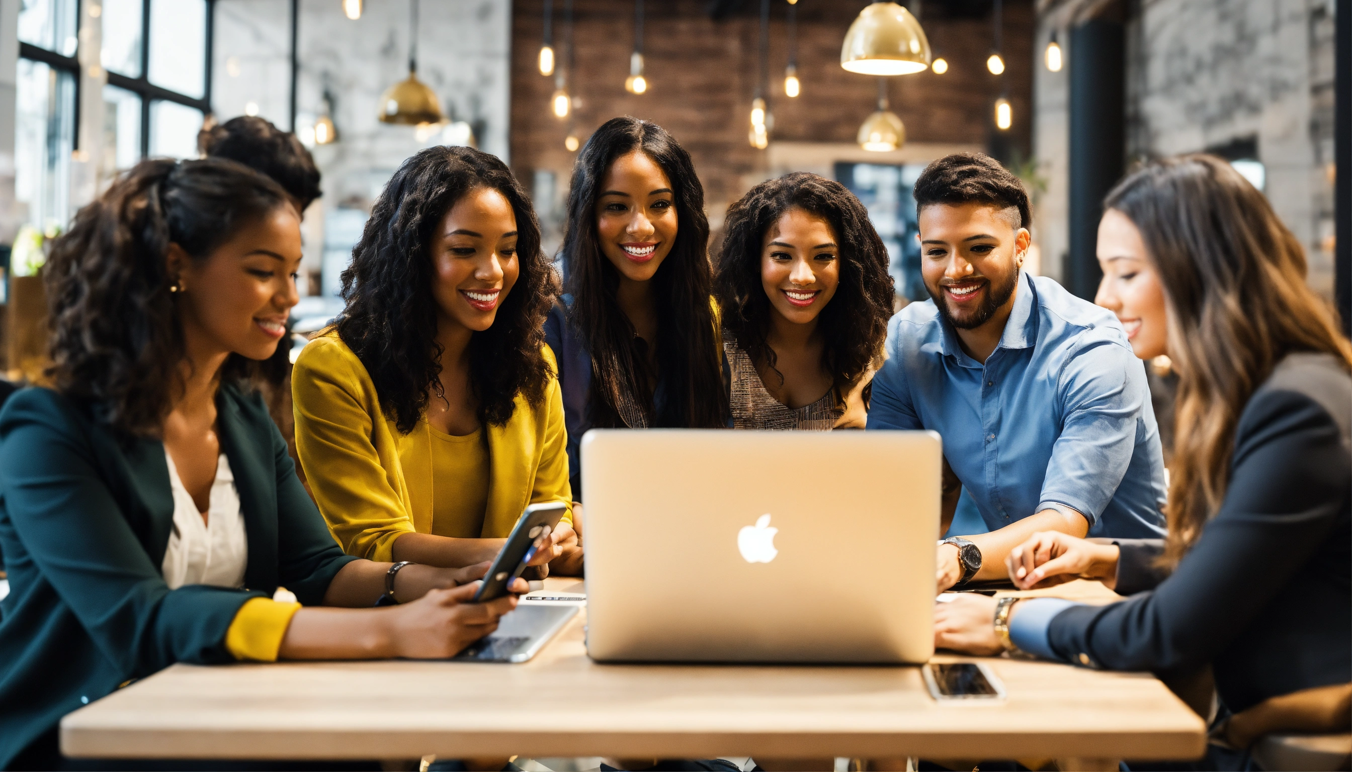 Create a photo showcasing a diverse team of individuals actively participating in network marketing through social media platforms. they are gathered in a collaborative workspace, using smartphones and laptops to communicate and strategize. the atmosphere is energetic and focused, with various social media logos like facebook, instagram, and twitter subtly integrated into the scene, representing the digital tools they are utilizing. the team includes men and women of various ethnicities and age groups, reflecting the inclusive nature of network marketing. the image should capture the essence of teamwork, digital communication, and the opportunities that social media provides in the world of network marketing.