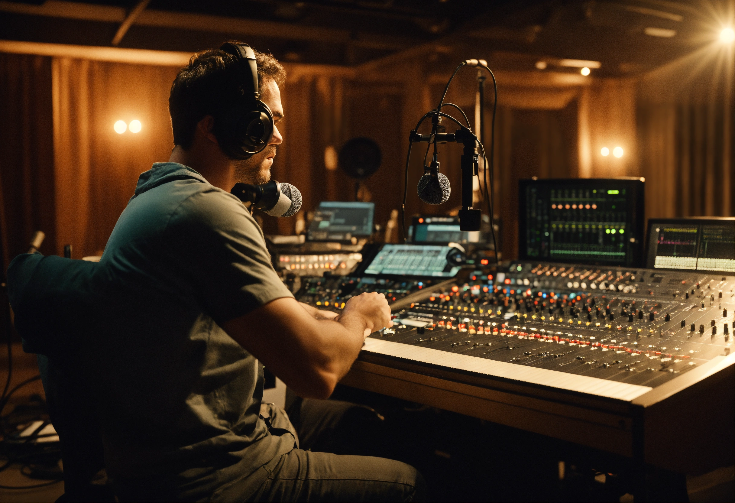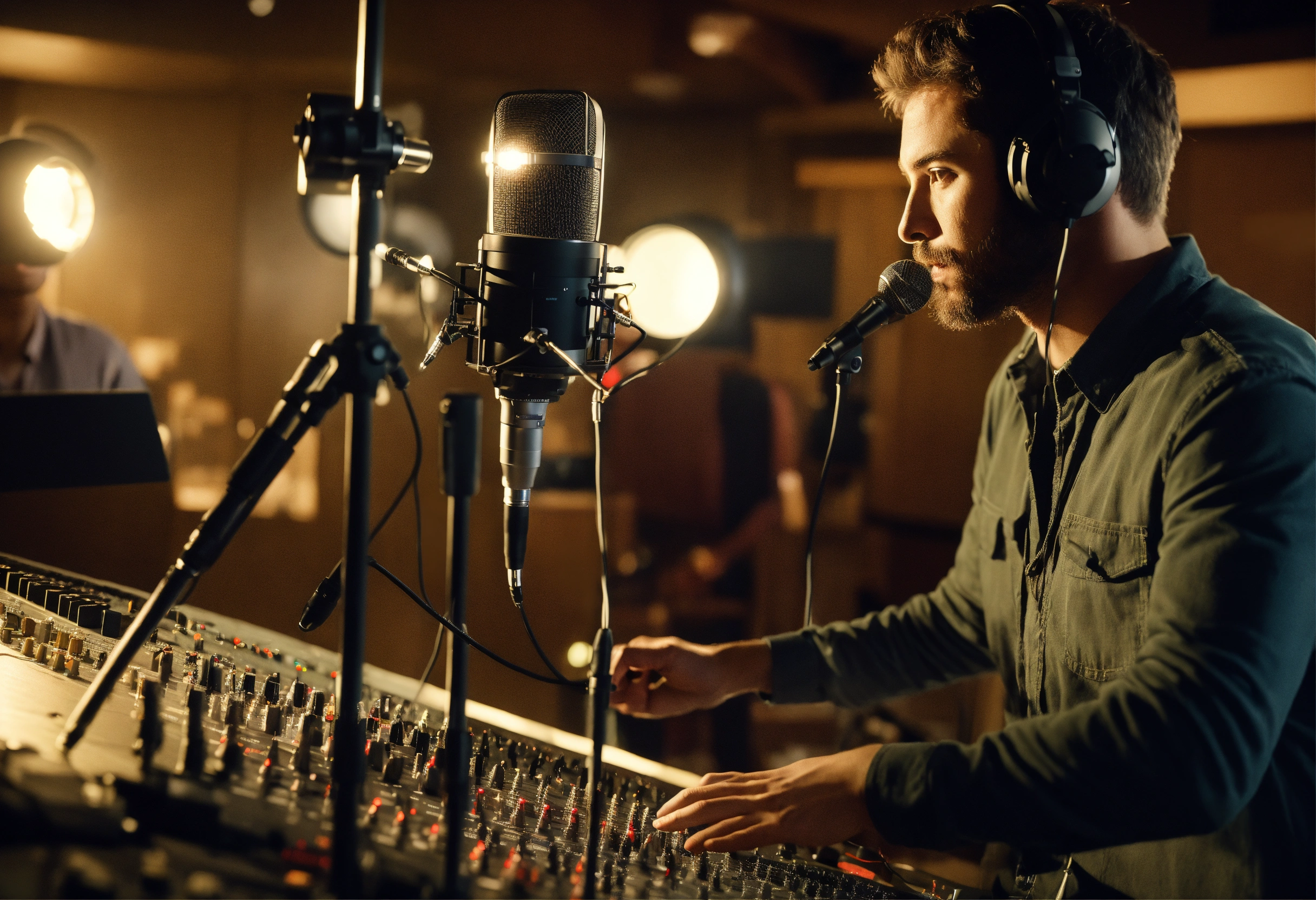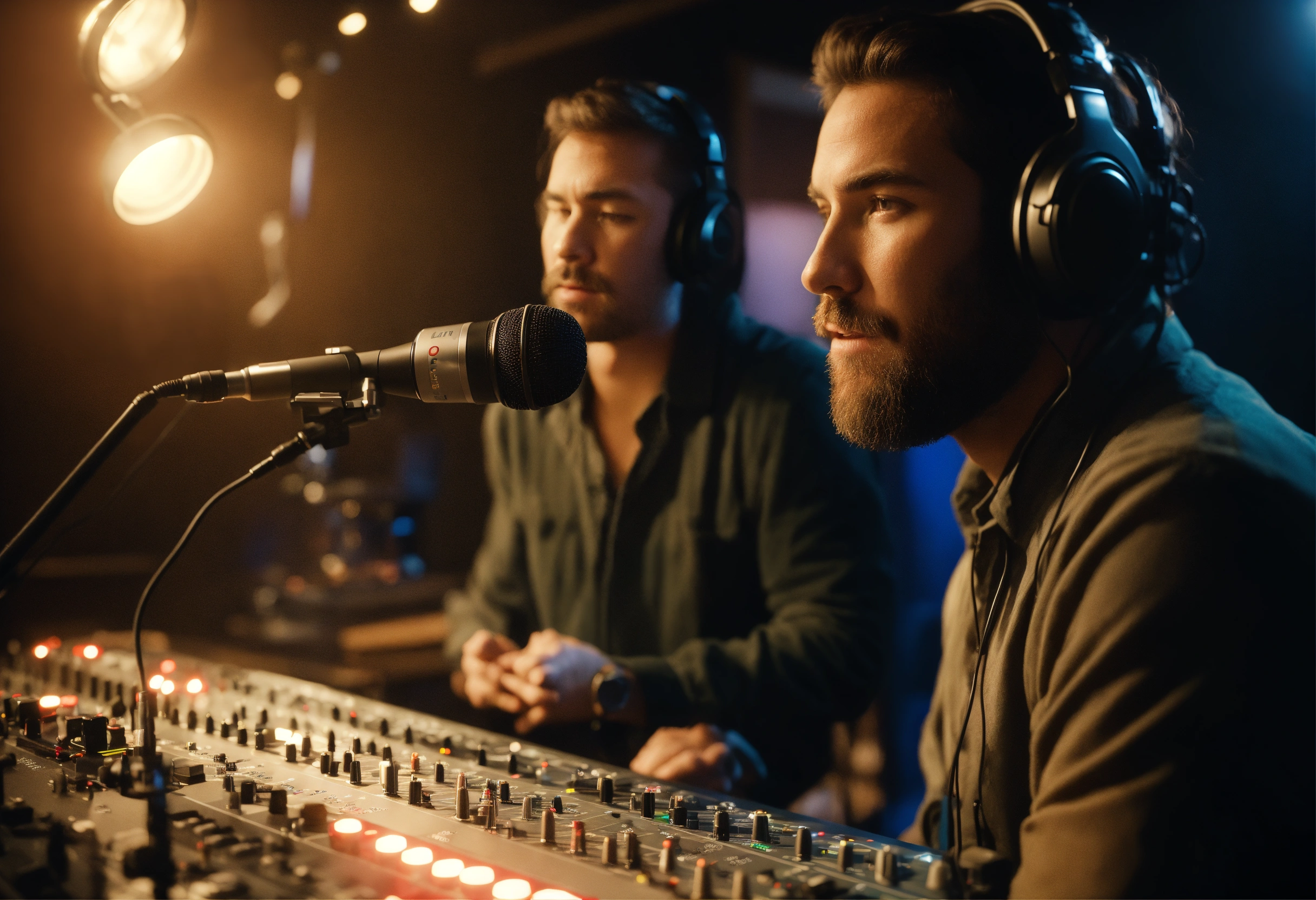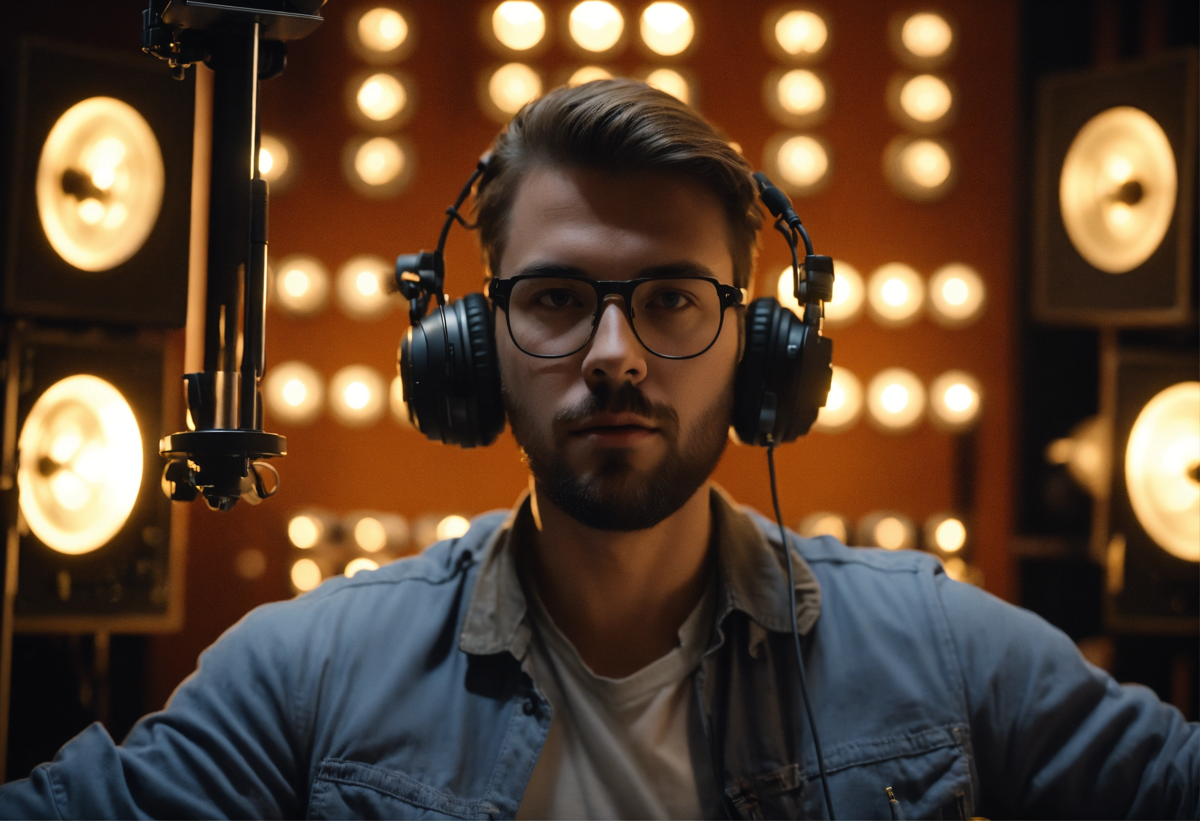 The sound engineer positions actors on the set. he pulls himself up, tilts the microphone closer to the center of the set. realistic. a clear correct focus. full frame. 3d, 4k, soft light, complex details, depth of field, beautiful lighting. symmetrical human bodies. sound engineer in the center.