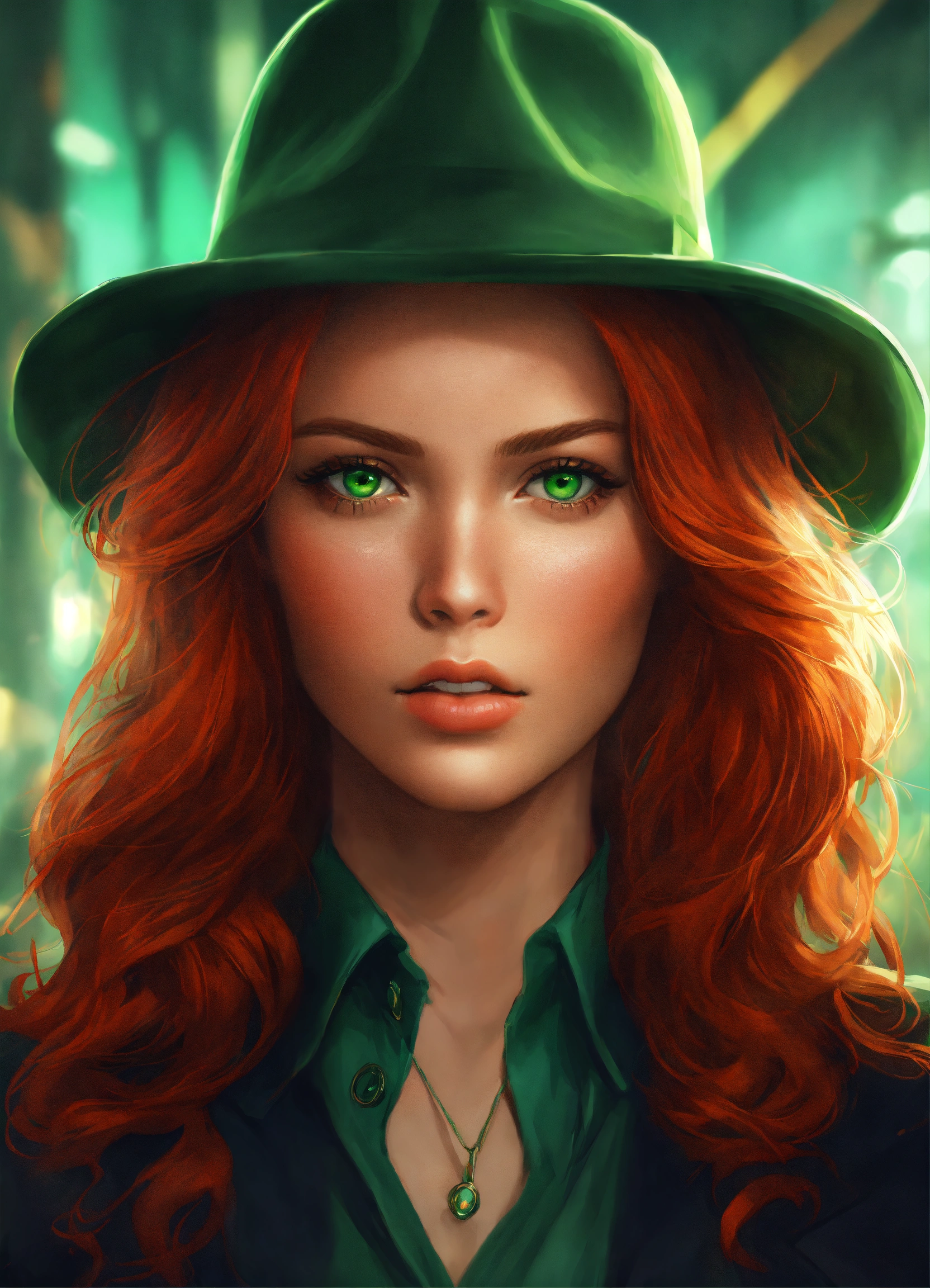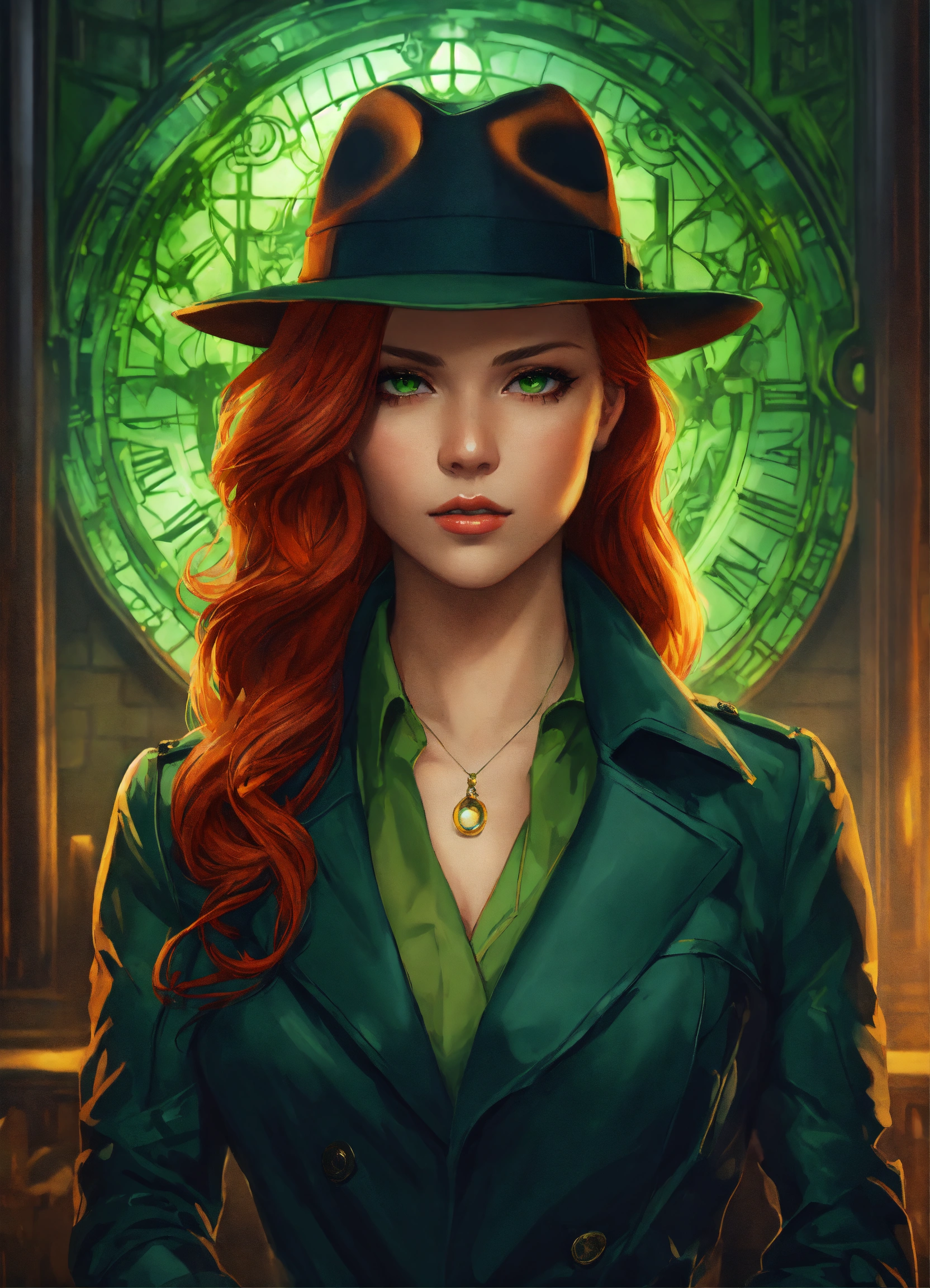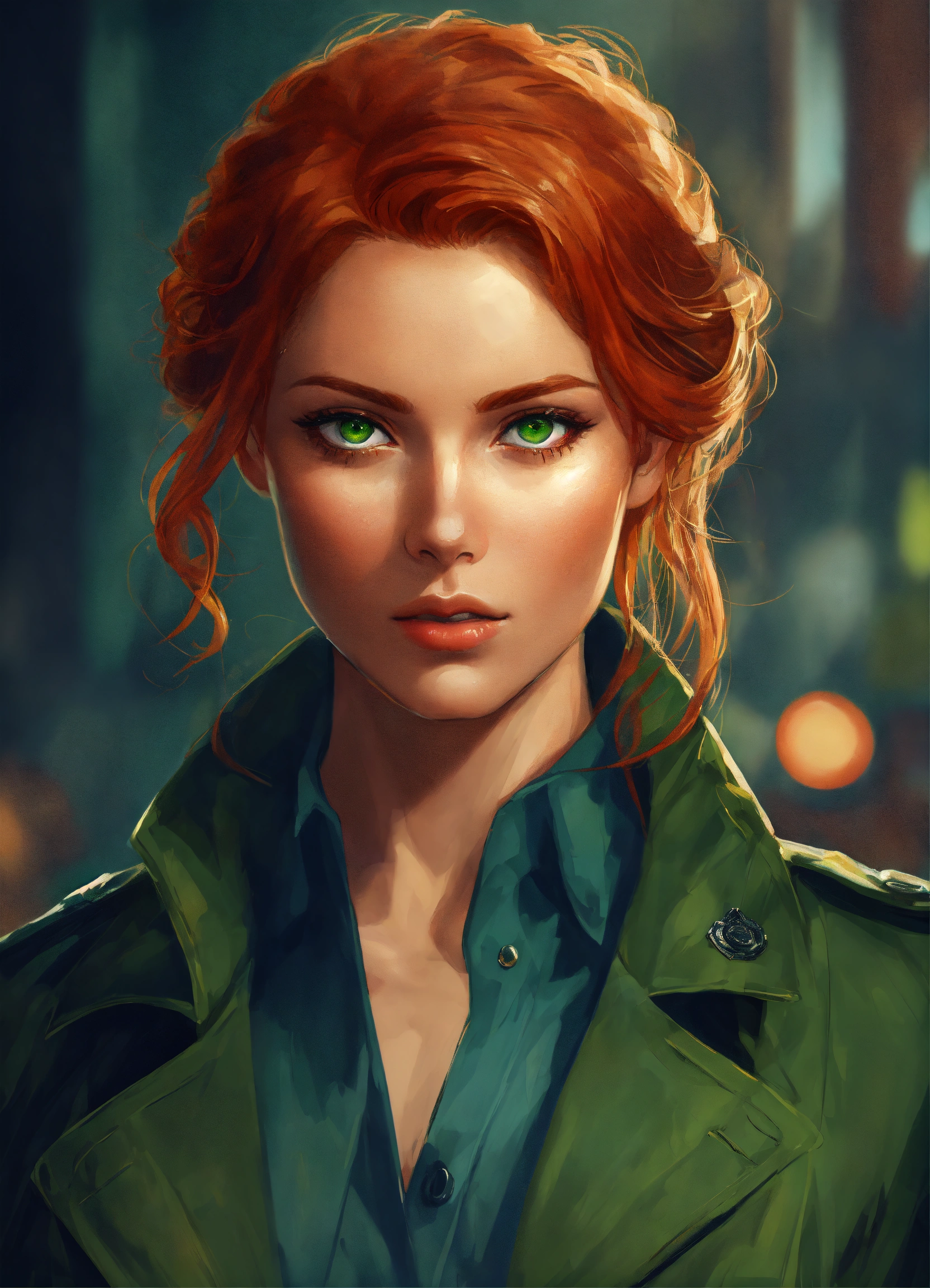 Portrait of a beautiful red haired detective, concept art, symmetrical face, attractive, green eyes, digital art, exquisite detail, female