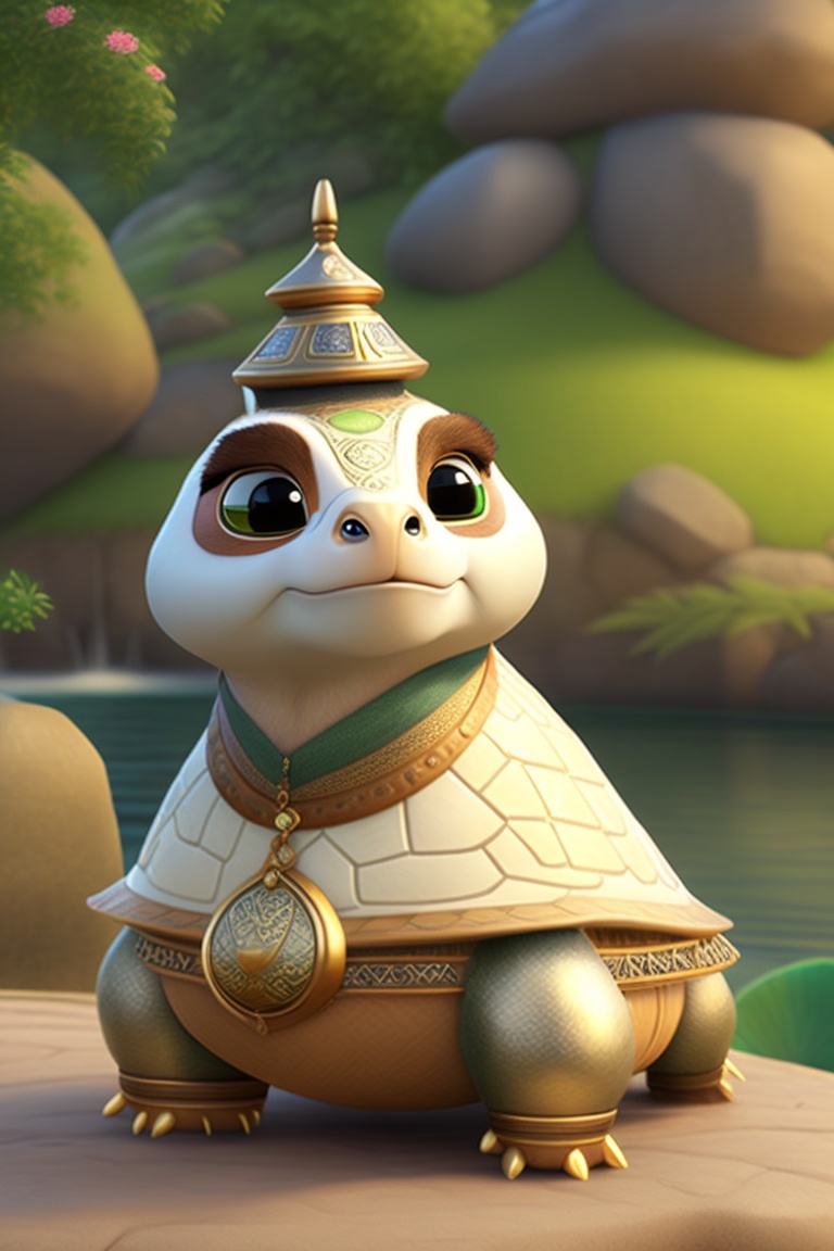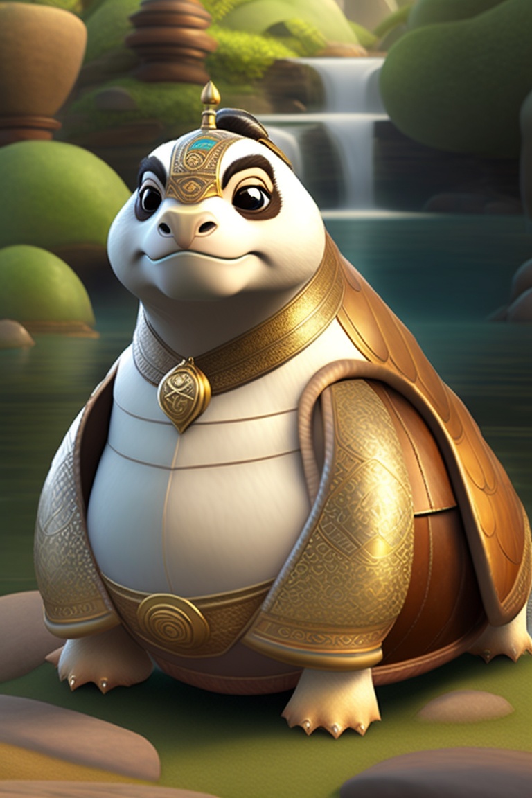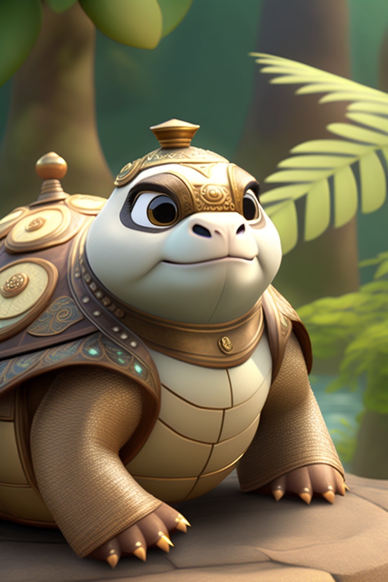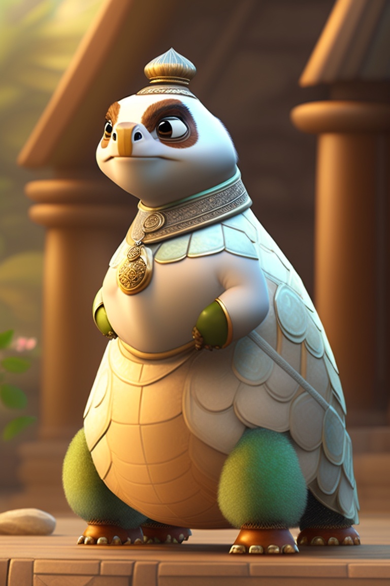 The image portrays master oogway, the wise and revered tortoise from the animated film franchise kung fu panda. oogway is depicted in a dignified and serene manner, exuding an aura of wisdom and tranquility. at the center of the image stands master oogway, an ancient and majestic tortoise. he is characterized by his large, wrinkled head and neck, adorned with a pattern of scales that denote his age and wisdom. oogway's eyes, peering out from beneath his bushy eyebrows, shine with a profound and knowing gaze, reflecting the depths of his wisdom and spiritual enlightenment. oogway's shell, adorned with a captivating array of intricate patterns, showcases a harmonious blend of earthy tones, including browns, greens, and yellows. the shell embodies the resilience and strength that oogway possesses, symbolizing his deep connection with the natural world.