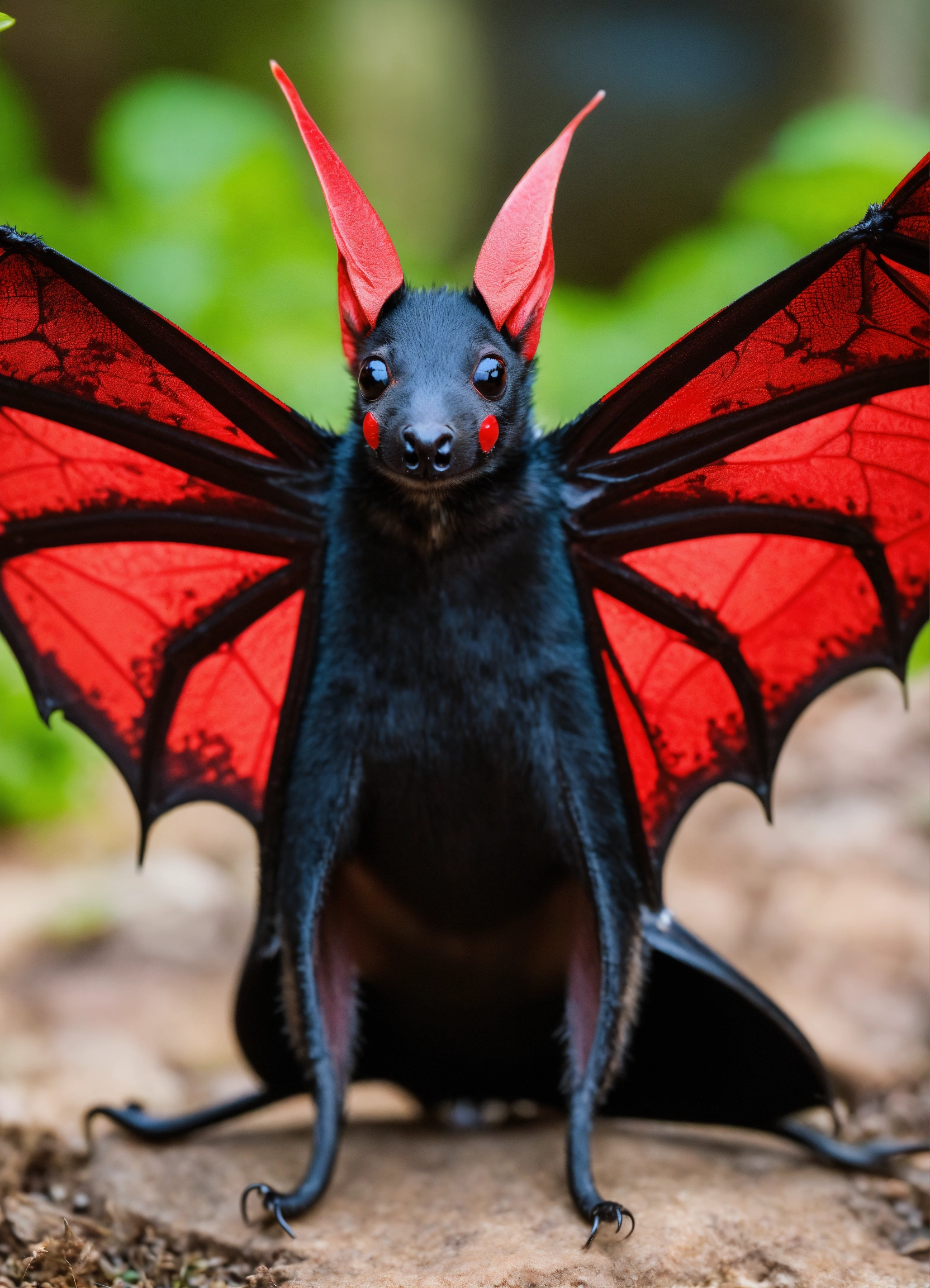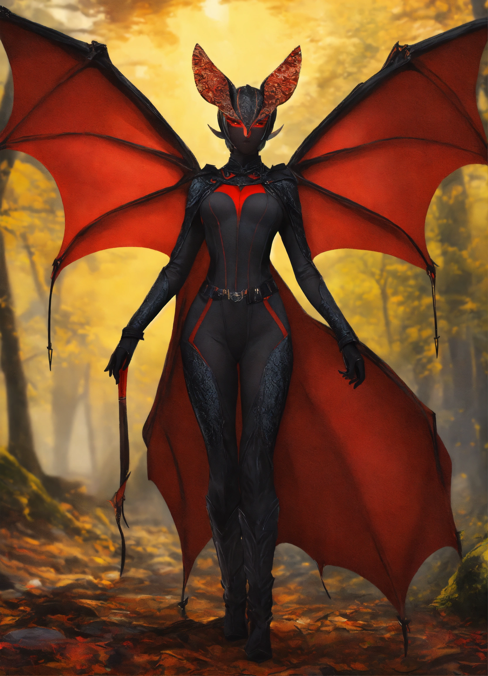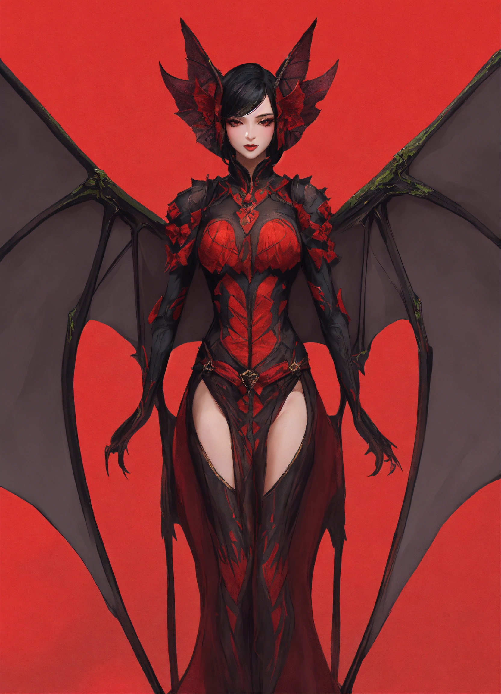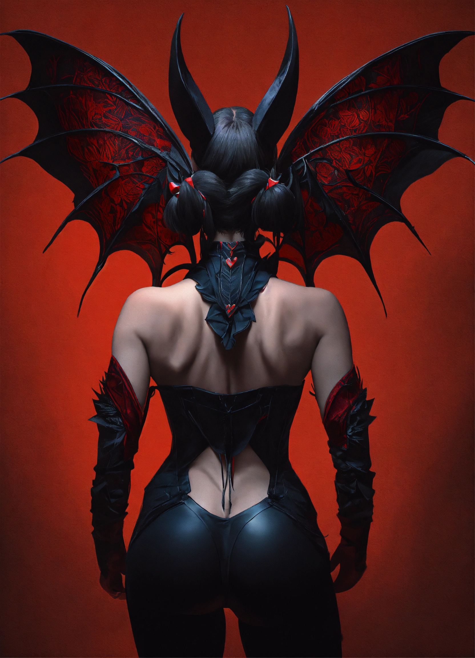 The woman's bat-like wings sprout from the woman's back, near the woman's shoulders. the wings are black, while the tail is also black but ends in a vibrant red tip. two curved, black horns protrude from the woman's head, with a slight reddish tint on their upper sides. the wings make up about 70% of the woman's body size and are adorned with the red patterns. the tail, which accounts for about 50% of the woman's body size, also displays the striking red tip.