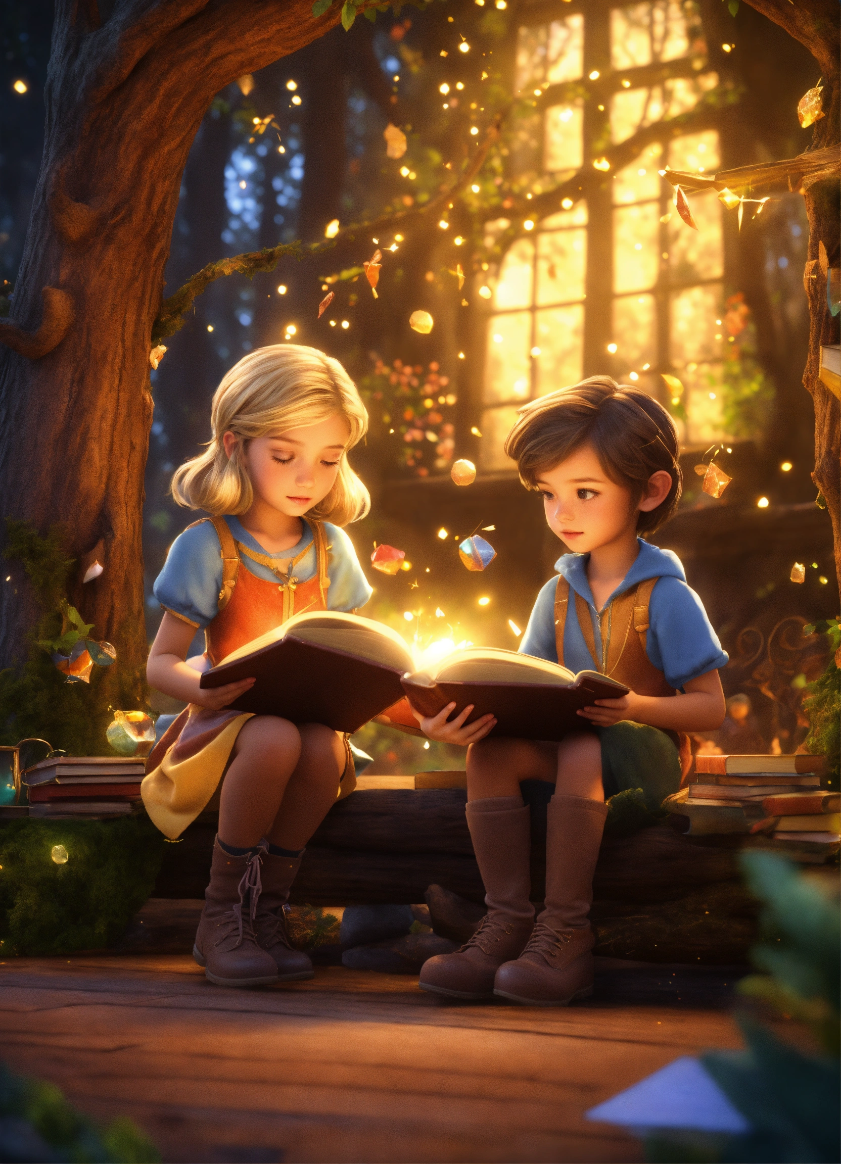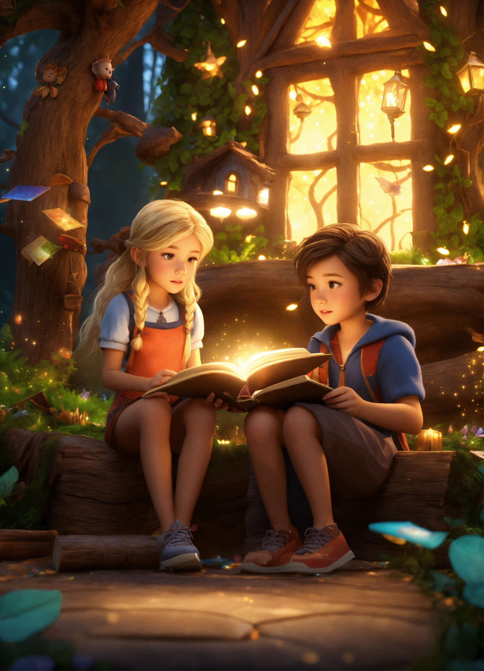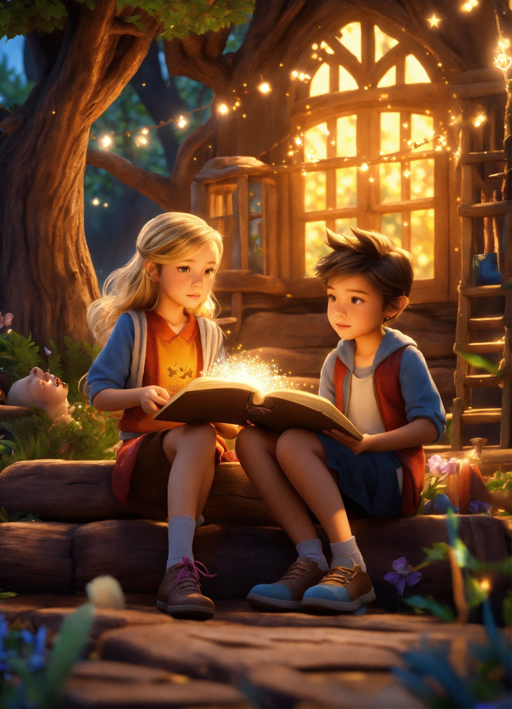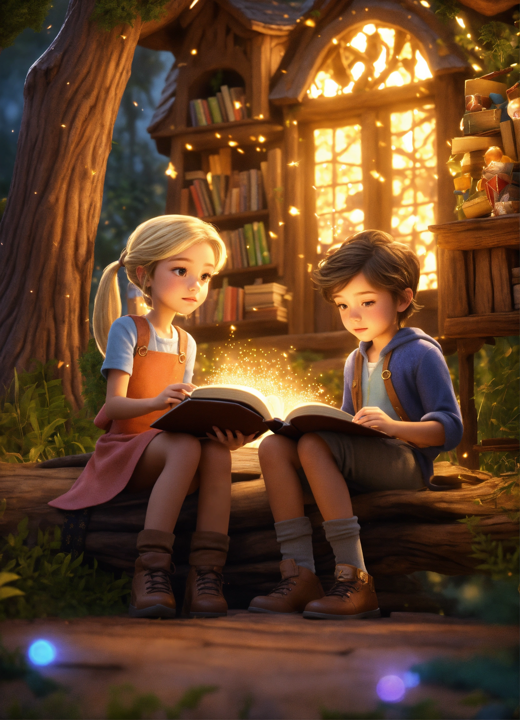 Cartoon style-2 characters, short boy with dark brown hair. tall girl long blonde hair hazel eyes, both characters wearing casual clothing. girl is holding a brown old spell book both characters are looking down into the book reading, background show magic sparkle dust, fairy dust, treehouse, enchanted forest, unreal engine render, 8k, tall girl, 1 book, 2 characters