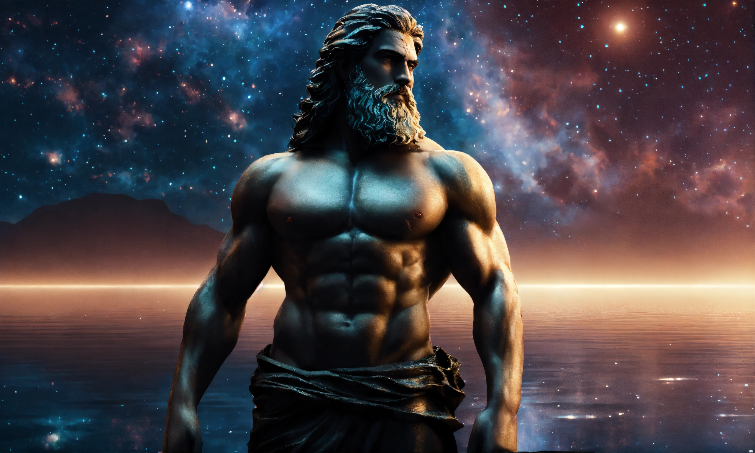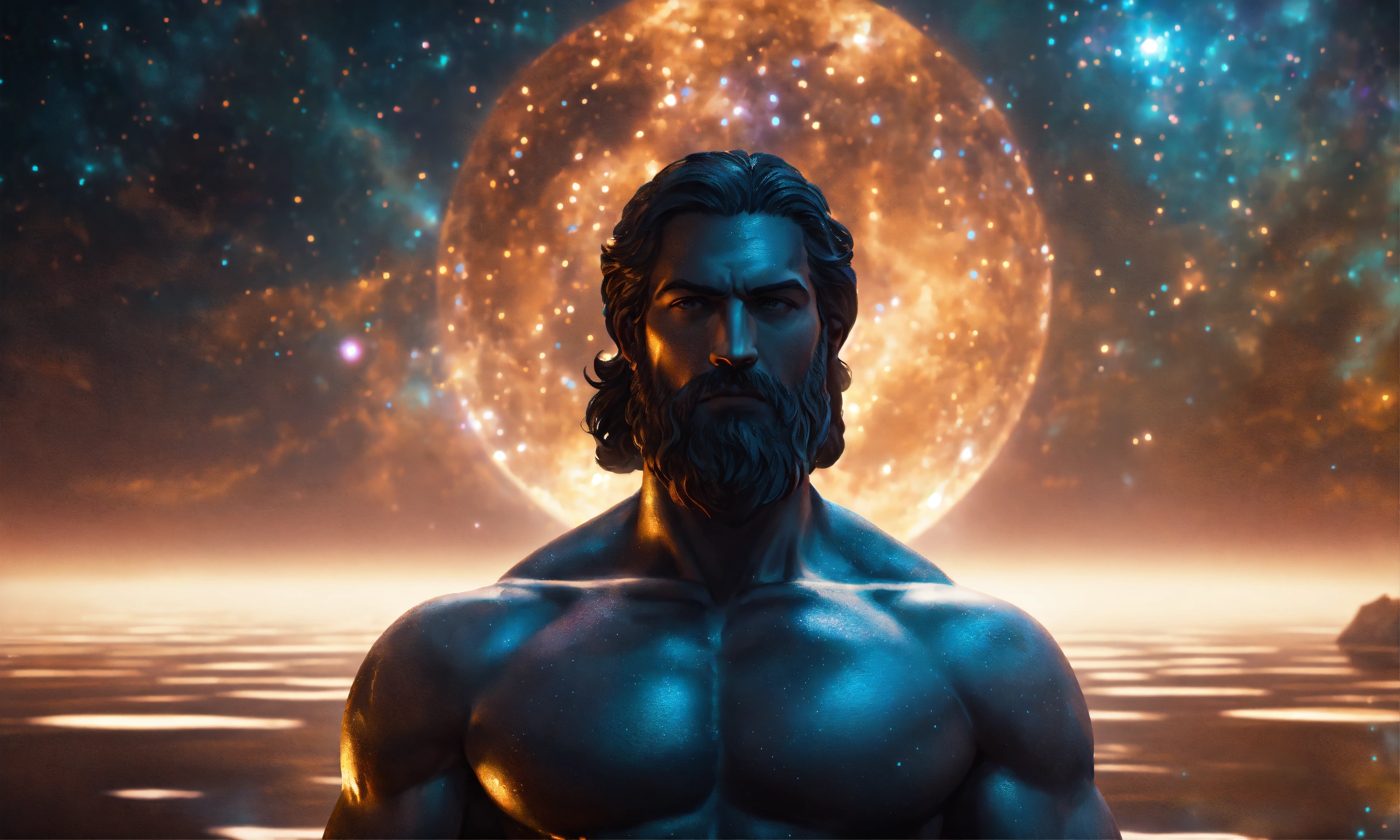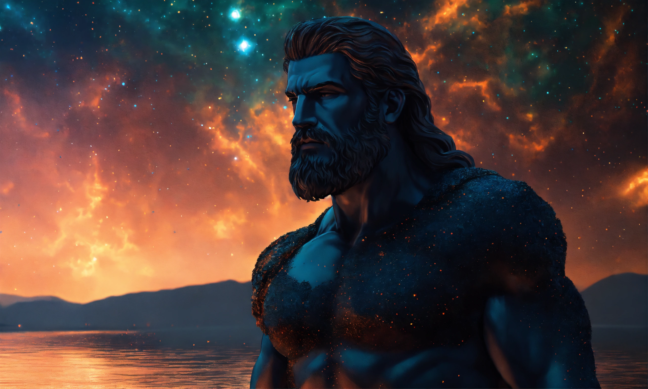 A muscular statue of a strong greek man with a beard and scars, long hair, cosmic nebula, black details, soul becomes a tranquil lake that reflects inner strength." cosmic nebula setting and surrounded by people 8k engine, medium shot, cinematography --ar 916