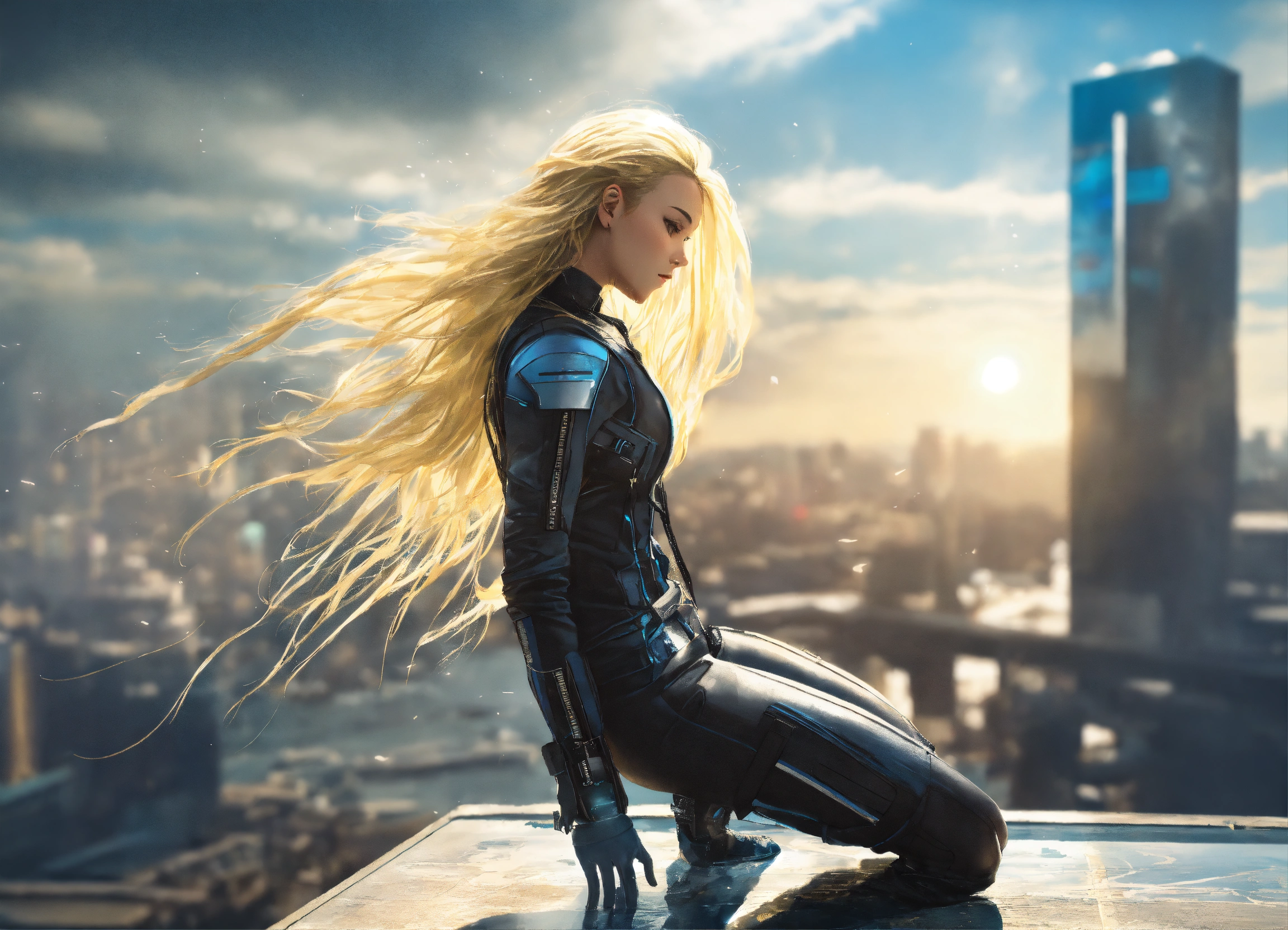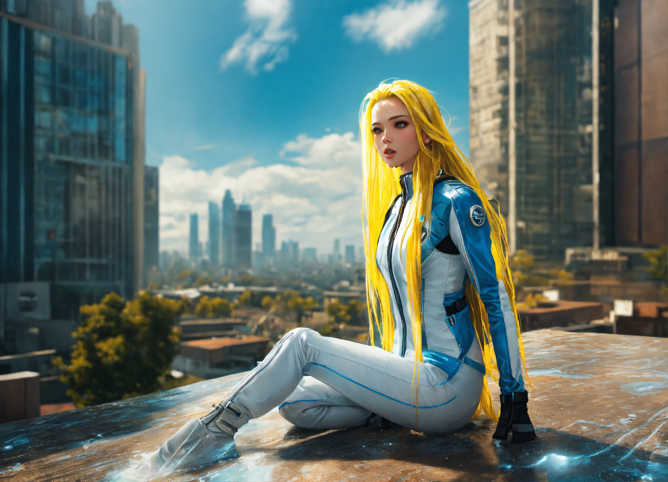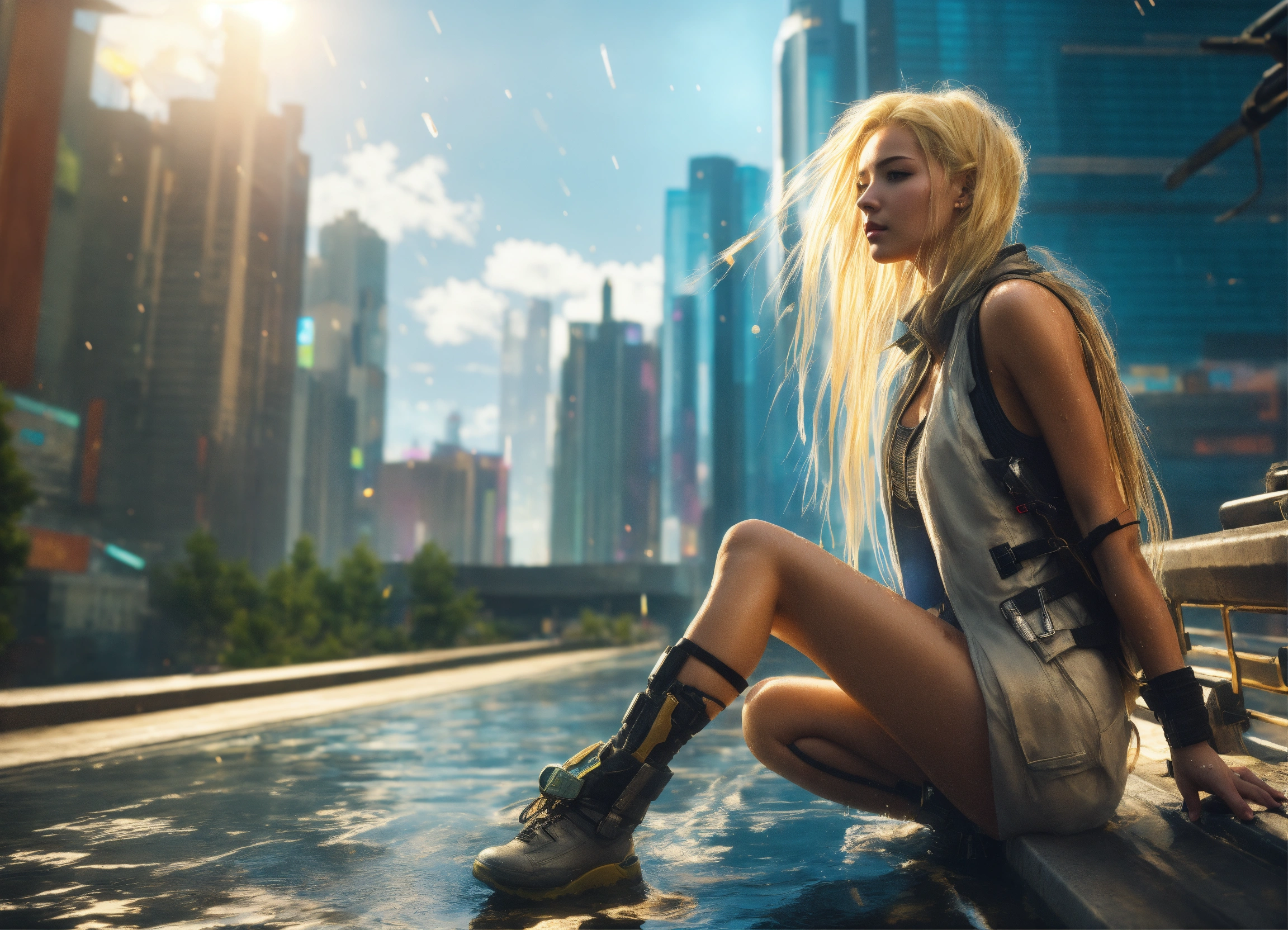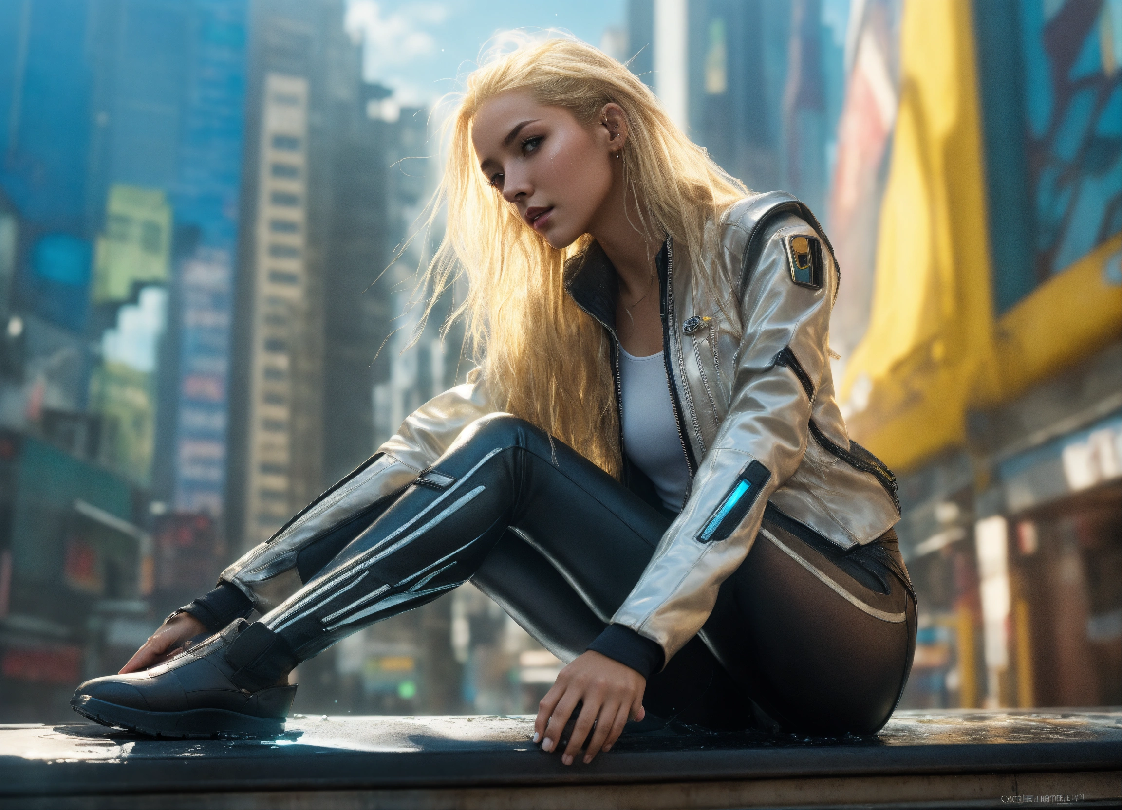 Falling viewfull body high detailed photo realistic natural photo cyberpunk dream girl, futuristic, sunny weather. x-men long blond wet hair, white