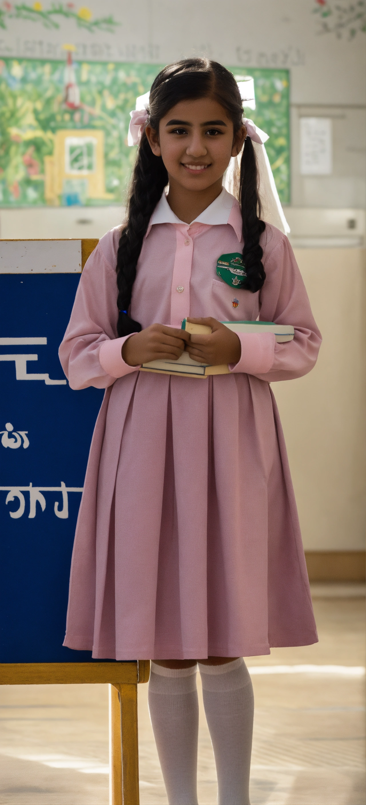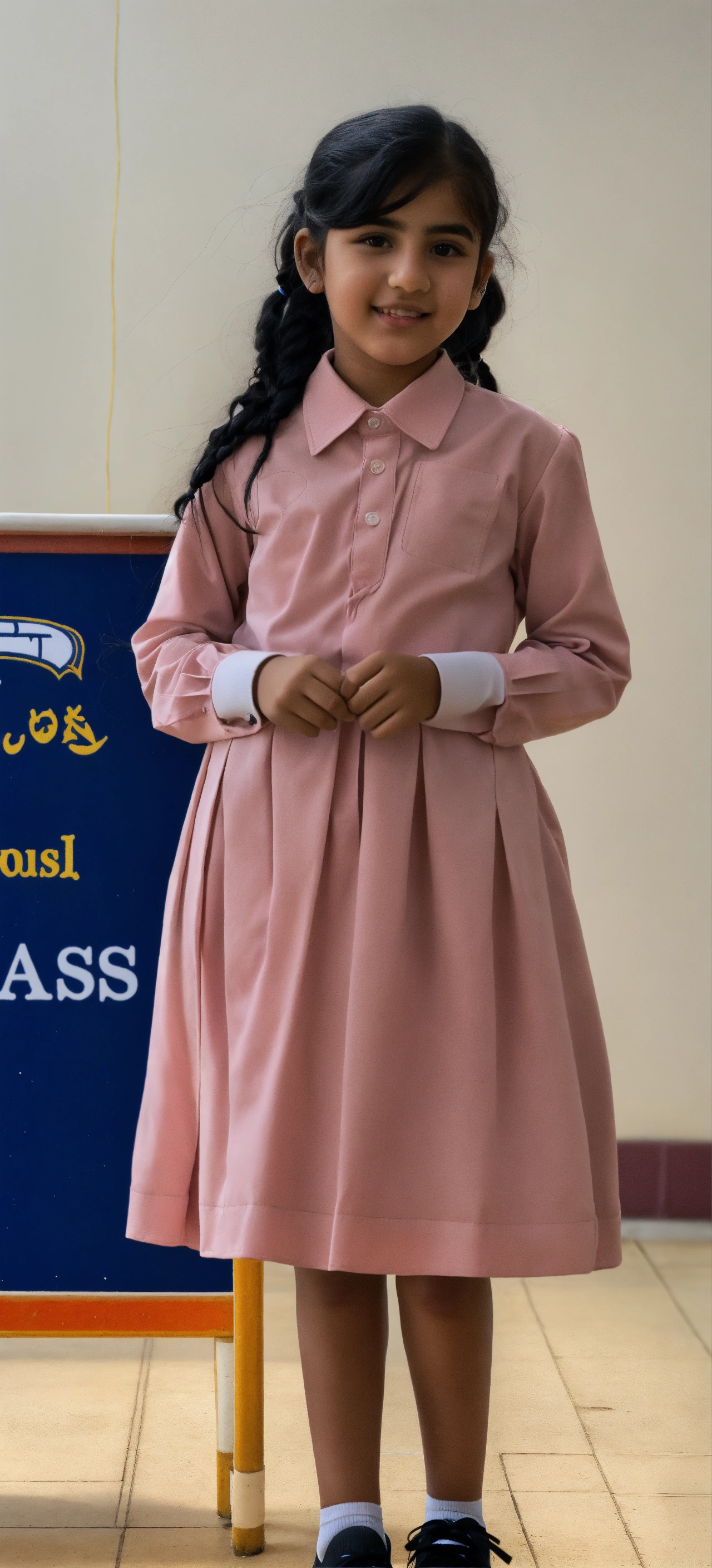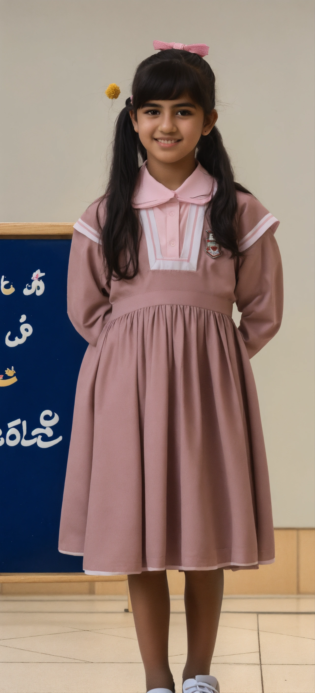 A student from the state of kuwait in the primary stage appears in a school photo in which she wears a school uniform consisting of a long-sleeved, light pink shirt with white stripes and a light pink dress. she has beautiful features, light skin, black eyes, and black hair with a ponytail. she wears black school shoes and white socks.