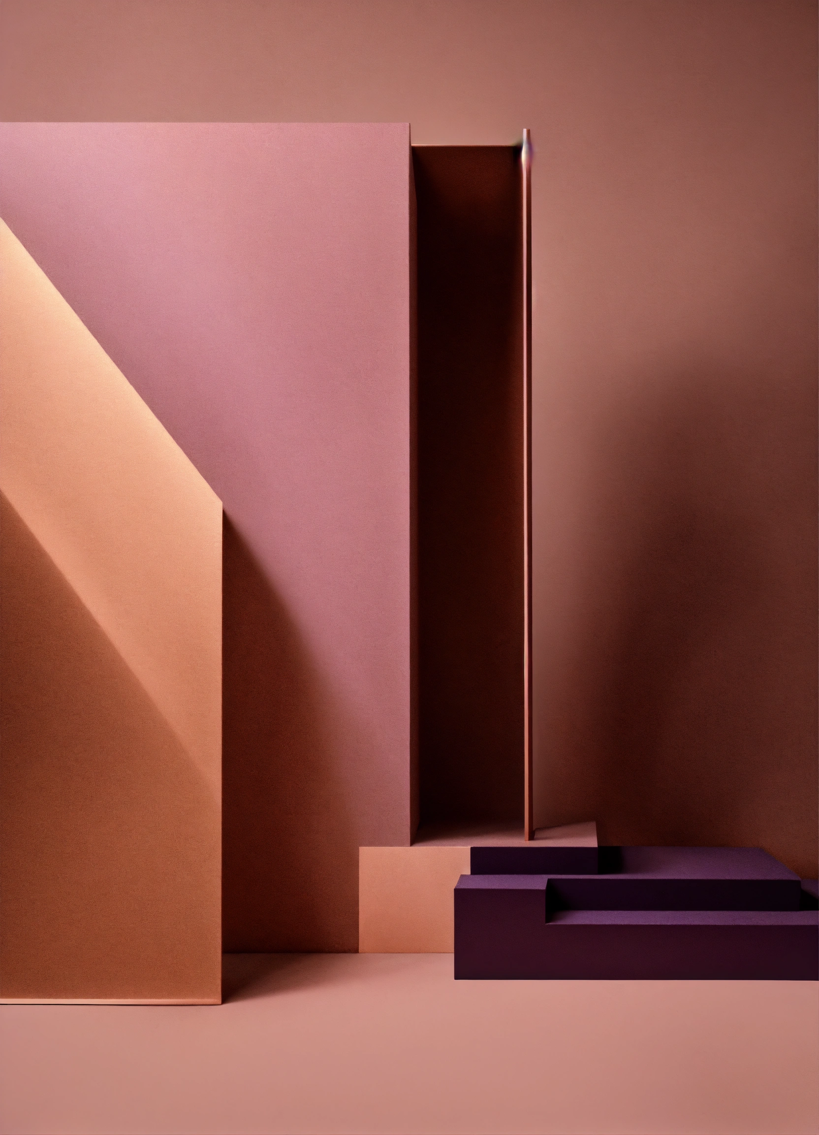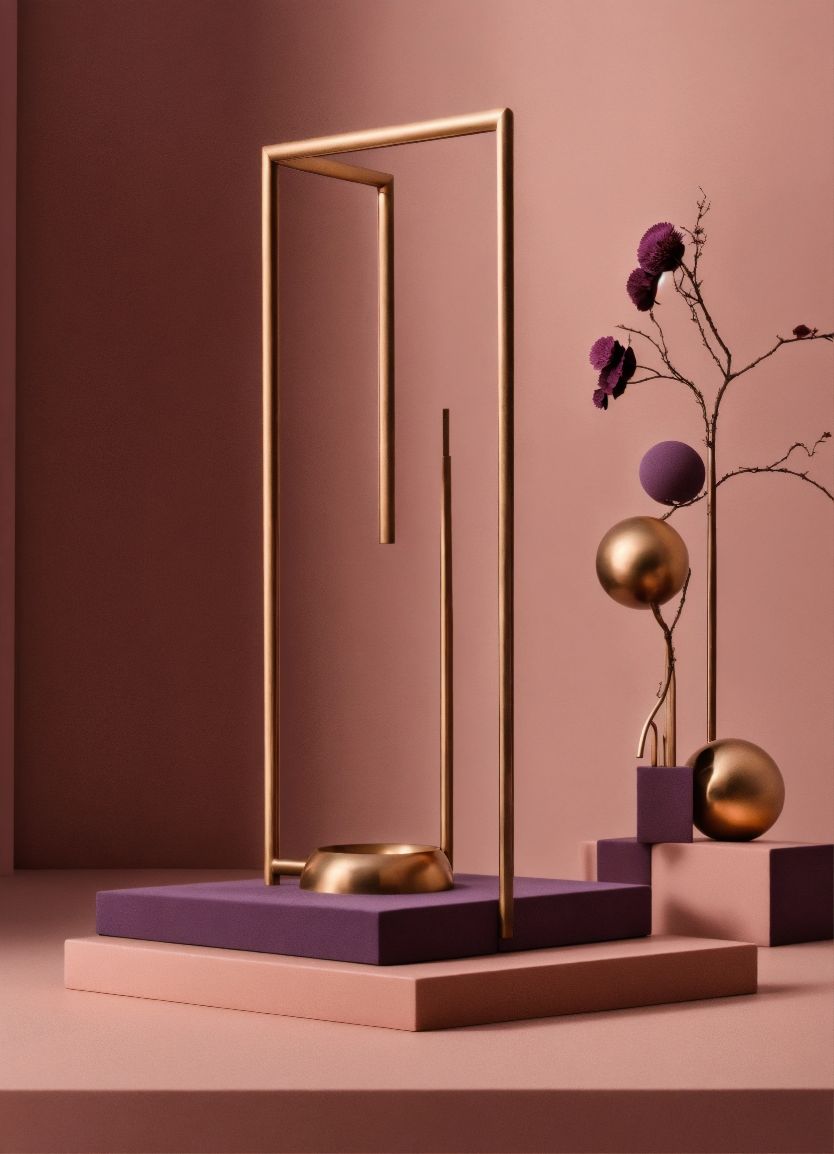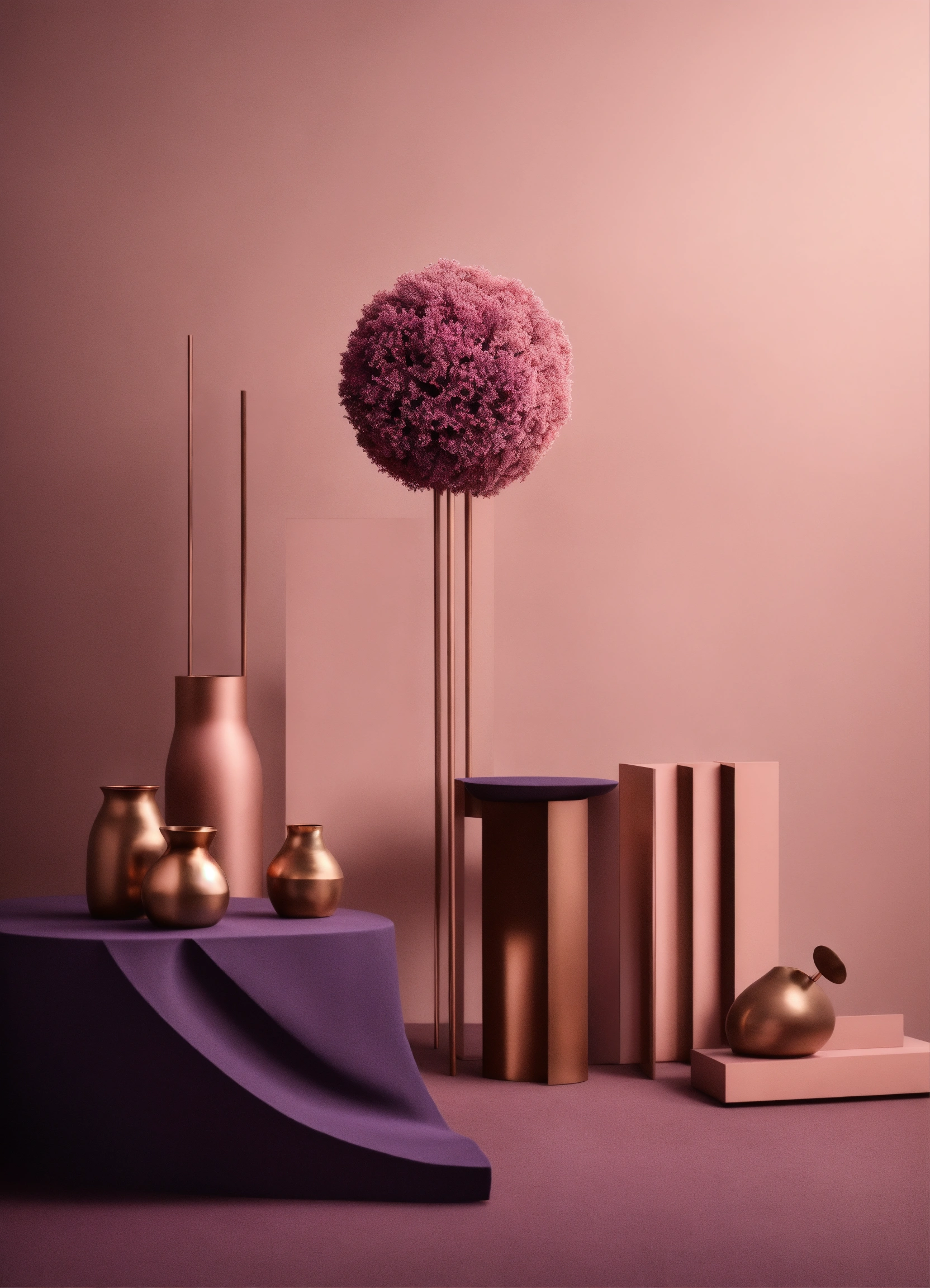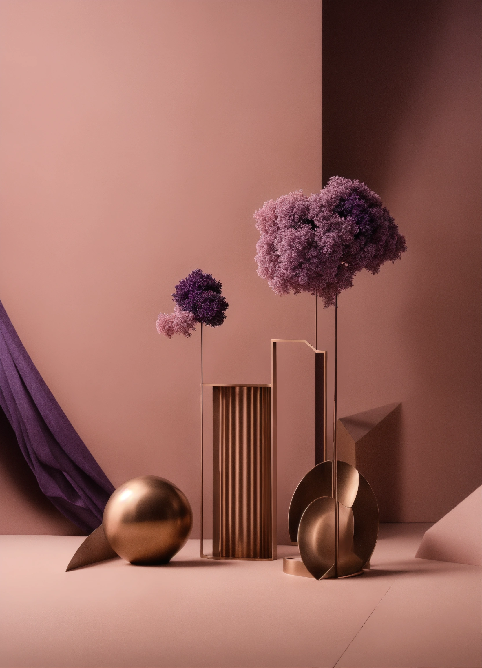 Muted tones of dusty pink and dark purple surreal combination with minimalist compositions, evoking a sense of calmness, bronze casting, simple bare minimalist style 3d compositions, wedding theme.