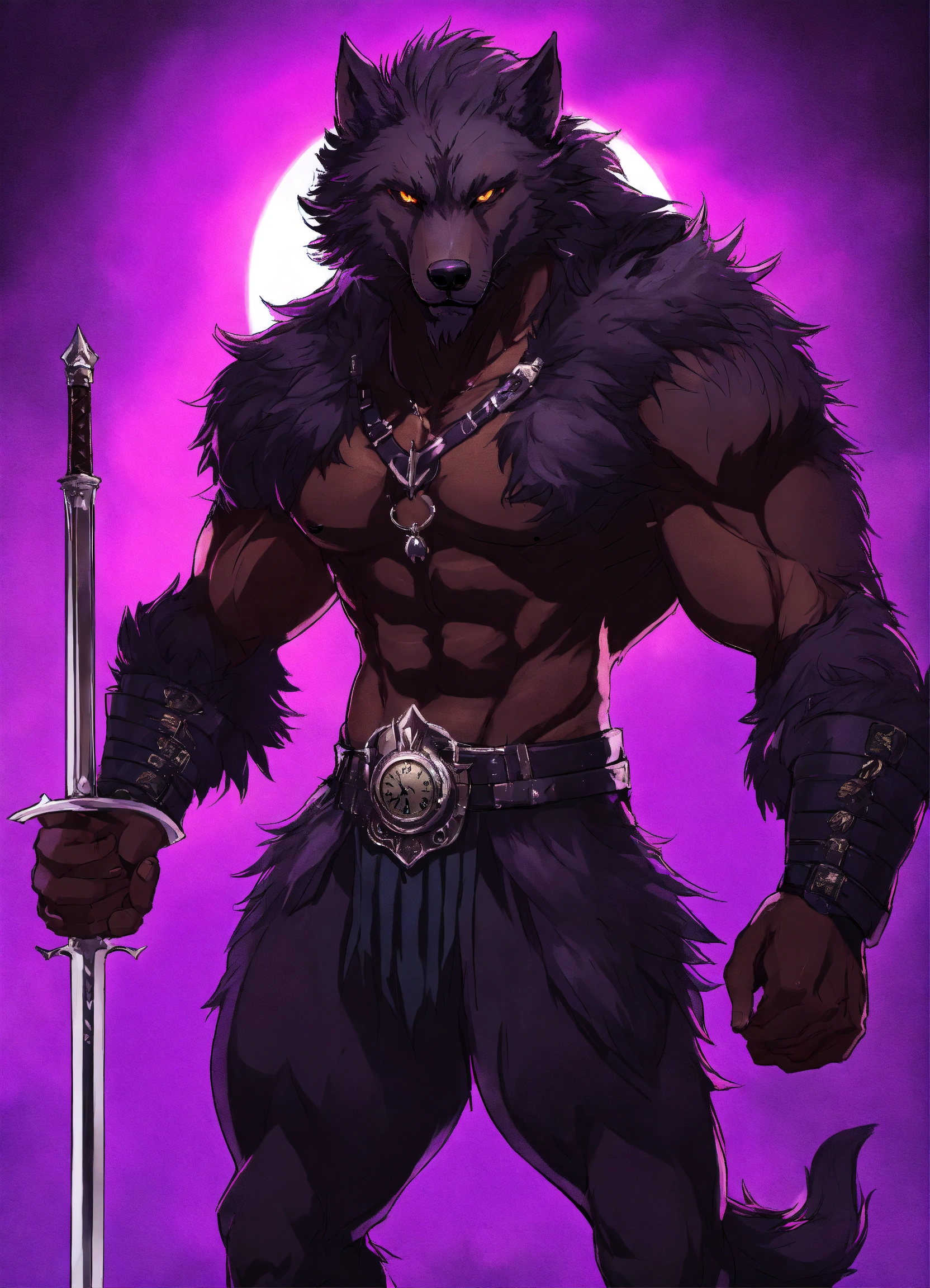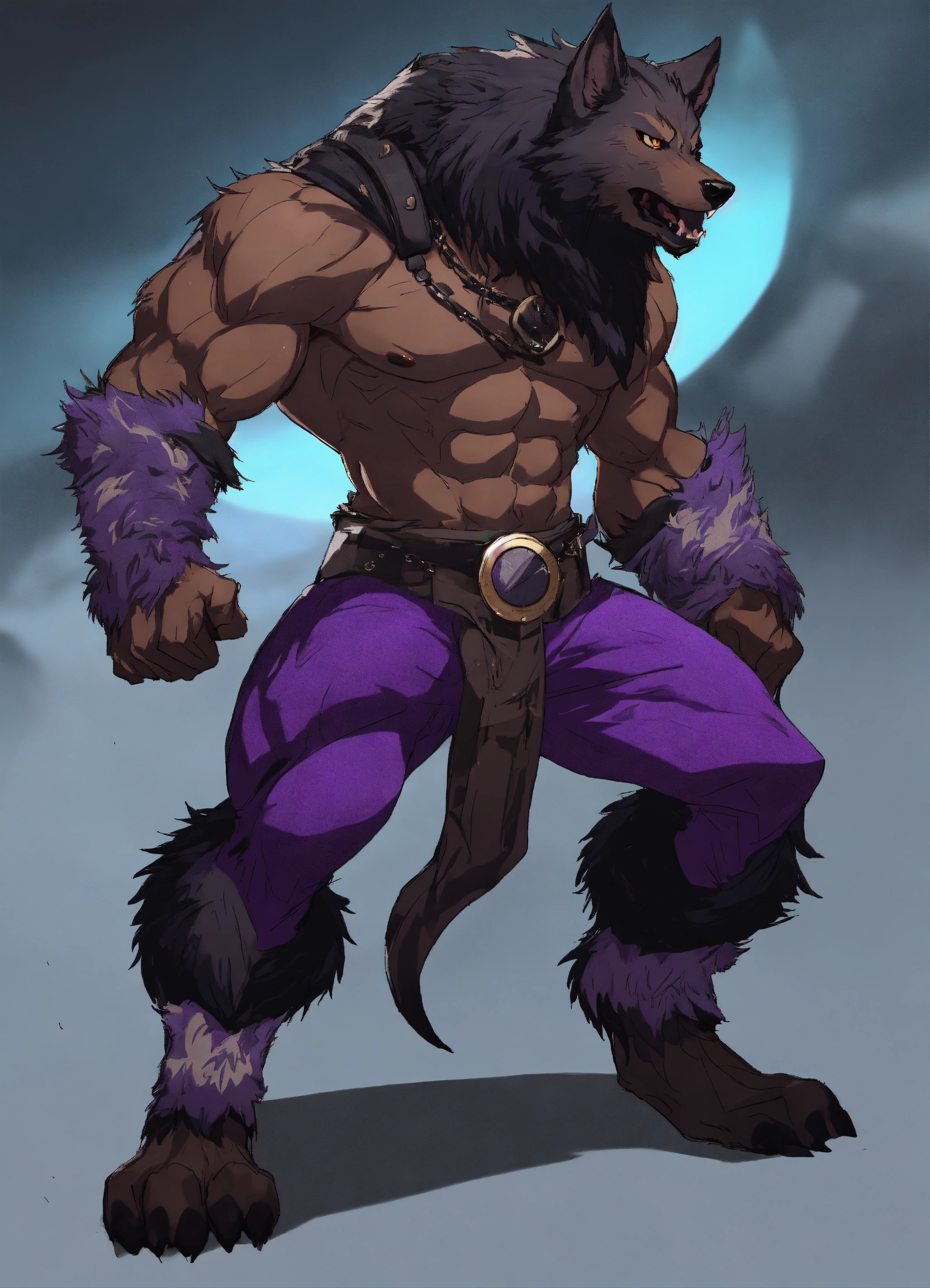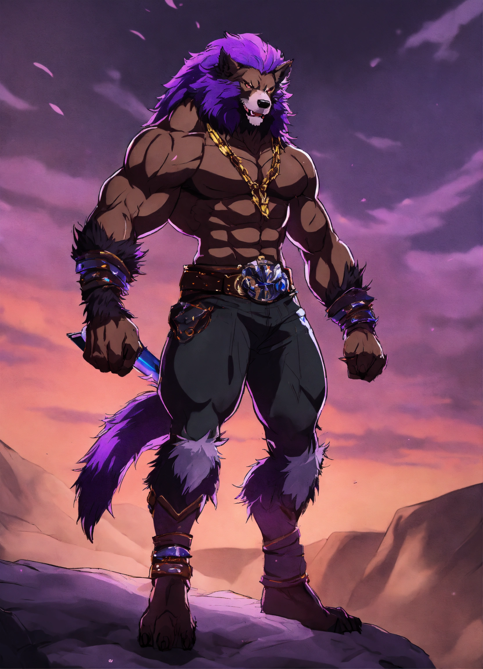 African werewolf anime character, muscular physique, which is styled in a wild black fur and untamed manner, he wears a black and purple clock, anime style, male, werewolf form, werewolf transformation fur in heavy armor with sword in each hand