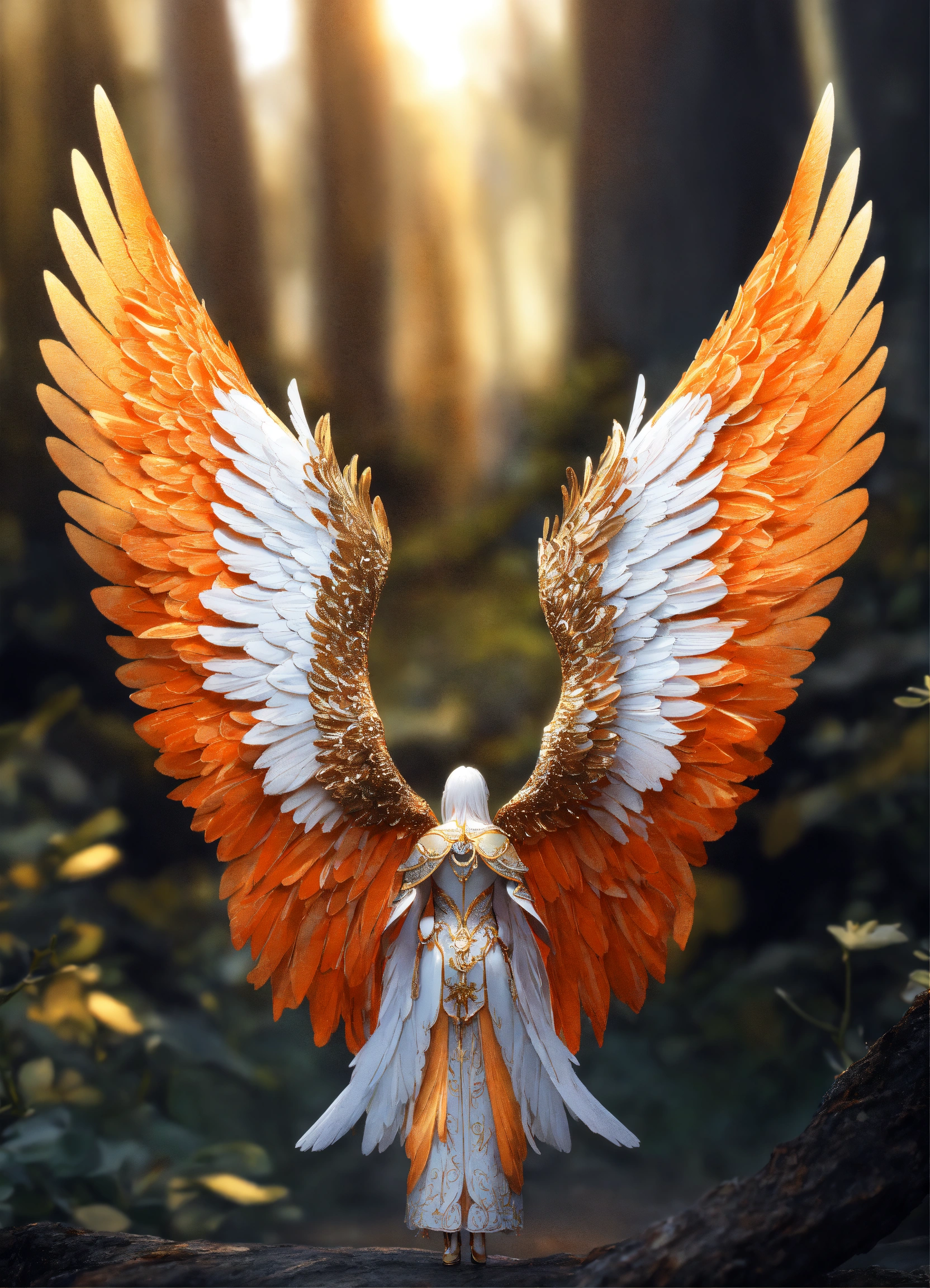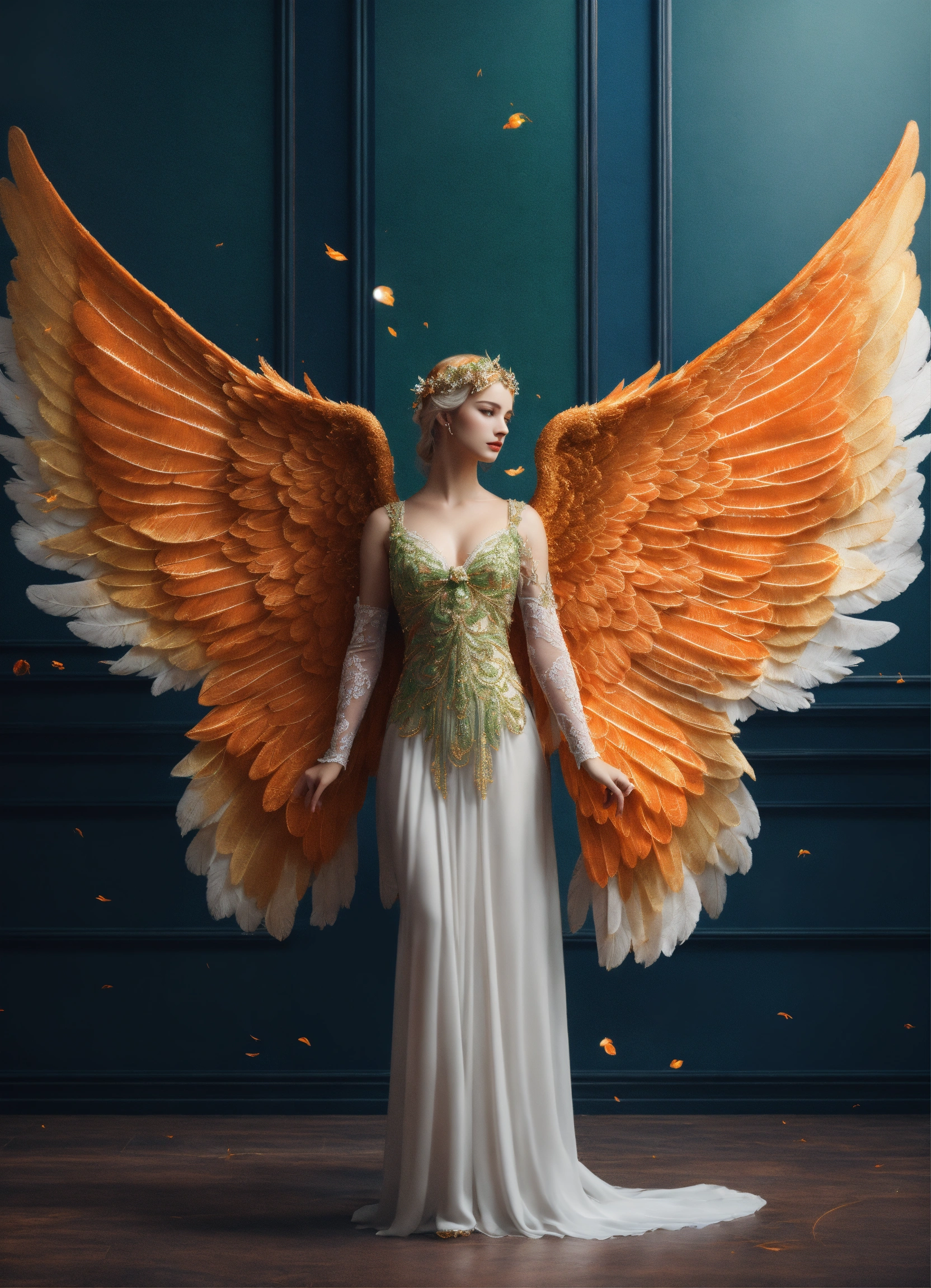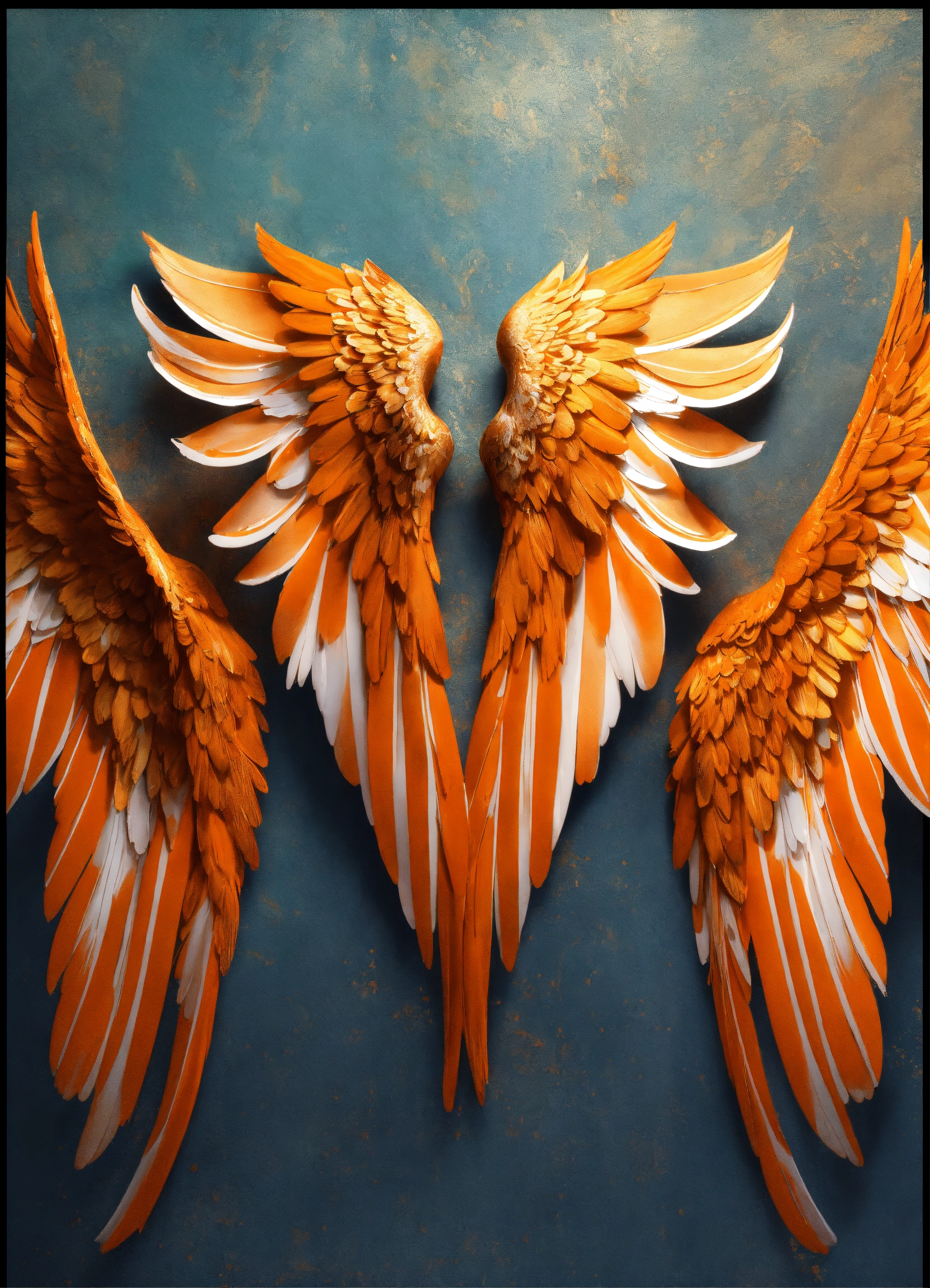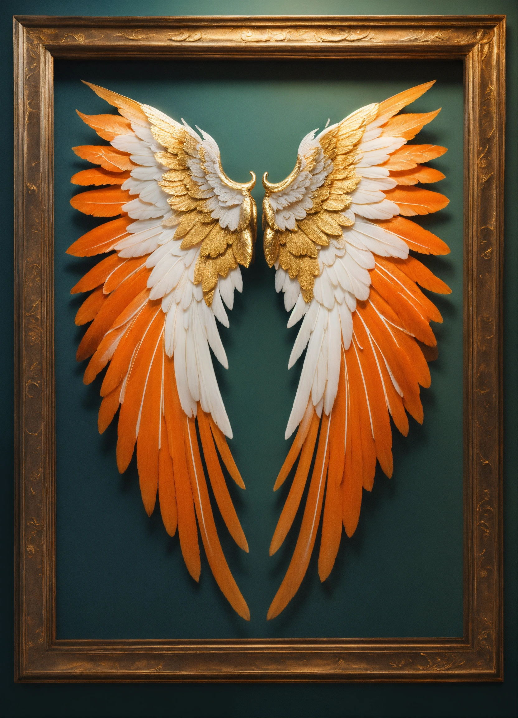 Beautiful and perfect small angel wings in orange with white, detailed and defined and at the same time some golden details. just a pair of small, complete orange wings with white. hyper-detailed and hyper-realistic wings. wings with a slight decoration in shades of green and white. small wings complete both the right wing and the left wing, the background is dark blue, 3d, masterpiece. hd. realism. high resolution. high quality. digital art. 8k