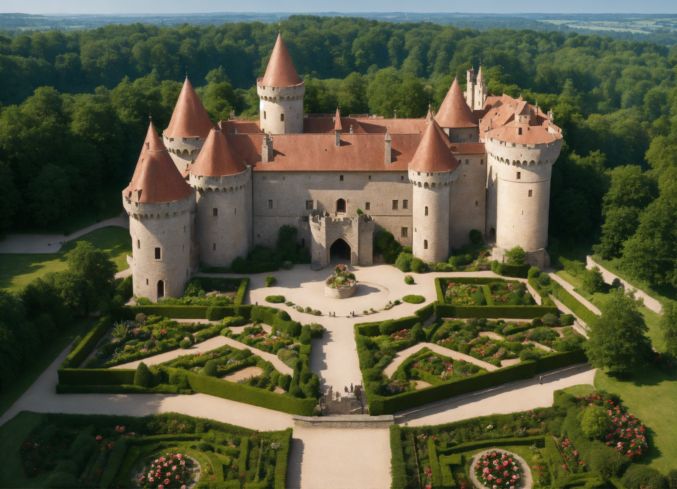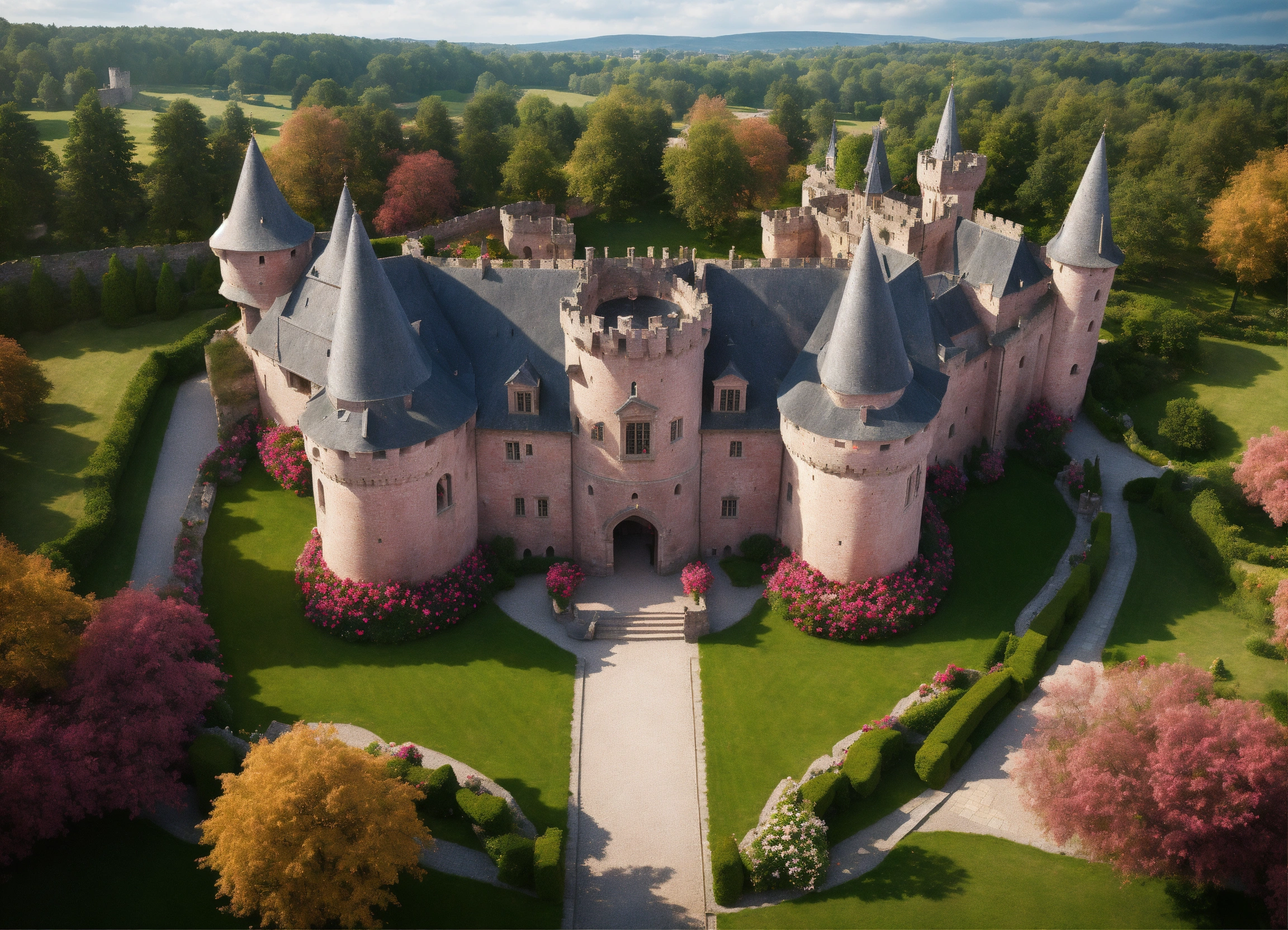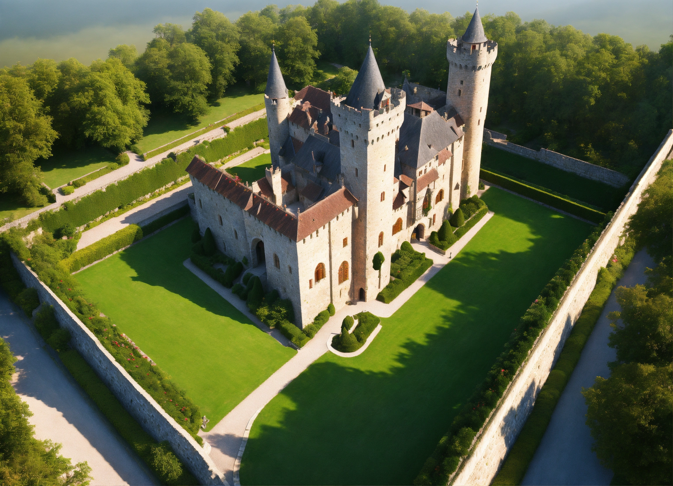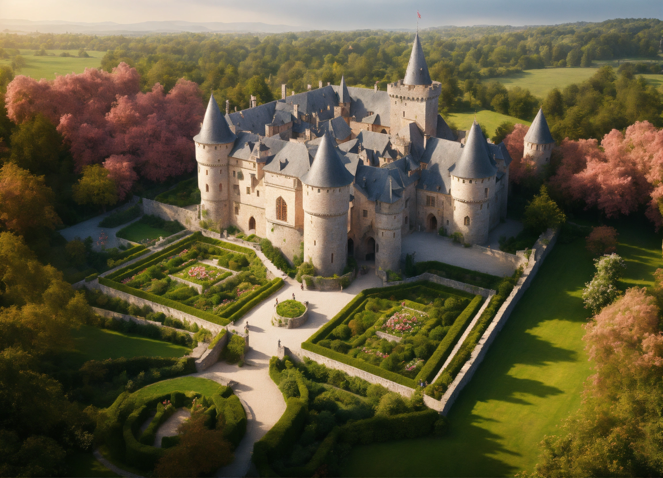 Ultra realistic, photorealistic, bird's eye view of a small medieval castle on a rock, garden terraces with pond, rose bowers, magnificent rose garden and arcades, magnificent fountain, massive crenellated stone wall with a central wall gate and watchtowers surrounds the castle area, with a large inner courtyard and several servants quarters and stables, rose pavillon, pleasure grotto, large forecourt, a wide boulevard leads to the entrance of the castle, extensive rose fields on hilly landscapes in the area around the castle, ultra detailled, focus on castle, sharp focus, sharp, ambient lighting, ksiąz castle in poland