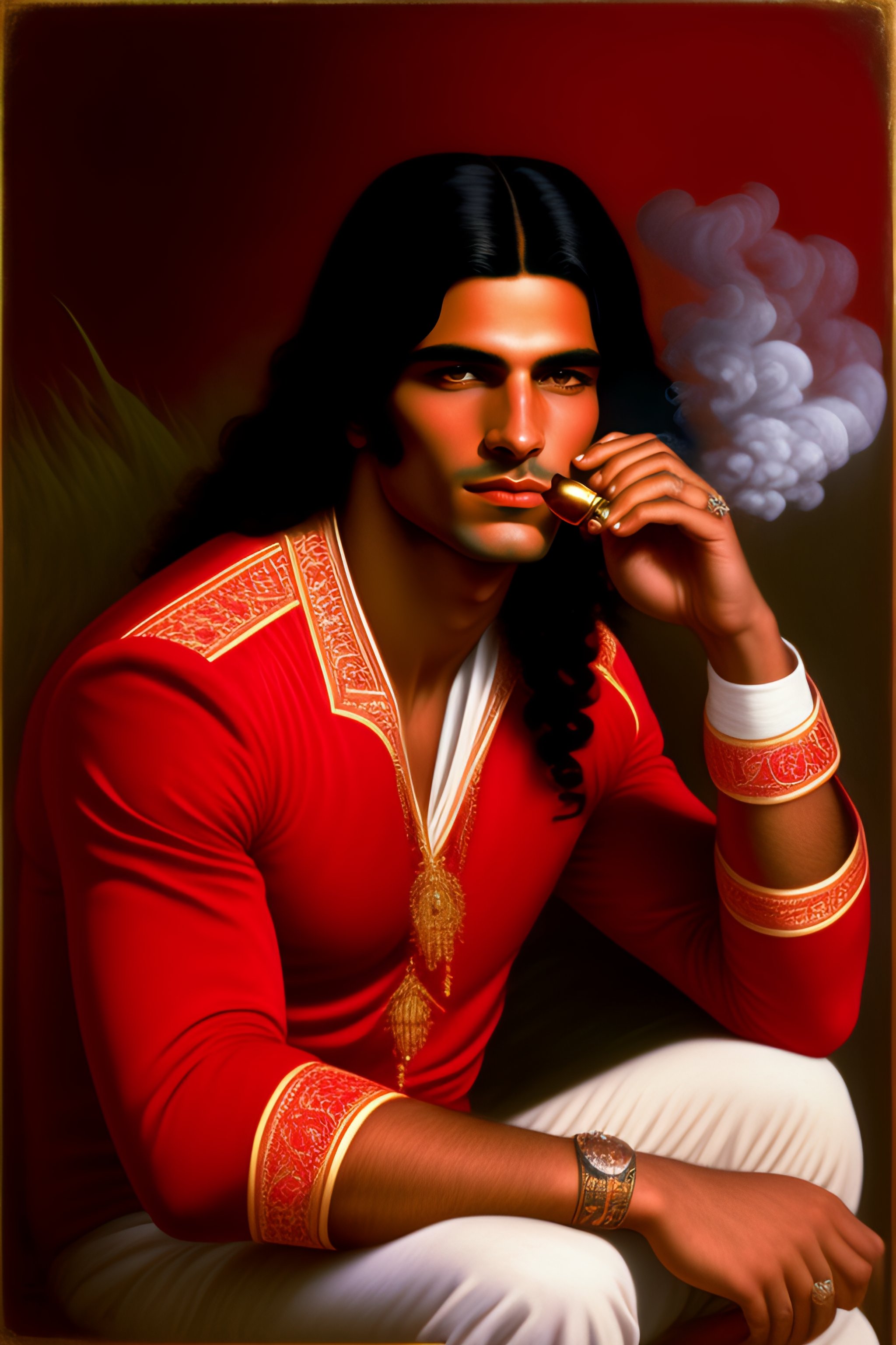 A beautiful romani young man with long black hair in cotton red shirt with white flower patterns and gray trousers and golden double bracelet, smoking a pipe, lying on a haystack, soft details