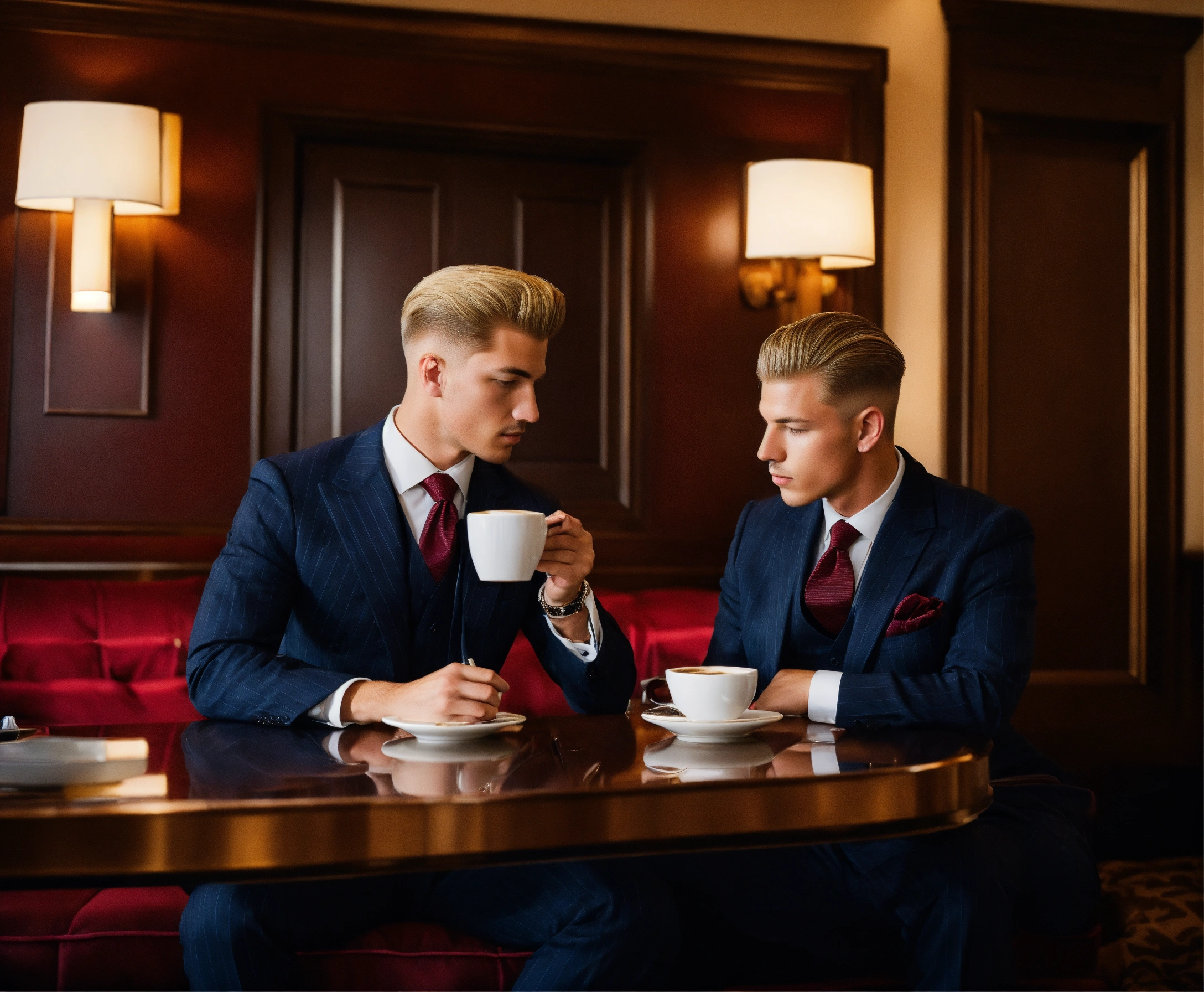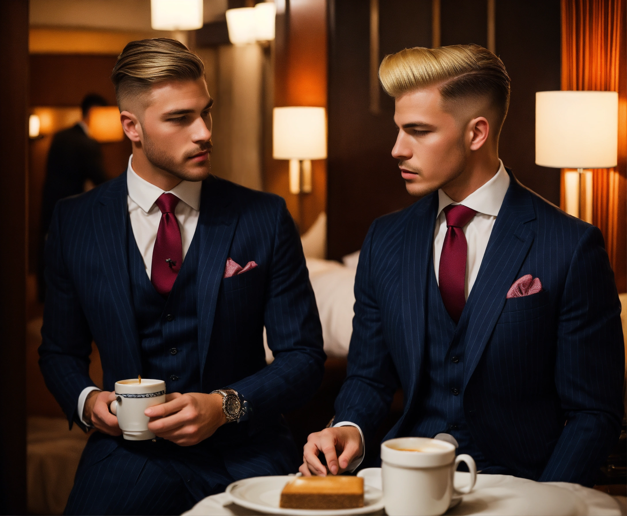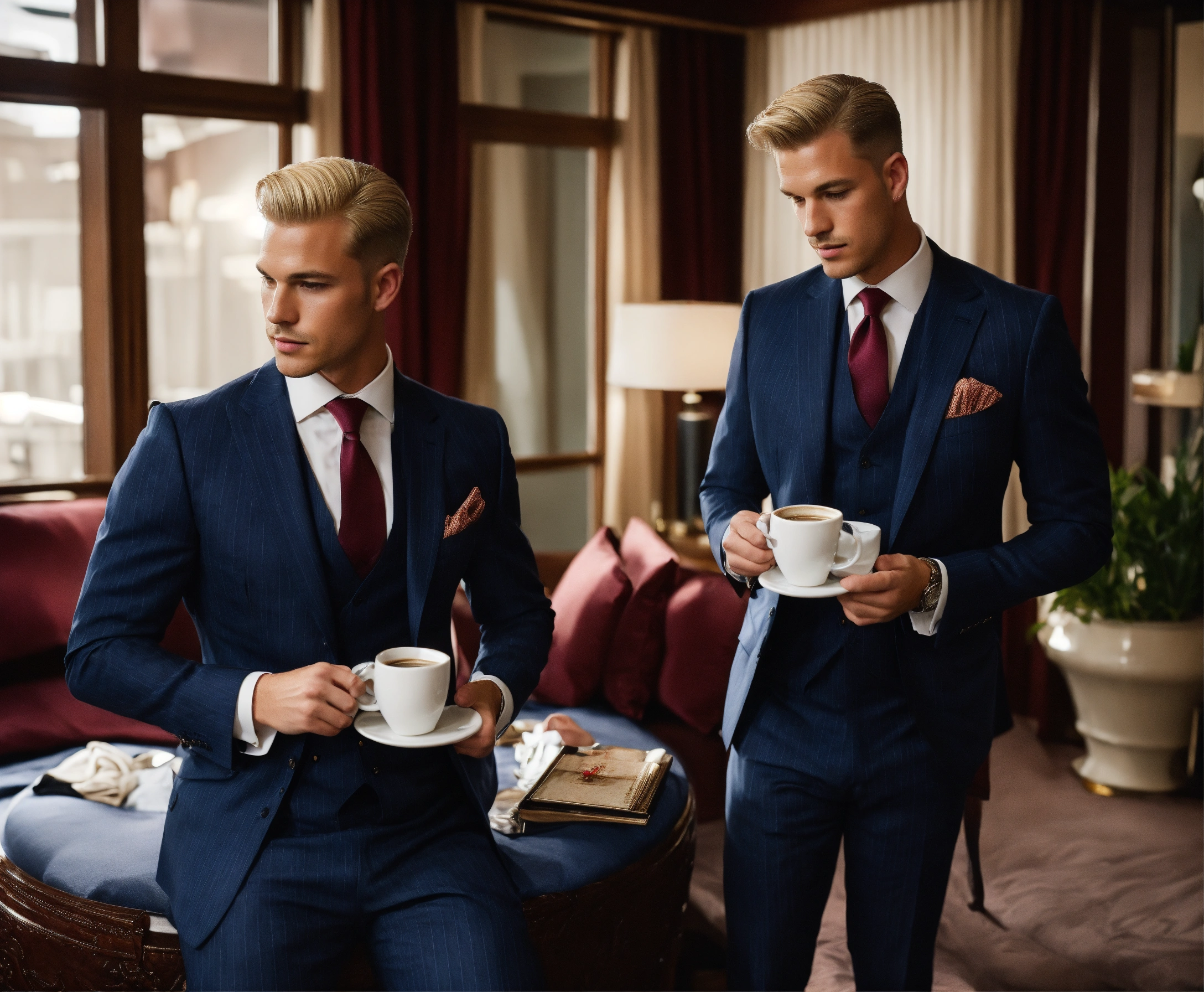Two young gentlemen in navy pinstripe vested suit, burgundy tie, blonde pompadour haircut, drinking coffee in a hotel bedroom