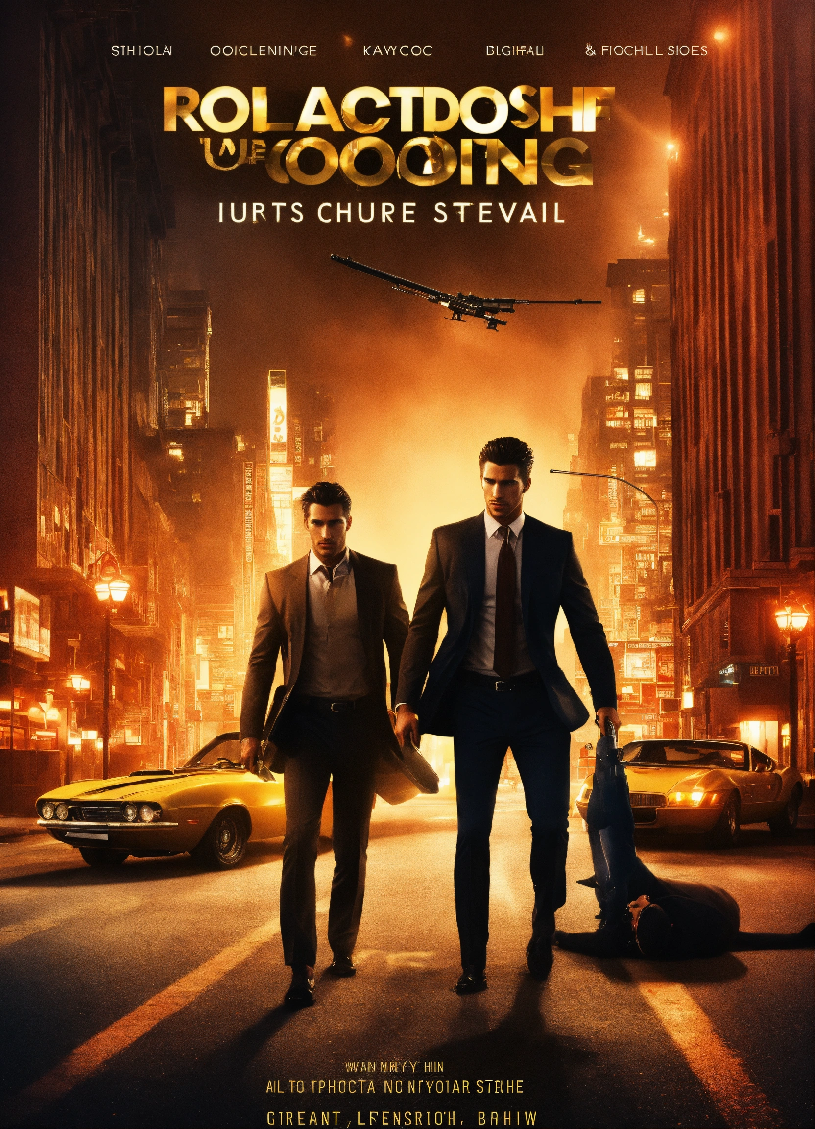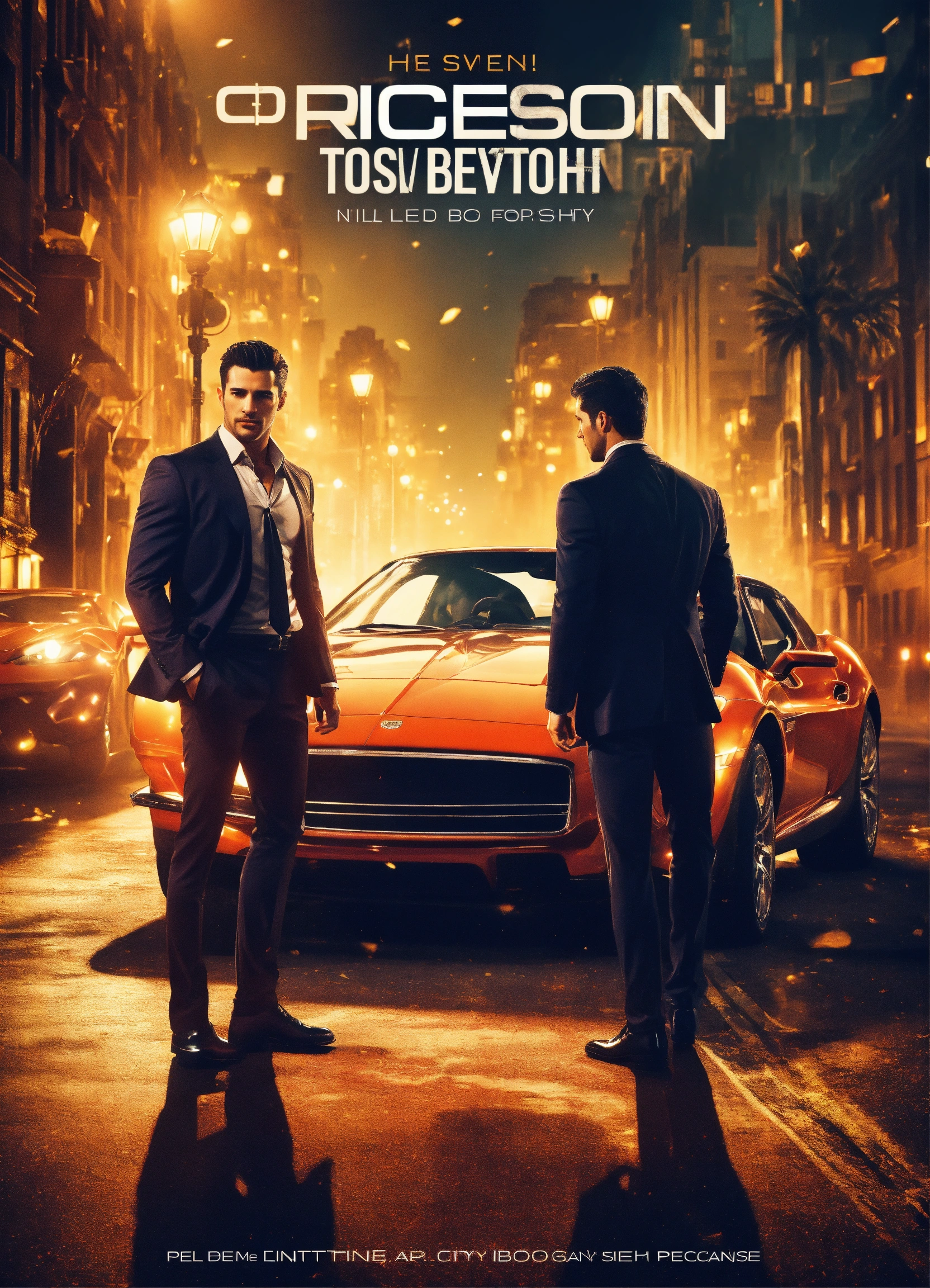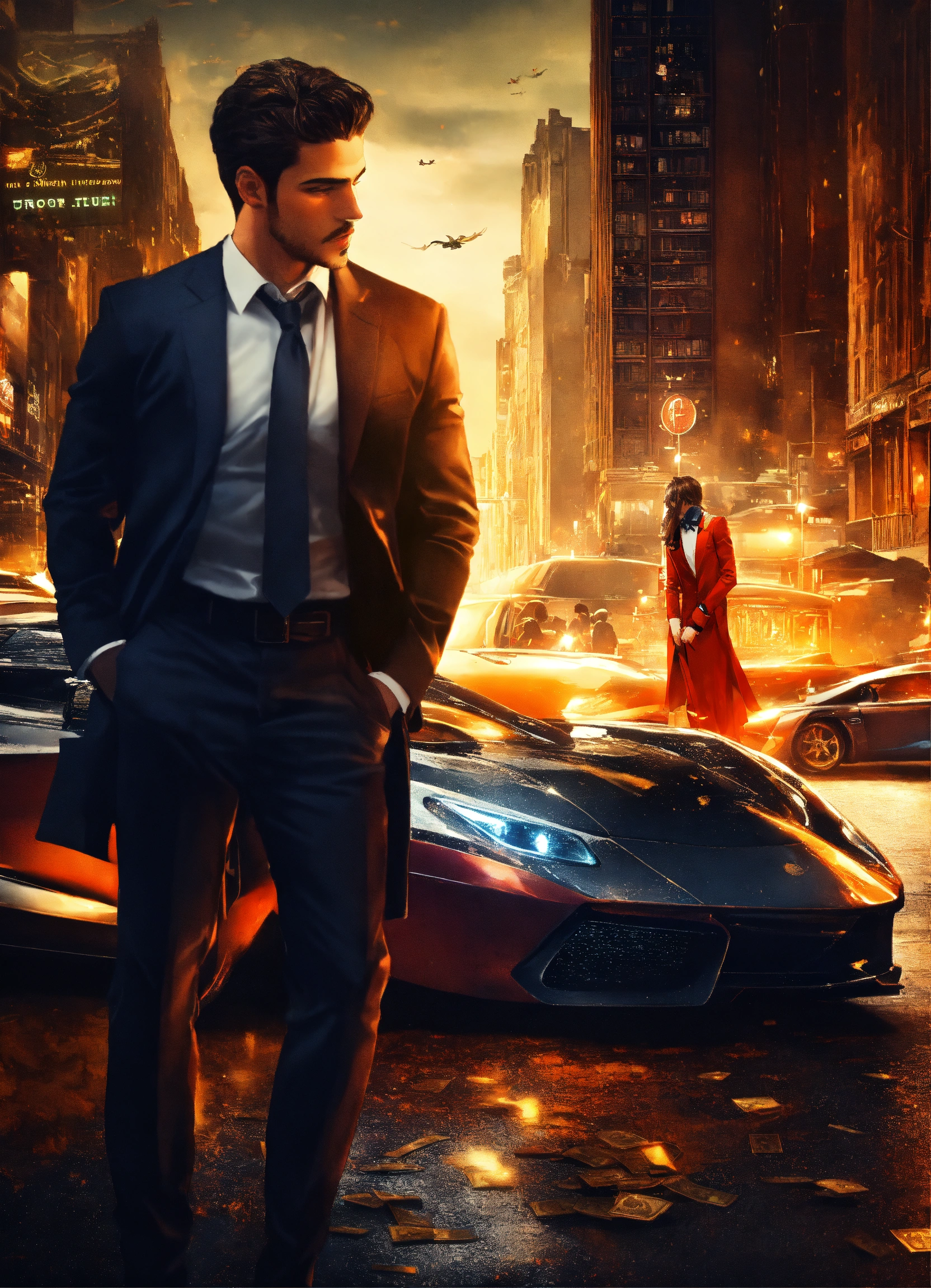 Create a captivating book cover design background that conveys the theme of psychopath, sociopath, romance, betrayal, lust, drugs, wealth, genre of mystery/ phycological thriller, romance . with shadows and lights effect, with exotic sports cars cars with city lights in the background, wealth, money, guns, the story is about two handsome mens obsession with money, control, power, manipulation. the protagonists have everything to lose if found, and jail for both. the protagonists are wealthy, cultured, unscrupulous. and one is tormented by his psychological battle of wanting to be good versus his greed and crystallized personality disorder. he falls in love with a beautiful, inquisitive artist who begins to question where all his money and belongings come from. she hires a private detective agency who become hot on his trail - and he begins to hunt the hunters. many twists, betrayals and surprises as the chase continues. two handsome men, face at the top, scenes below, focus face