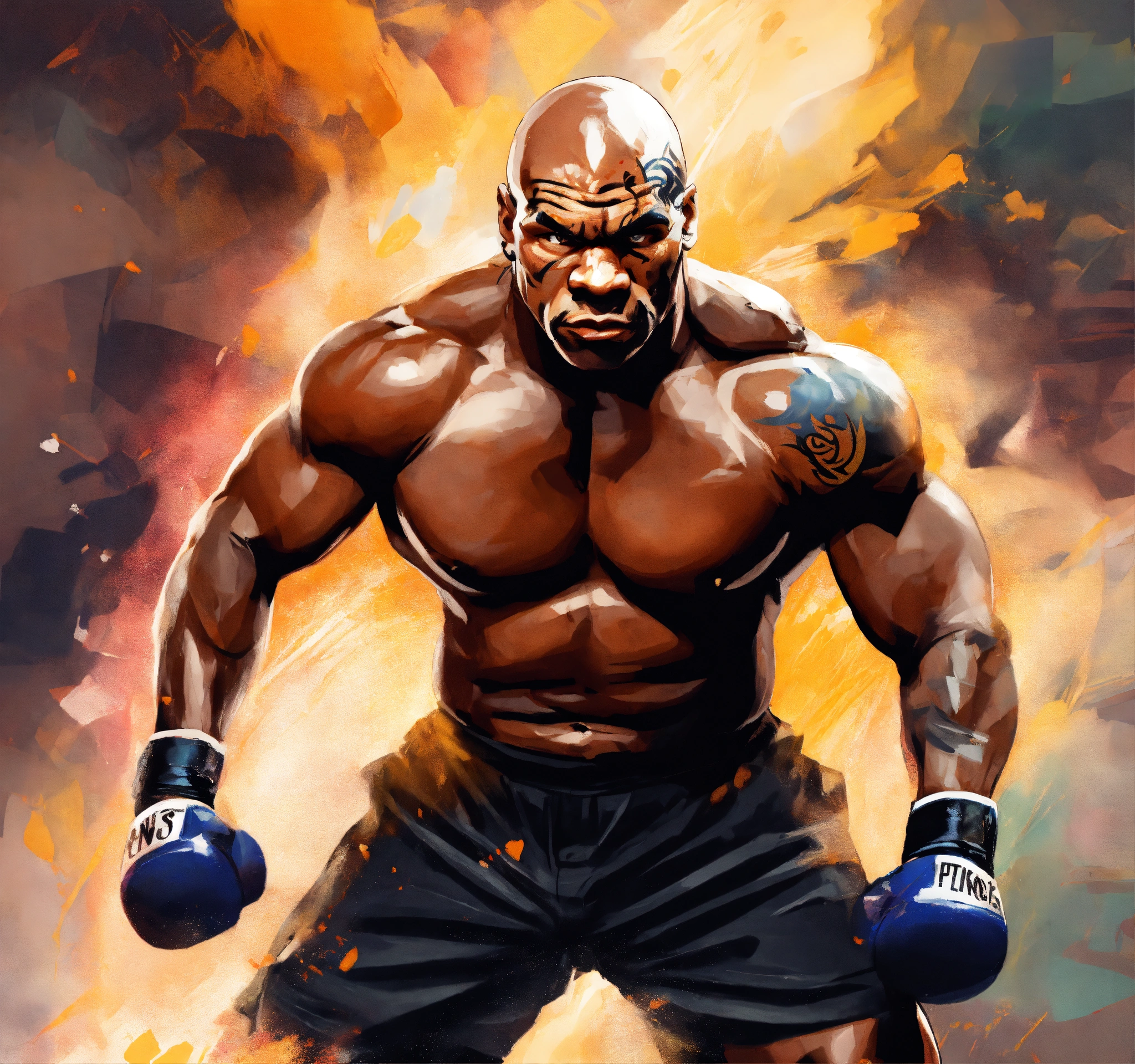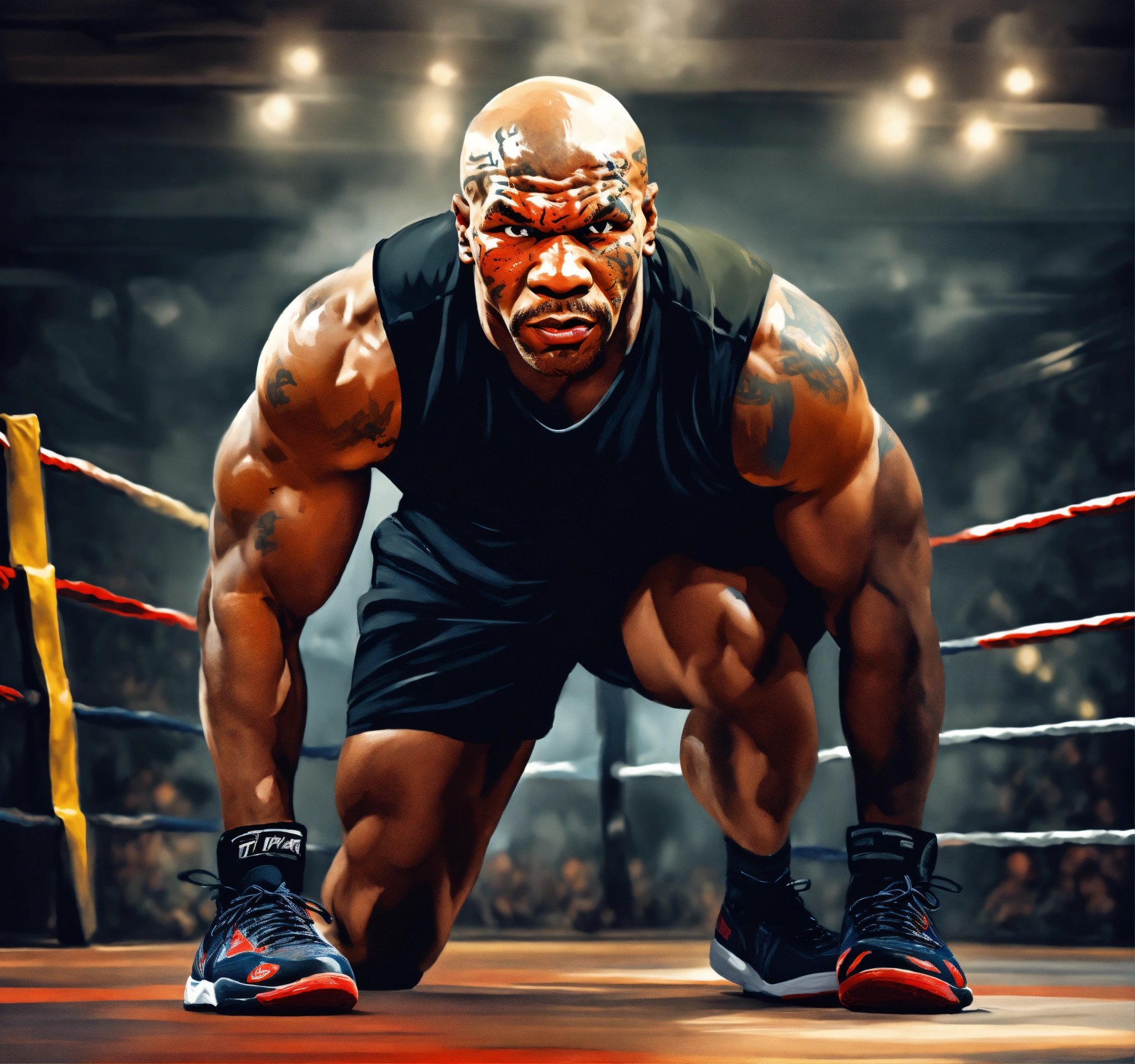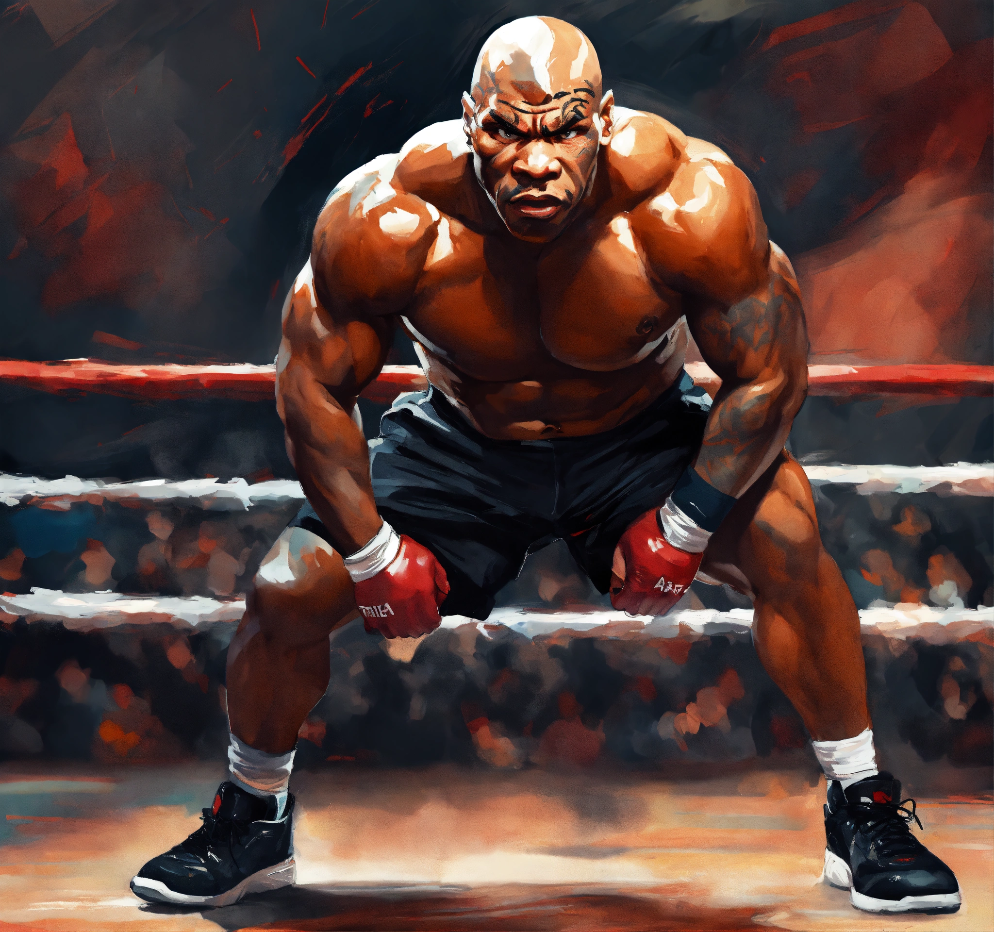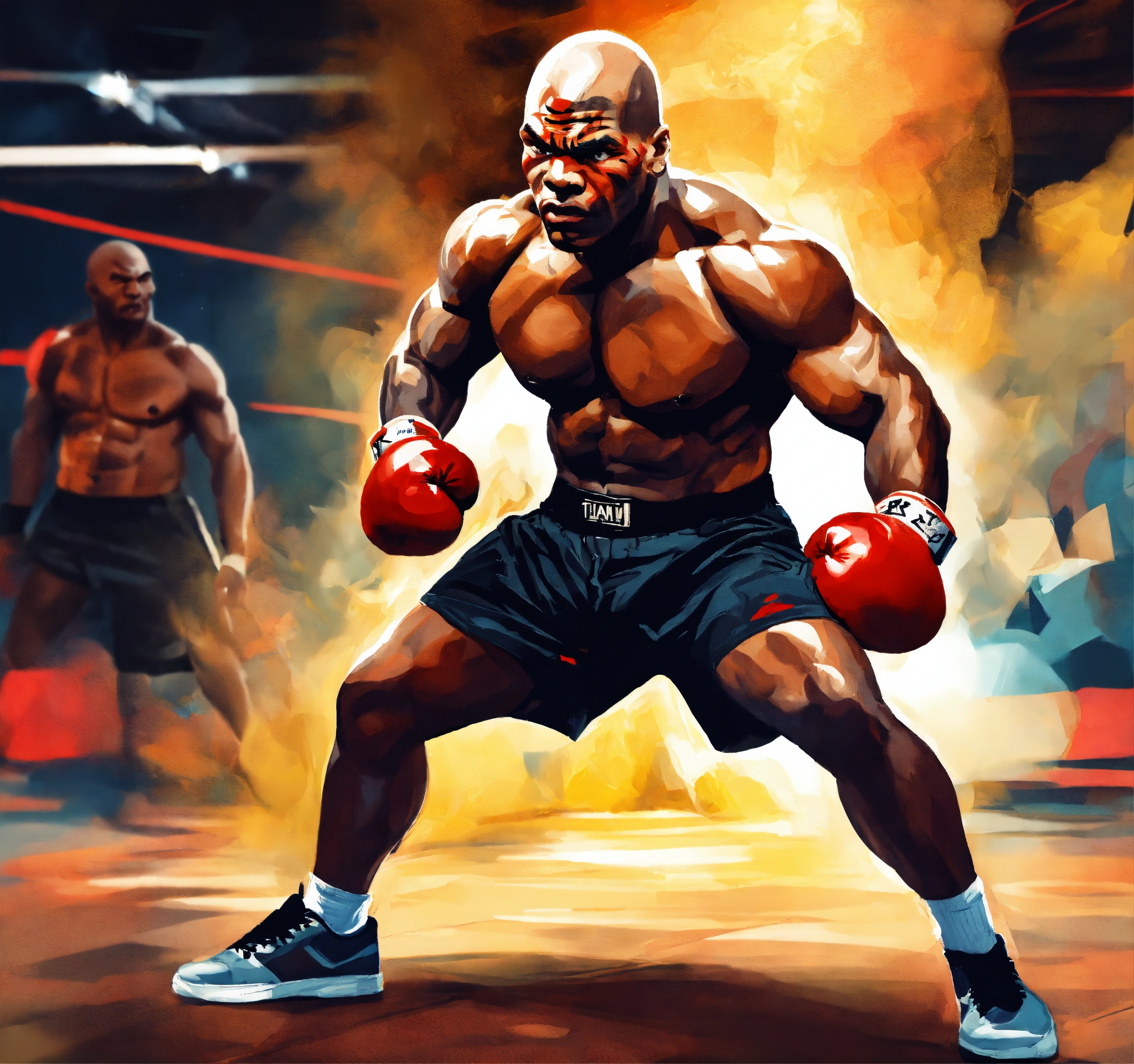 Digital portrait of an anger muscular mike tyson with a bald head, in black shorts.black shoes no socks fighting full body, a abstrack background. a peekaboo fighting style