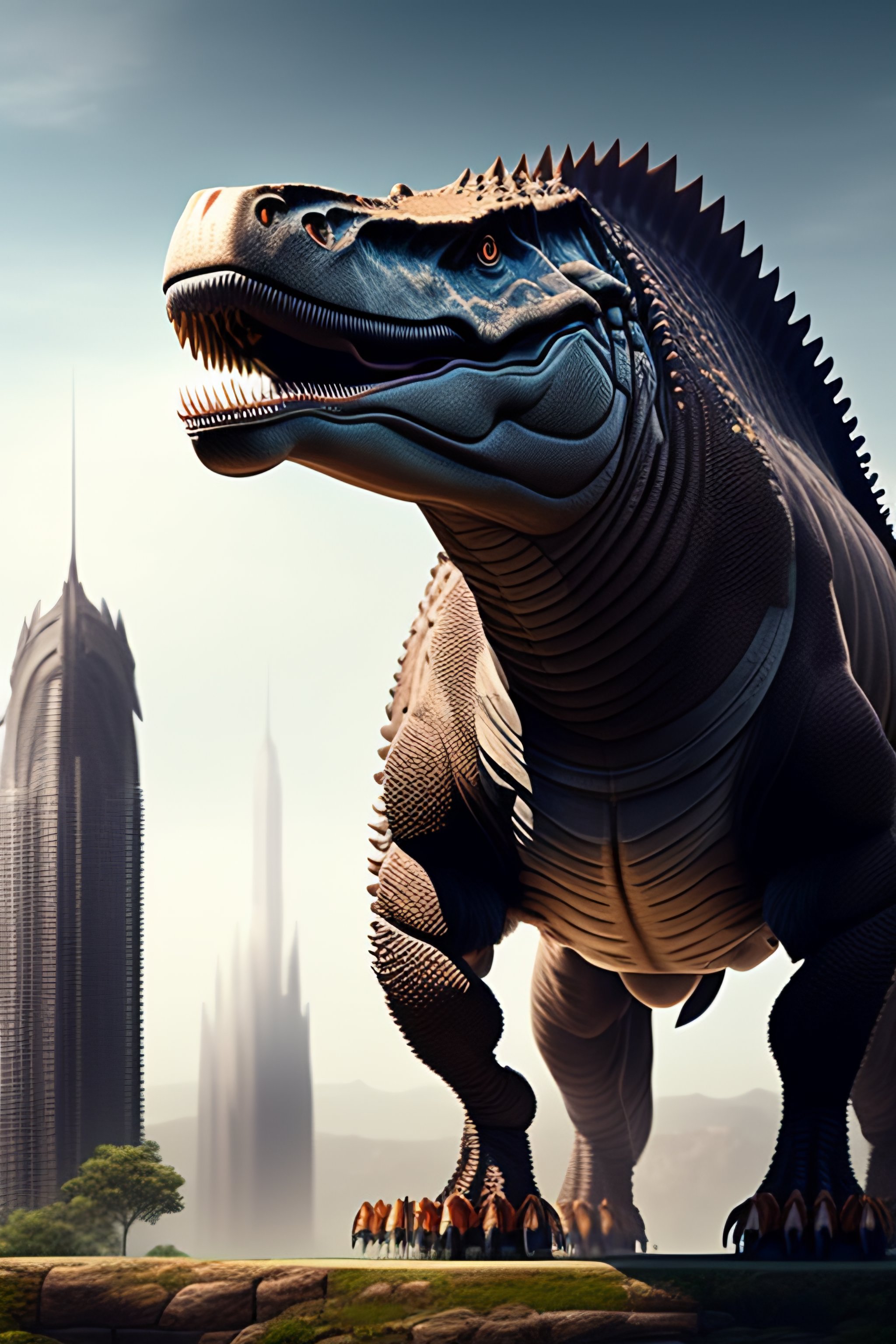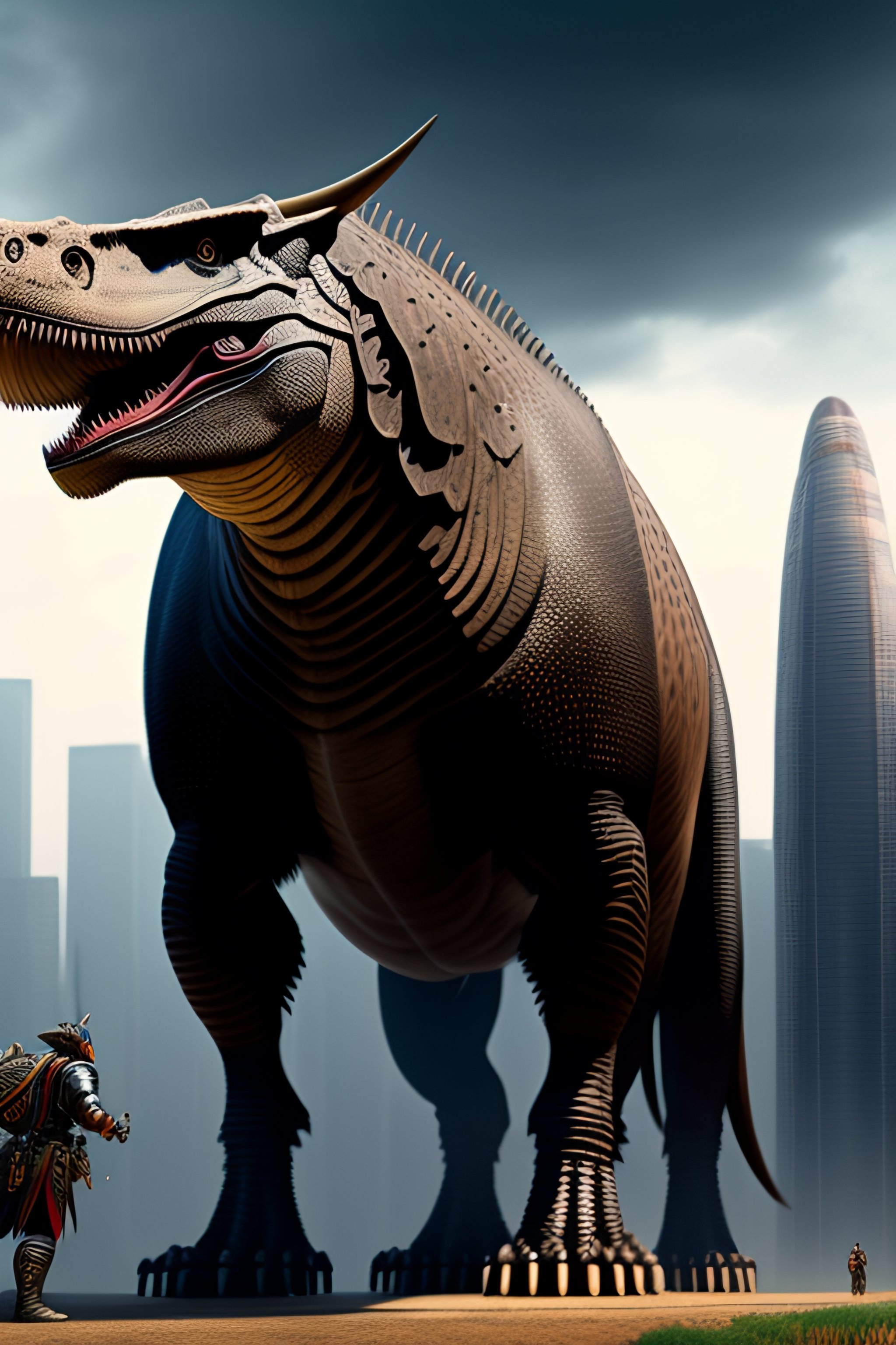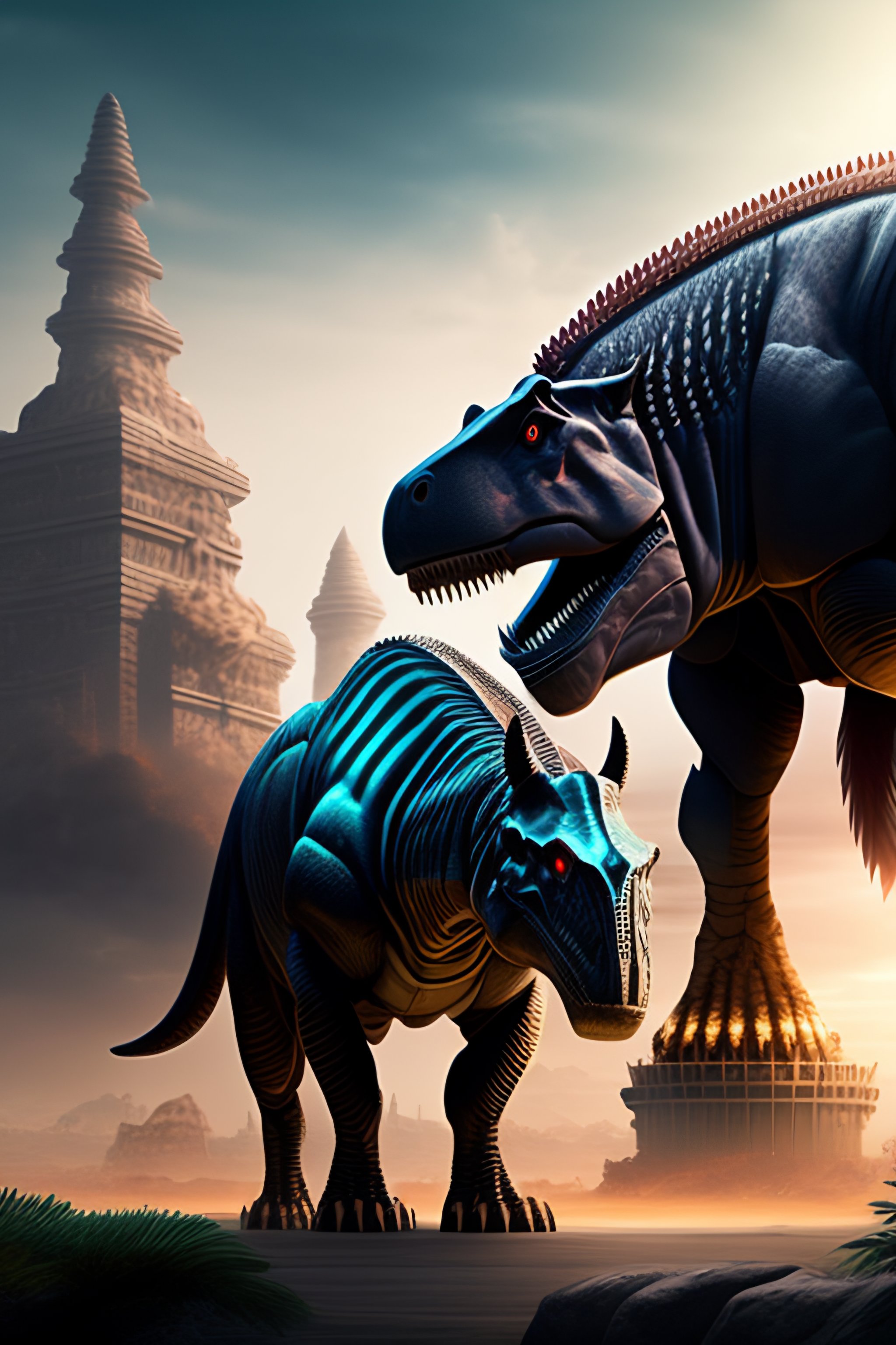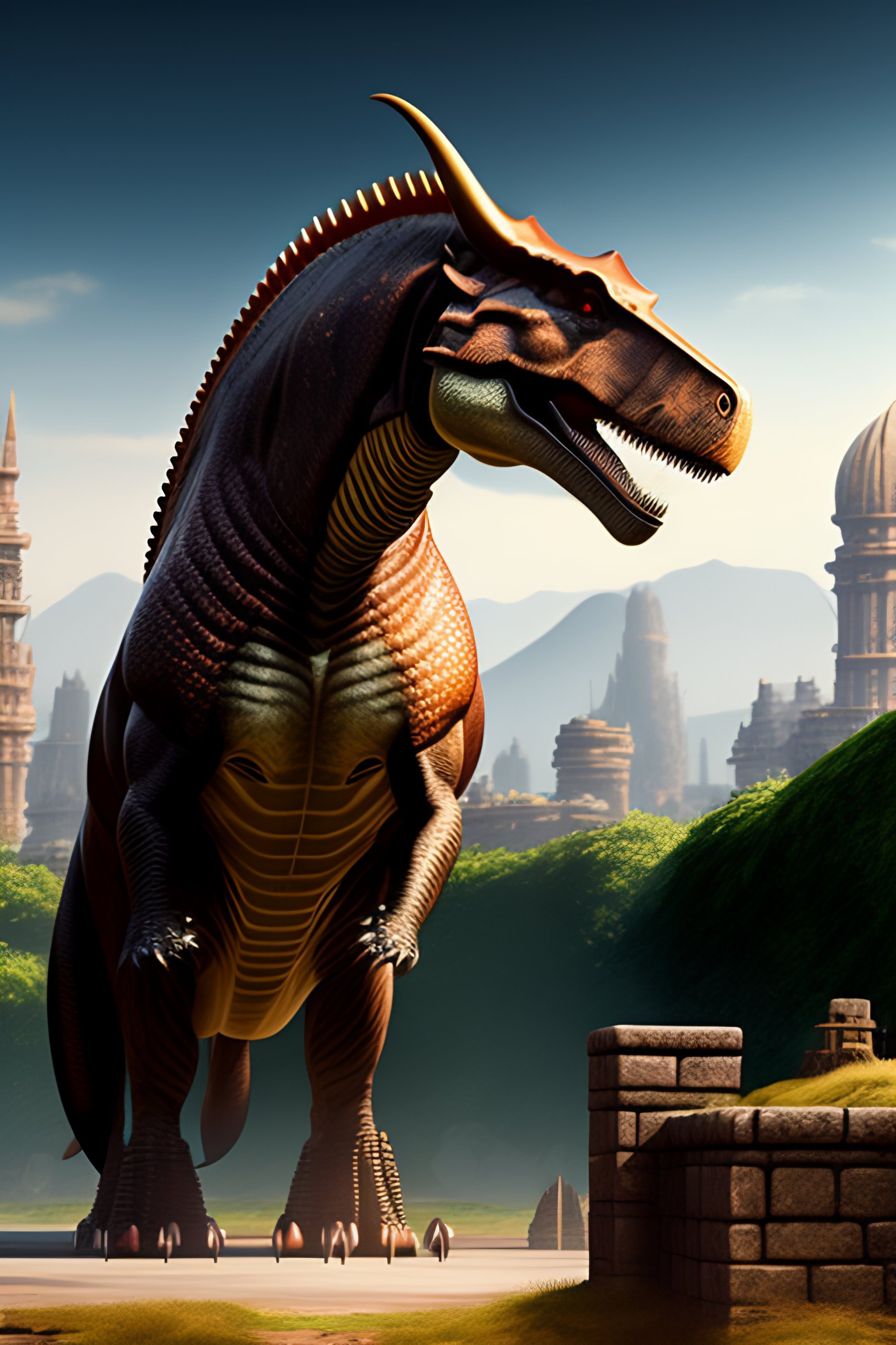 A male armoured humanoid tyrannosaurus rex standing looking over of a massive ancient city