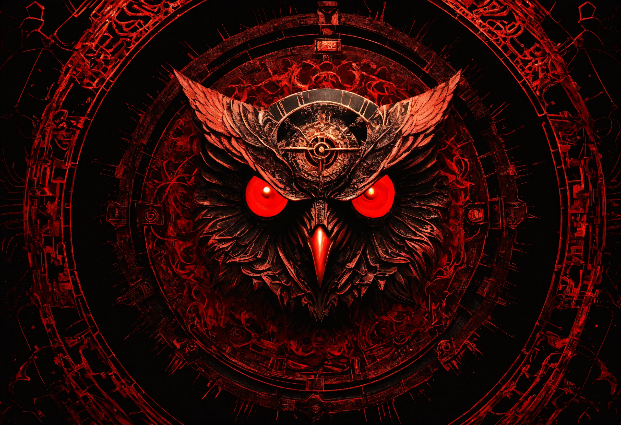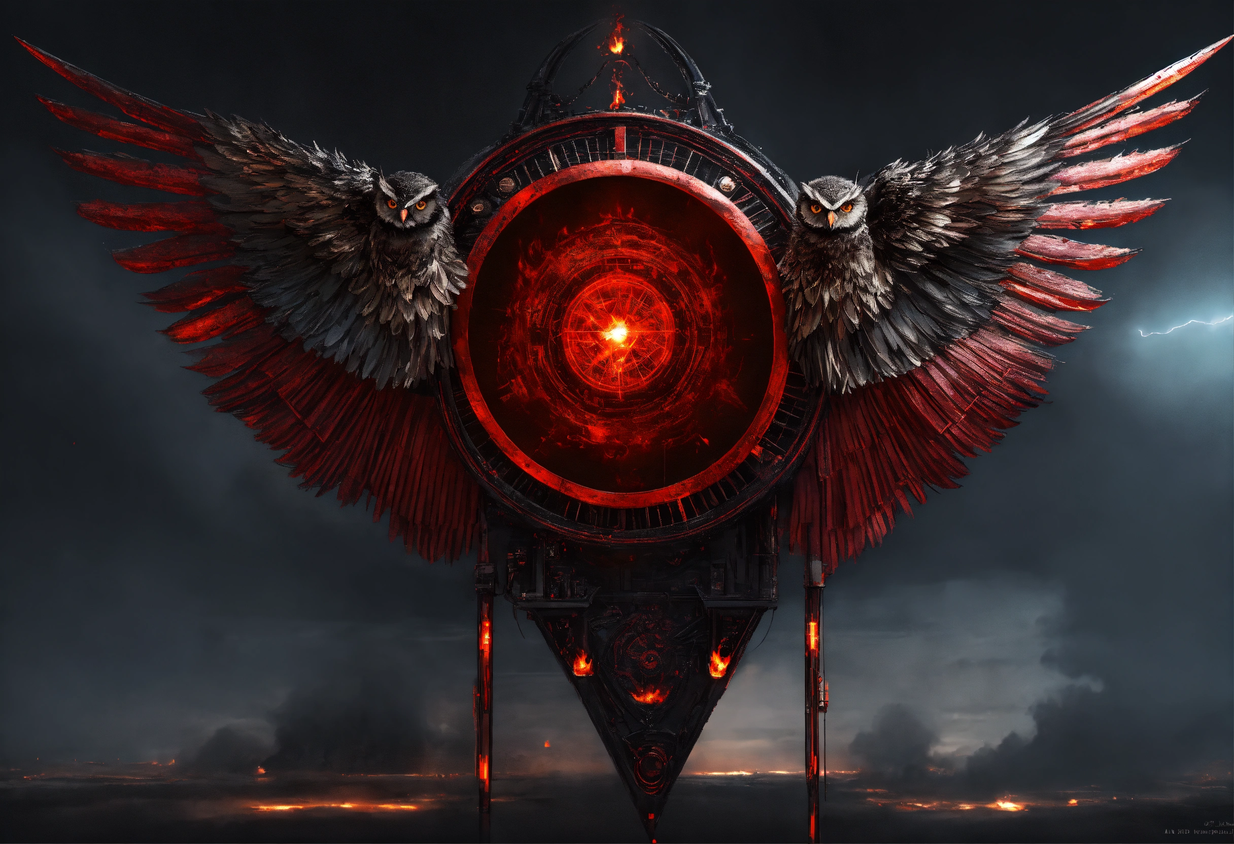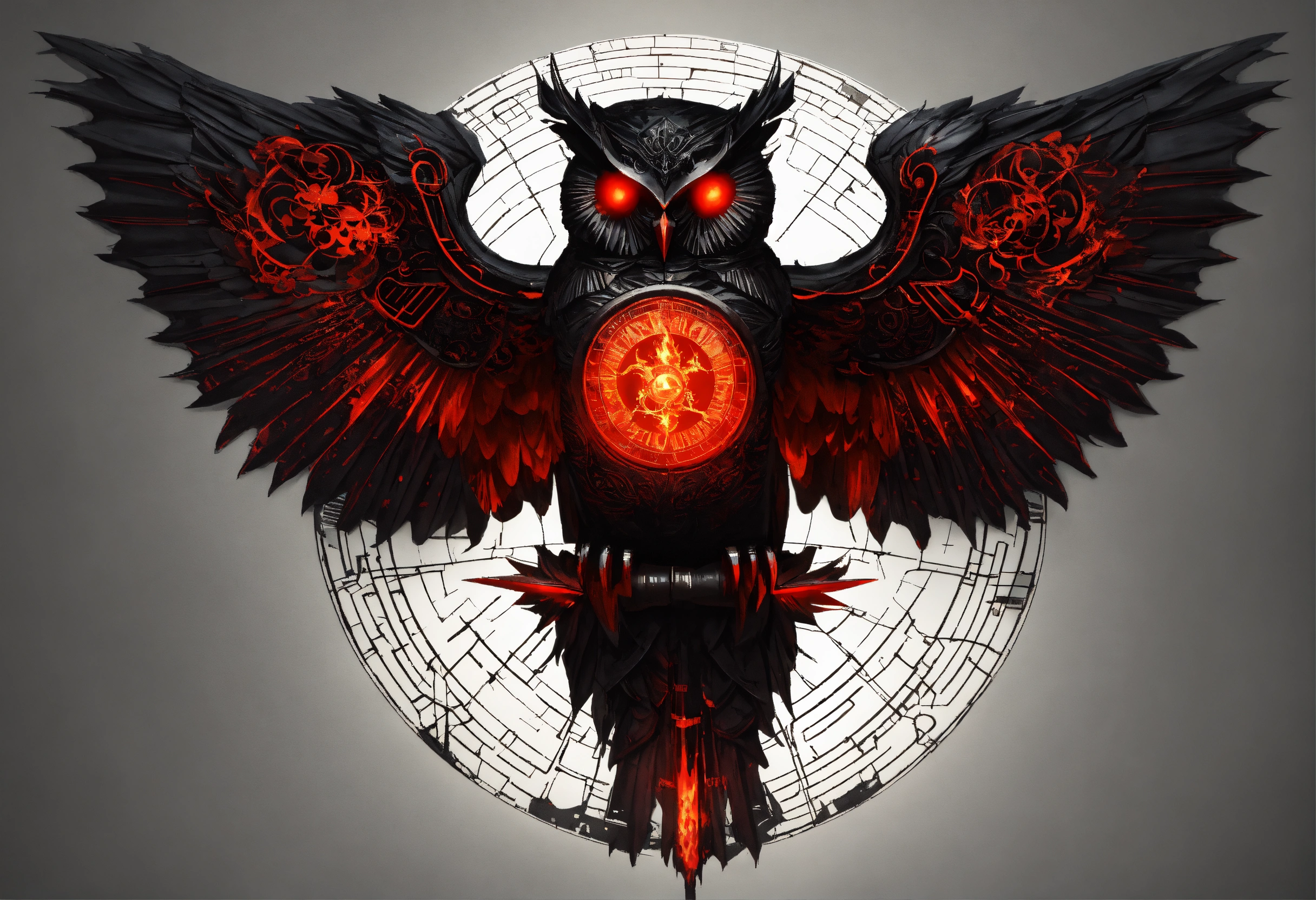 Dark evil black, red and black digital occultic sigil owl symbolic, emblem symbol, intricate detail, hyper digital, futuristic, amazing design, inspired by quantum physics cybernetic, divine, hyper futuristic, lucifer is the light bearer, christ is infinite, led, ominous, artistic, incredibly detailed, 5 dimensional, mischievous personified, mostly black, ancient gods, angular, high technology, super powerful alien technology, fire and flames, gates of hell
