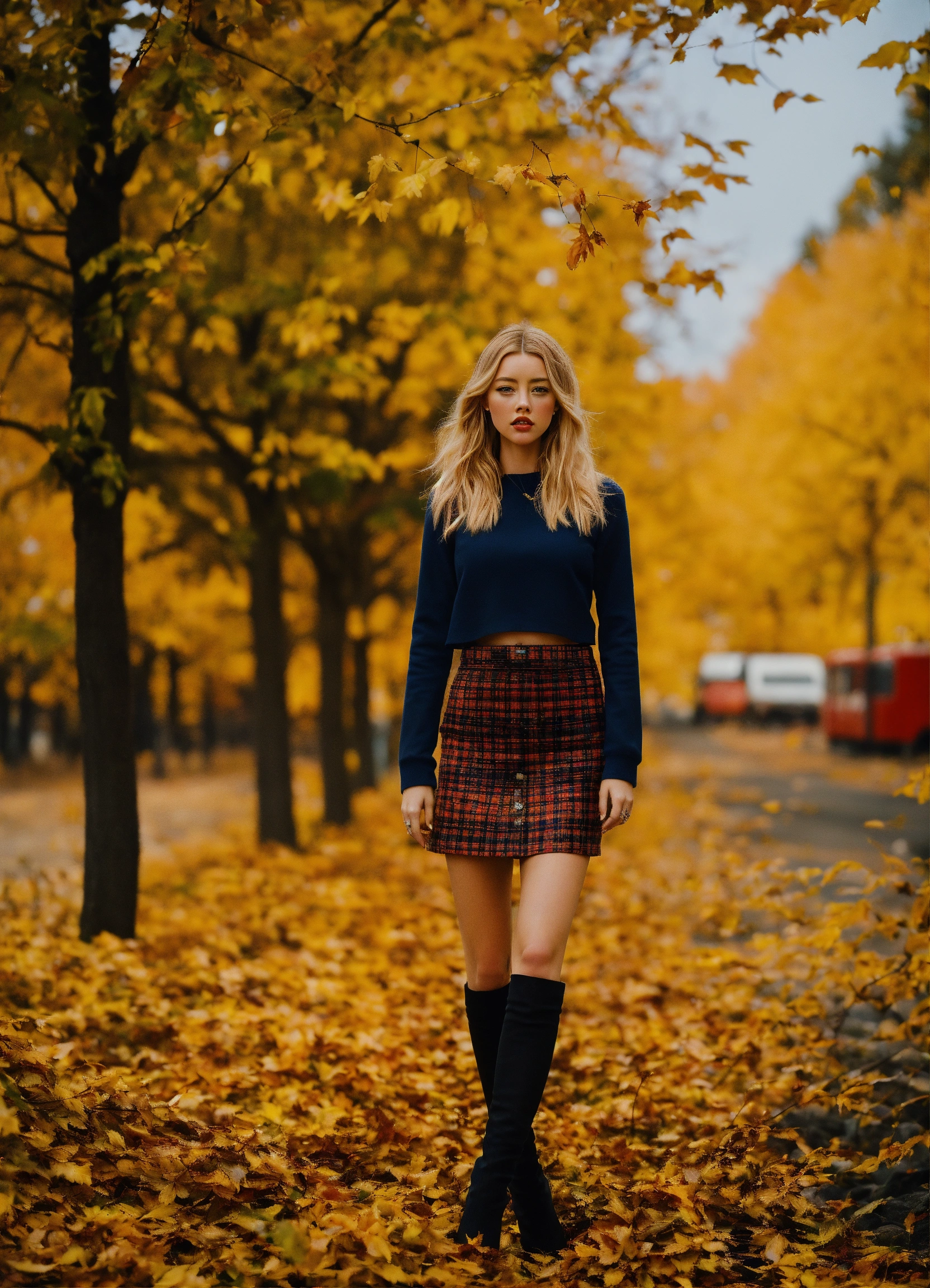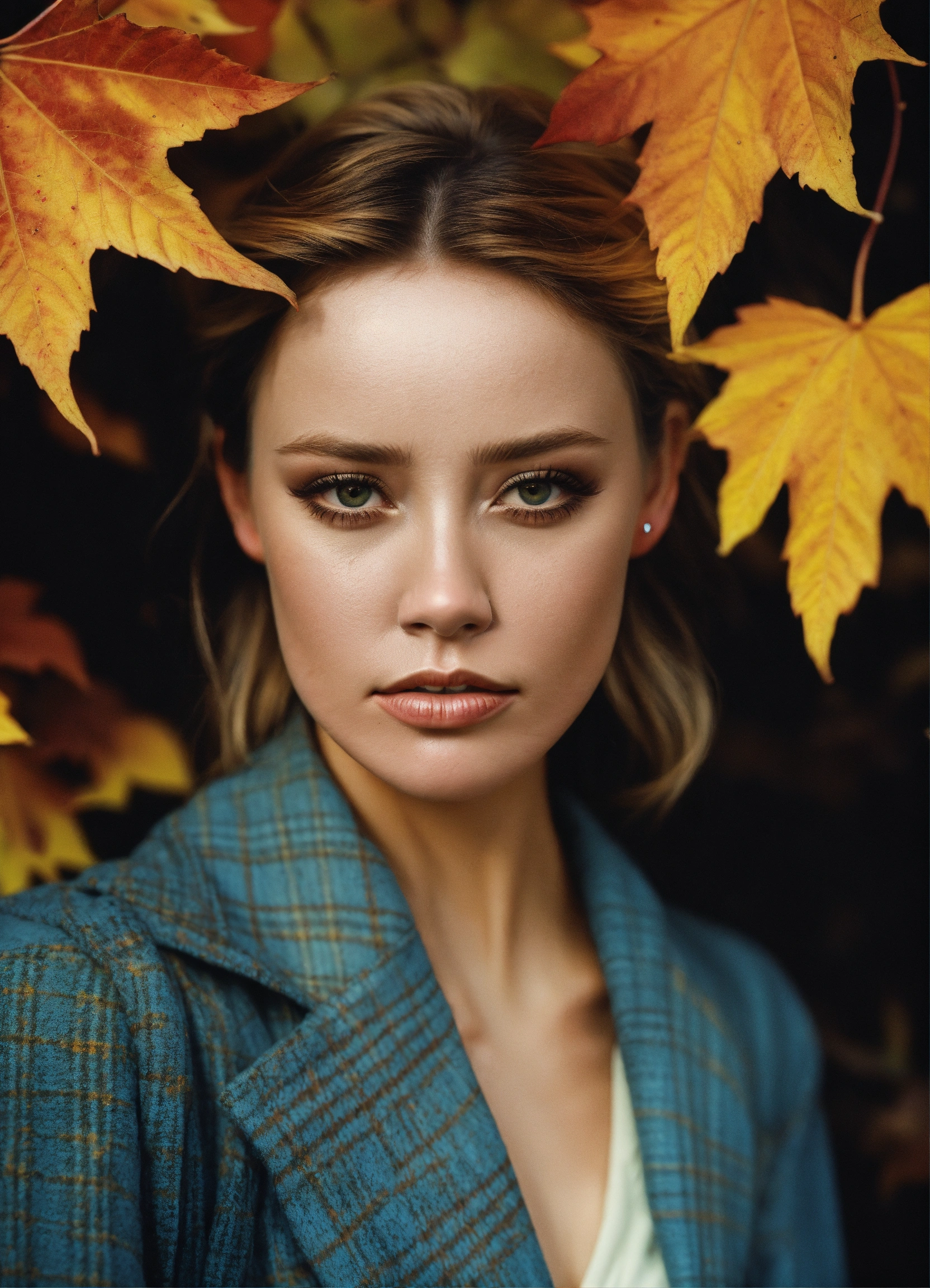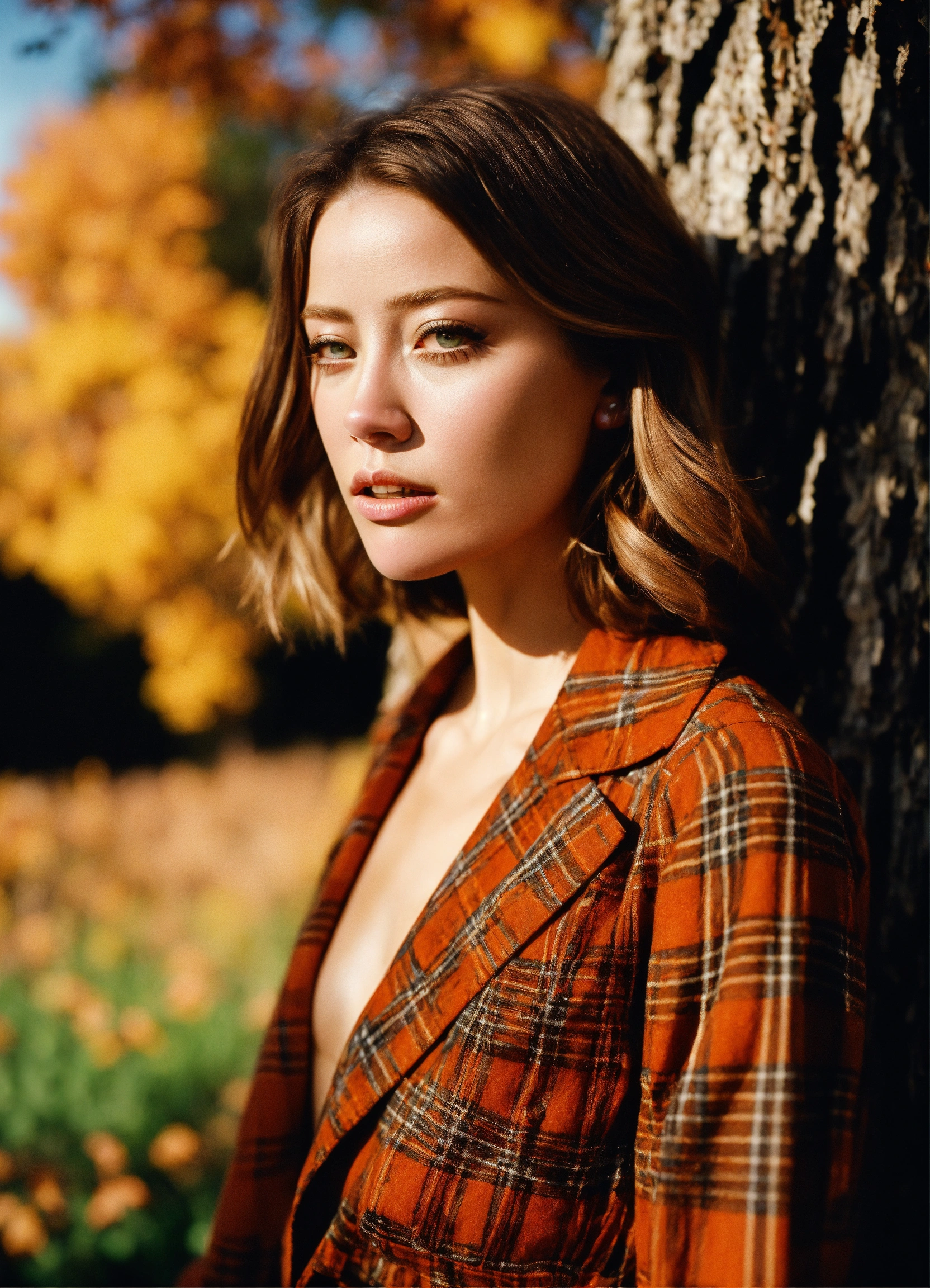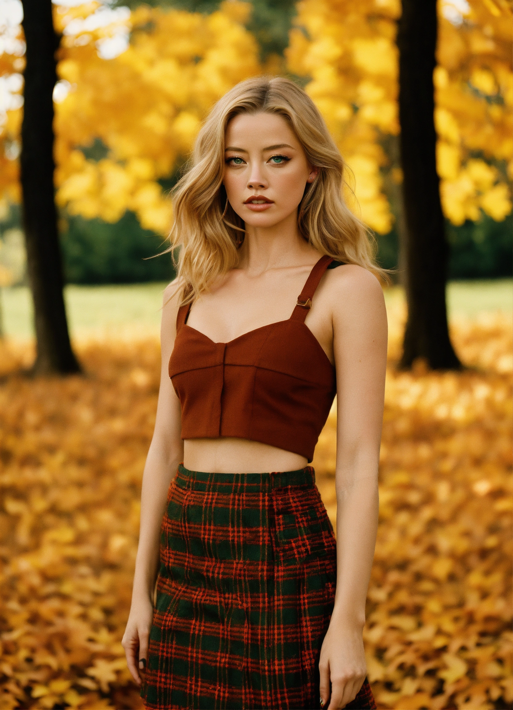 One women <model is blonde amber(effy-stonem)heard wearing-formal-makeup> <model is a brunette effy(amber-heard)stonem wearing-smokey-makeup>" uoturned almond-shaped eyes, arched-eyebrows plump woman wearing tartan-micro-mini-skirts crop-top peaking-midriff a 1970s kodachrome photo autumn aesthetic, autumn leaves, 70mm film with depth, cinematic symmetry and a central point of composition and film-grain art by jason-de-graaf #c28017 #a31c1c #800080 deep rich intense bold colors
